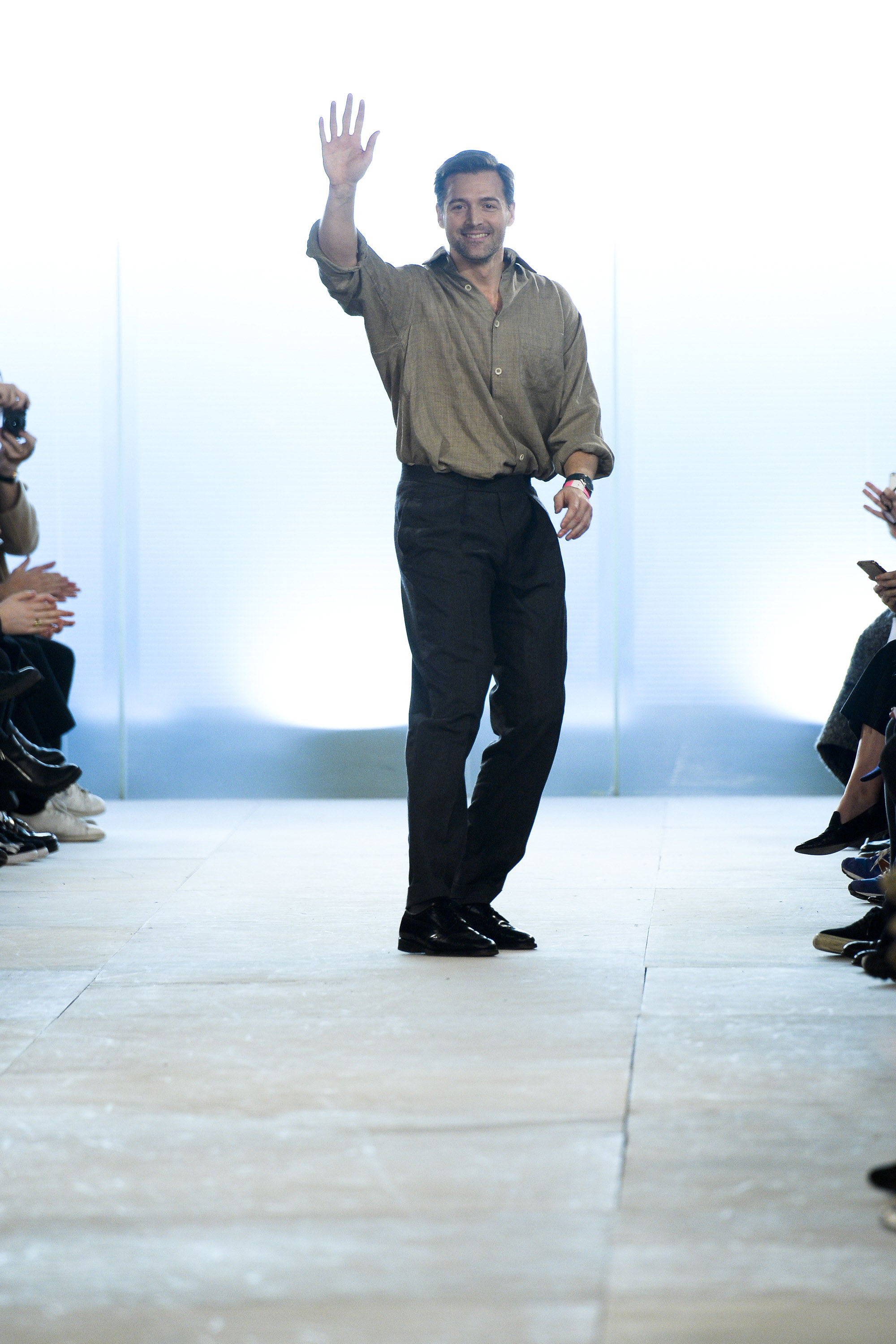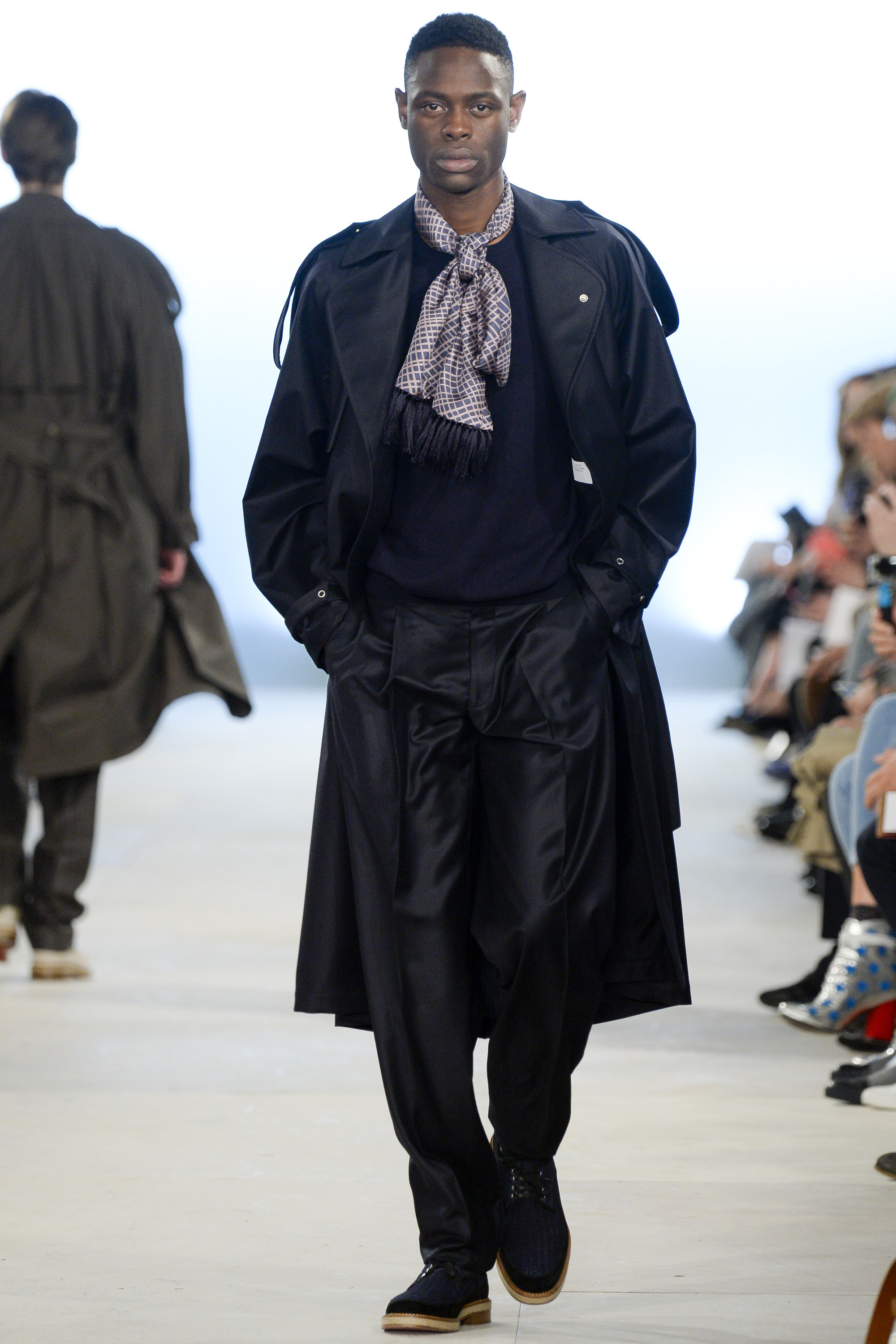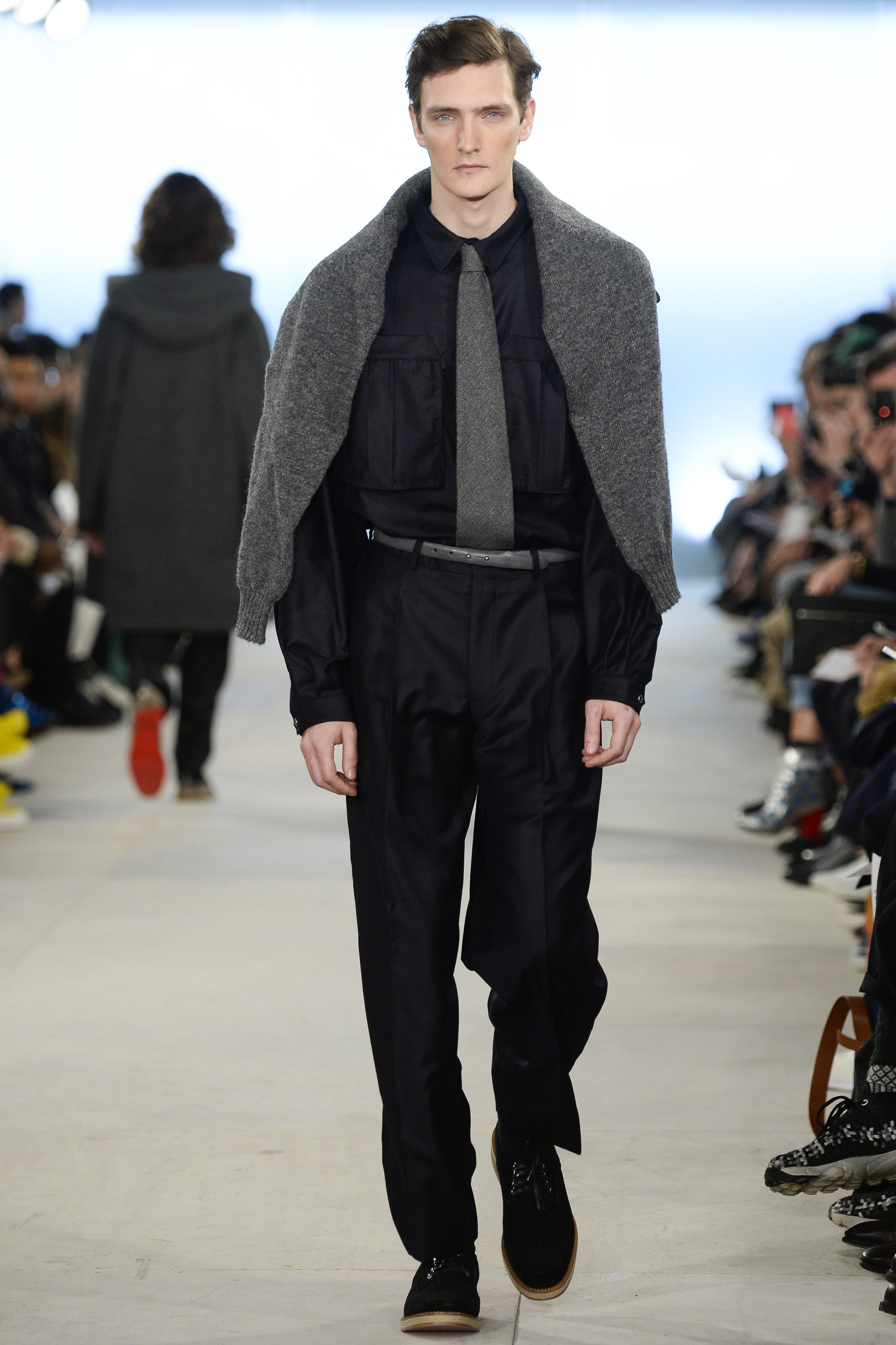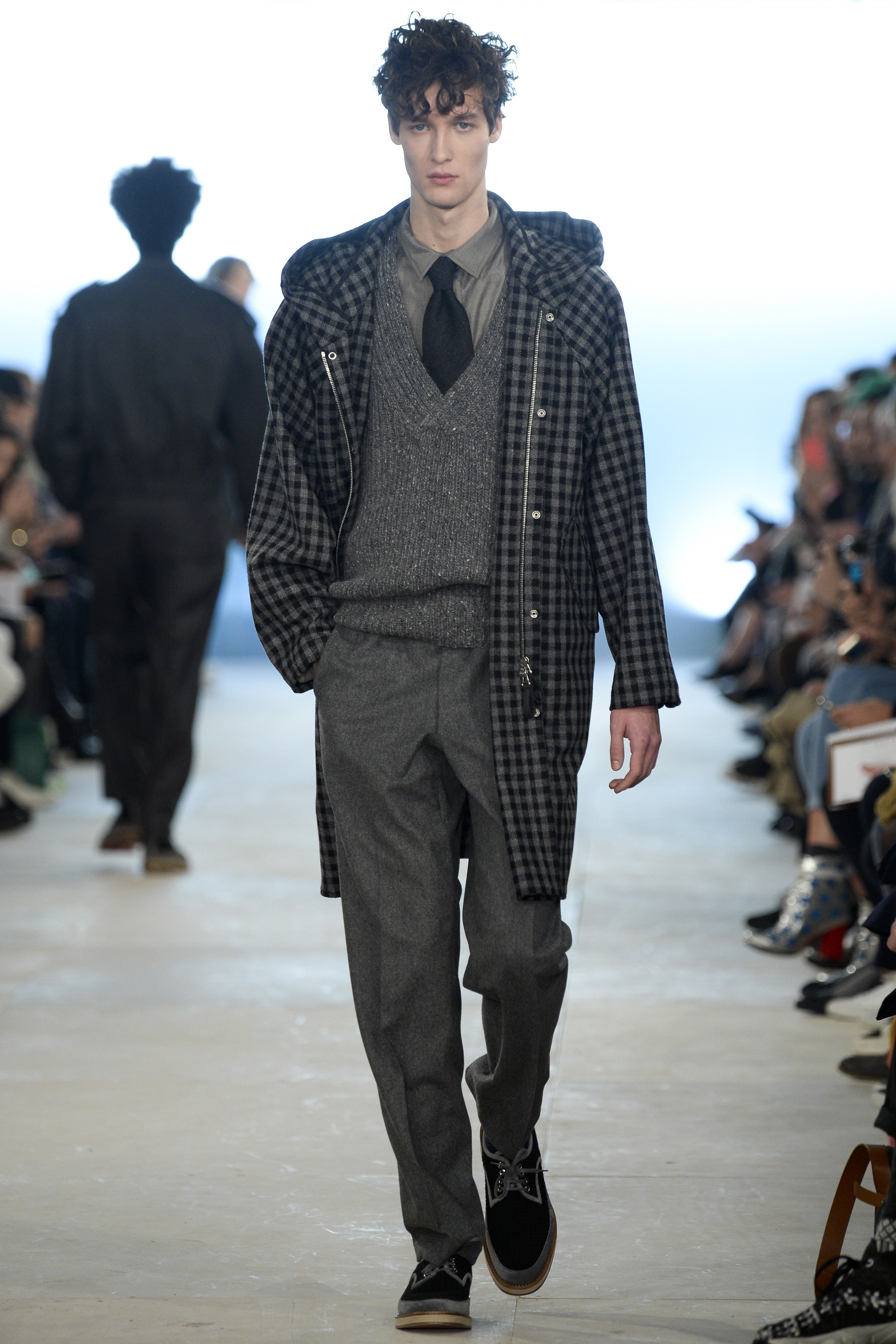 Which is why this E. Tautz collection presented Grant’s imagined ’80s as filtered via his label’s valiant mission to bring a Savile Row sensibility to seasonal fashion. There were plenty of recognizable tics from the time. Soft-shouldered, double-breasted wool trenchcoats in navy and gray featured tricep-tickling elongated epaulets. Black suit and black pocket shirt ensembles worn with clashing ties demanded reference to Gary Numan. A pullover top in a wool and nylon mix came with an off-kilter diagonal zipper at the neckline that Grant said was drawn from that reviled-in-retrospect garment, the shell suit (British English for the nylon paneled tracksuits of the ’80s and ’90s). There was a great deal of authentic, carefully observed billow above Grant’s high-waisted, single-pleat pants. It was nearly all perfectly lovely, which was perhaps the problem. Sylvester’s mighty 1984 release “Rock the Box” was featured on Grant’s soundtrack. Check it on YouTube for confirmation of just how queasy contemporary tastes really were. Grant is too much of an aesthete to go ugly—and these were fine clothes, indeed—but a flash or two of less filtered source material would have upped the impact of this collection.