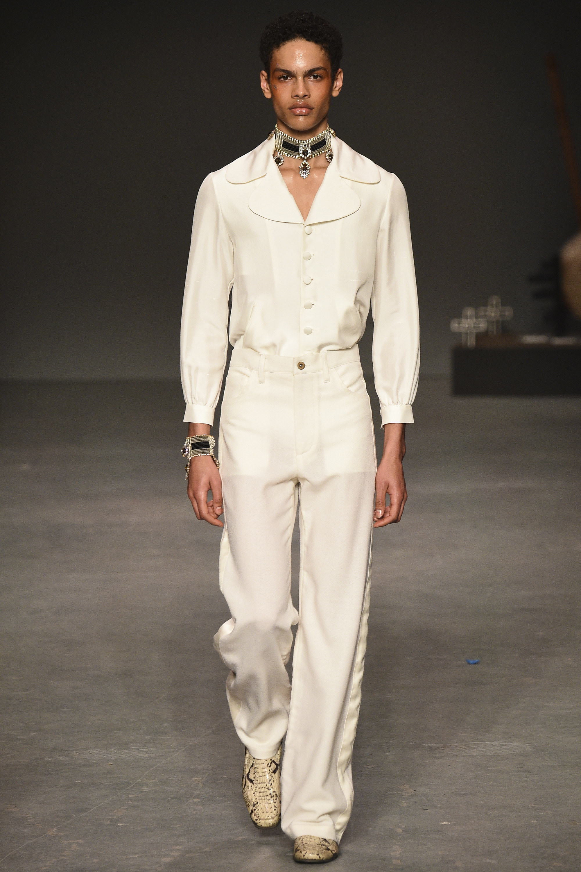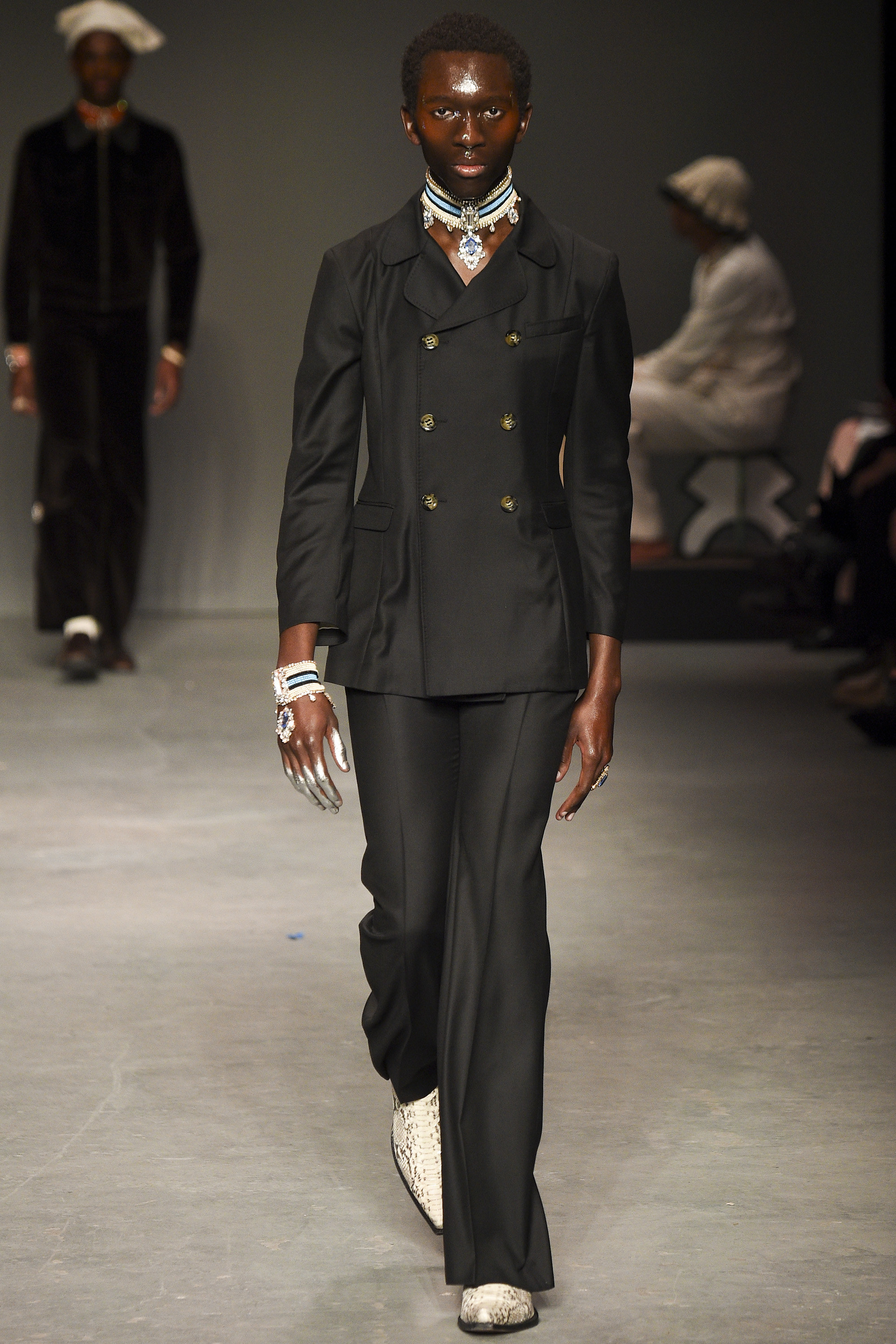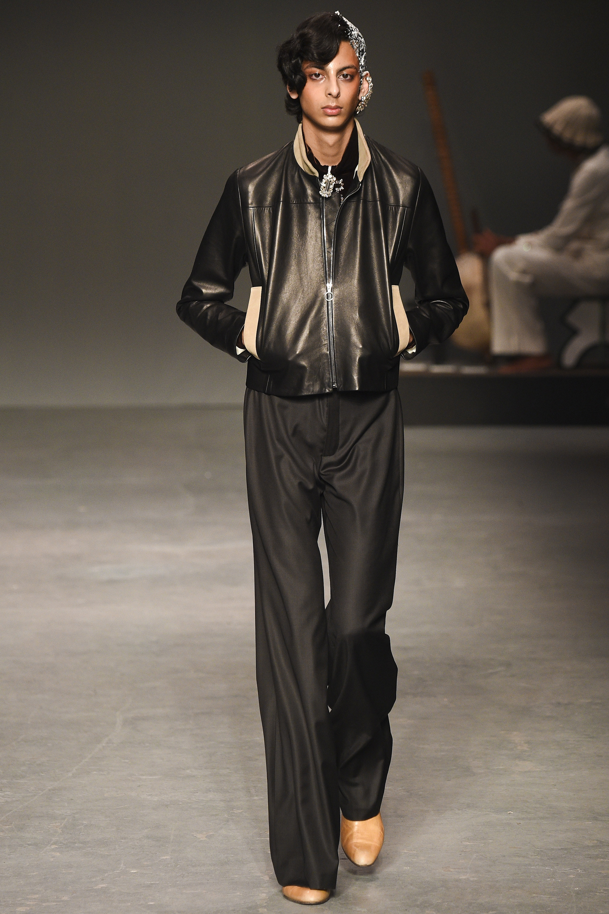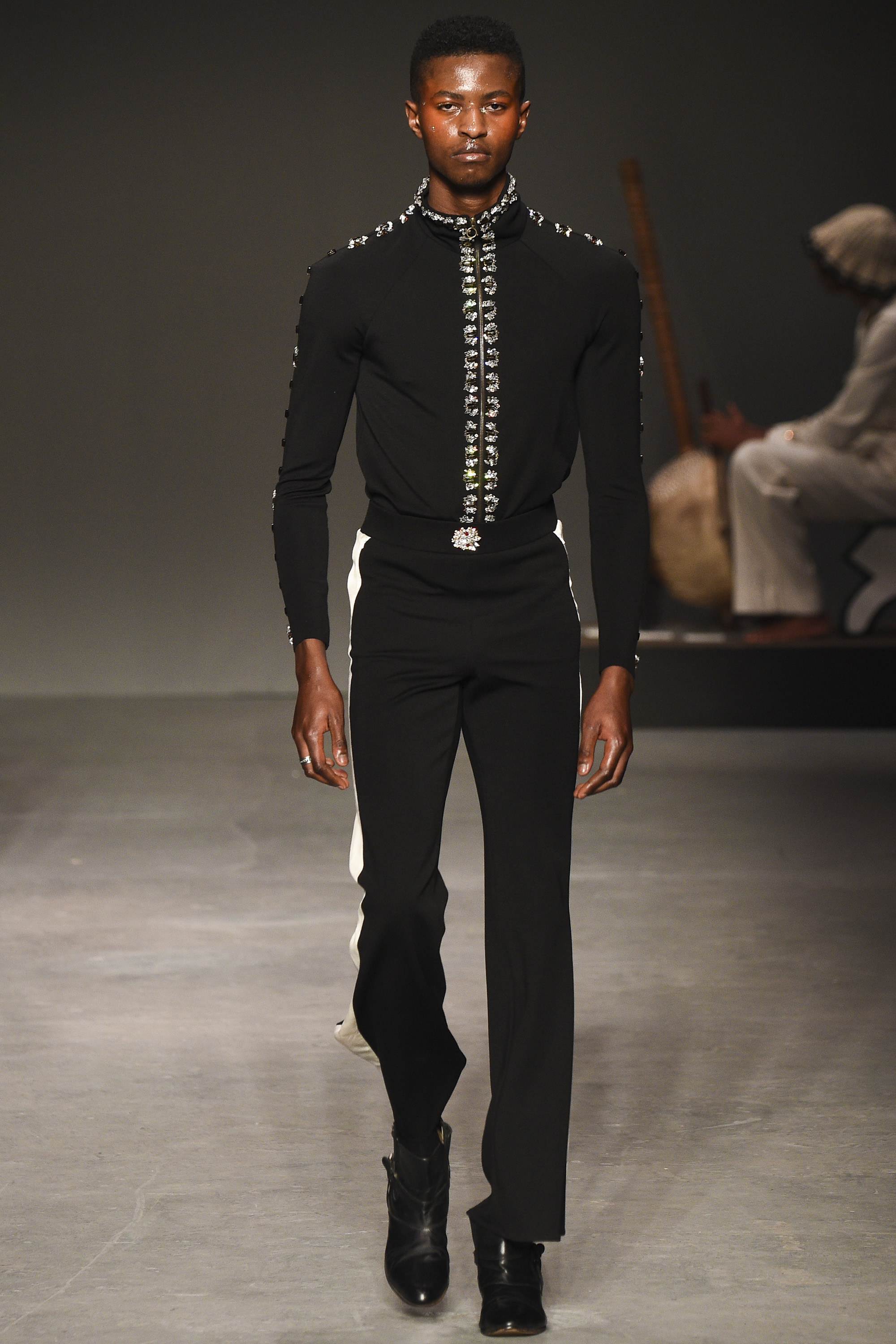The breakout this season was Grace Wales Bonner—although having already bagged a British Fashion Award and global exposure, she was a sure bet who understandably didn’t stray far from her established formula. That formula is the decorated male, with specific reference to the West Indies; Wales Bonner has explored African-influenced themes throughout her career, which, although brief (she graduated from London’s Central Saint Martins barely 18 months ago), has been intriguing. Obsessed as she is with history—rich in stories and visually rich—Wales Bonner herself said backstage that she didn’t feel beholden to it. Hence the mash-up of 1970s with 1870s, of African-American slave songs, Bollywood, and the psychedelic Afrofuturists, the Nigerian Irish composer Tunde Jegede strumming a West African harp as the models walked. Those models wore another mash-up of Funkadelic wide-lapel tailoring, Victoriana crystal beading across silky tracksuiting, and shirts sharply tugged in at the waist, like cotillion dresses. Feminine? Wales Bonner winced. “It’s about bringing beauty and sensuality to menswear,” she said. But who says that can’t be masculine?