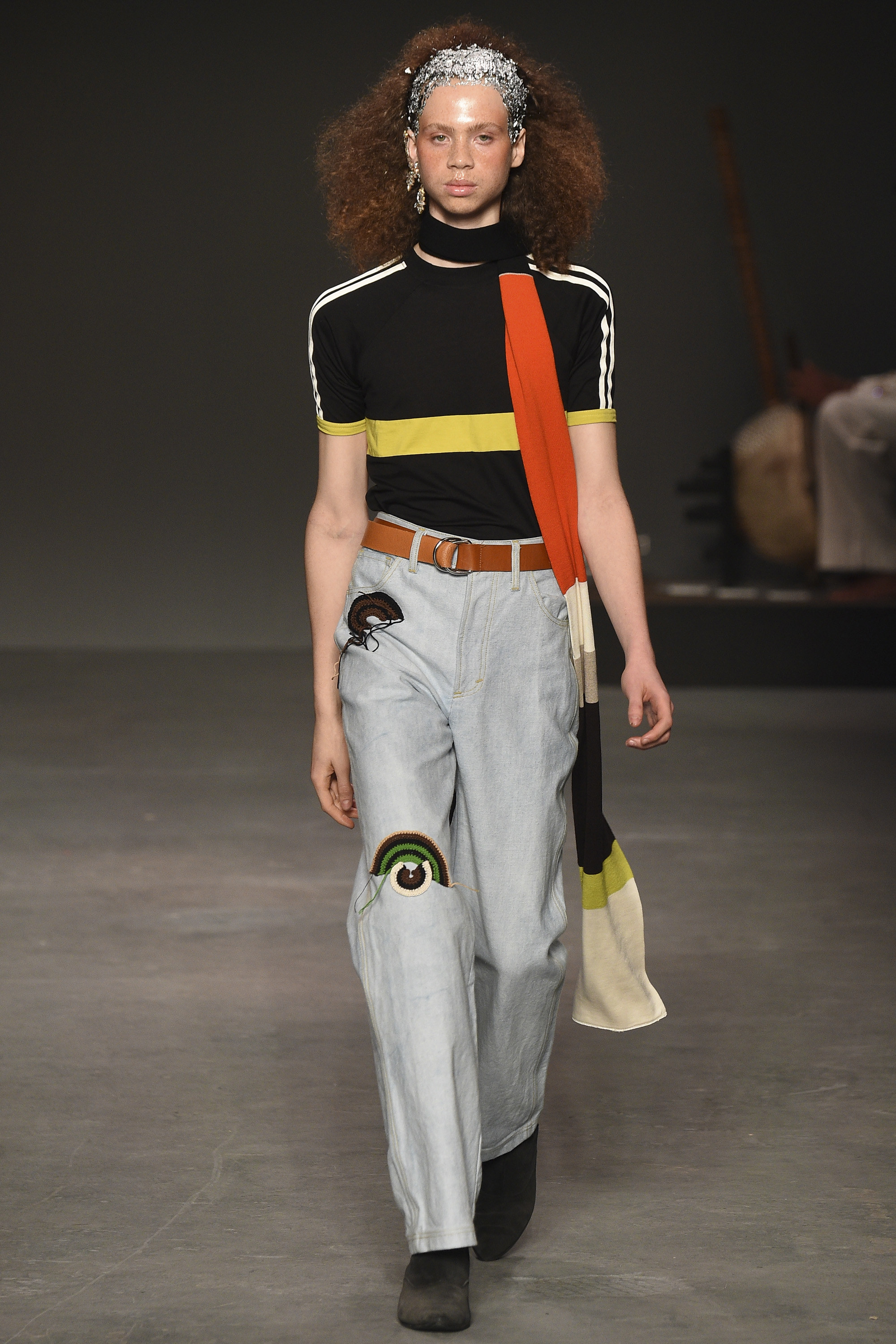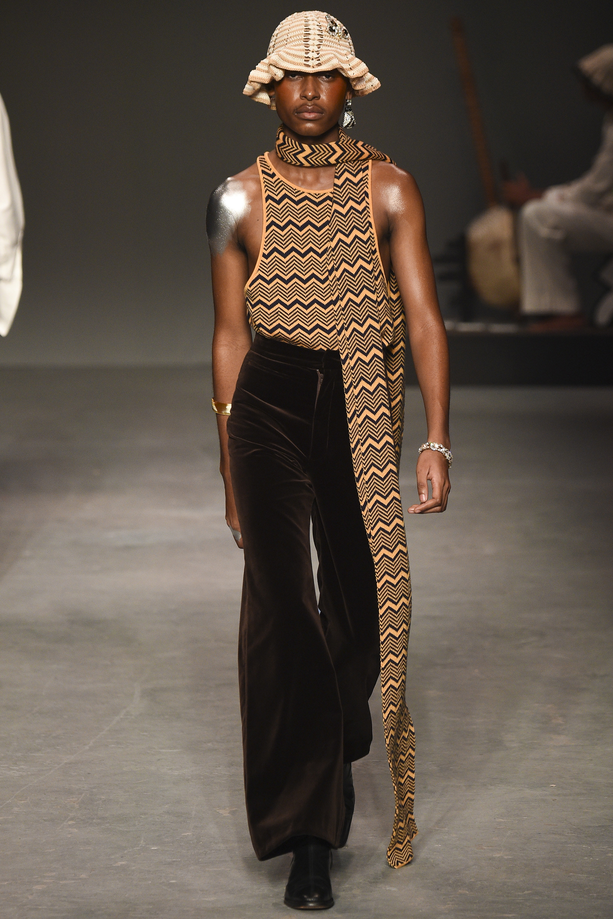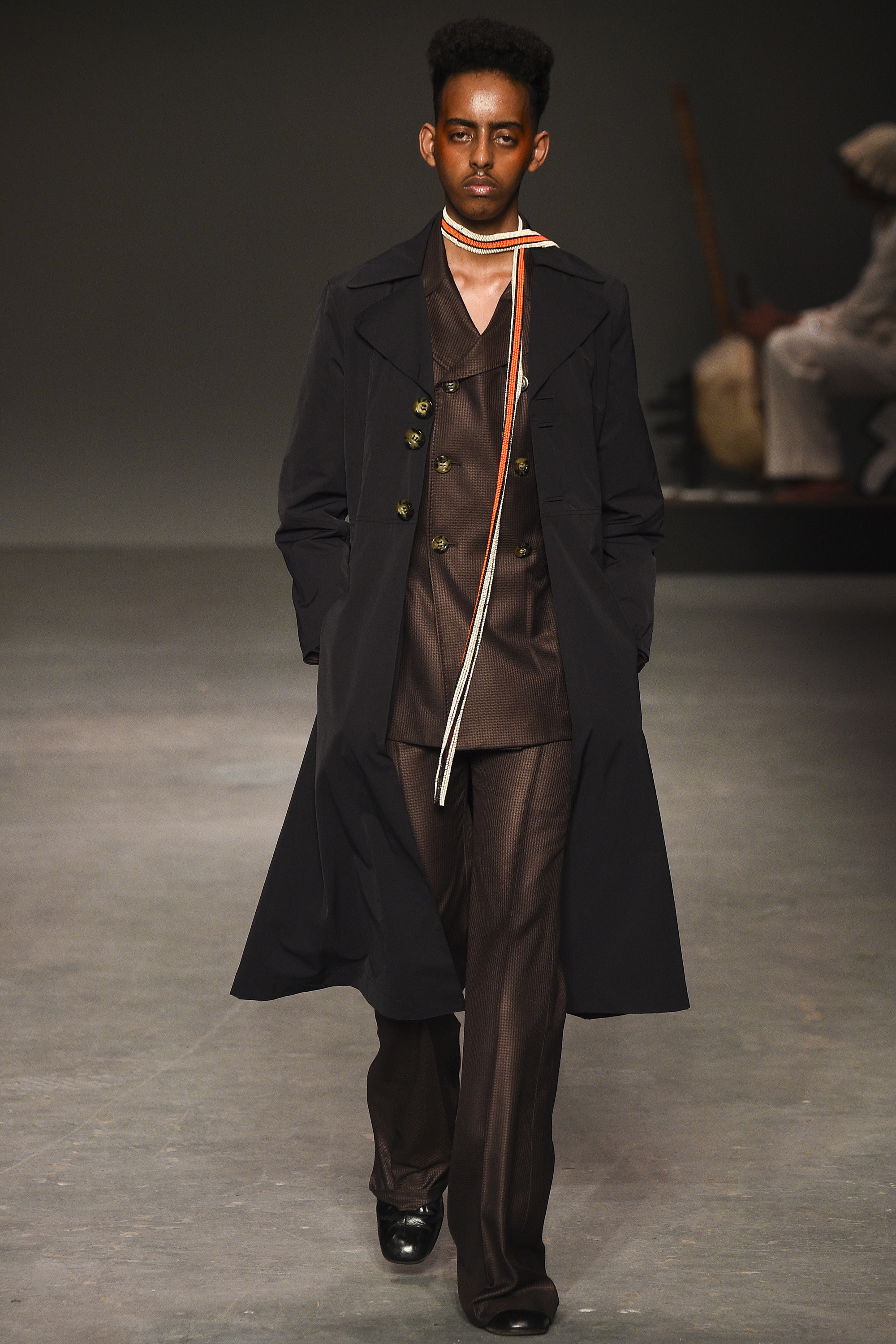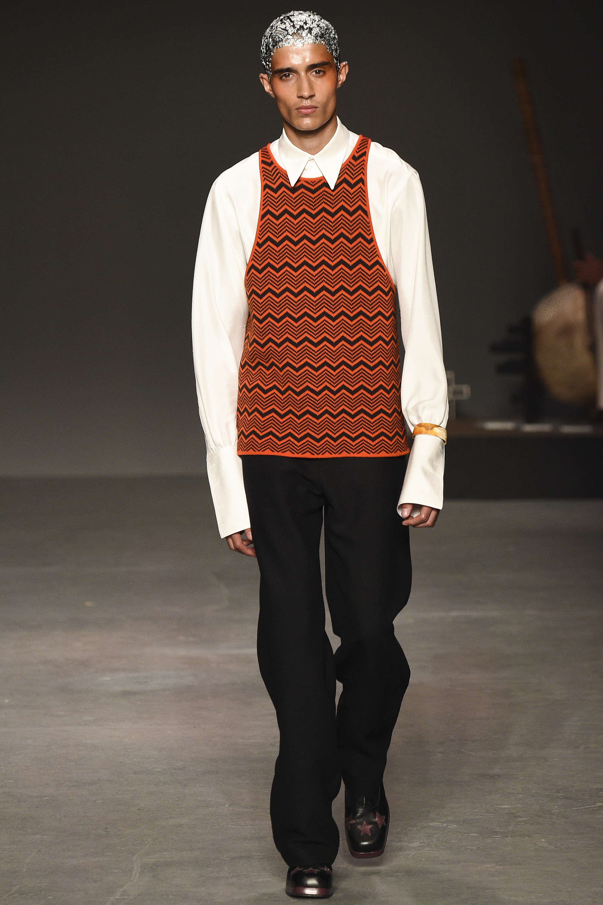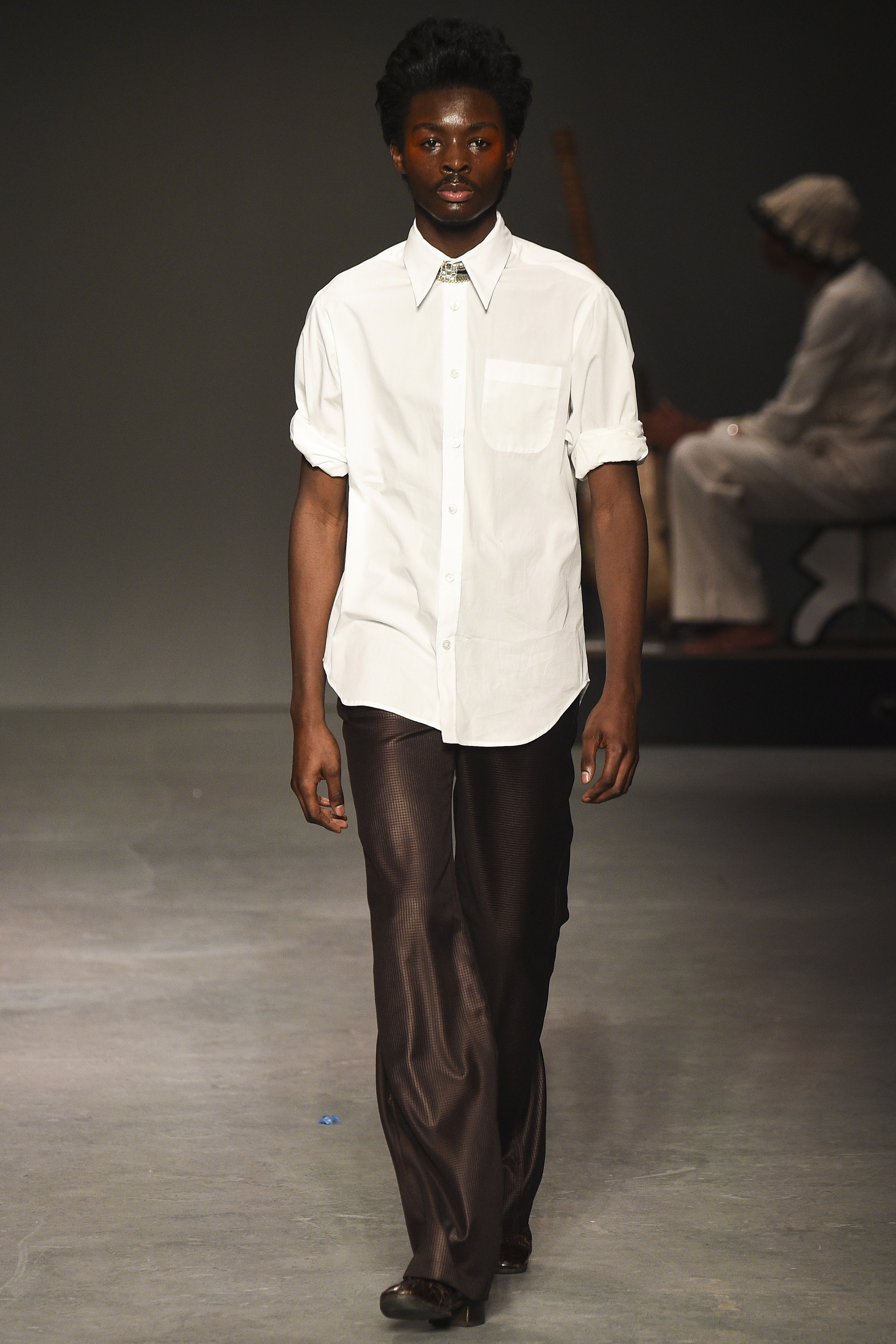 The breakout this season was Grace Wales Bonner—although having already bagged a British Fashion Award and global exposure, she was a sure bet who understandably didn’t stray far from her established formula. That formula is the decorated male, with specific reference to the West Indies; Wales Bonner has explored African-influenced themes throughout her career, which, although brief (she graduated from London’s Central Saint Martins barely 18 months ago), has been intriguing. Obsessed as she is with history—rich in stories and visually rich—Wales Bonner herself said backstage that she didn’t feel beholden to it. Hence the mash-up of 1970s with 1870s, of African-American slave songs, Bollywood, and the psychedelic Afrofuturists, the Nigerian Irish composer Tunde Jegede strumming a West African harp as the models walked. Those models wore another mash-up of Funkadelic wide-lapel tailoring, Victoriana crystal beading across silky tracksuiting, and shirts sharply tugged in at the waist, like cotillion dresses. Feminine? Wales Bonner winced. “It’s about bringing beauty and sensuality to menswear,” she said. But who says that can’t be masculine?