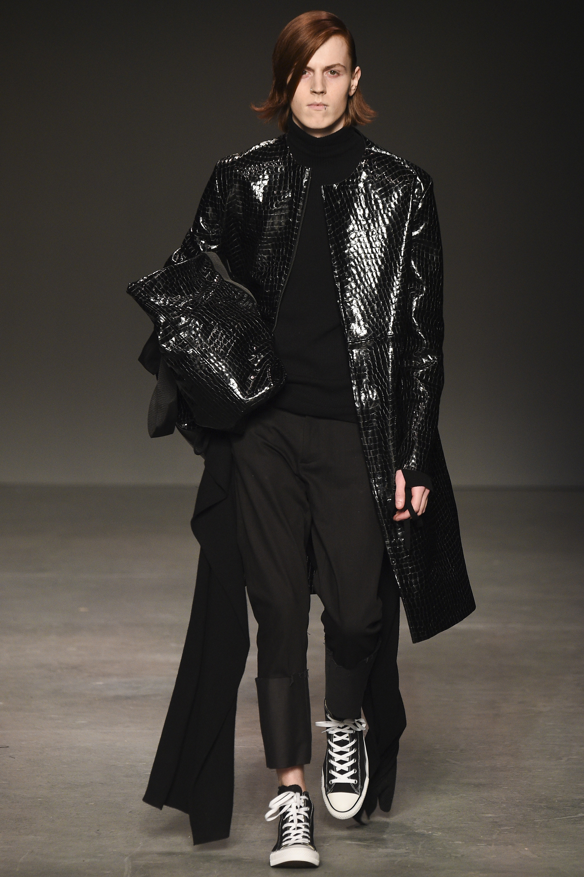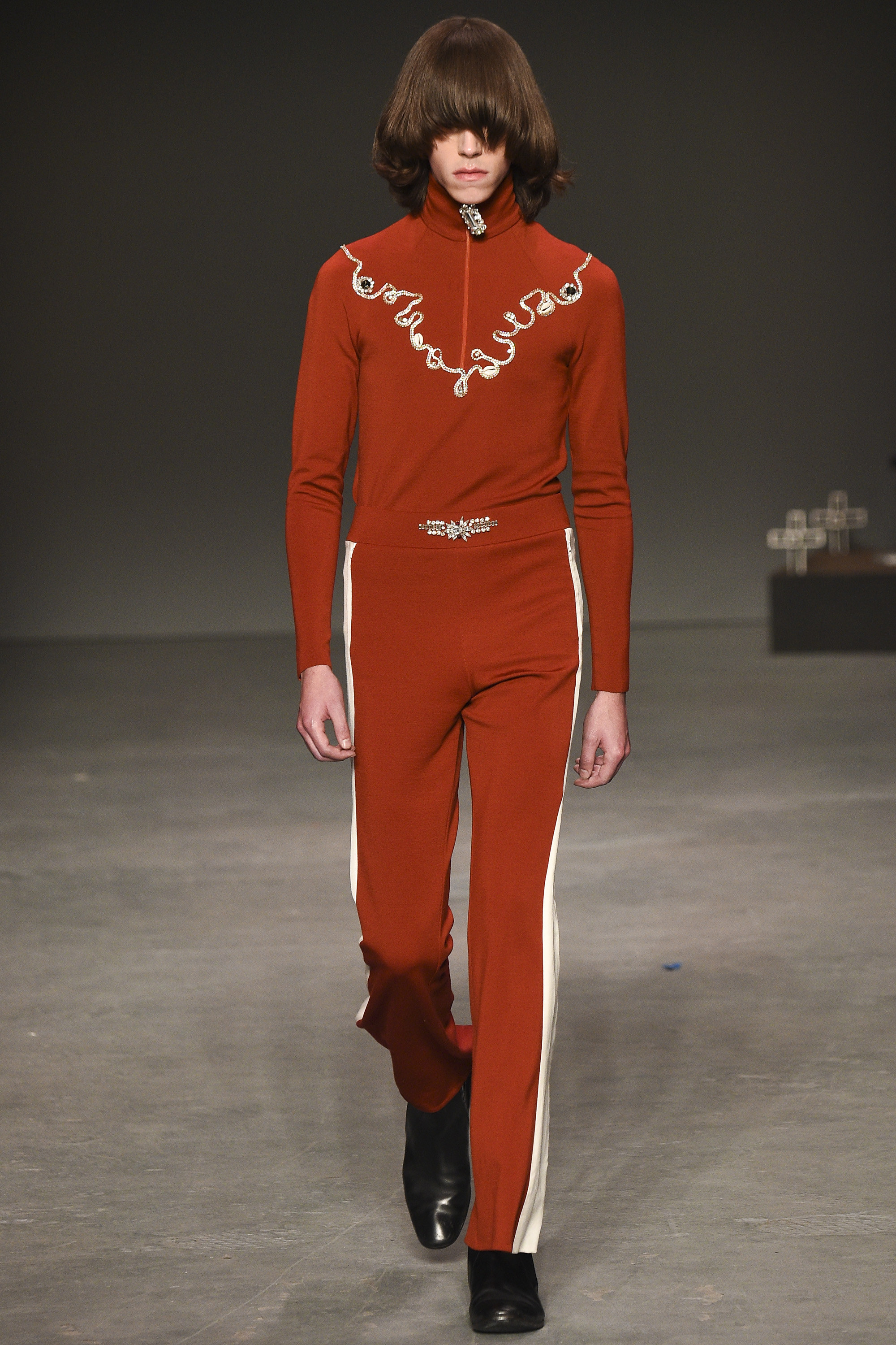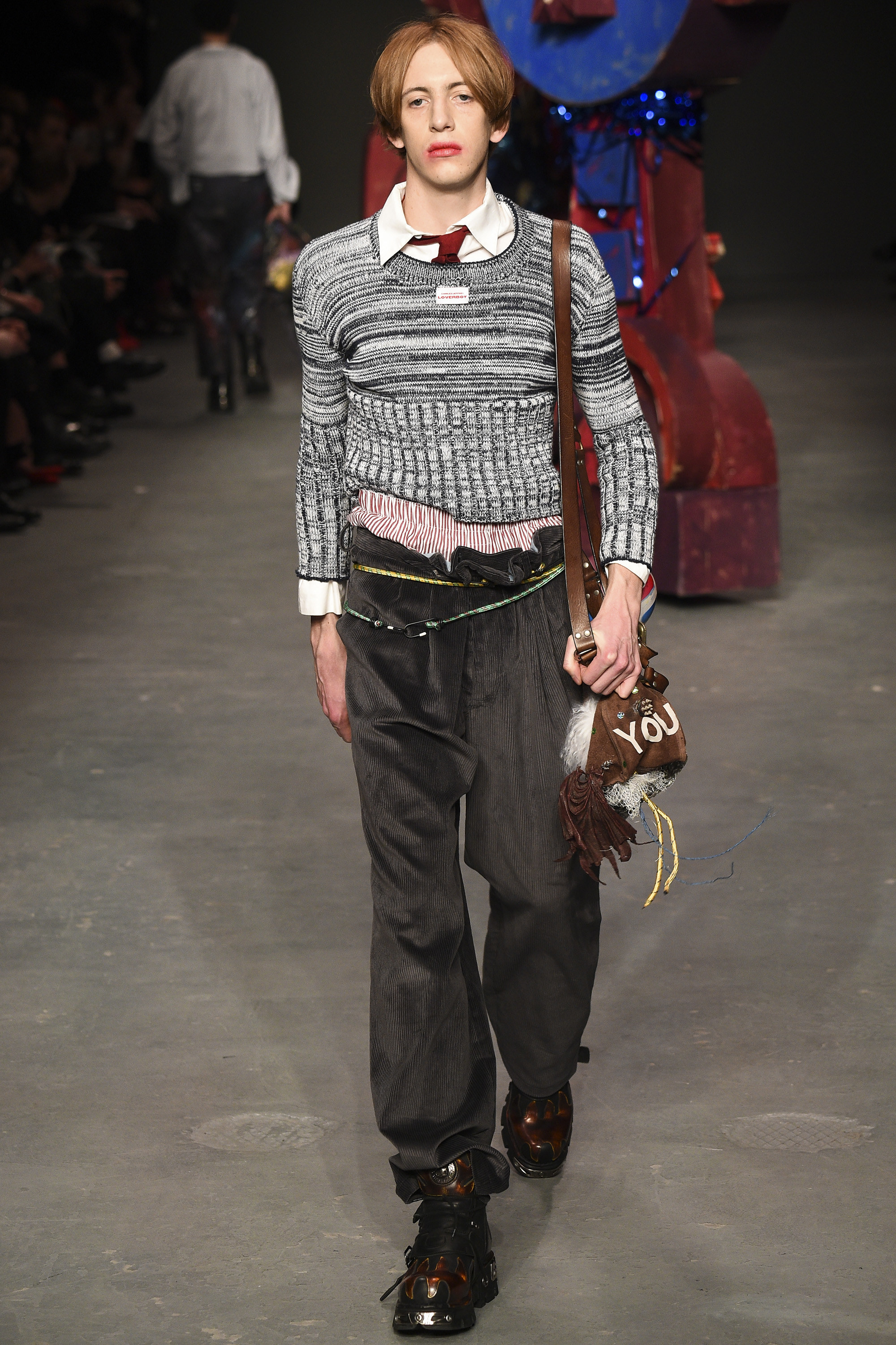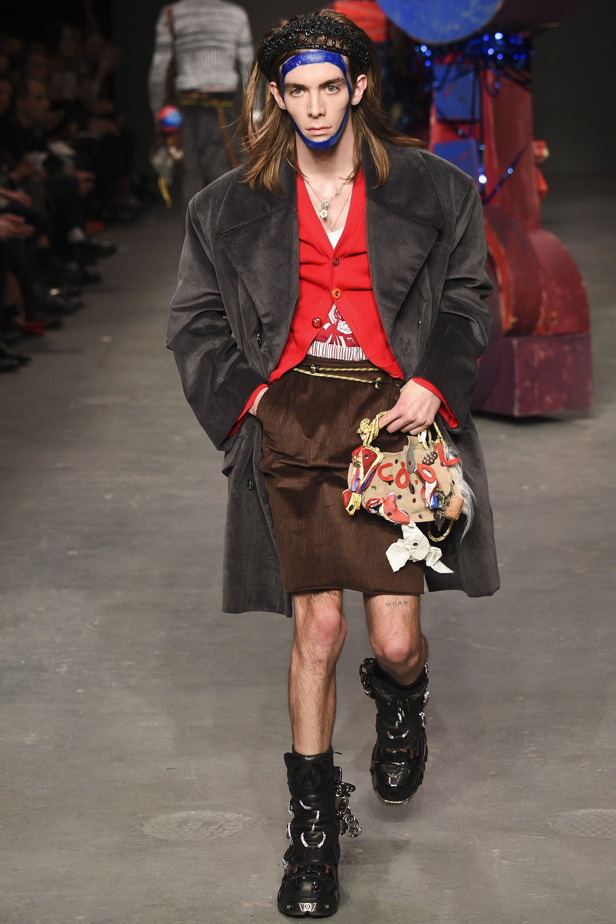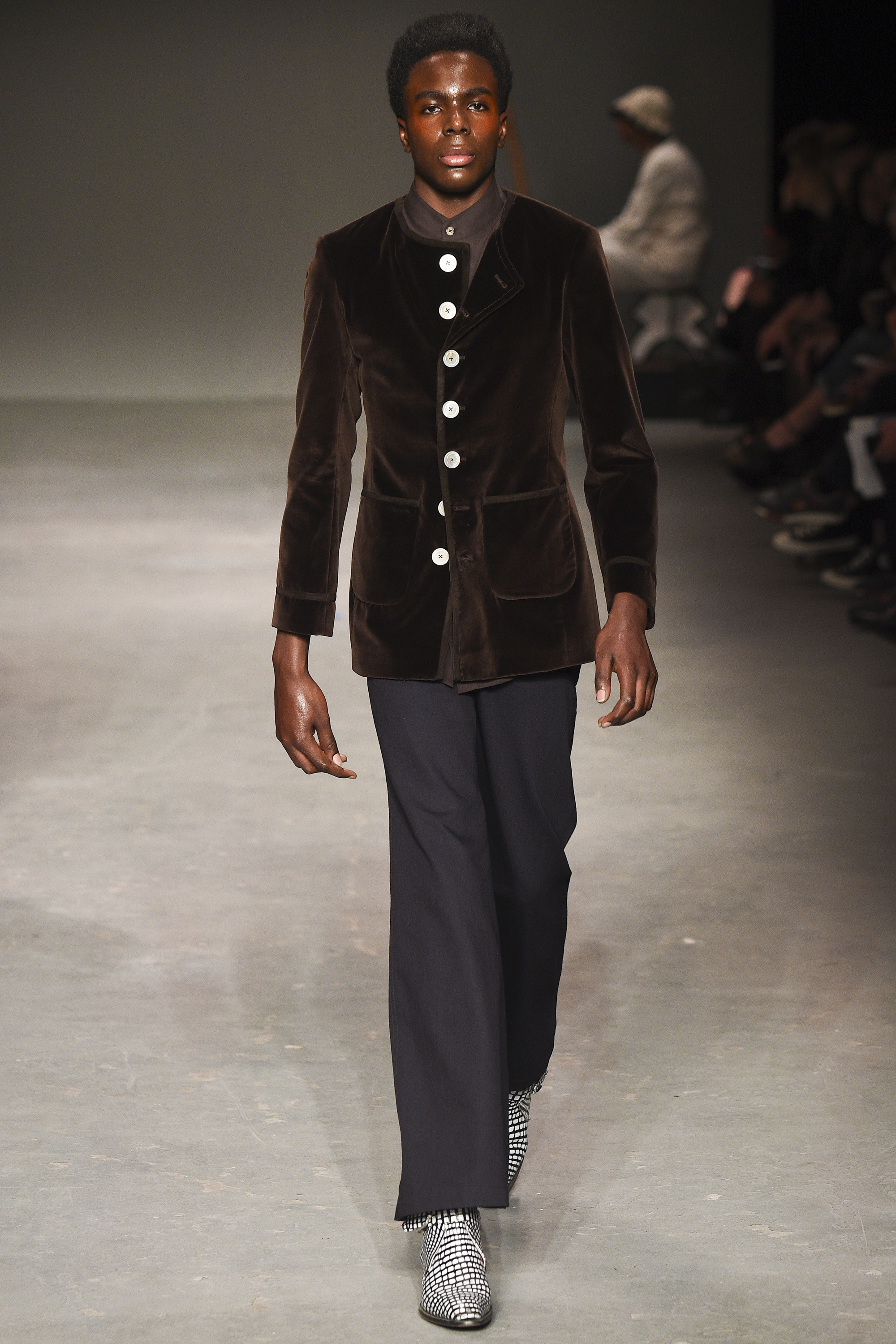 At least, it did for Fall 2016, where a trio of designers offered unique opinions on contemporary masculinity: black-shrouded Catholic schoolboys rubbed shoulders with a bejeweled West Indian master of ceremonies who were followed by a raggedy, drag-edy East London club kid in Party Monster flatforms and a bunched-up corduroy miniskirt. It takes all sorts to make the fashion world go round.