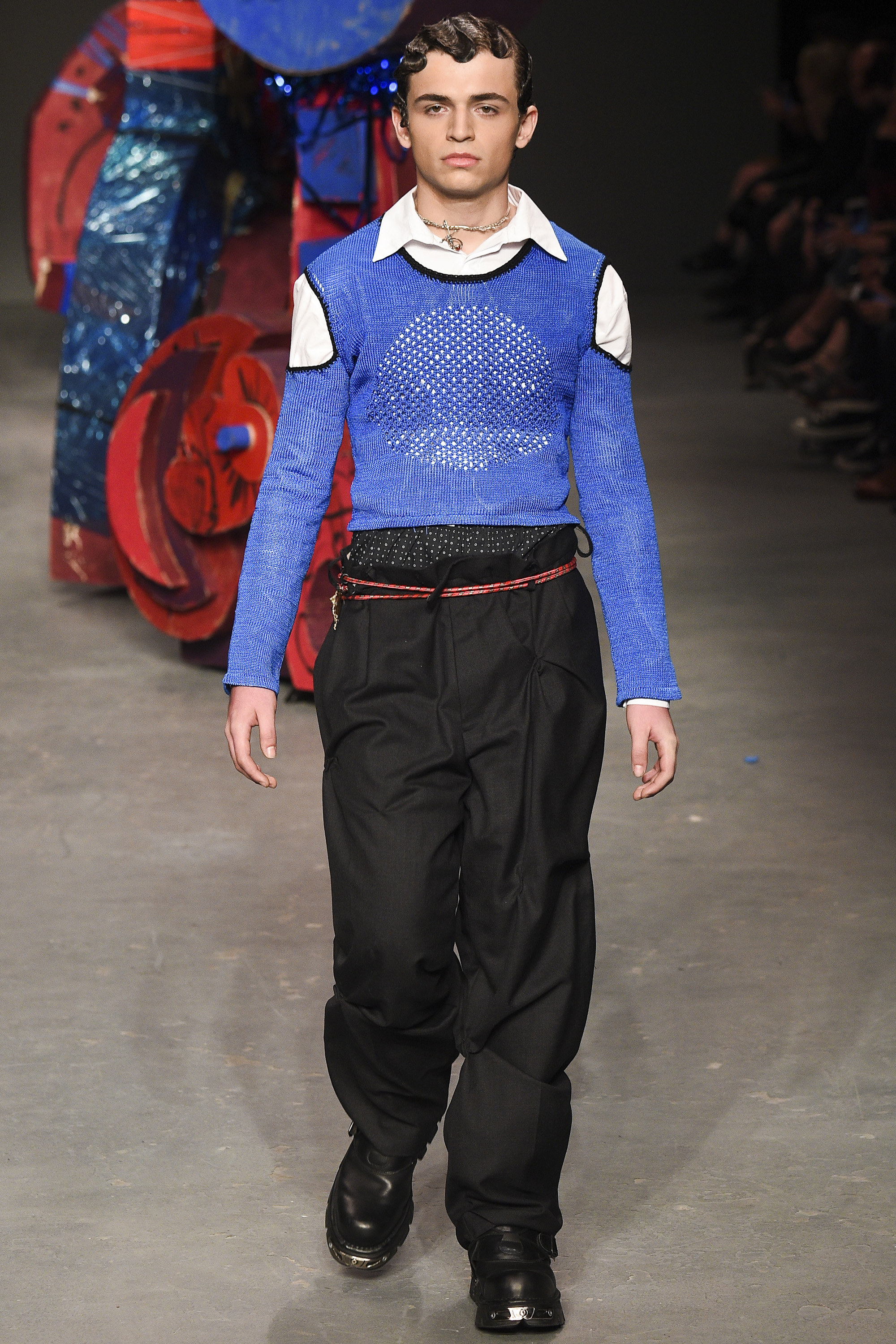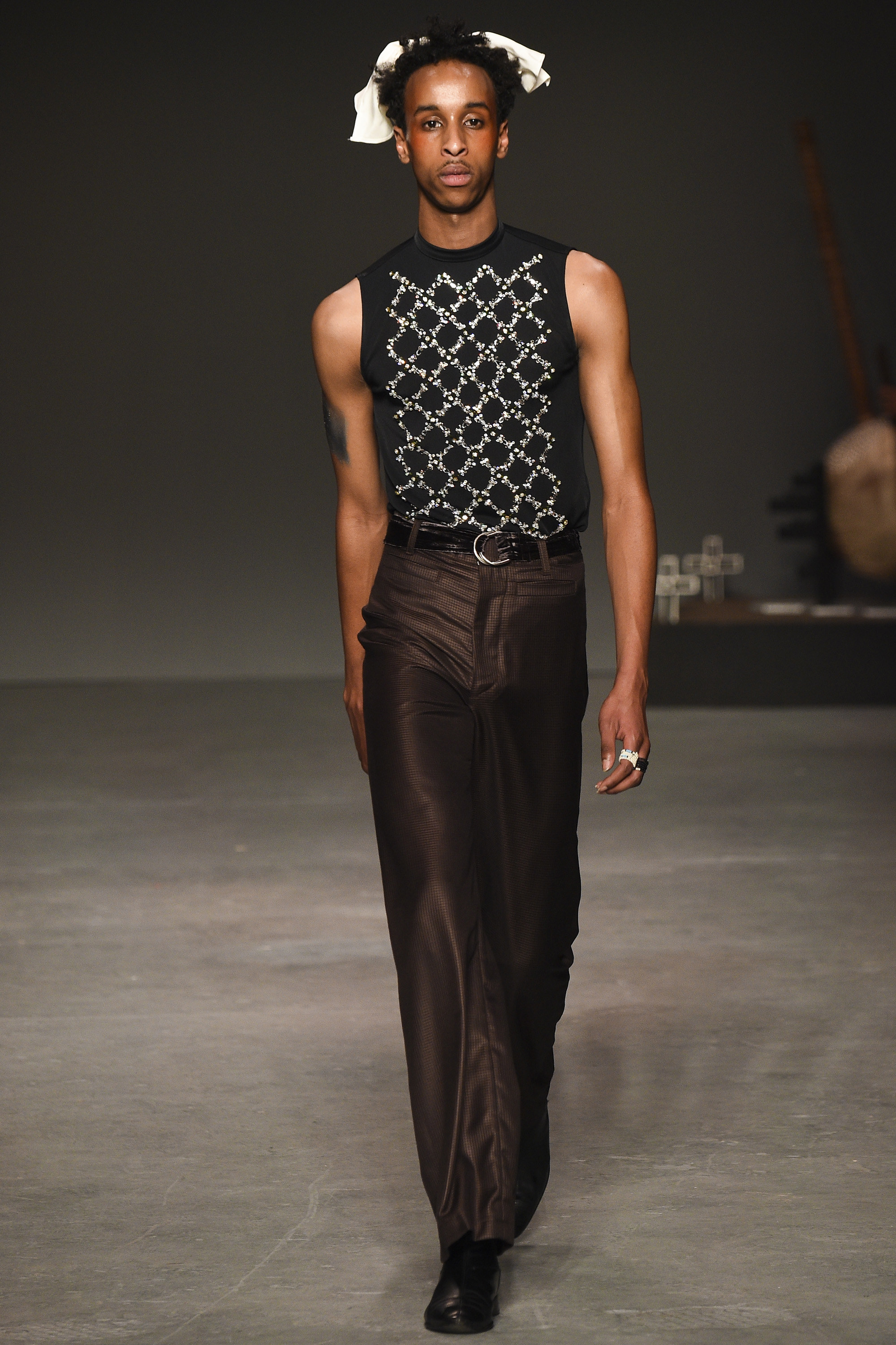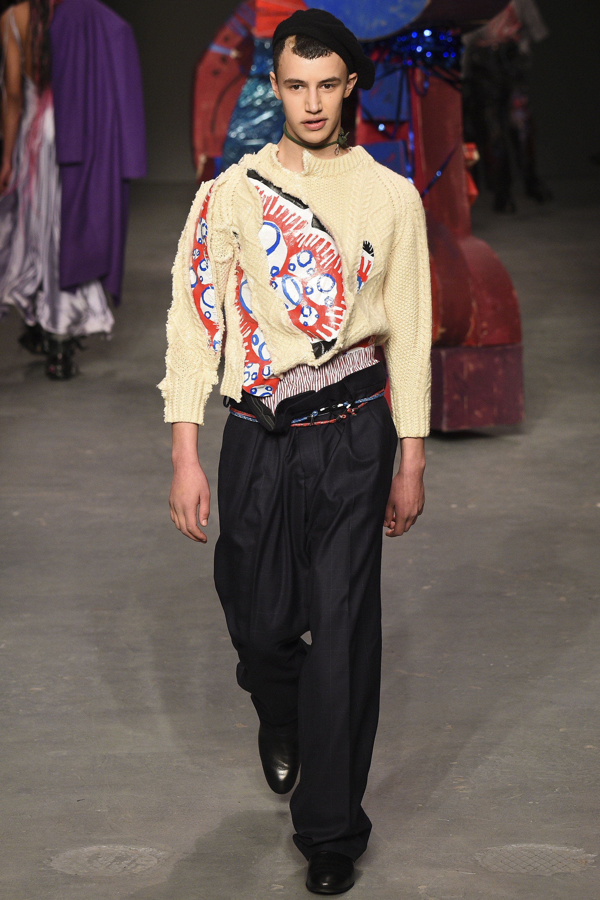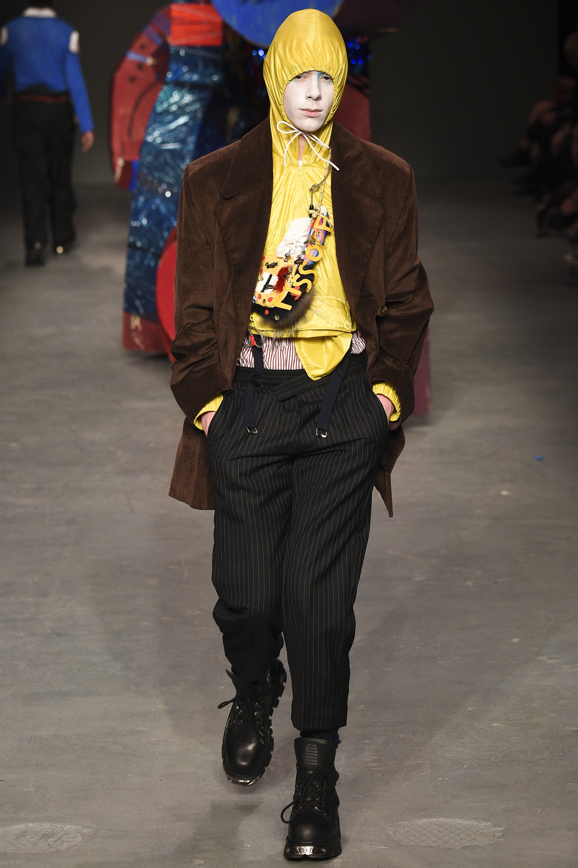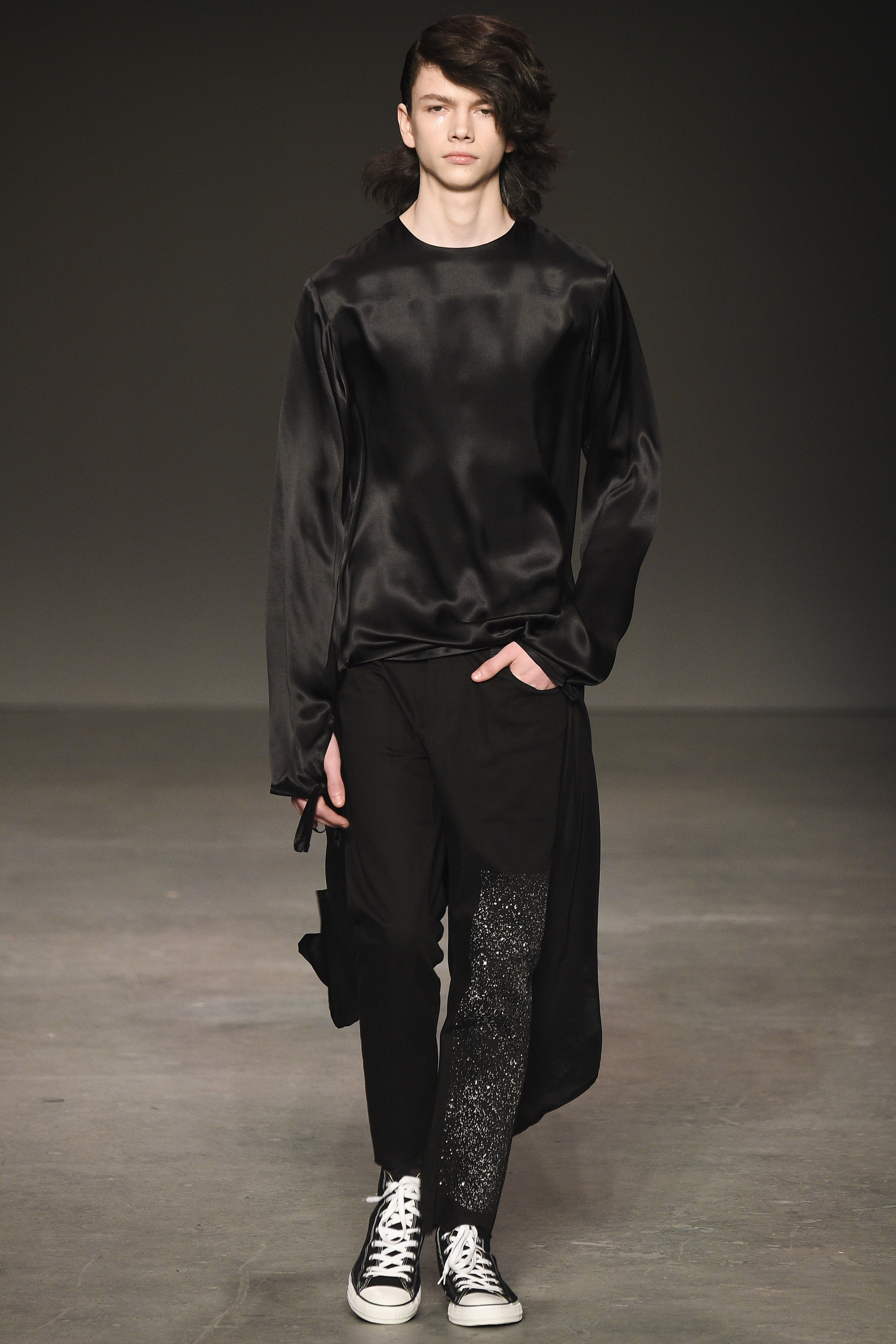 At least, it did for Fall 2016, where a trio of designers offered unique opinions on contemporary masculinity: black-shrouded Catholic schoolboys rubbed shoulders with a bejeweled West Indian master of ceremonies who were followed by a raggedy, drag-edy East London club kid in Party Monster flatforms and a bunched-up corduroy miniskirt. It takes all sorts to make the fashion world go round.