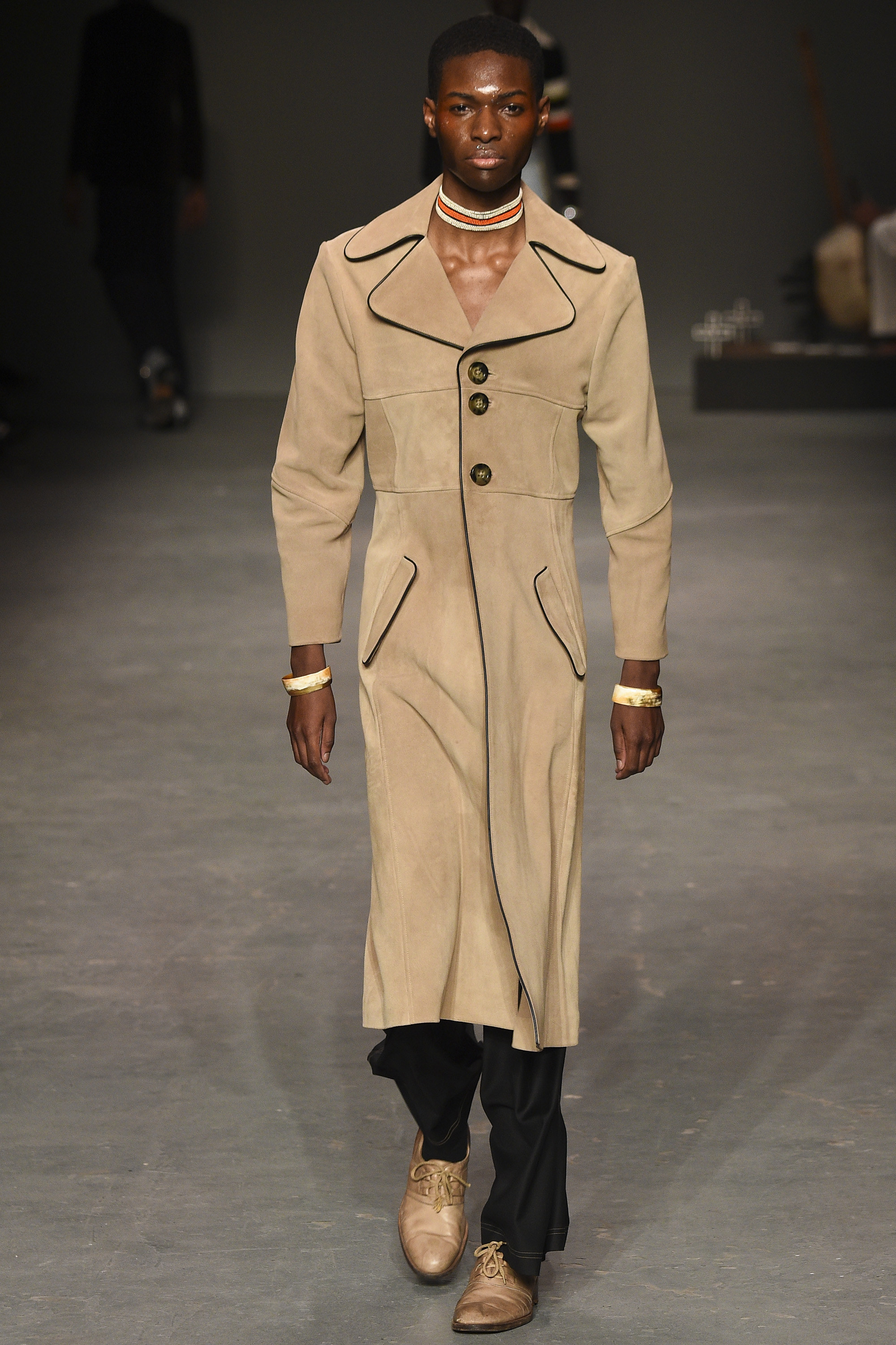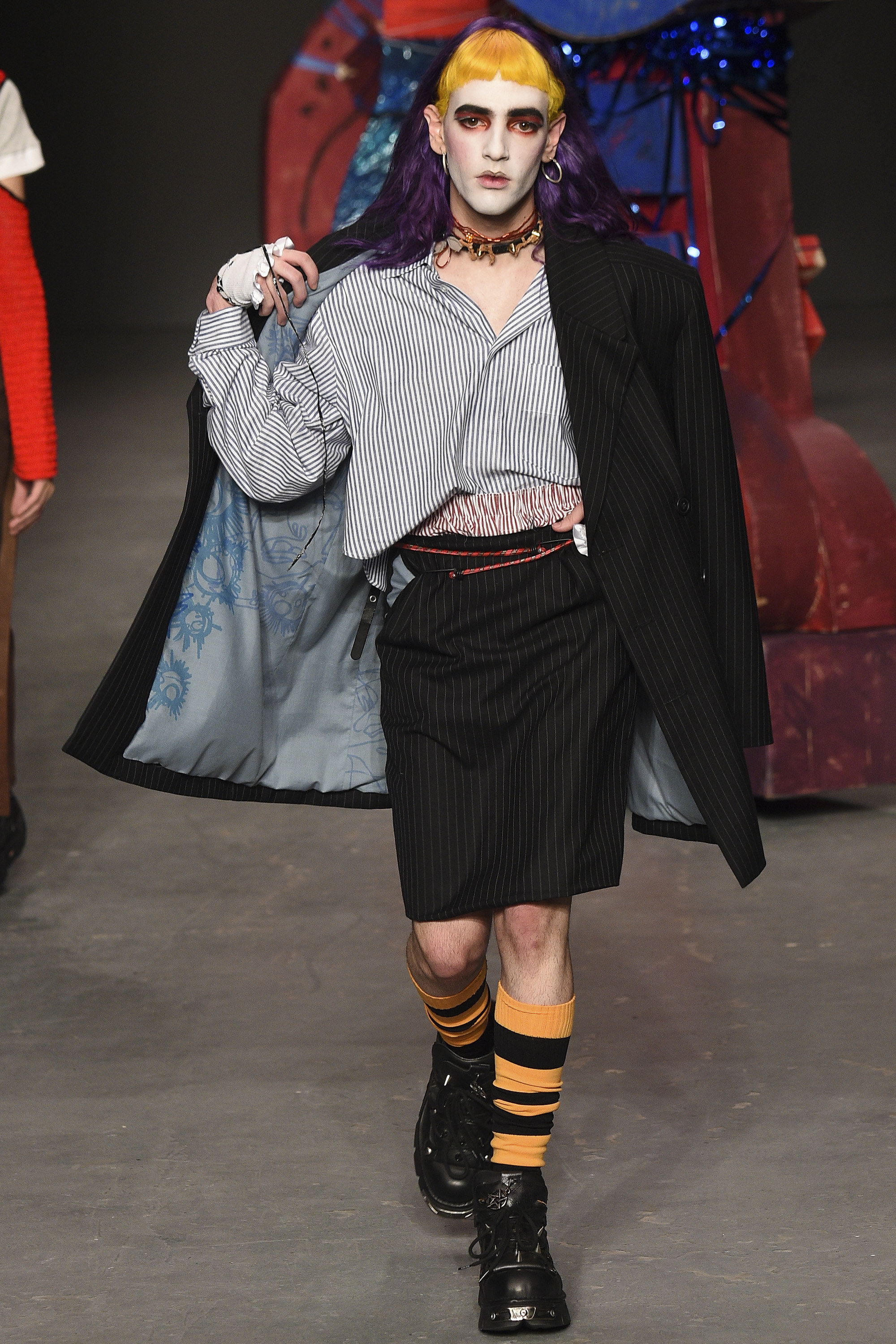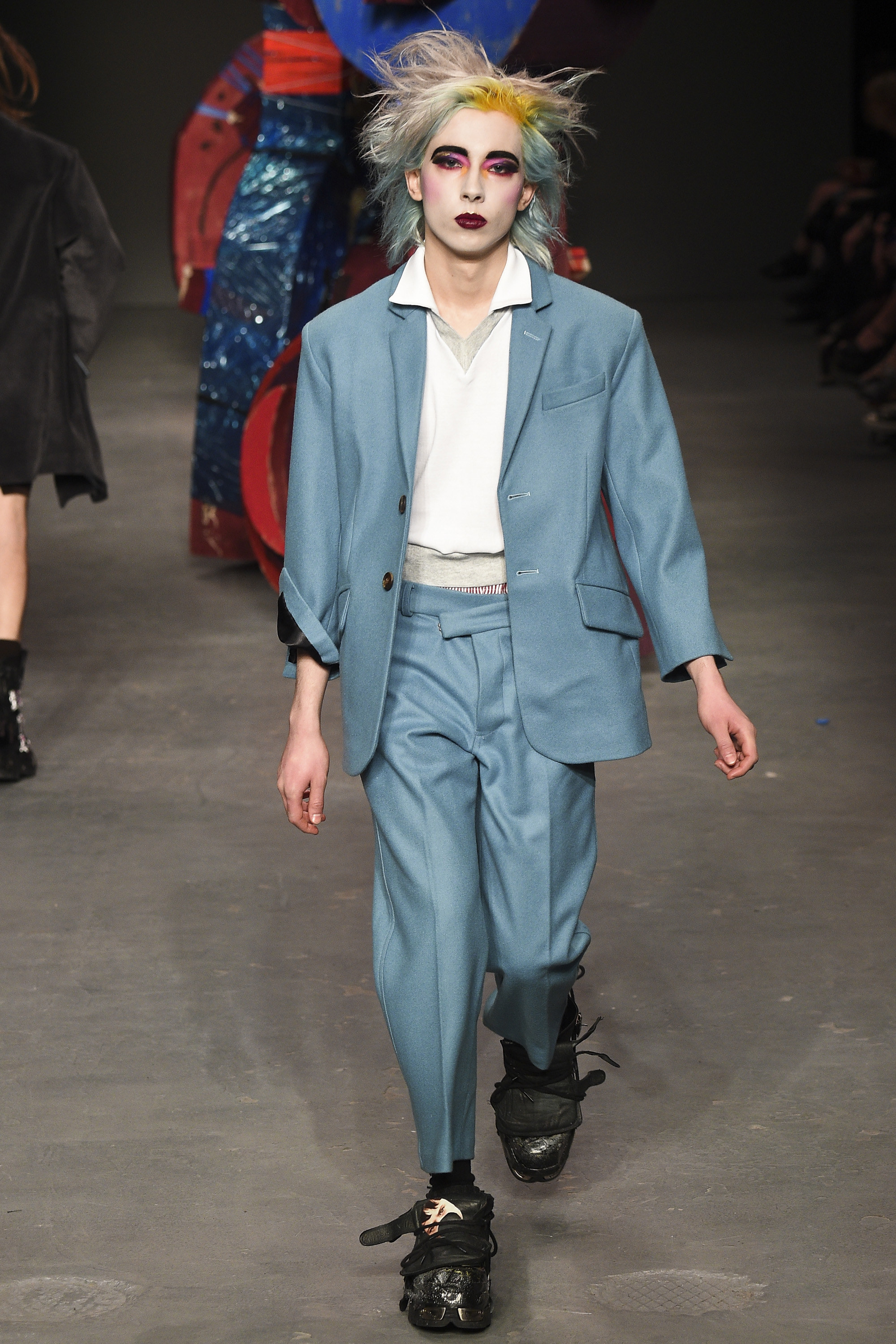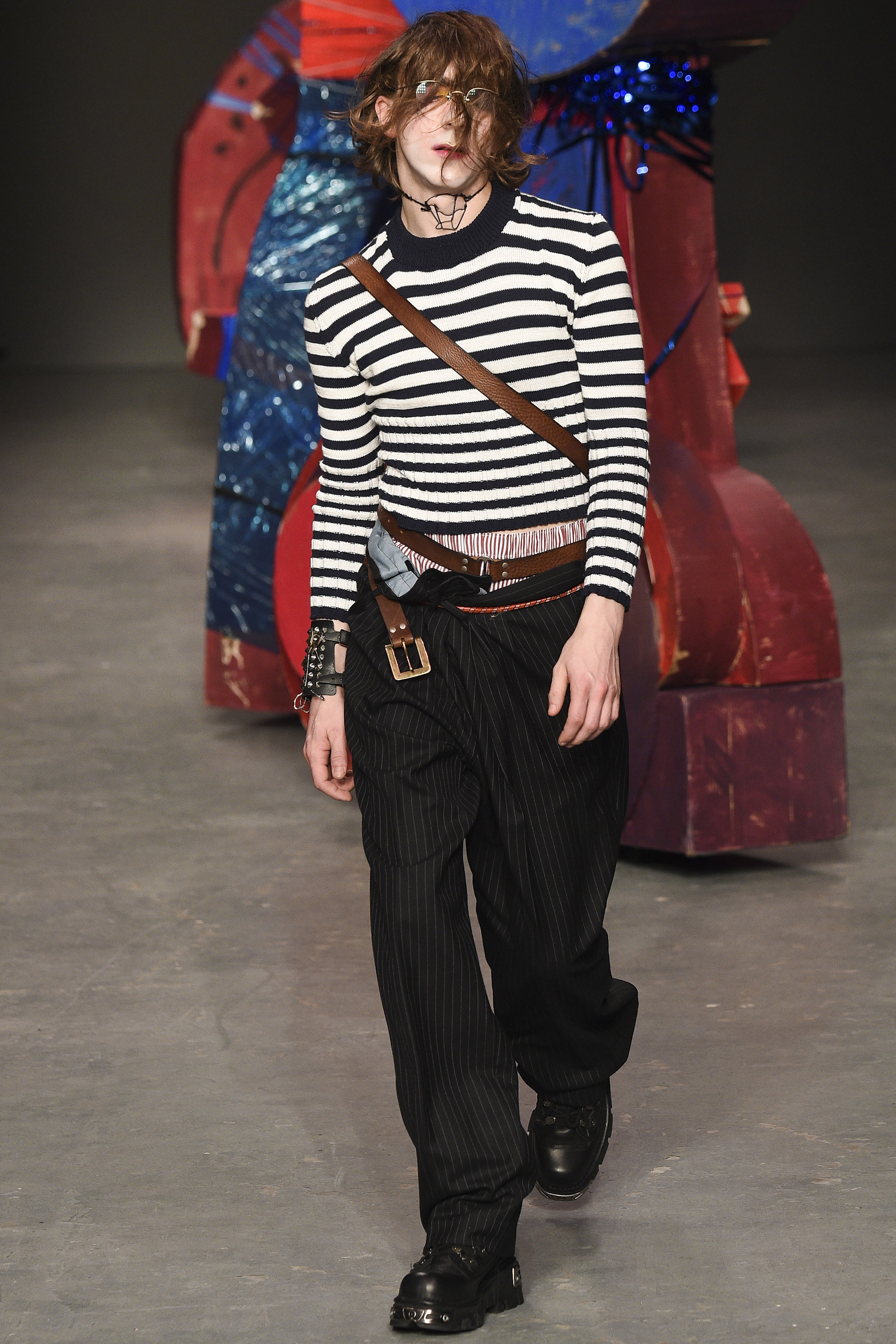 At least, it did for Fall 2016, where a trio of designers offered unique opinions on contemporary masculinity: black-shrouded Catholic schoolboys rubbed shoulders with a bejeweled West Indian master of ceremonies who were followed by a raggedy, drag-edy East London club kid in Party Monster flatforms and a bunched-up corduroy miniskirt. It takes all sorts to make the fashion world go round.