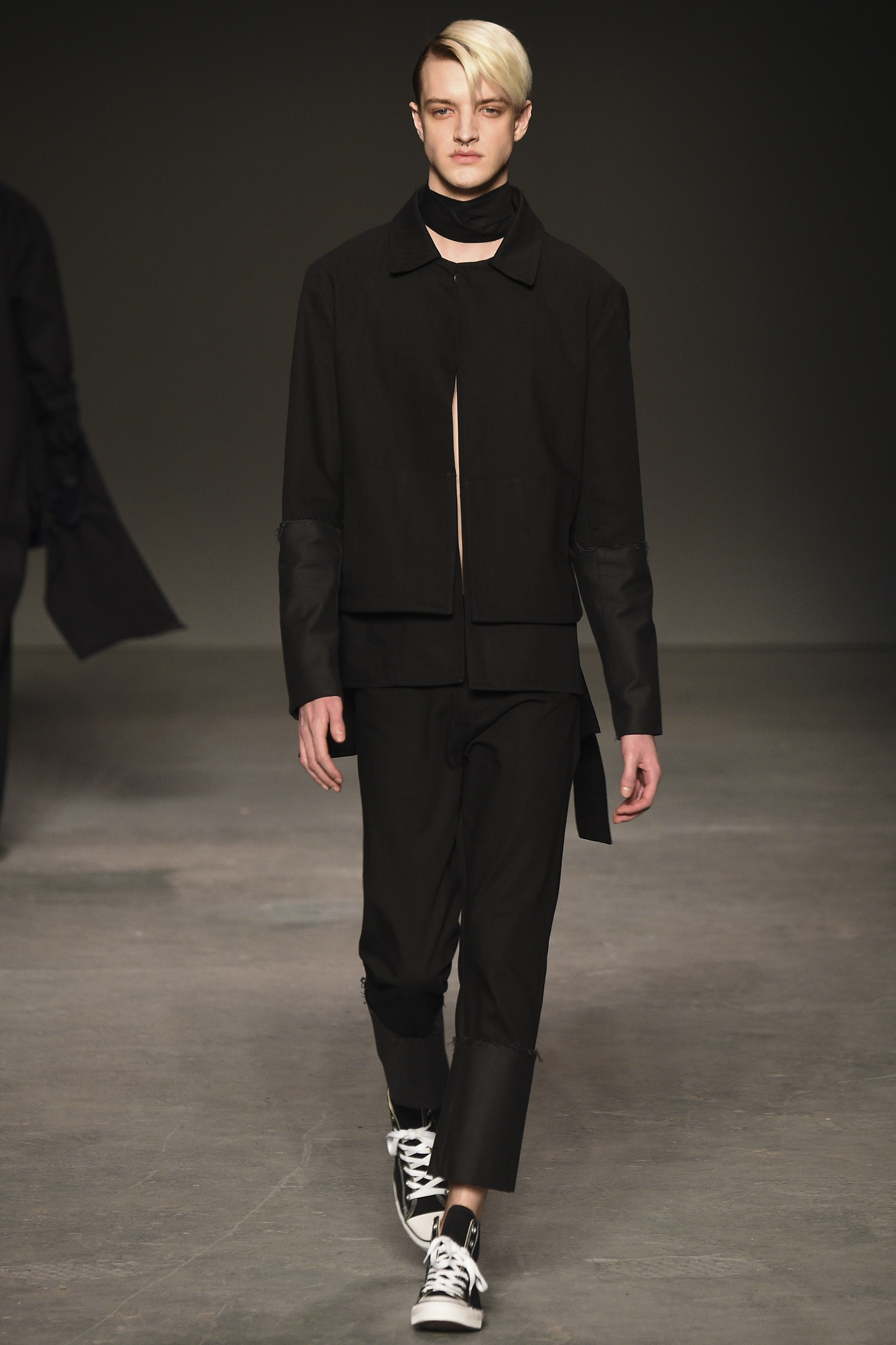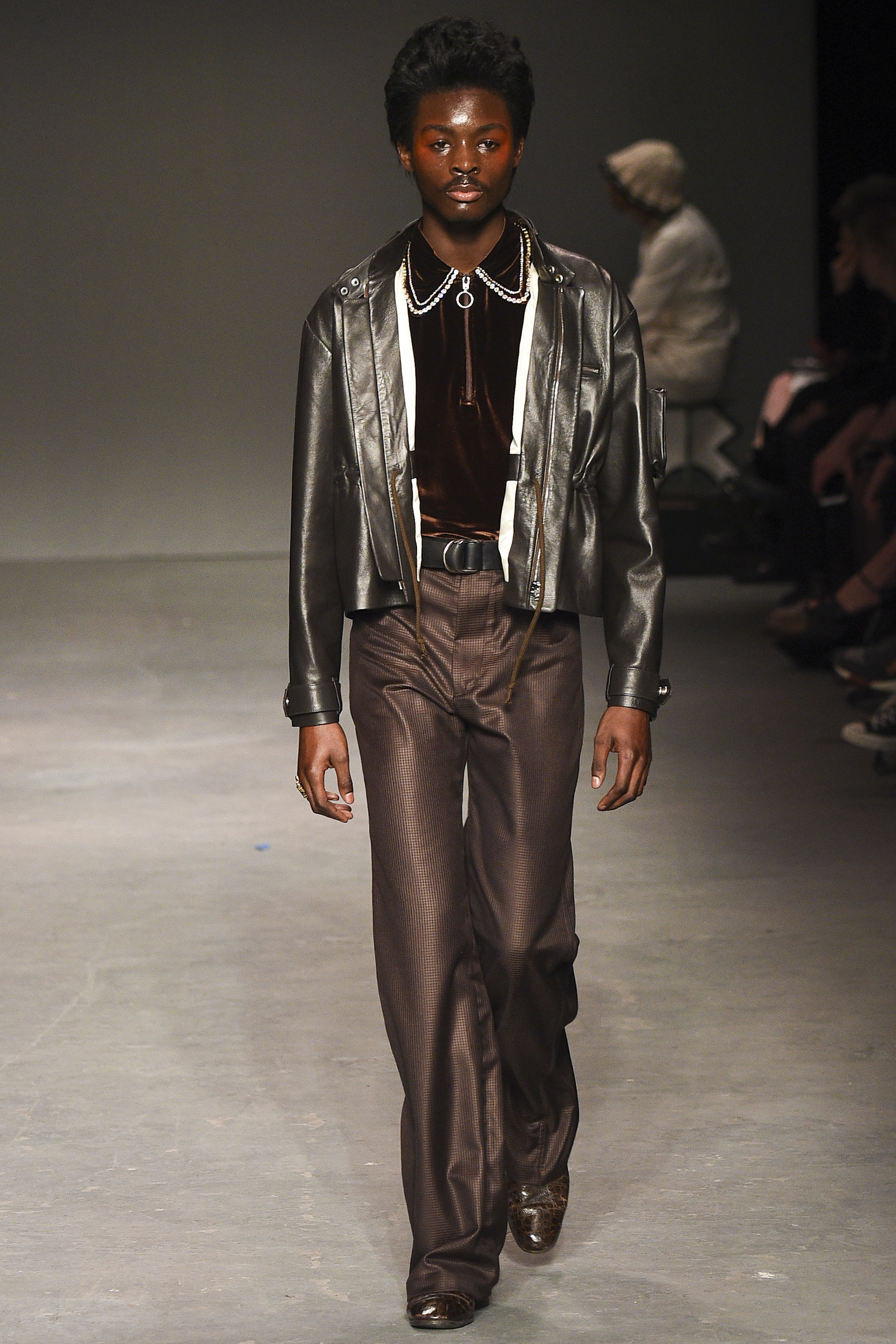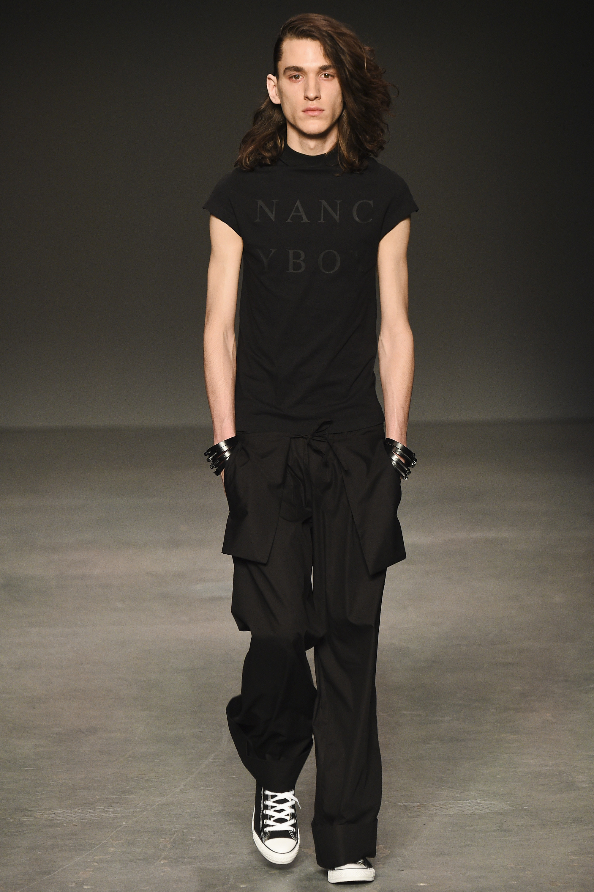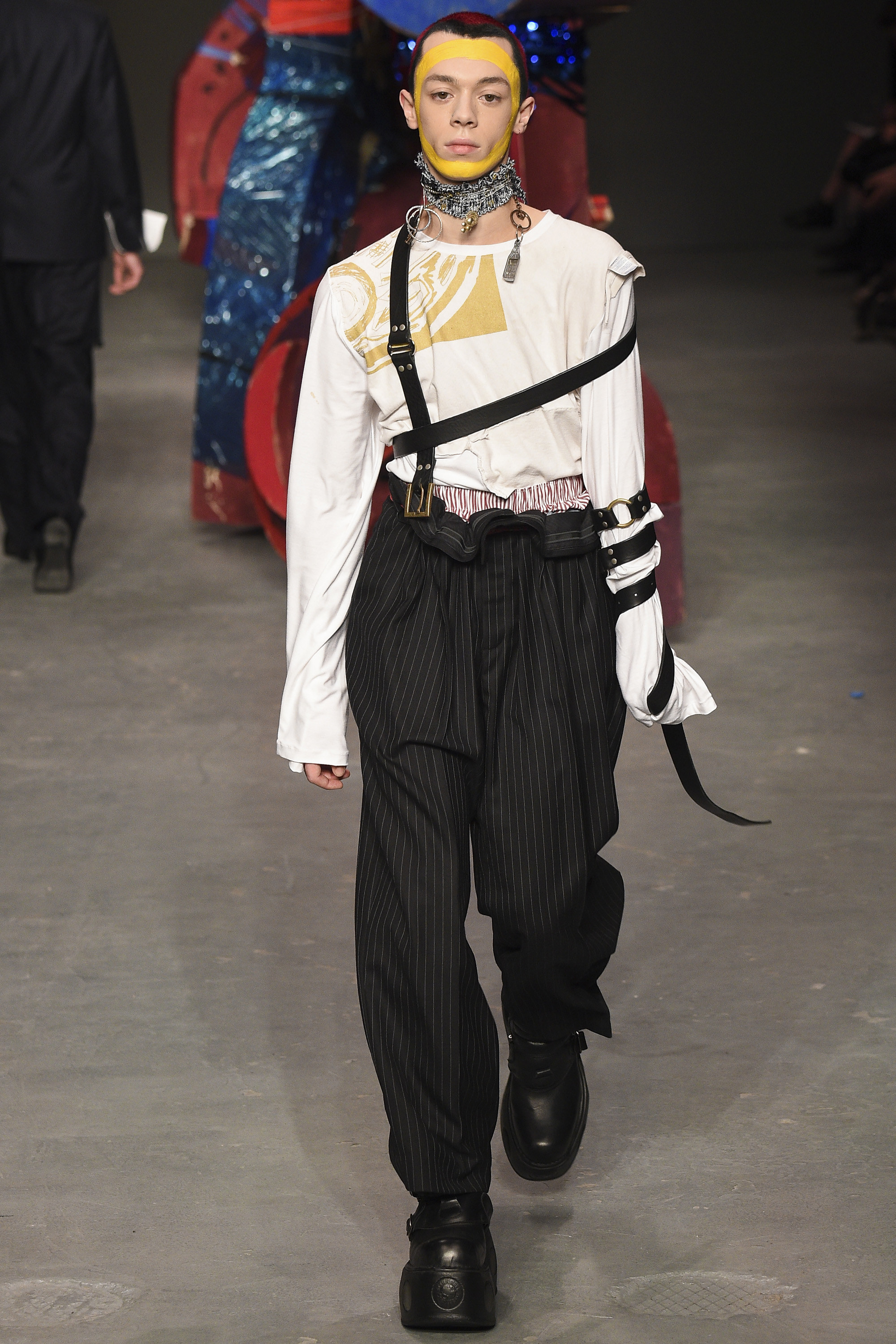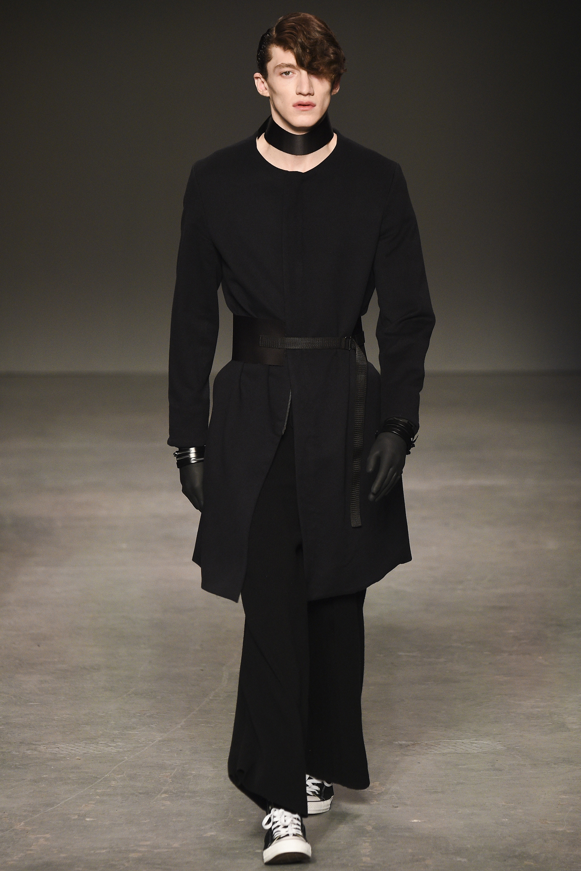 At least, it did for Fall 2016, where a trio of designers offered unique opinions on contemporary masculinity: black-shrouded Catholic schoolboys rubbed shoulders with a bejeweled West Indian master of ceremonies who were followed by a raggedy, drag-edy East London club kid in Party Monster flatforms and a bunched-up corduroy miniskirt. It takes all sorts to make the fashion world go round.
