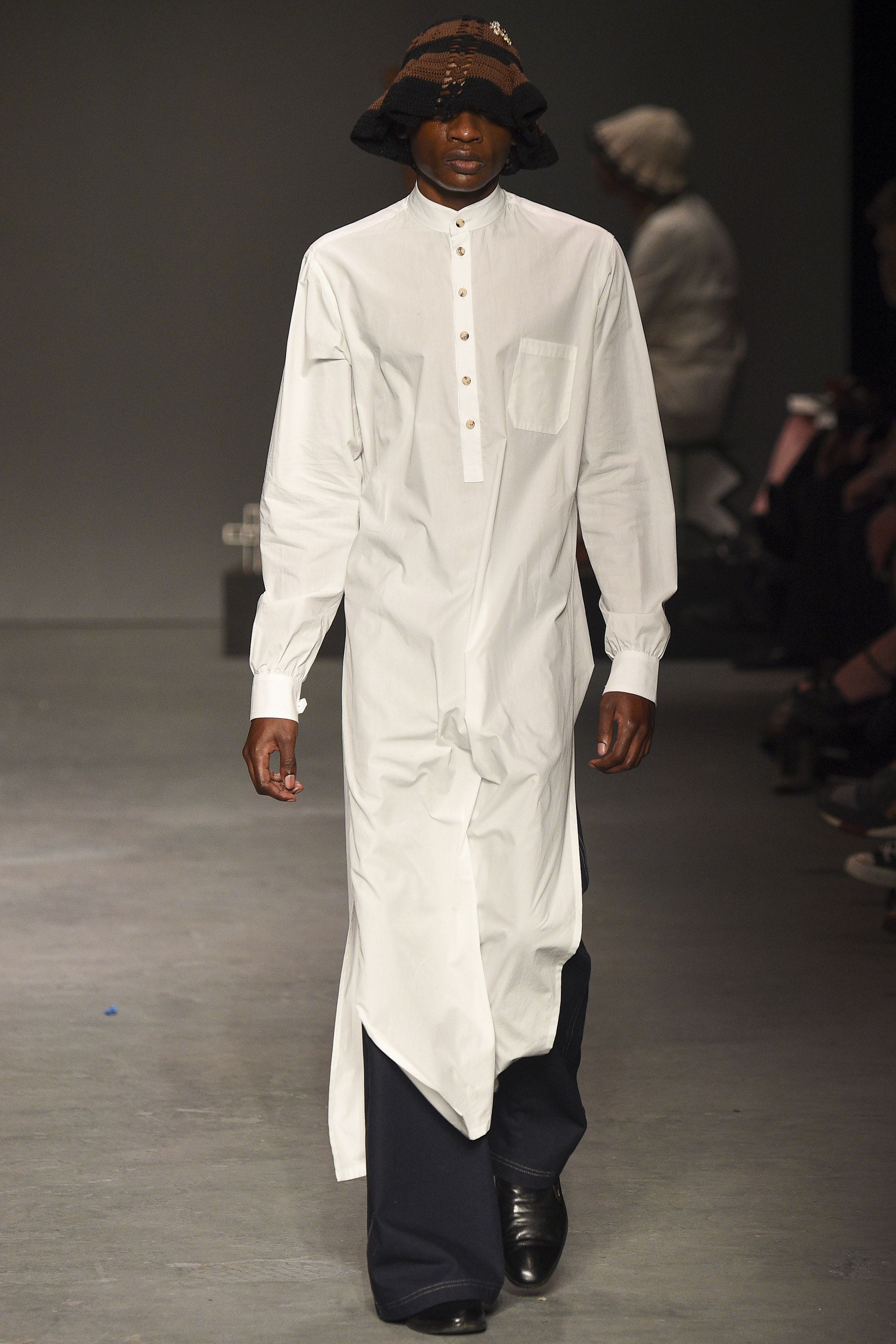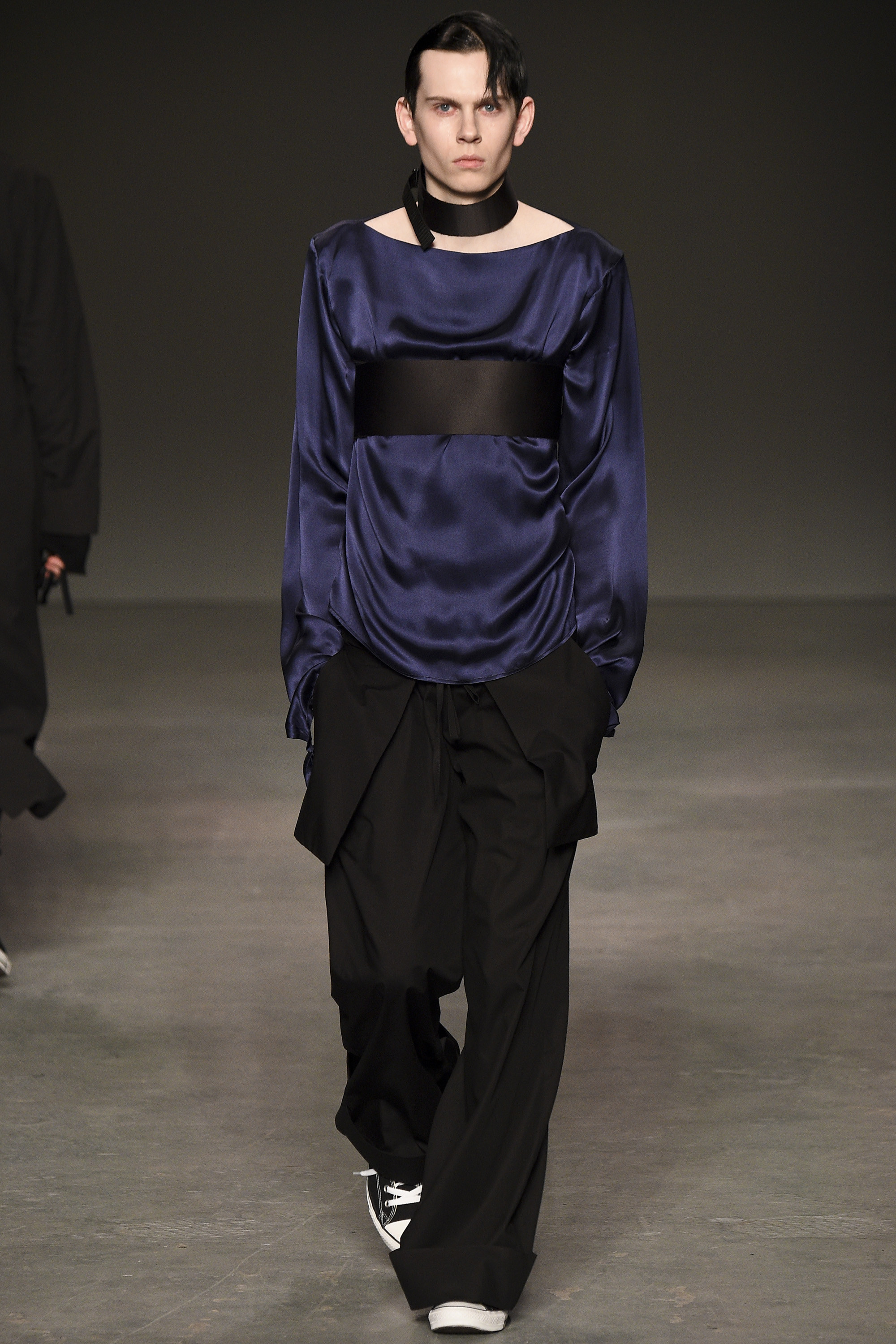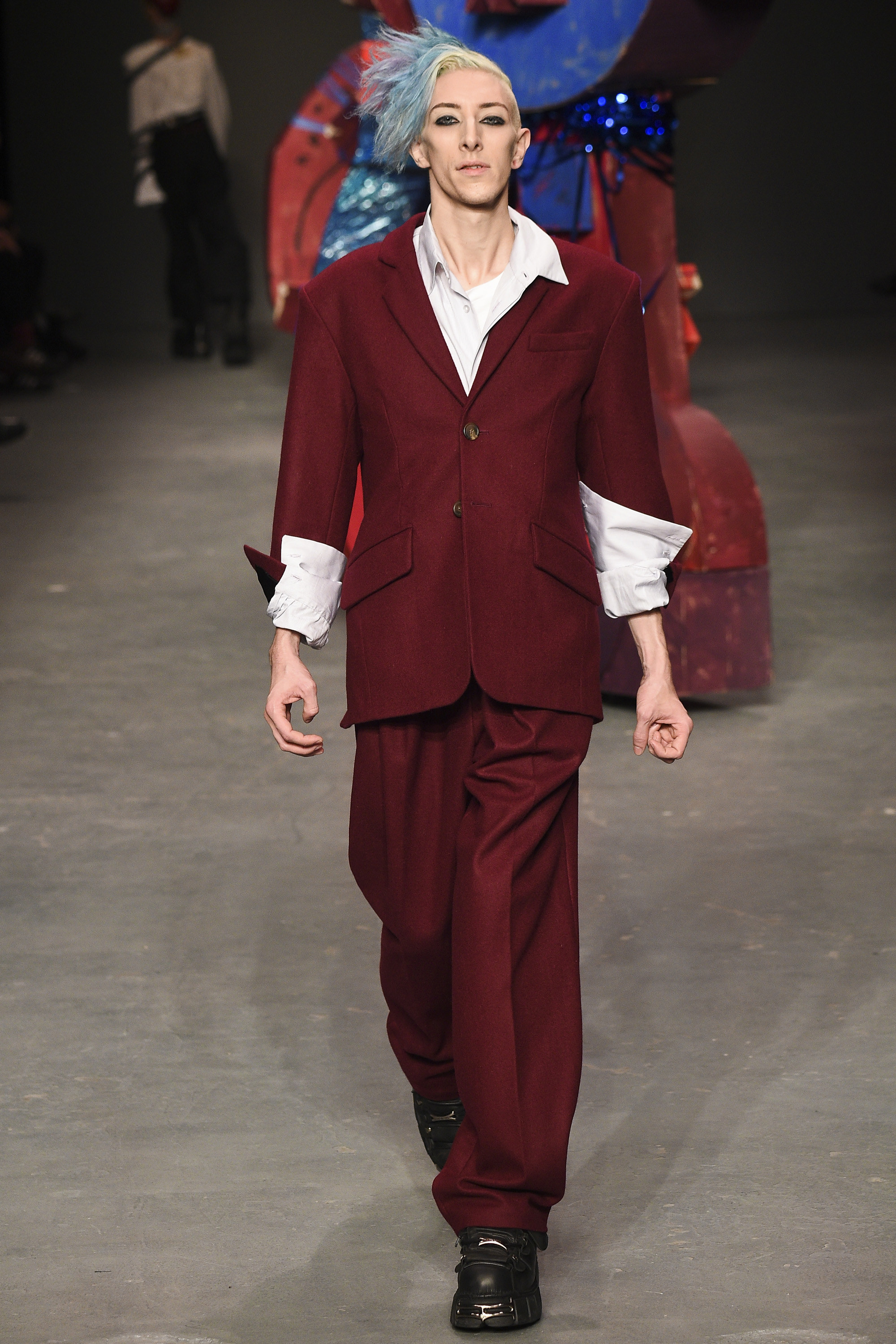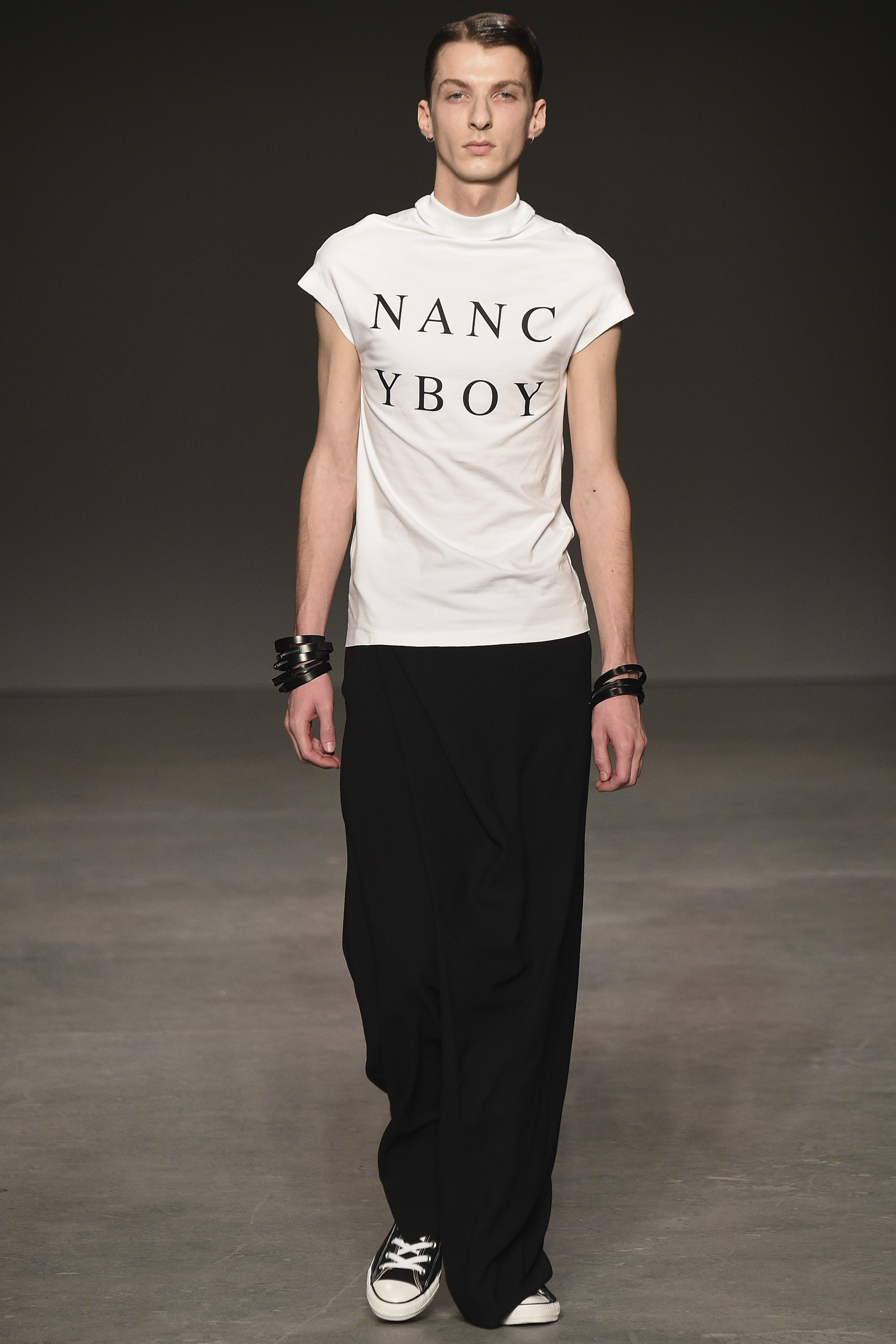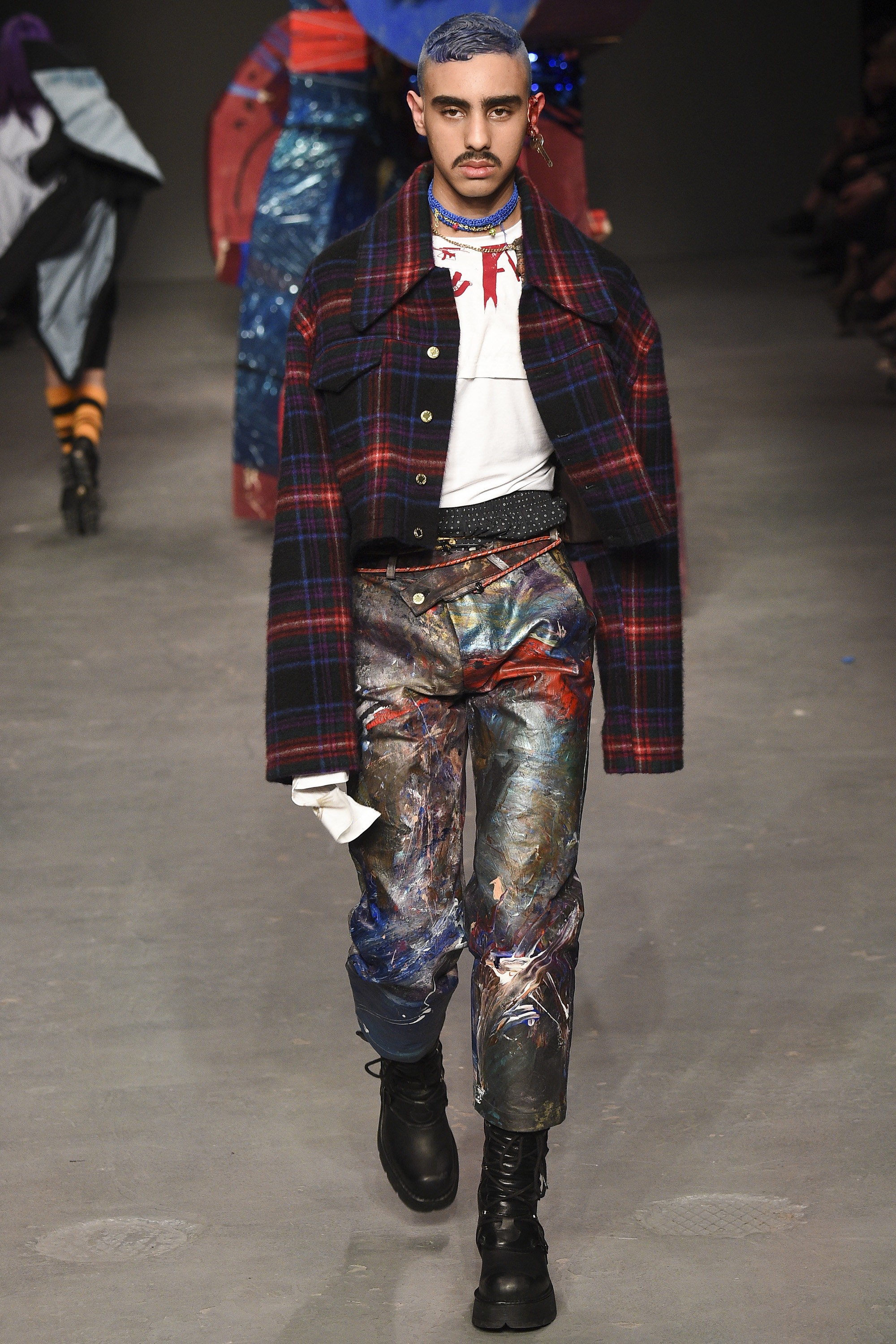 At least, it did for Fall 2016, where a trio of designers offered unique opinions on contemporary masculinity: black-shrouded Catholic schoolboys rubbed shoulders with a bejeweled West Indian master of ceremonies who were followed by a raggedy, drag-edy East London club kid in Party Monster flatforms and a bunched-up corduroy miniskirt. It takes all sorts to make the fashion world go round.