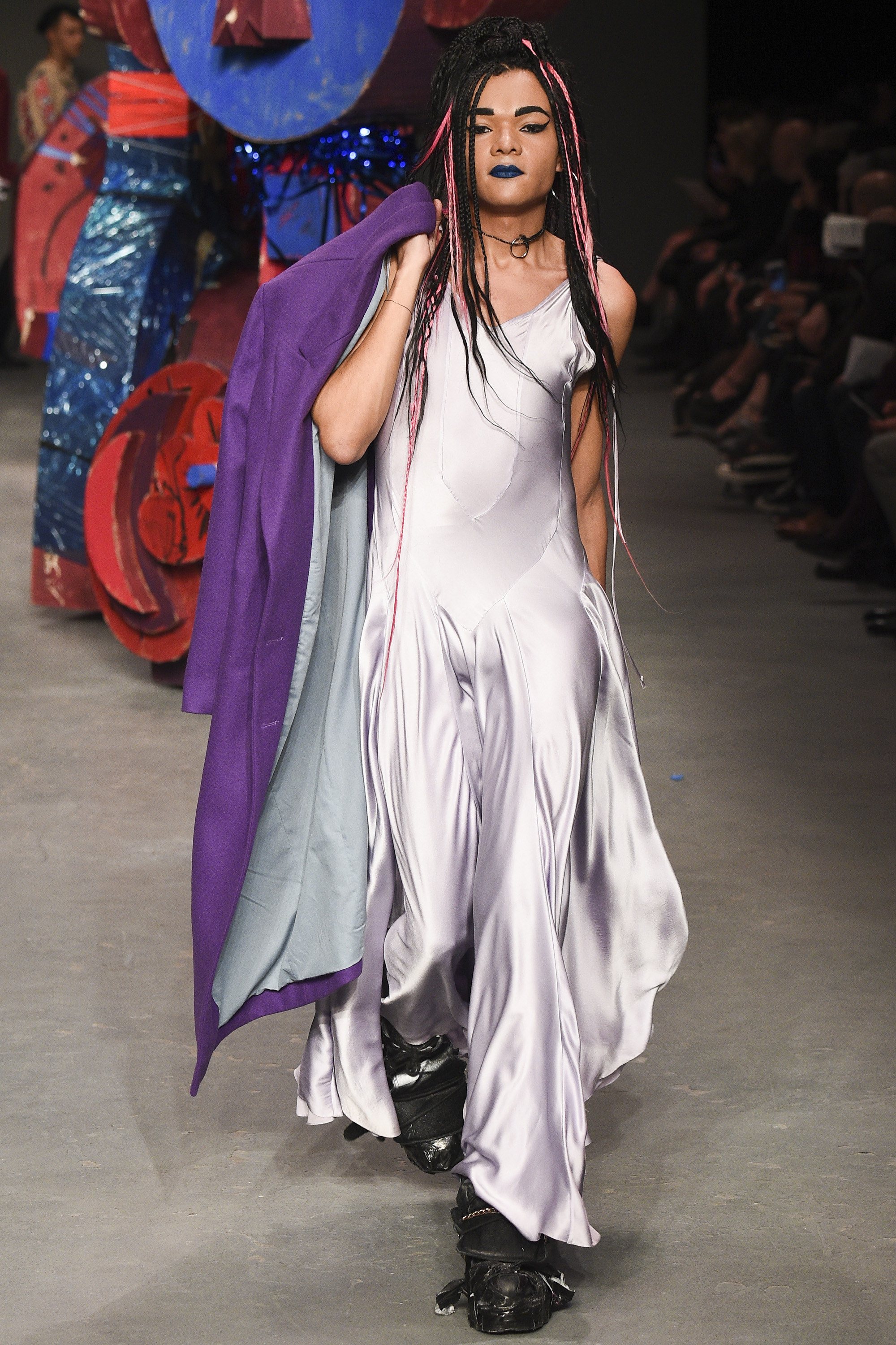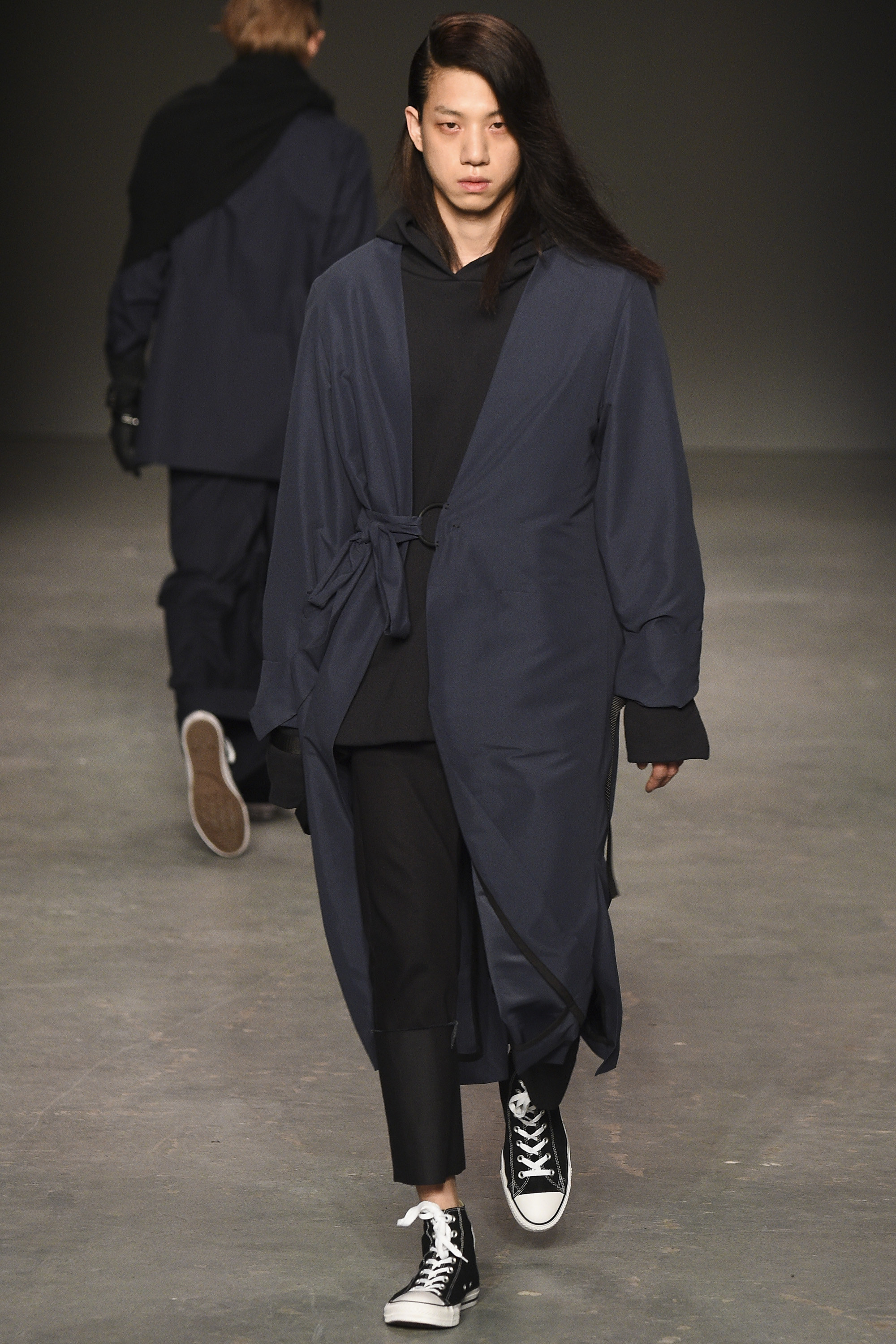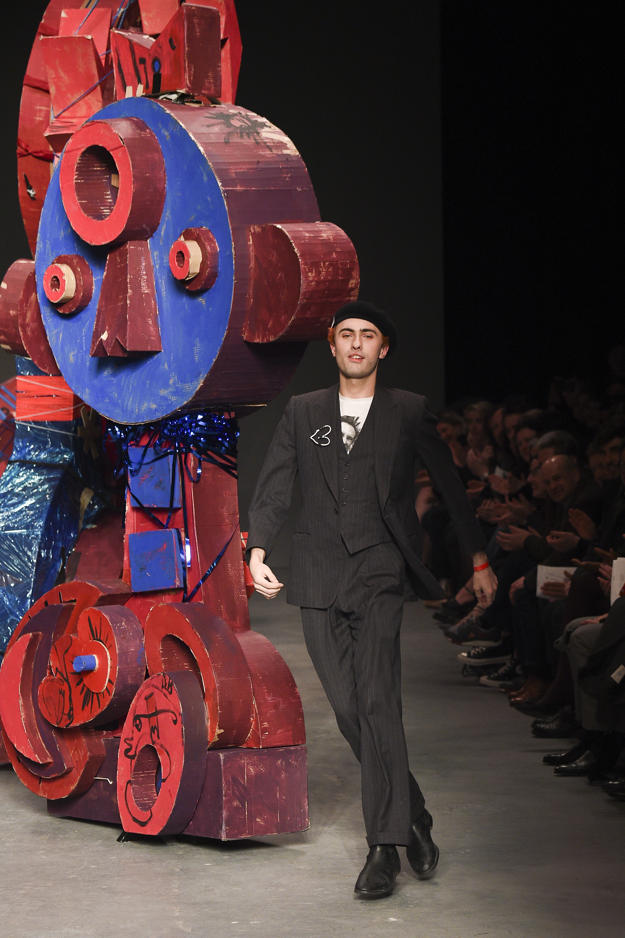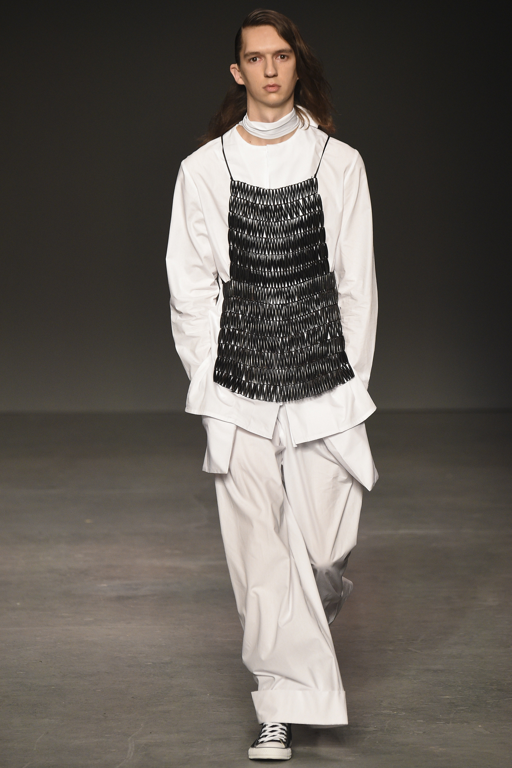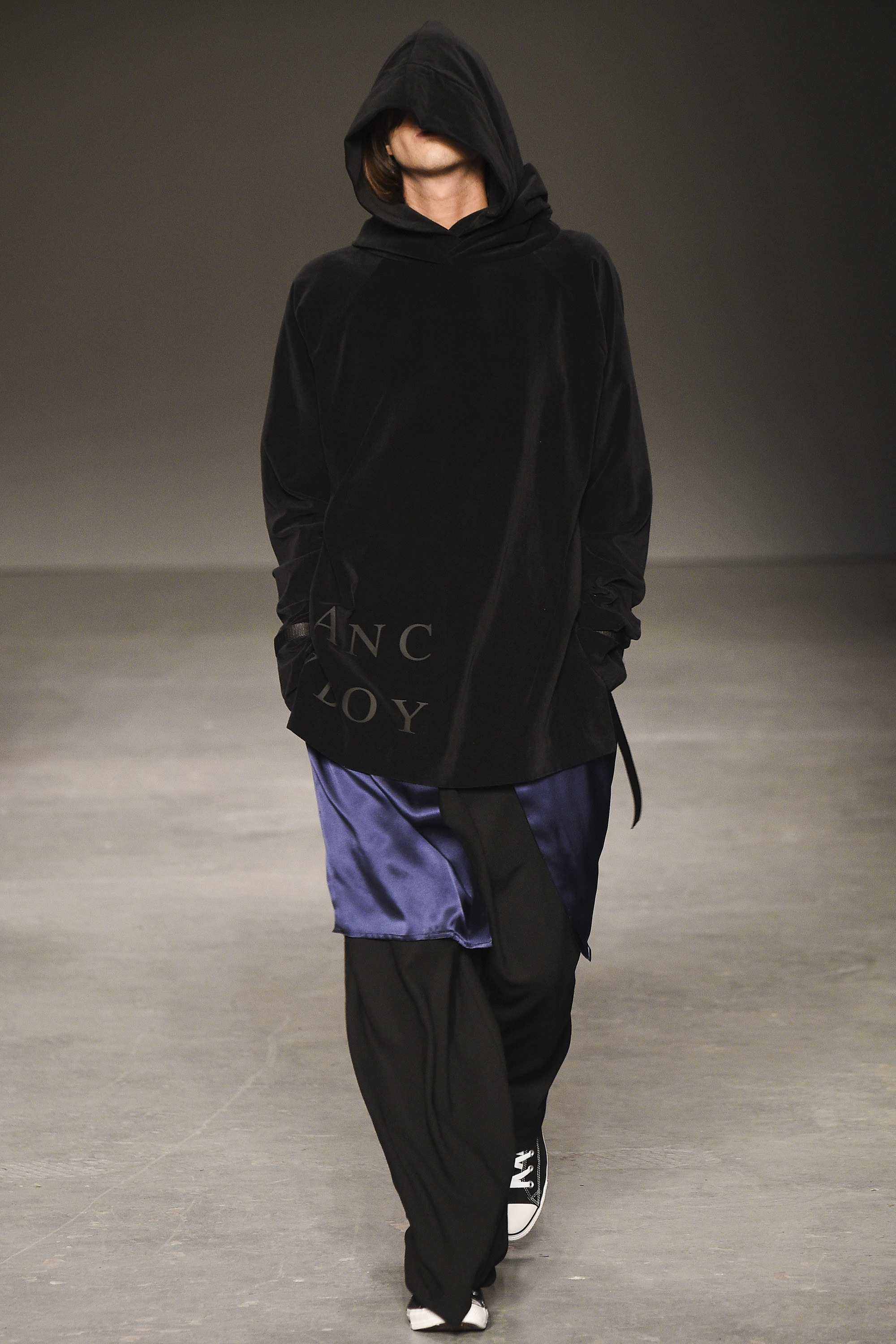 At least, it did for Fall 2016, where a trio of designers offered unique opinions on contemporary masculinity: black-shrouded Catholic schoolboys rubbed shoulders with a bejeweled West Indian master of ceremonies who were followed by a raggedy, drag-edy East London club kid in Party Monster flatforms and a bunched-up corduroy miniskirt. It takes all sorts to make the fashion world go round.