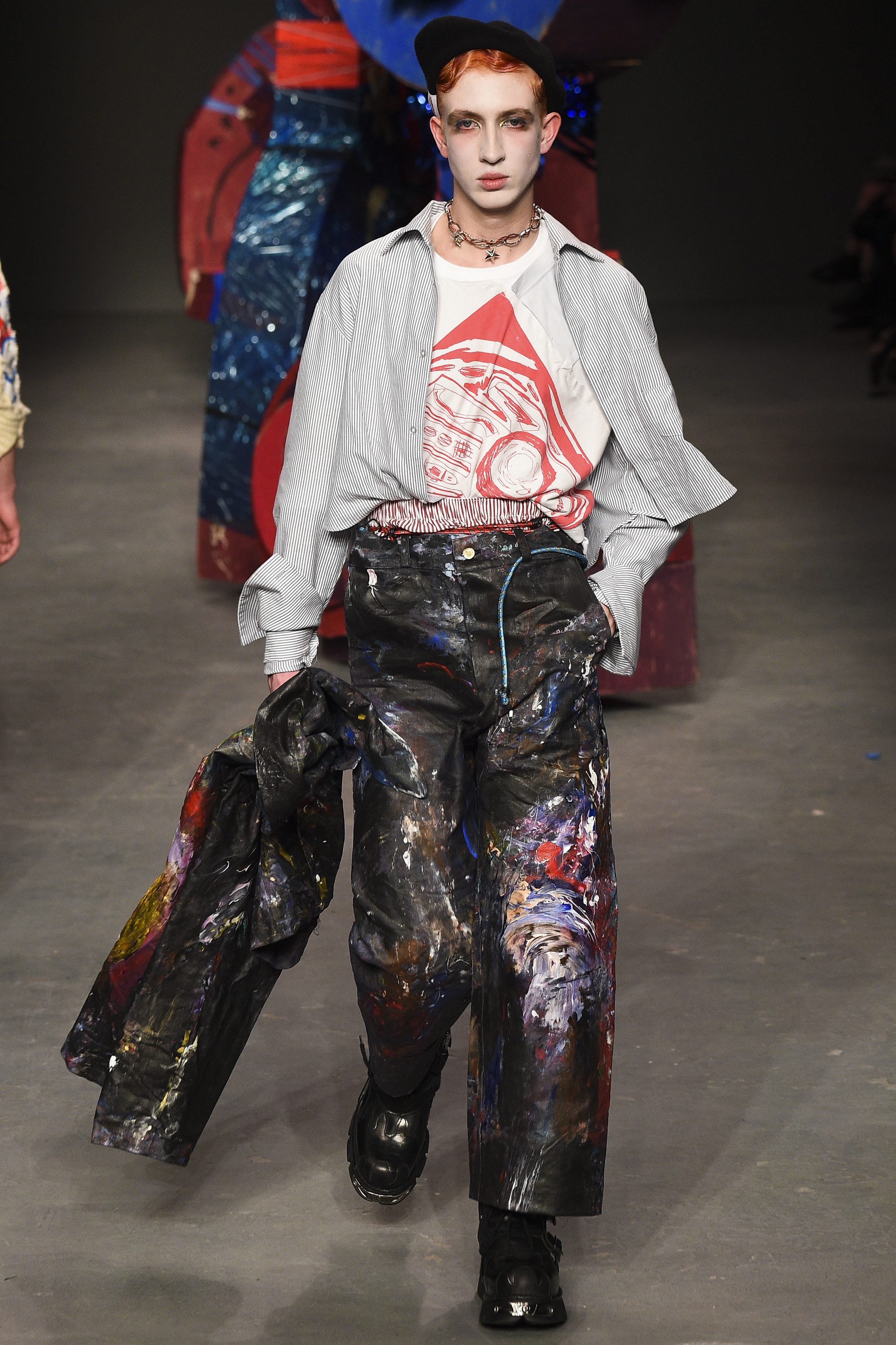 Maybe that uniform has changed, though? That was the feeling you got with Charles Jeffrey, whose pierced, powdered, and pomaded band of dandy rebels careened about cardboard totems. They were the ones in the skirts but also in tucked and tweaked jackets (Jeffrey called them “nervous,” their tailoring reflecting the tics and tugs characteristic of anxiety attacks). It looked a mess. Here’s the clever thing: backstage it actually wasn’t. The knitwear, especially, with its high-rise girdle of ribbing, chopped-out shoulders, or buckshot pointelle patch across the chest, is worthy not only of merit, but of attention. All these designers are. Get ready for impact.