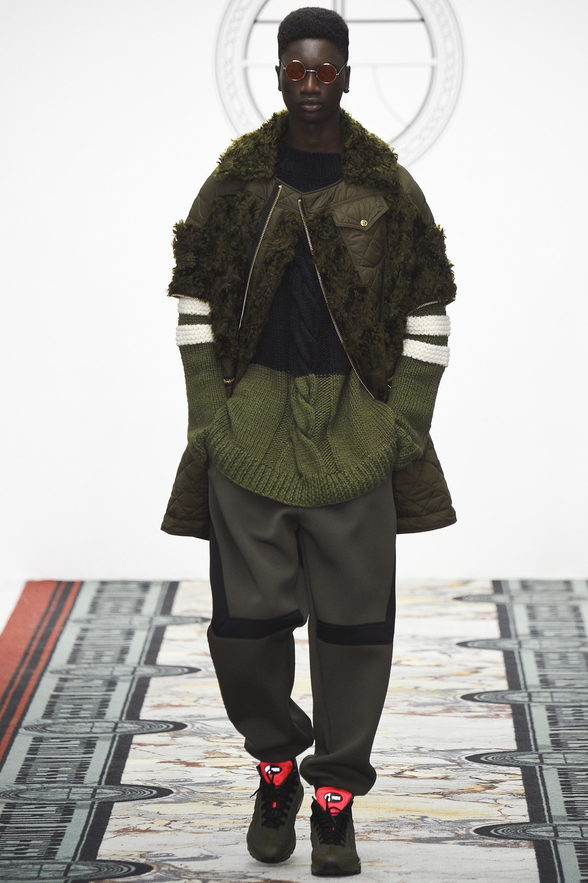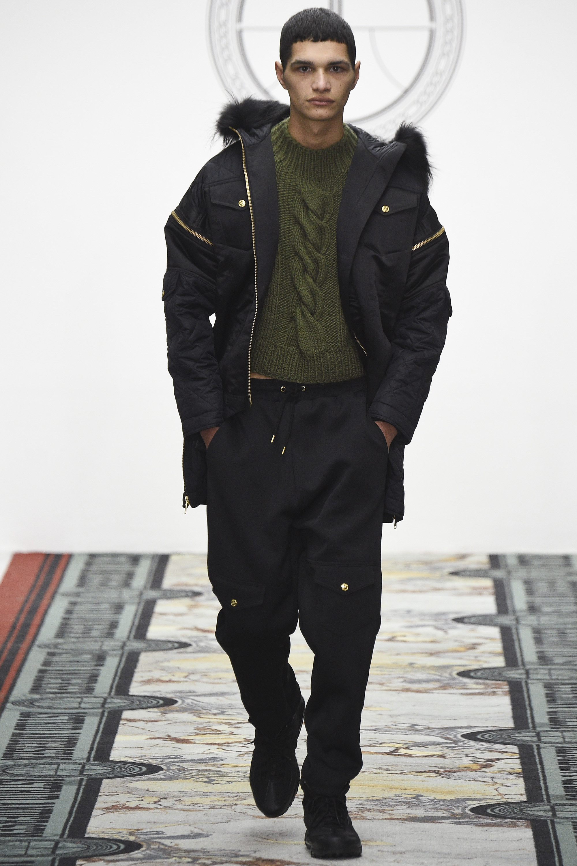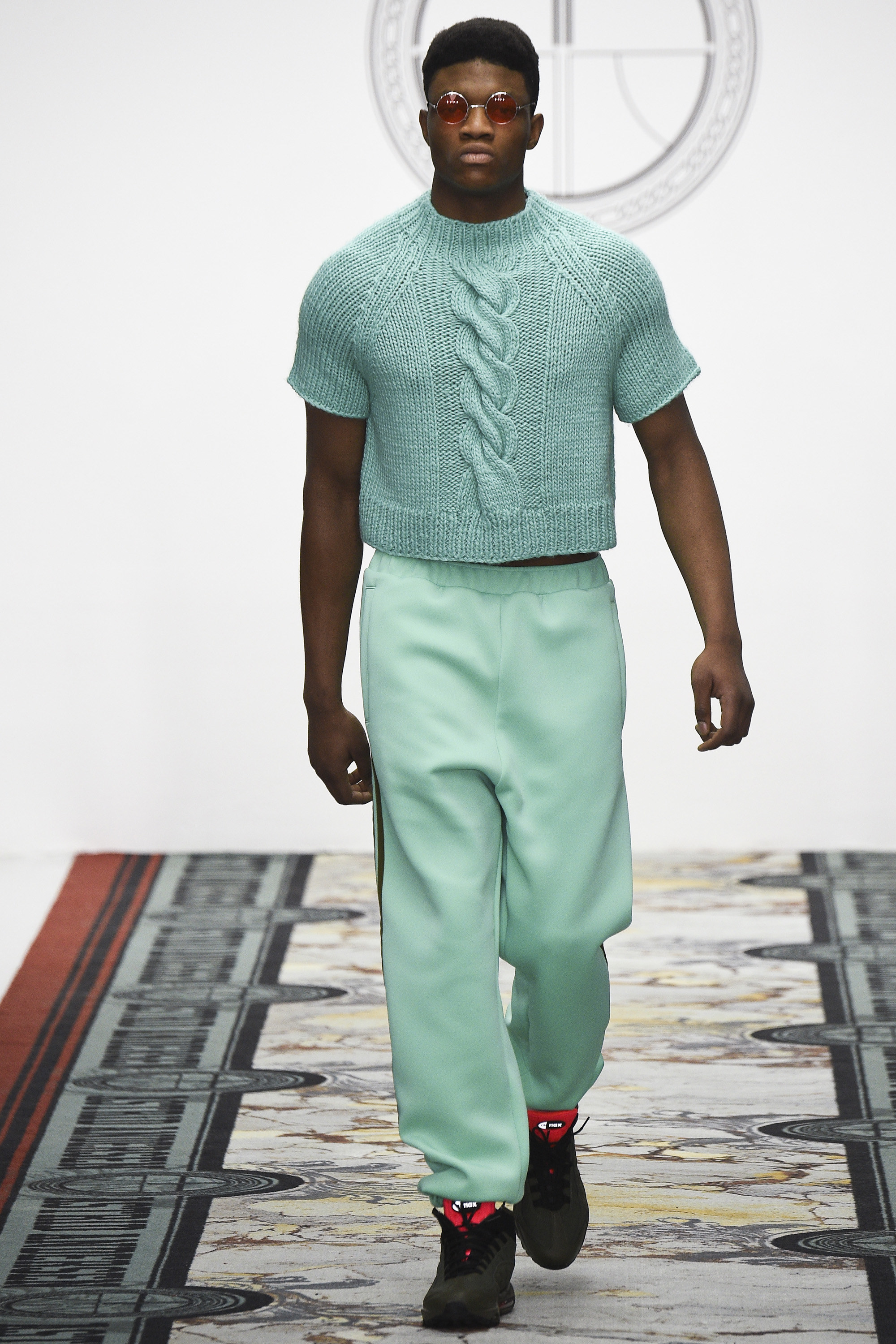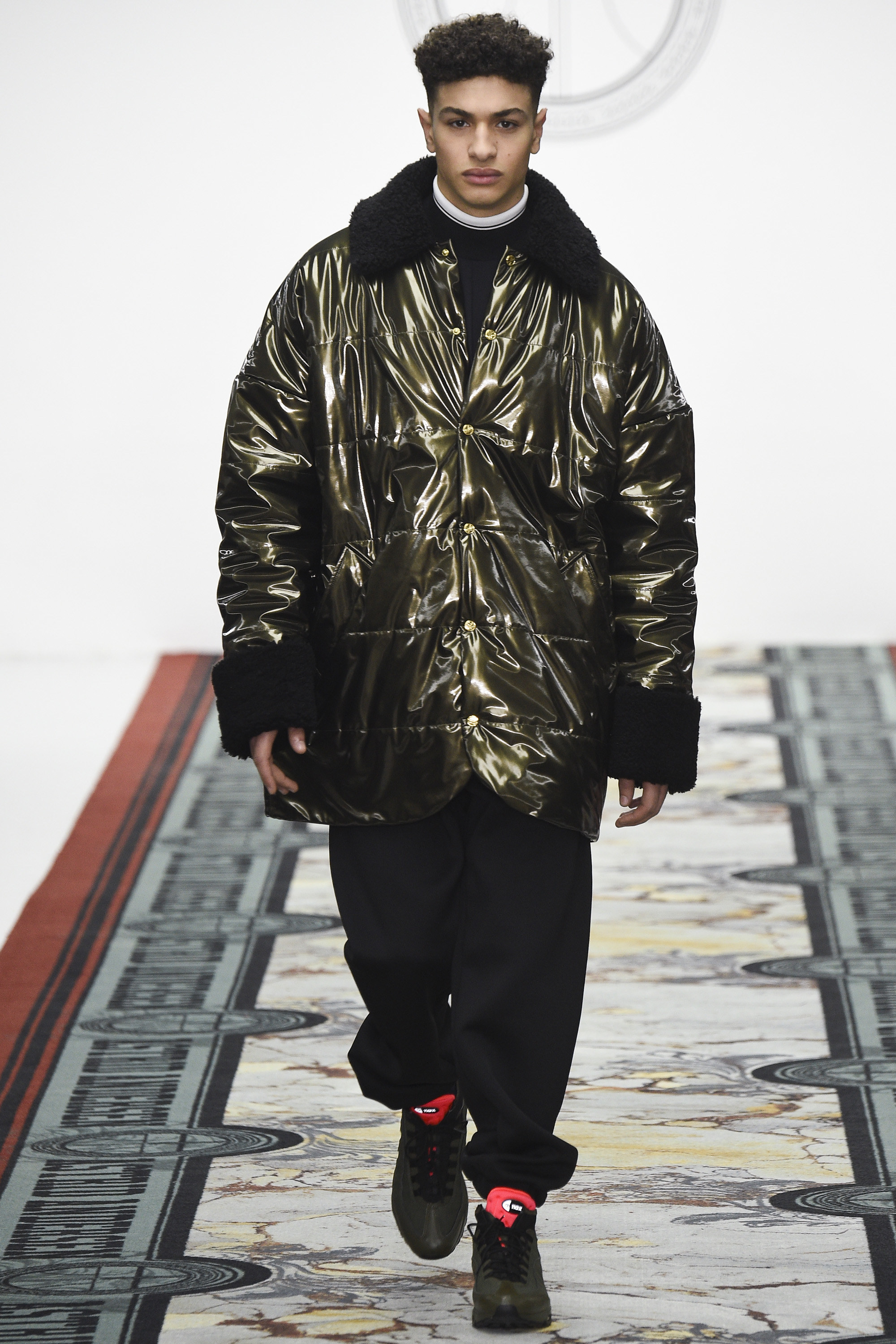 Today seemed to represent a departure from that template. Two all-gray woolen tracksuits with popper pockets seemed downright dour. And wait, was that a loose wool notch-lapel overcoat? Admittedly, the coat was worn over track pants with a panel of golden Sophie Hallette lace above the knee—yet this felt like a daring, almost retrograde incorporation of the startlingly conventional within the designer’s reliably unconventional aesthetic. Chunky knits rested easily under parkas the wearer could deconstruct by a web of golden zippers. An irregularly folded velour was the basis of a louche tracksuit. Later, there were more woolen remixes of the sweatshirt and dungarees, this time in RAF blue. Sure, there was more lace and a powerful pistachio section for customers determined to draw every eye in the room. And feather-stuffed gauntlets are hardly prosaic items of masculine apparel. Alongside gold, pistachio starred again in the weave of the tweed specially developed by Andersen and Linton, a traditional English fabric supplier. This was an intriguing exercise in inclusivity—by broadening her range, Andersen demonstrated that her core style could translate well beyond its existing fan base. This reviewer has long admired her work as an aesthetic exercise but is a hopeless geriatric to whom it never seemed personally relevant. Today, for the first time, I could easily imagine wearing some of it, too. Just nothing in pistachio.