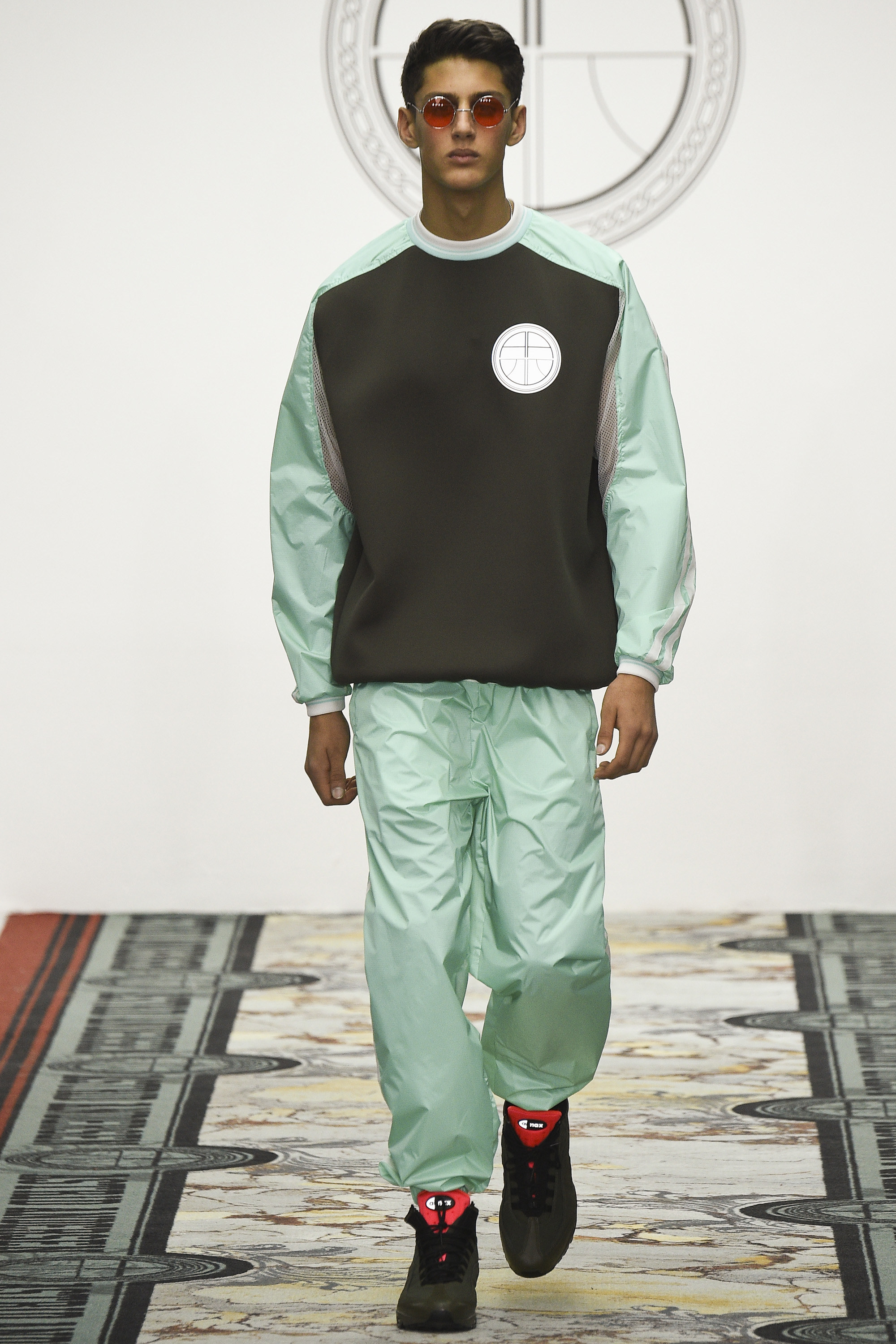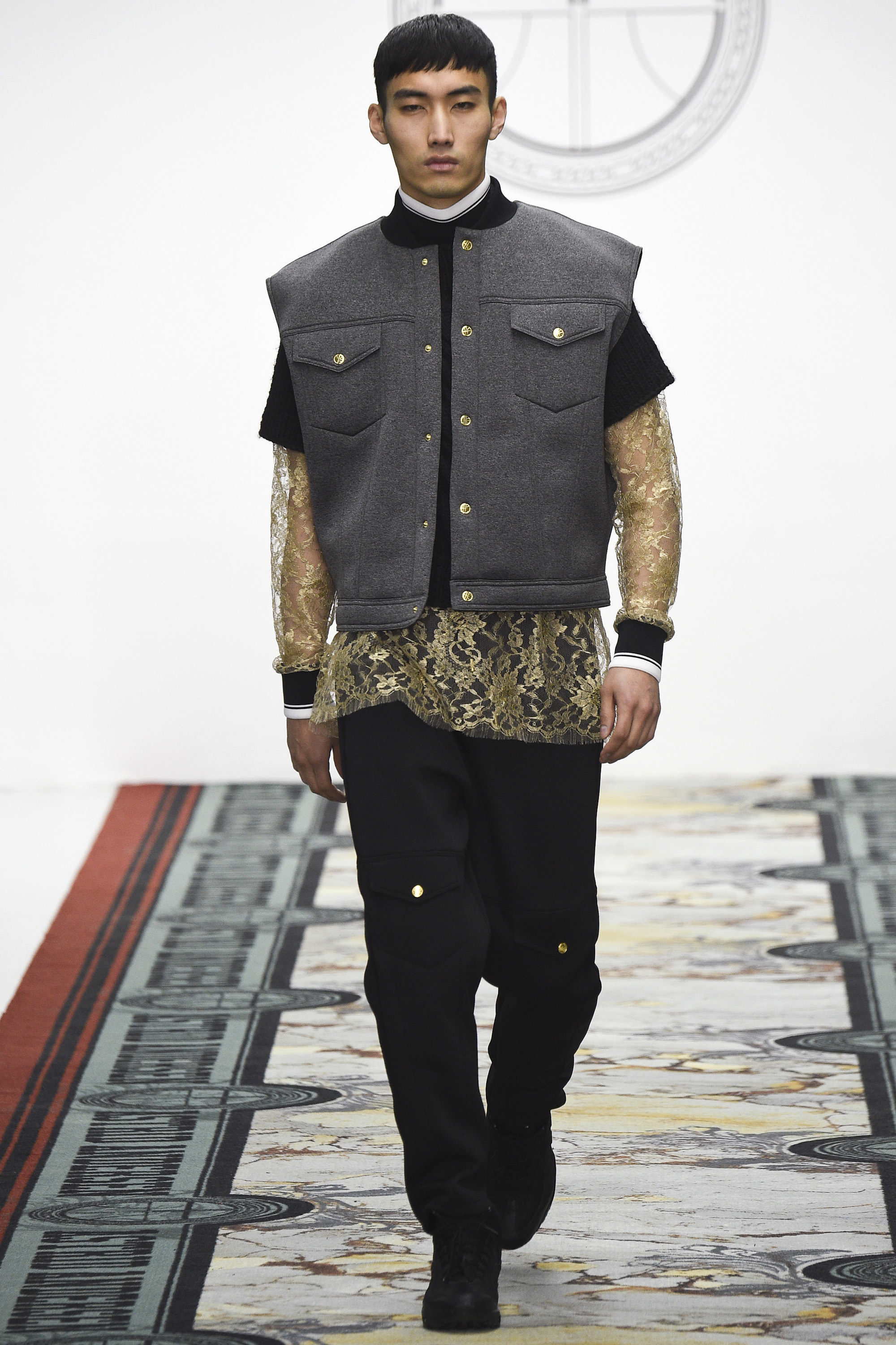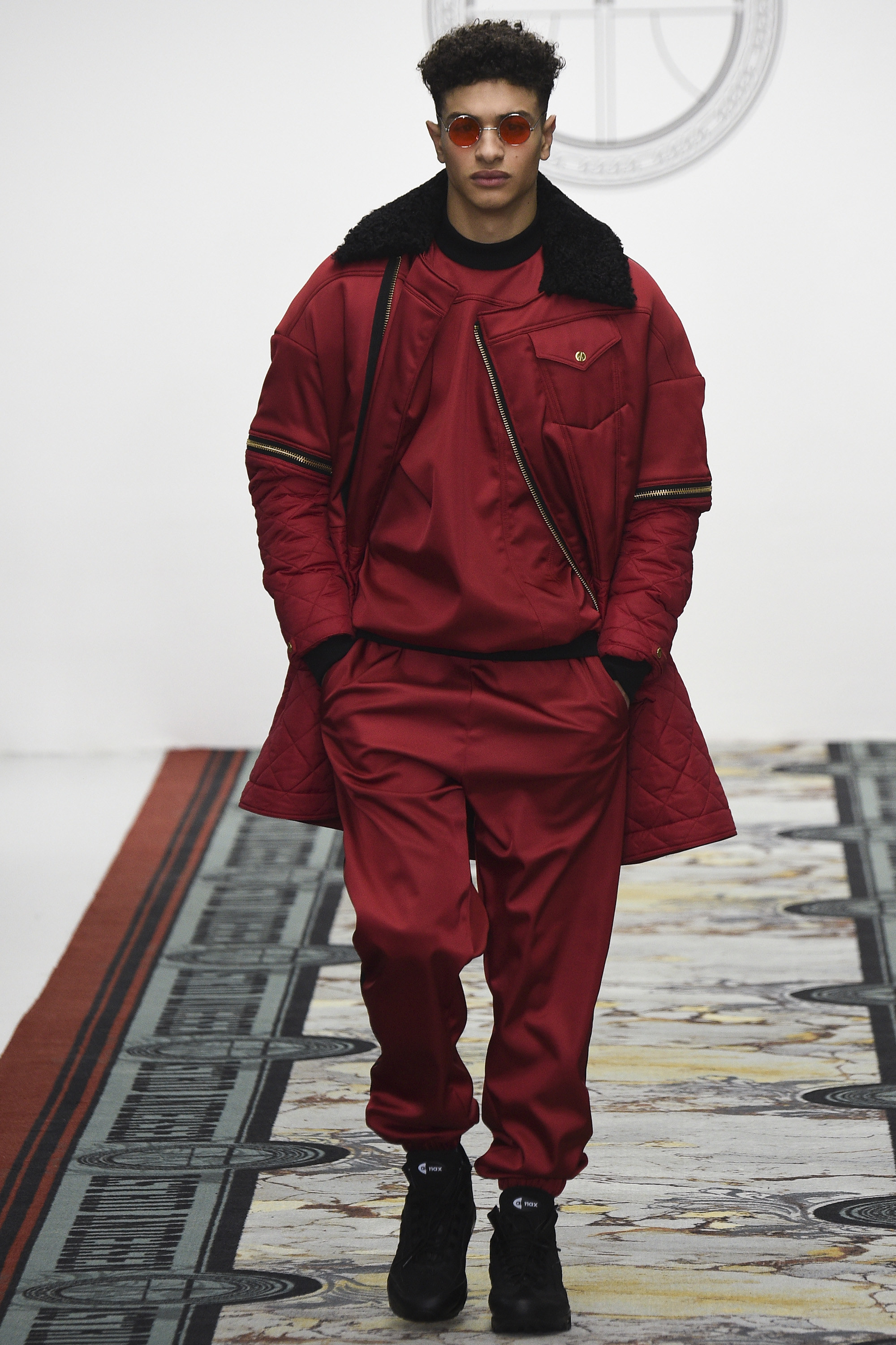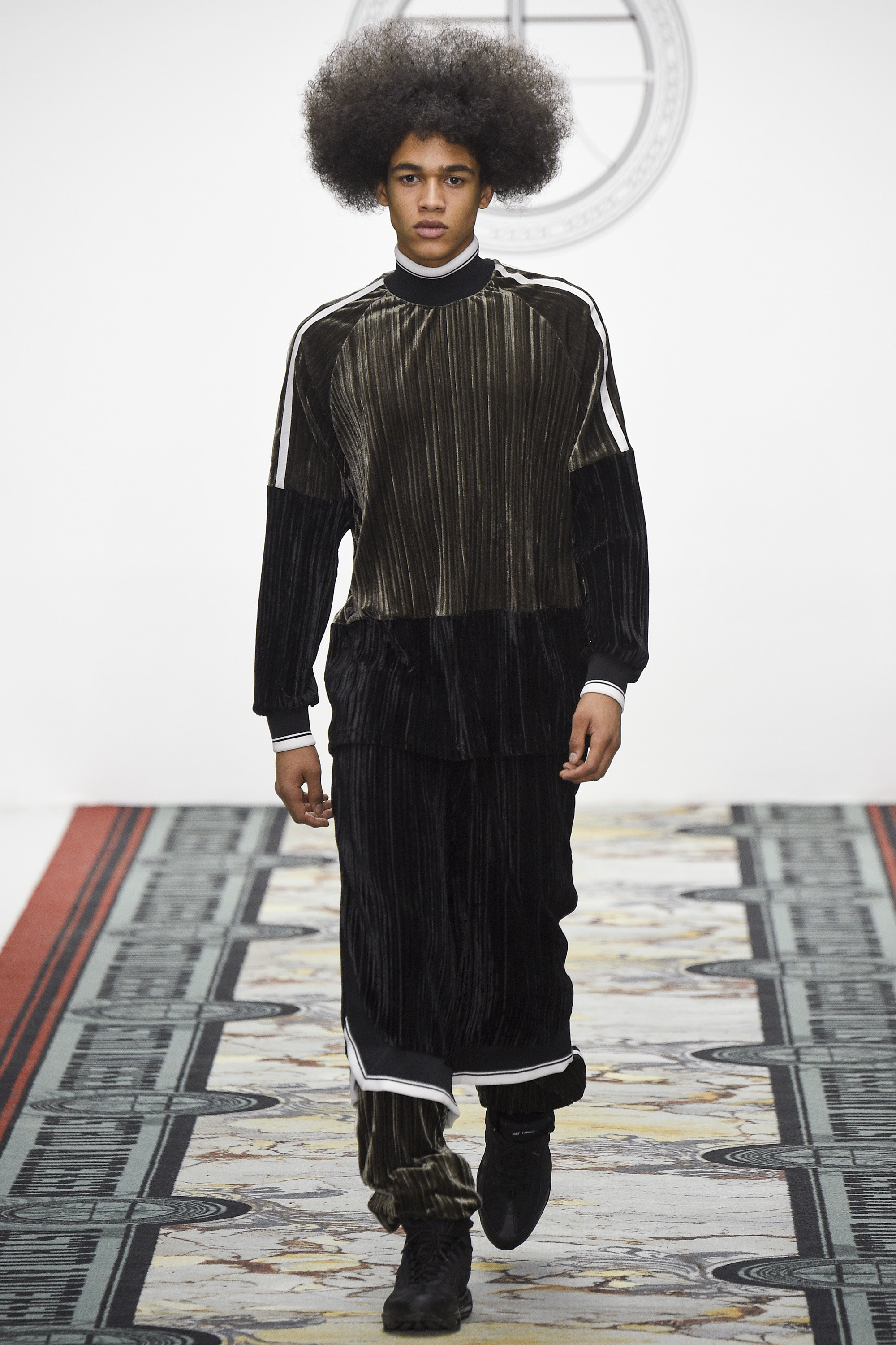 Today seemed to represent a departure from that template. Two all-gray woolen tracksuits with popper pockets seemed downright dour. And wait, was that a loose wool notch-lapel overcoat? Admittedly, the coat was worn over track pants with a panel of golden Sophie Hallette lace above the knee—yet this felt like a daring, almost retrograde incorporation of the startlingly conventional within the designer’s reliably unconventional aesthetic. Chunky knits rested easily under parkas the wearer could deconstruct by a web of golden zippers. An irregularly folded velour was the basis of a louche tracksuit. Later, there were more woolen remixes of the sweatshirt and dungarees, this time in RAF blue. Sure, there was more lace and a powerful pistachio section for customers determined to draw every eye in the room. And feather-stuffed gauntlets are hardly prosaic items of masculine apparel. Alongside gold, pistachio starred again in the weave of the tweed specially developed by Andersen and Linton, a traditional English fabric supplier. This was an intriguing exercise in inclusivity—by broadening her range, Andersen demonstrated that her core style could translate well beyond its existing fan base. This reviewer has long admired her work as an aesthetic exercise but is a hopeless geriatric to whom it never seemed personally relevant. Today, for the first time, I could easily imagine wearing some of it, too. Just nothing in pistachio.