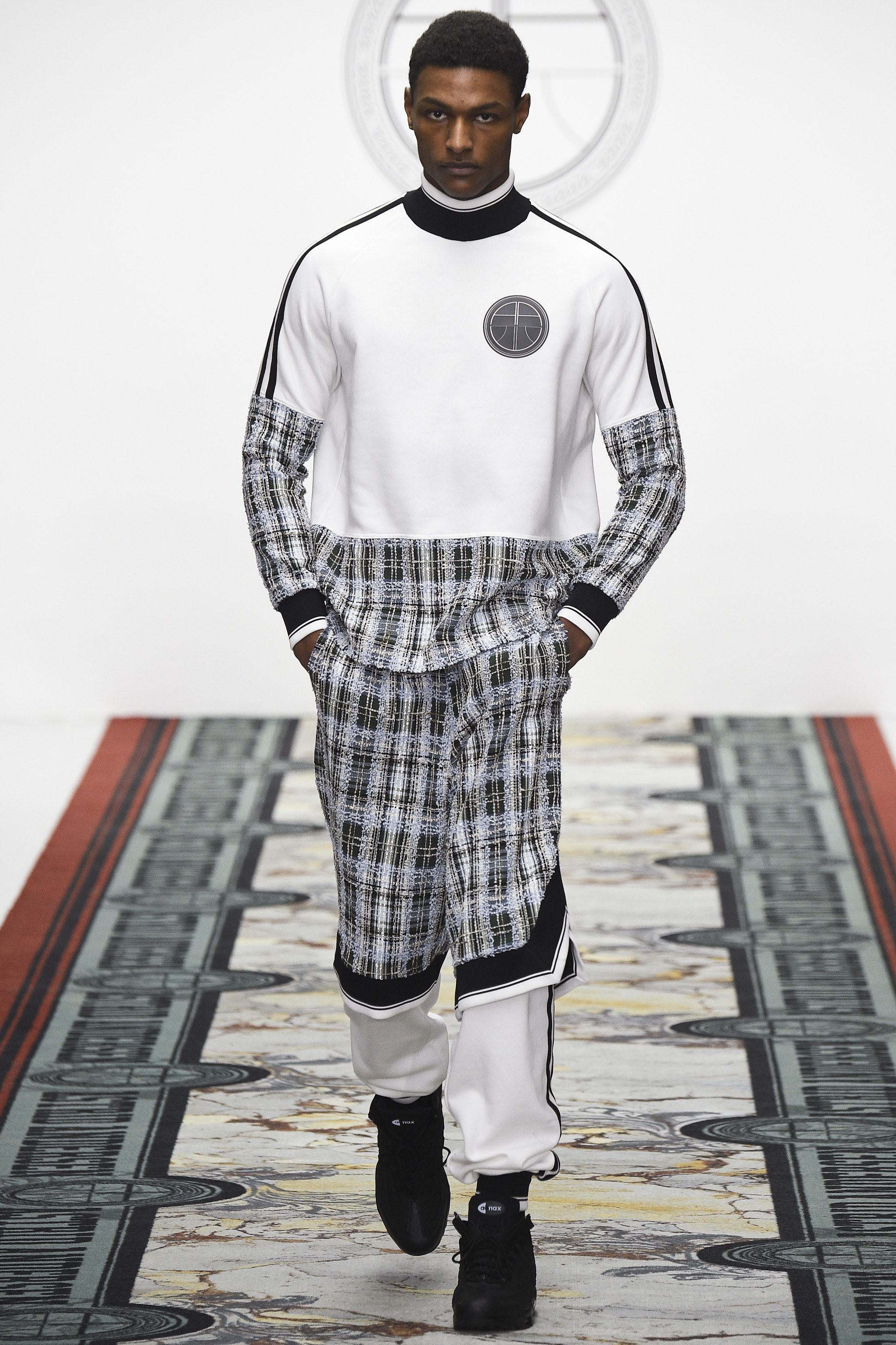 Today seemed to represent a departure from that template. Two all-gray woolen tracksuits with popper pockets seemed downright dour. And wait, was that a loose wool notch-lapel overcoat? Admittedly, the coat was worn over track pants with a panel of golden Sophie Hallette lace above the knee—yet this felt like a daring, almost retrograde incorporation of the startlingly conventional within the designer’s reliably unconventional aesthetic. Chunky knits rested easily under parkas the wearer could deconstruct by a web of golden zippers. An irregularly folded velour was the basis of a louche tracksuit. Later, there were more woolen remixes of the sweatshirt and dungarees, this time in RAF blue. Sure, there was more lace and a powerful pistachio section for customers determined to draw every eye in the room. And feather-stuffed gauntlets are hardly prosaic items of masculine apparel. Alongside gold, pistachio starred again in the weave of the tweed specially developed by Andersen and Linton, a traditional English fabric supplier. This was an intriguing exercise in inclusivity—by broadening her range, Andersen demonstrated that her core style could translate well beyond its existing fan base. This reviewer has long admired her work as an aesthetic exercise but is a hopeless geriatric to whom it never seemed personally relevant. Today, for the first time, I could easily imagine wearing some of it, too. Just nothing in pistachio.