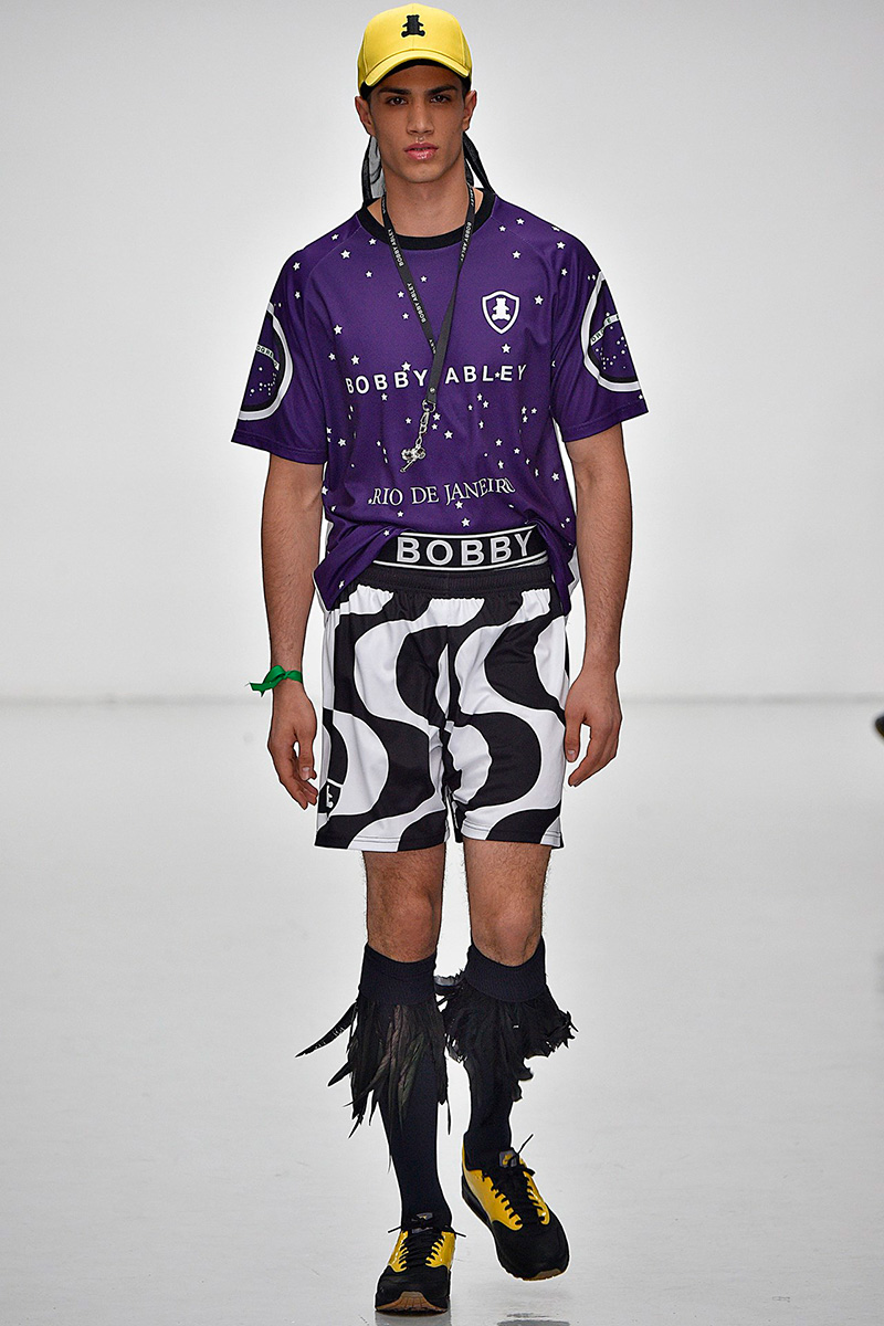 For FW16 Bobby Abley takes us away from the cold and rain to the sunny and vibrant Rio Carnival. Inspired by the summer he spent in Brazil last year, Abley has pulled out all of the stops to fuse his signature streetwear style with carnival culture and translate it all into a largely wearable collection worn by a casting of bronzed and buff models.