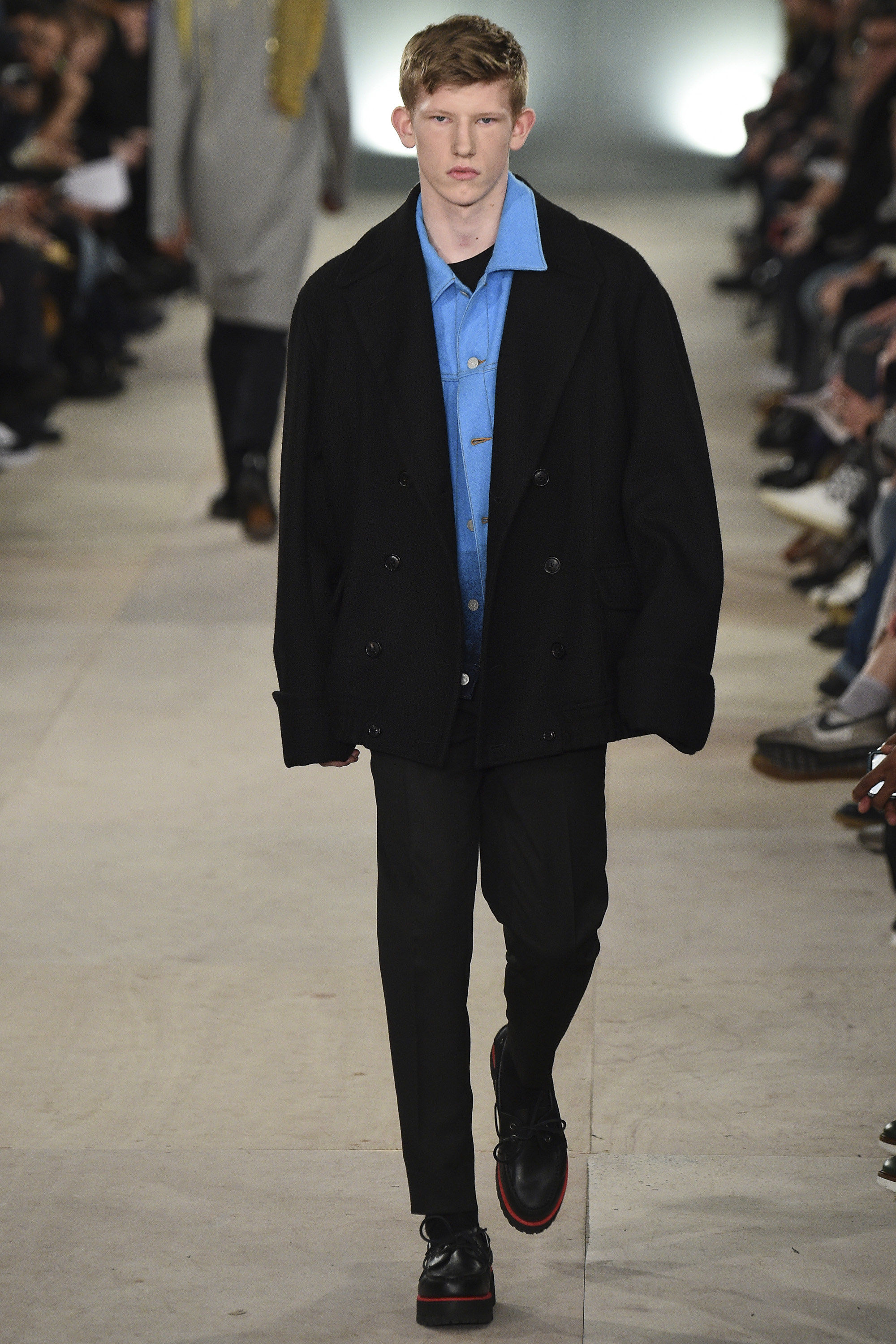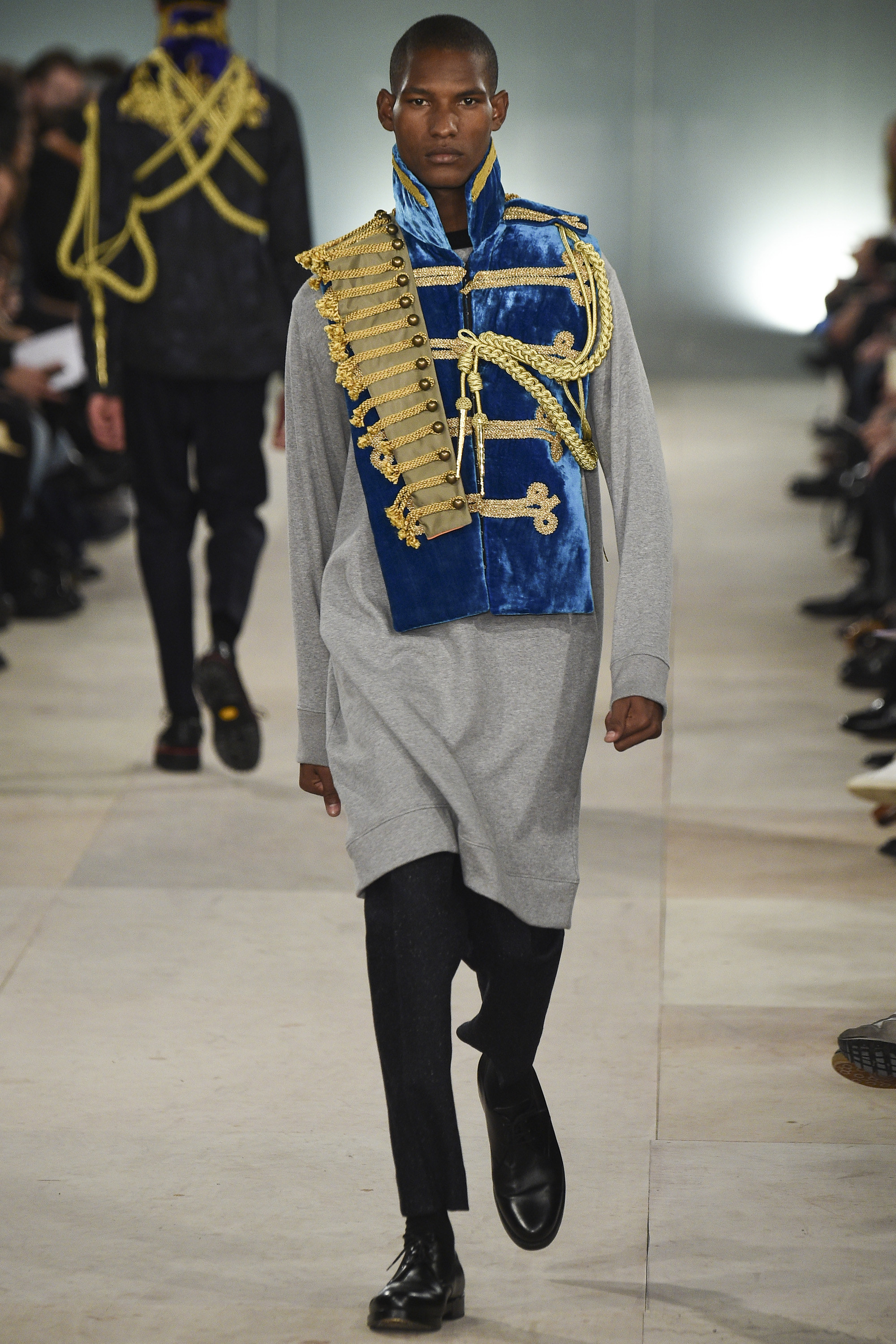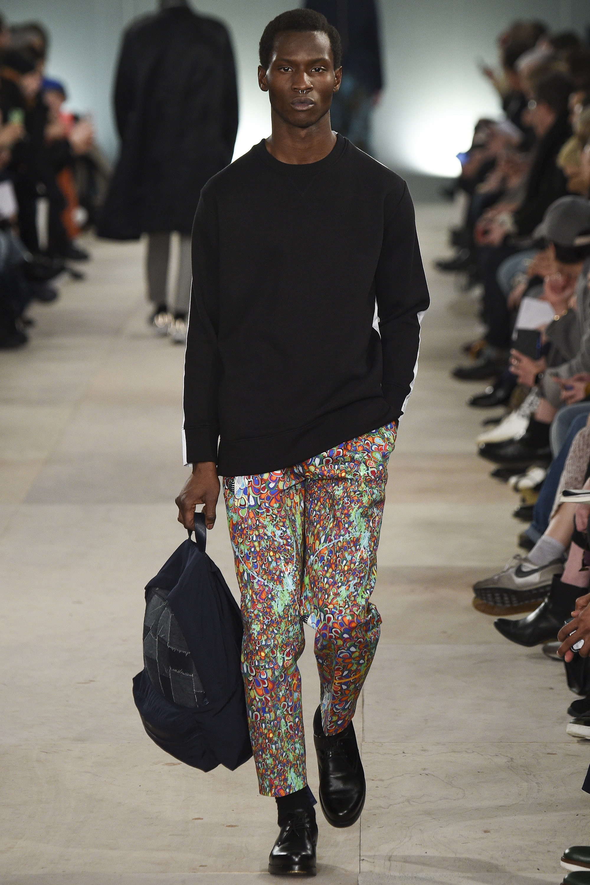 Despite the astonishing breadth of 21st-century consumer choice, drab uniformity of one sort or another is the go-to for most civilian males. So props to Charlie and Joe Casely-Hayford for reminding their audience of the fabulousness of officers past—with a heavy nod to Sgt. Pepper’s Lonely Hearts Club Band—as they presented some electric variations on contemporary uniform. The psychedelic splash jackets, pants, and black paneled overcoat were eye-watering but unignorable. More circumspect was the magenta print on evening jackets and pants, and patched onto other garments including an incongruous check henley teamed with lovingly washed jeans. This collection’s most impressive maneuver was its variations of modern military staples, zhuzhed up to Romanov levels of ostentation. Fishtail parkas were elongated until those fins dragged behind their wearer like the train of a wedding dress. Mosaics of patched denim—the street’s equivalent of olive drab—were transplanted onto the body of MA1s. The closing look of premodern military yoke and collar strafed with golden frogging over a sweatshirt in muted camouflage pitted the dowdier now against the old kapow. Have fun, this collection urged: Be bolder.