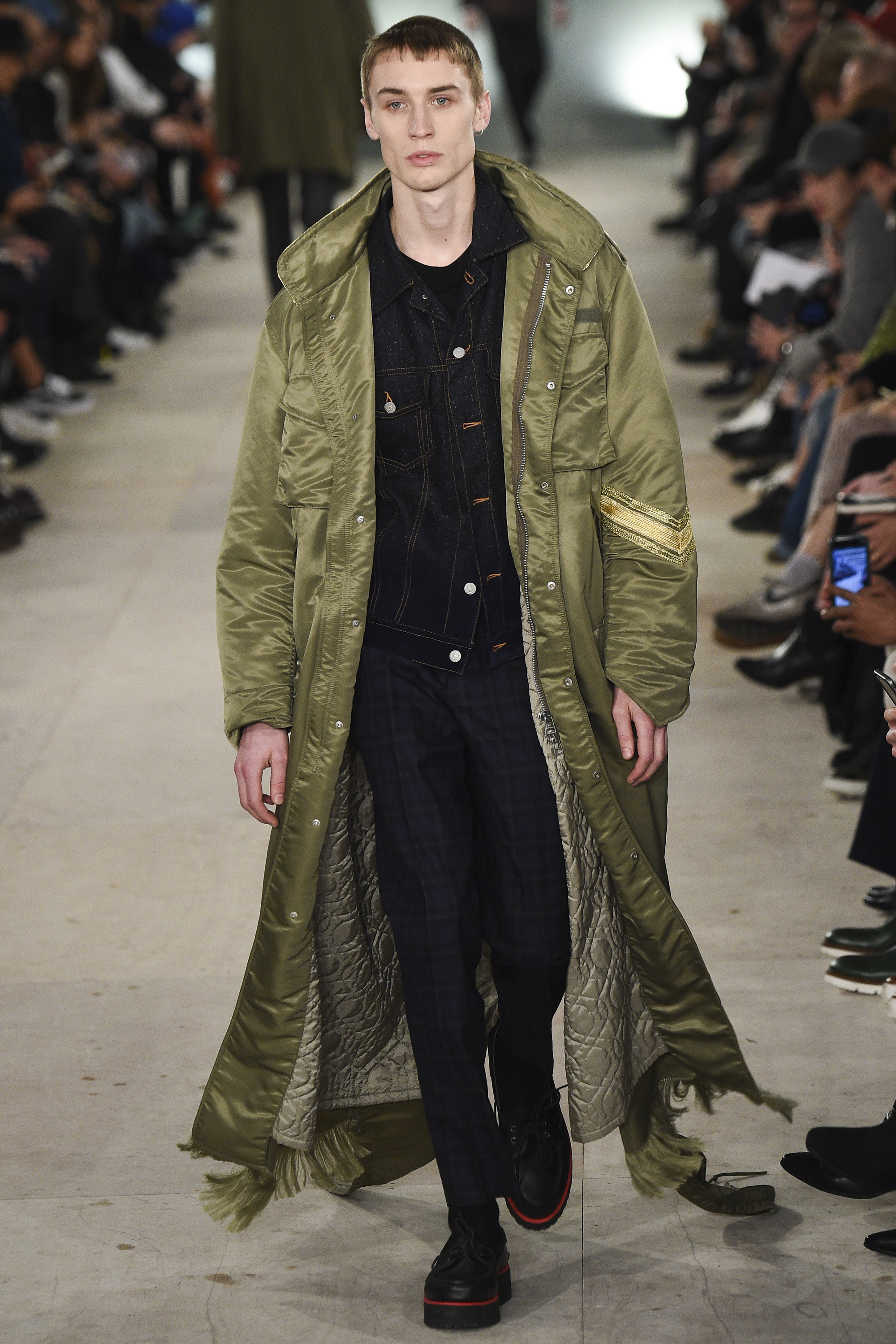 Despite the astonishing breadth of 21st-century consumer choice, drab uniformity of one sort or another is the go-to for most civilian males. So props to Charlie and Joe Casely-Hayford for reminding their audience of the fabulousness of officers past—with a heavy nod to Sgt. Pepper’s Lonely Hearts Club Band—as they presented some electric variations on contemporary uniform. The psychedelic splash jackets, pants, and black paneled overcoat were eye-watering but unignorable. More circumspect was the magenta print on evening jackets and pants, and patched onto other garments including an incongruous check henley teamed with lovingly washed jeans. This collection’s most impressive maneuver was its variations of modern military staples, zhuzhed up to Romanov levels of ostentation. Fishtail parkas were elongated until those fins dragged behind their wearer like the train of a wedding dress. Mosaics of patched denim—the street’s equivalent of olive drab—were transplanted onto the body of MA1s. The closing look of premodern military yoke and collar strafed with golden frogging over a sweatshirt in muted camouflage pitted the dowdier now against the old kapow. Have fun, this collection urged: Be bolder.