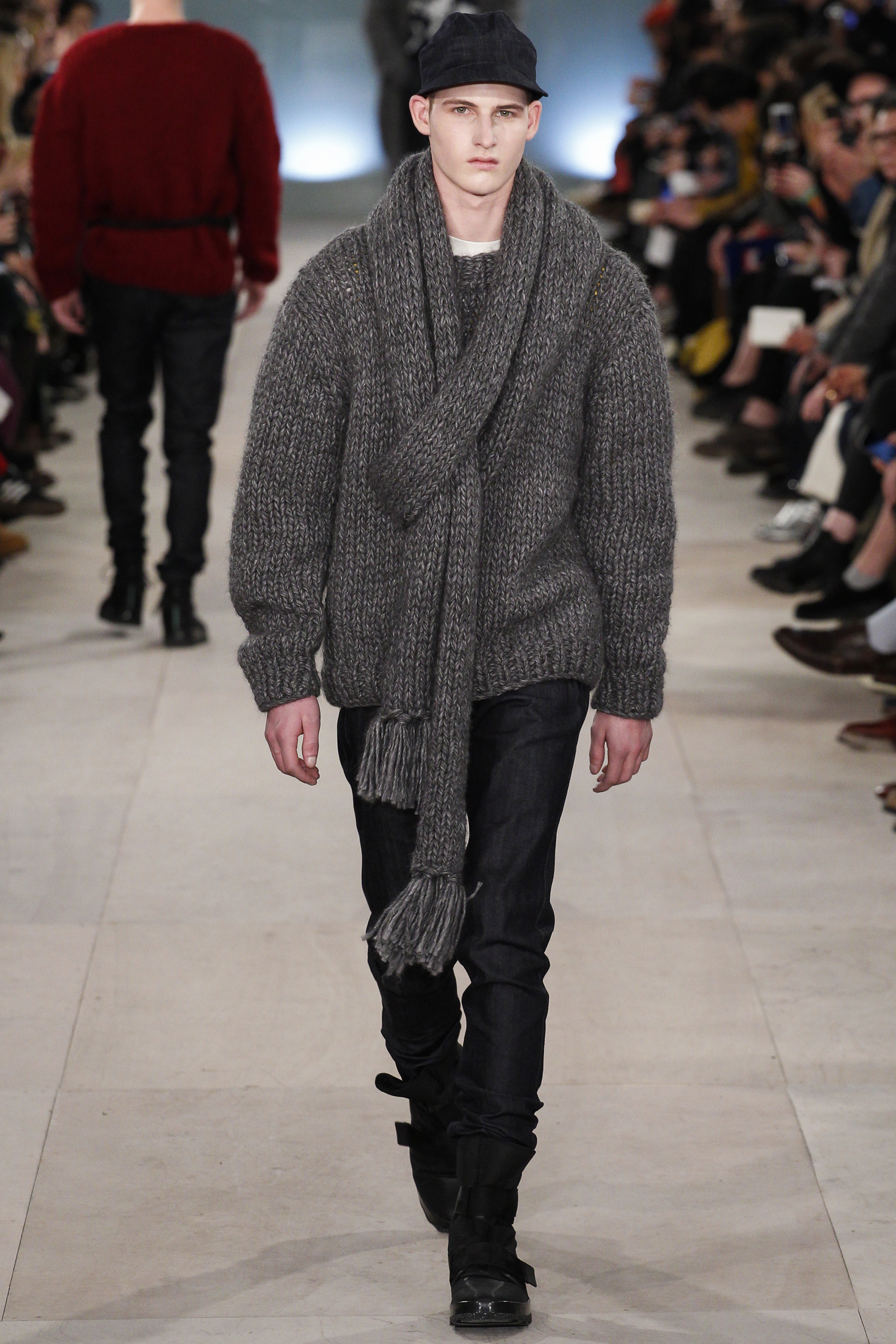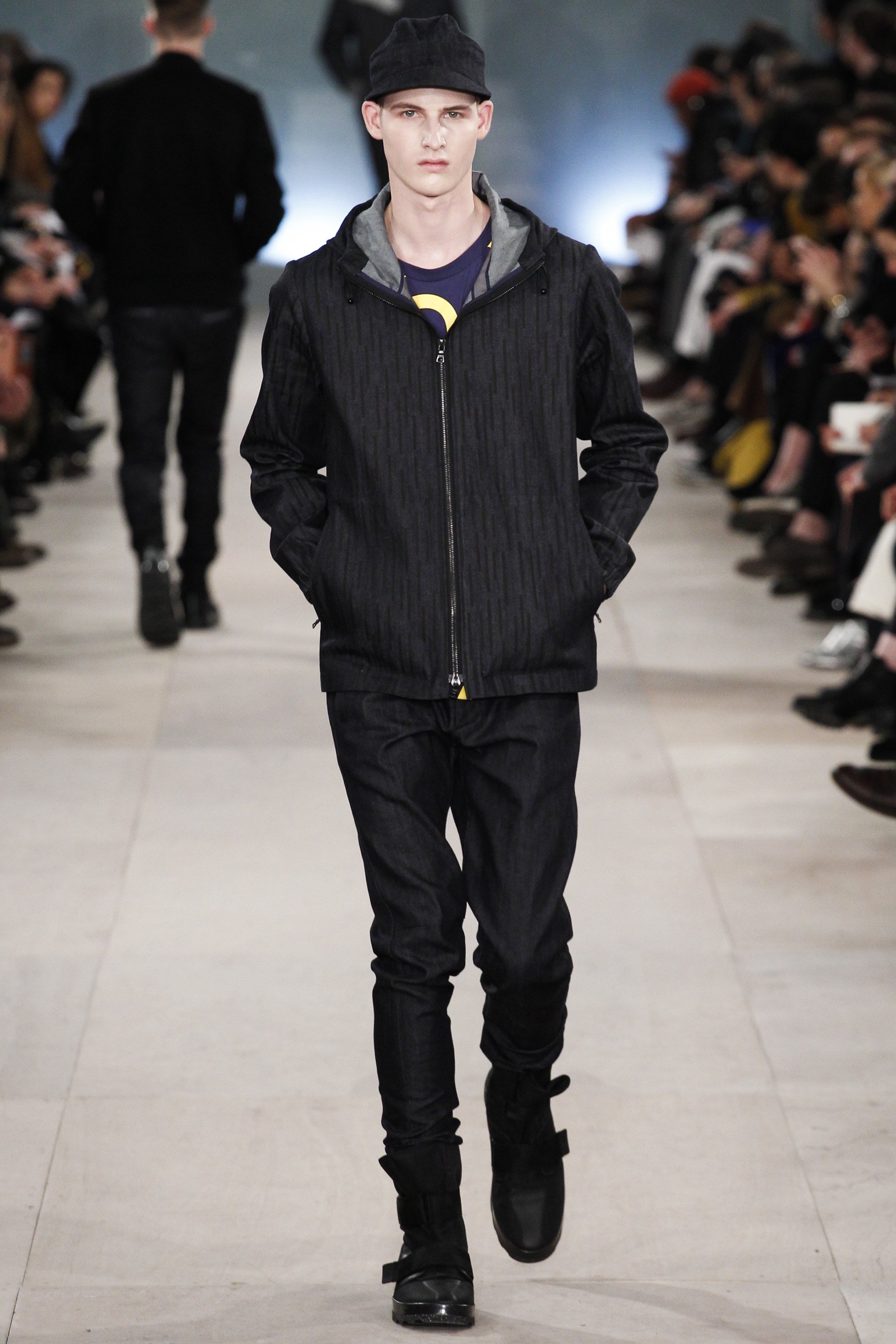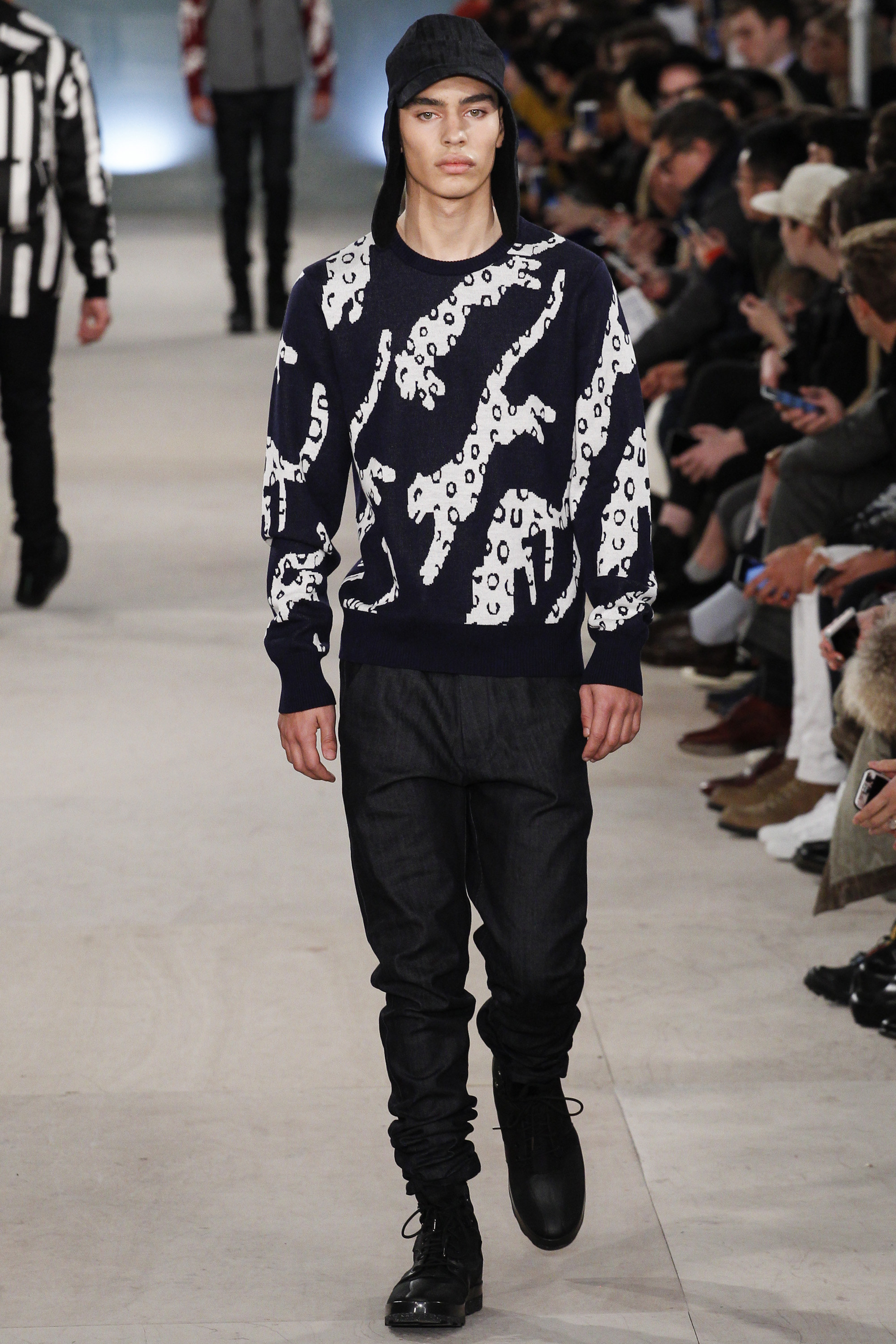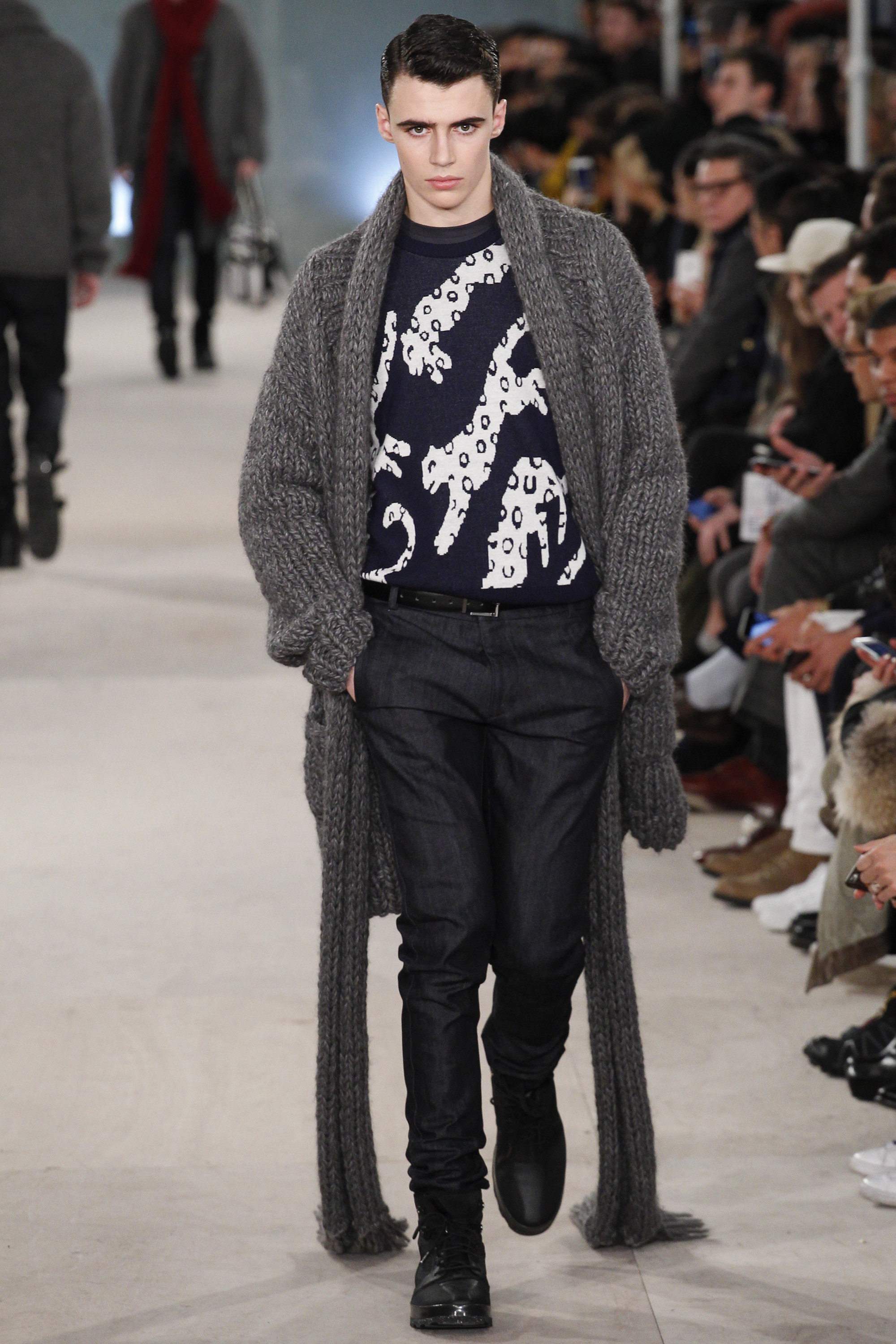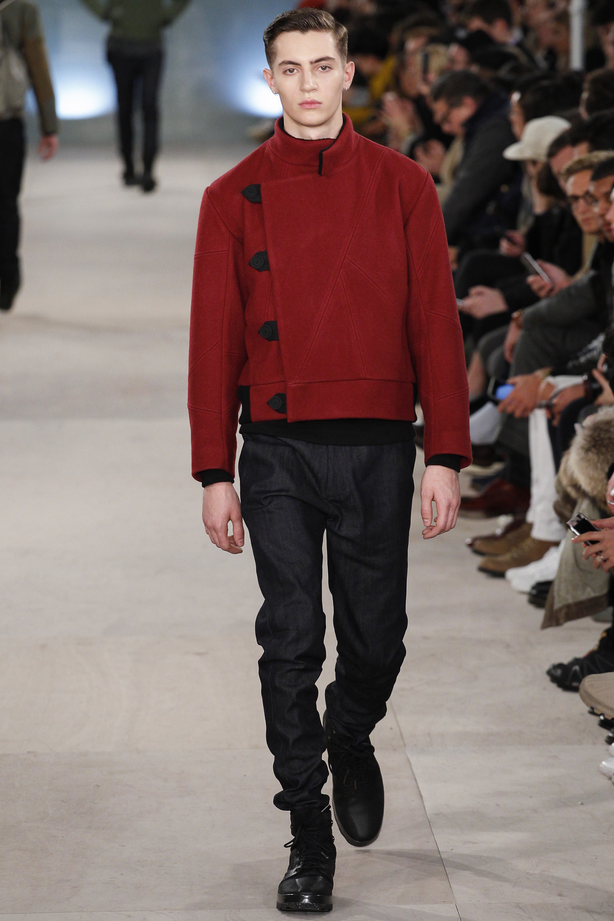 This collection was full of fine clothes which many men—this one included—would be delighted to alight upon in-store. The denim, quietly adrip with the rounded-tipped lines of a Germain raindrop camouflage, was dark and sleek and gorgeously made. So too was the broad selection of enveloping, brown or gray wide-yarn oversize knits and their more fitted leopard or rain-camo intarsia finer-gauge cousins. There were some fine flashes of a very slightly off-tone red—almost precisely the same shade that we saw at Maharishi and Astrid Andersen yesterday—on an opening parka and an interesting cross-body bomber inspired by Christopher Raeburn’s Mongolian source material. The last two looks made from recycled army snow ponchos were satisfyingly Muppet-esque show-closers, but most of this show’s parkas and bombers and the rest of the usual coat-rack suspects were notable for their restraint. That red and those raindrops apart, there was little of the quirk Raeburn usually delivers. As a show experience it lacked shock and awe.
