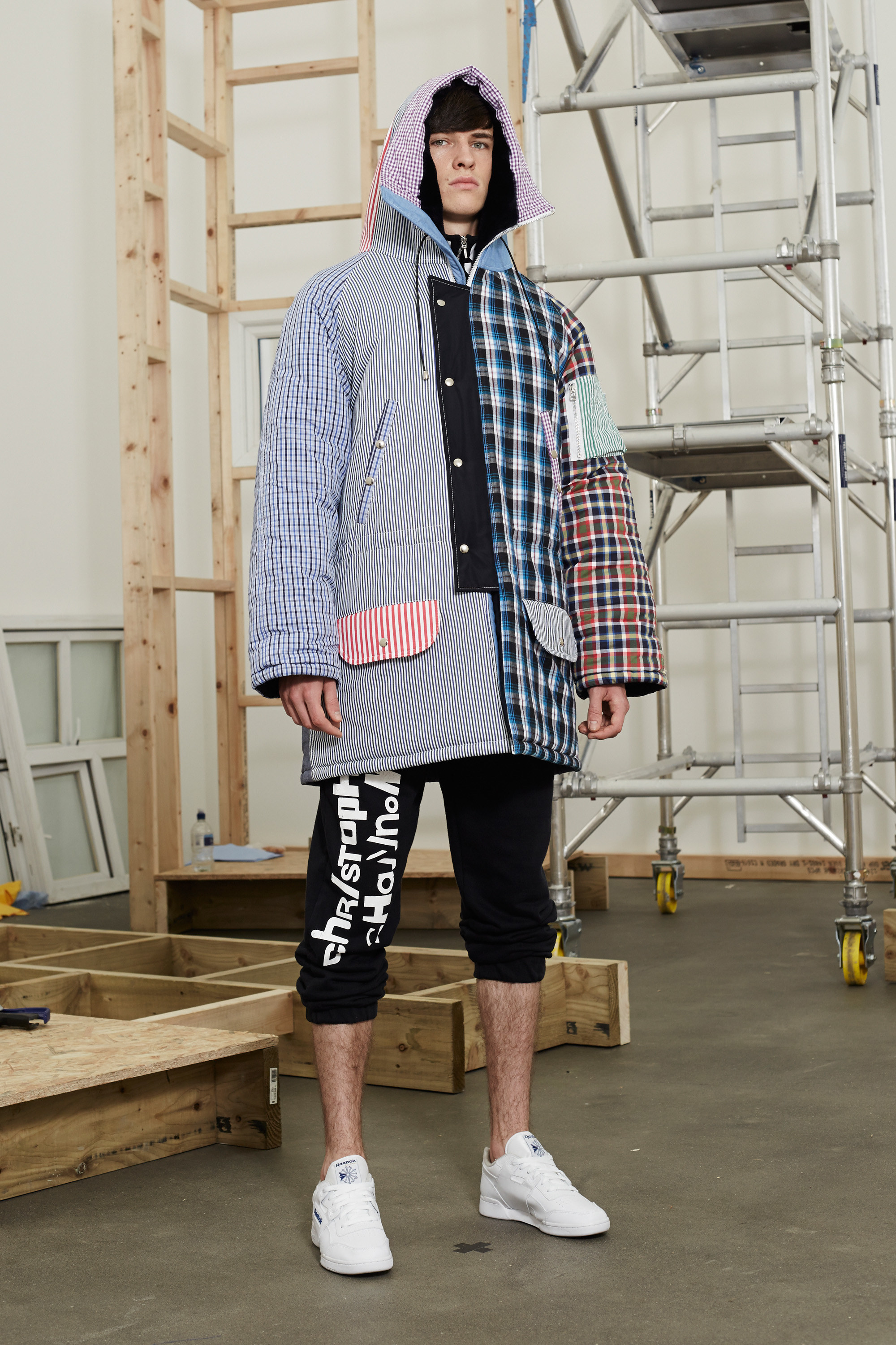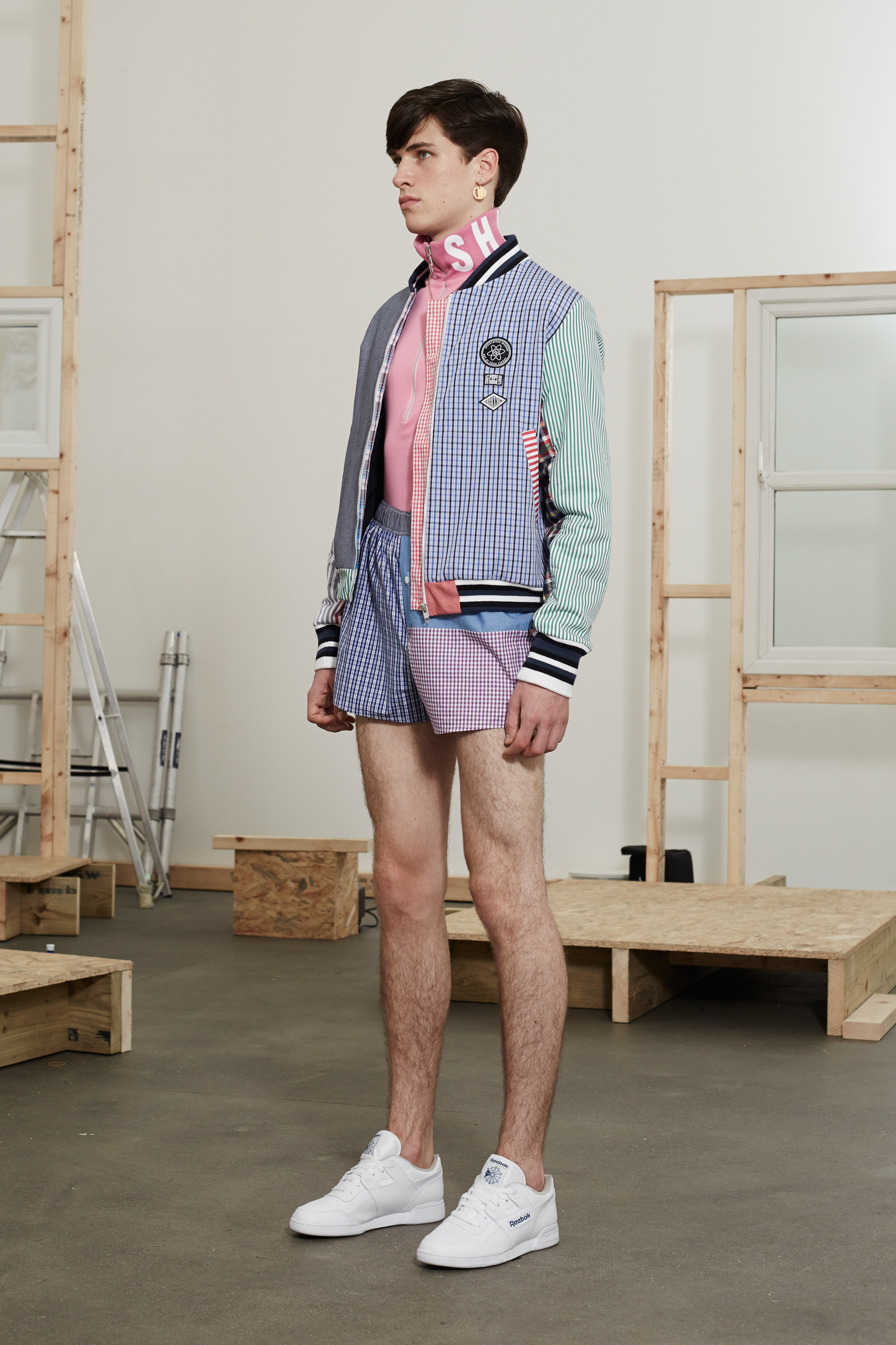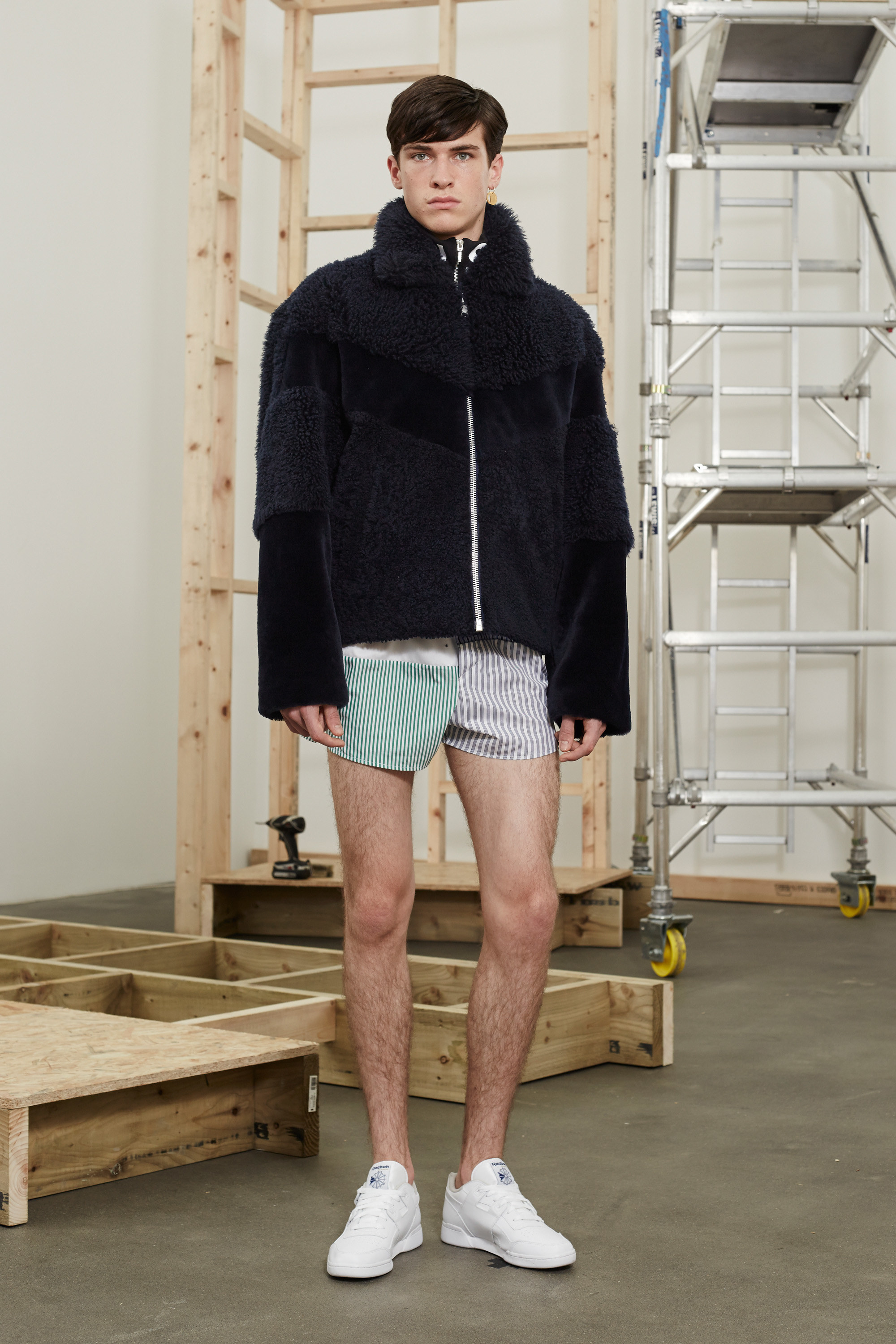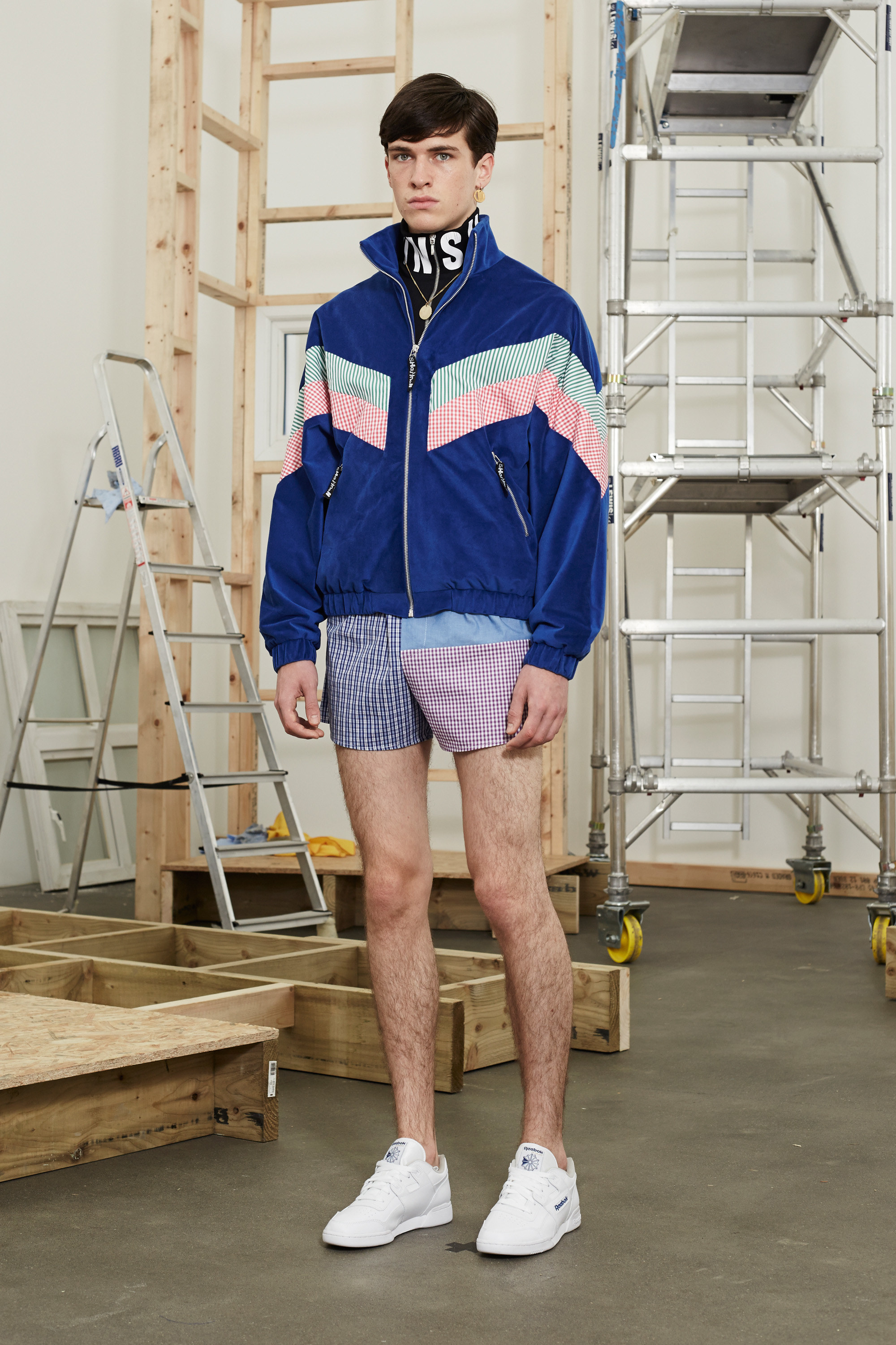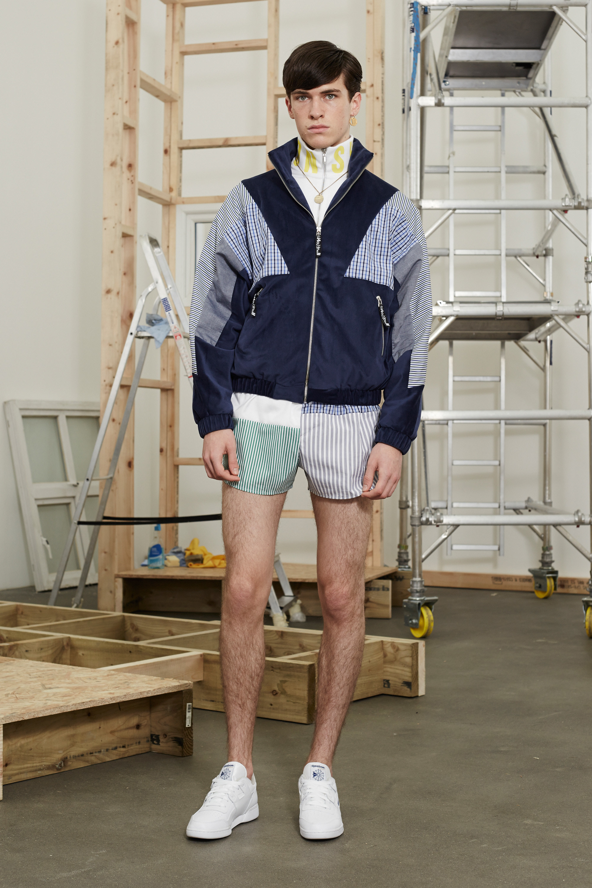The dwellings house ordinary folk—who are also at the root of Shannon’s clothes. Not just for this season, though this outing was especially persuasive in extolling the obscure appeal of men’s boxer-short poplins in candy-color stripes and checks; chopped-up hooded jackets and track-pants sliced apart down the seams; and gold-chained medallions and earrings that were dandyish displays of the trappings of wealth.