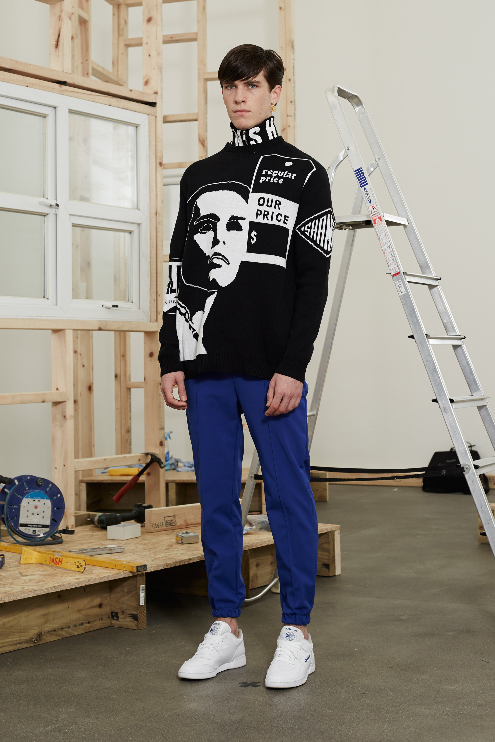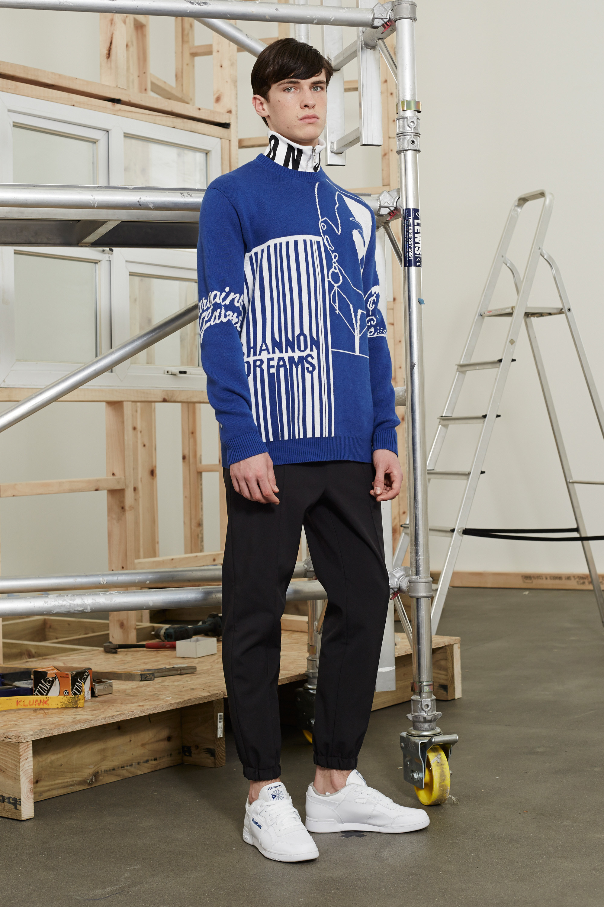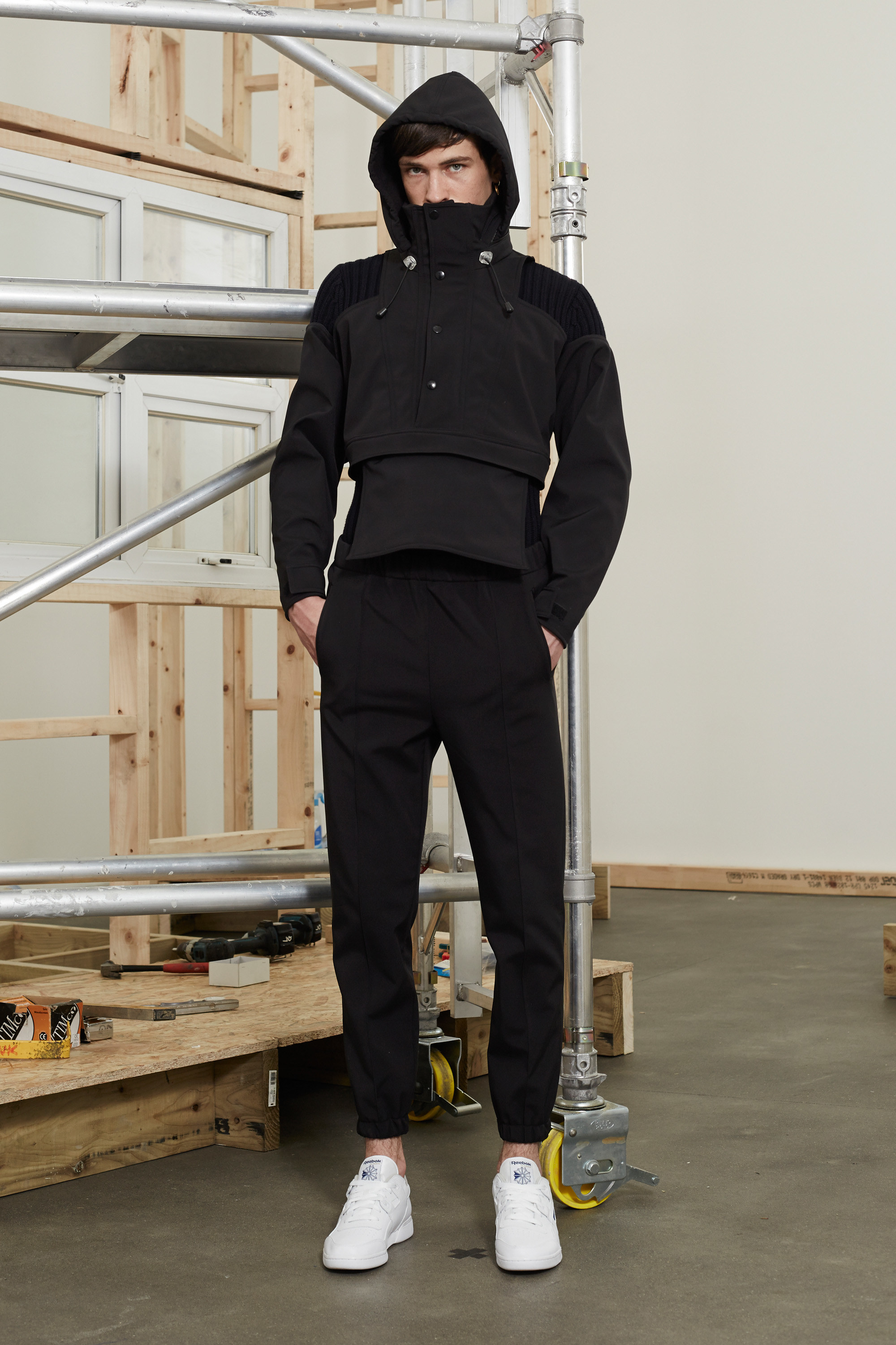 When Shannon chose “comfort and horror” as the title and the inspiration for this outing, he was thinking about the suburbs of Liverpool, the northern English city he grew up in—the comfort of home, but the horror of being trapped there. The towering wooden structures at the center of the presentation came replete with PVC-framed windows. They wound up resembling the bare timber bones of a semi-detached home, the sort built in the much-repudiated mock-Tudor style by British construction firm Barratt. Those crop up on otherwise green and pleasant lands across the whole of the north of England—a comfort, and a horror.