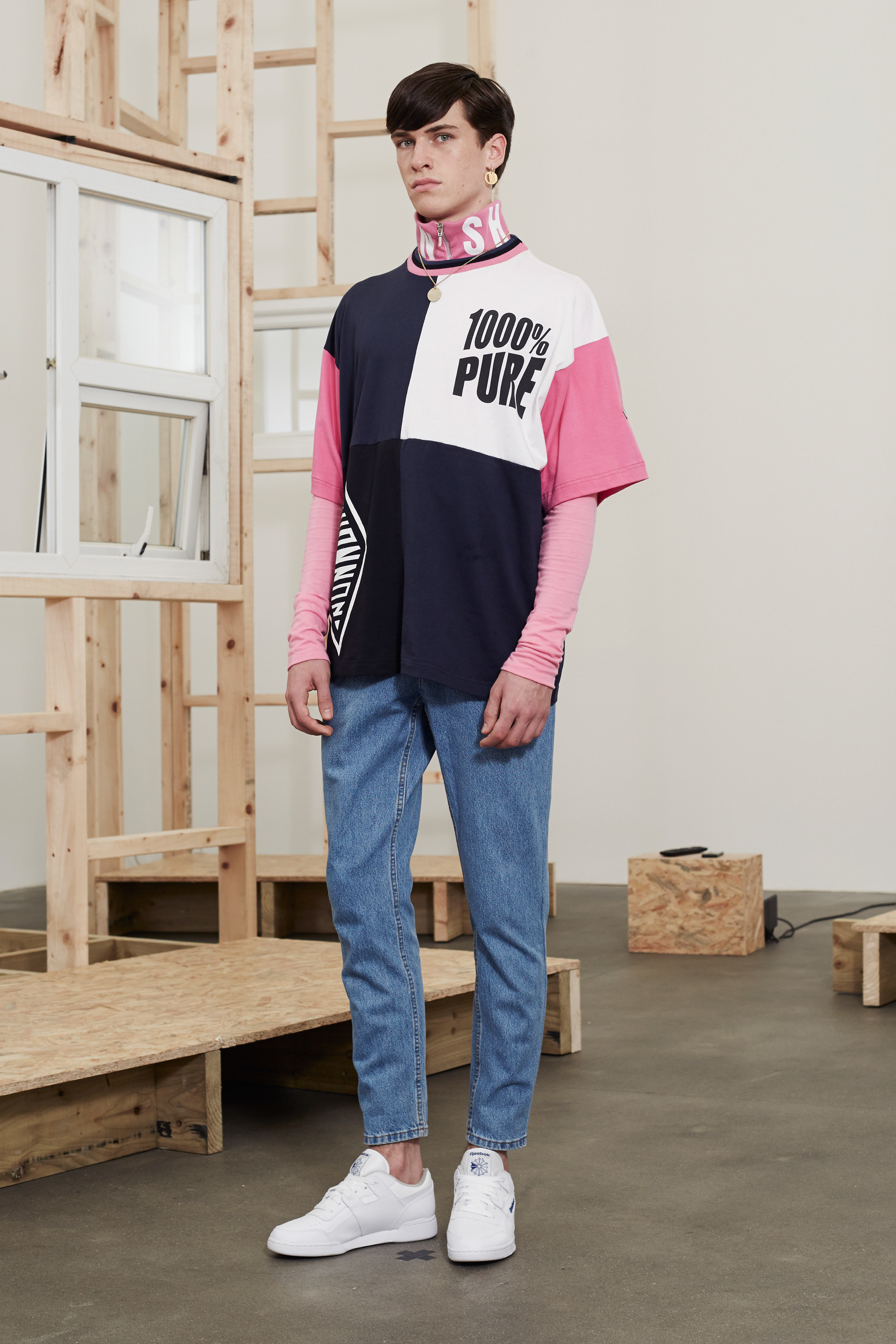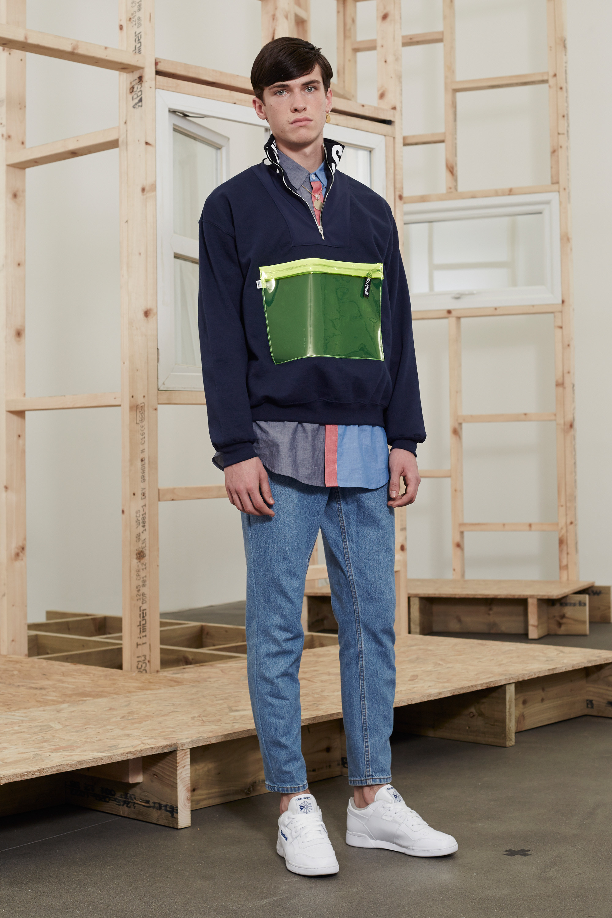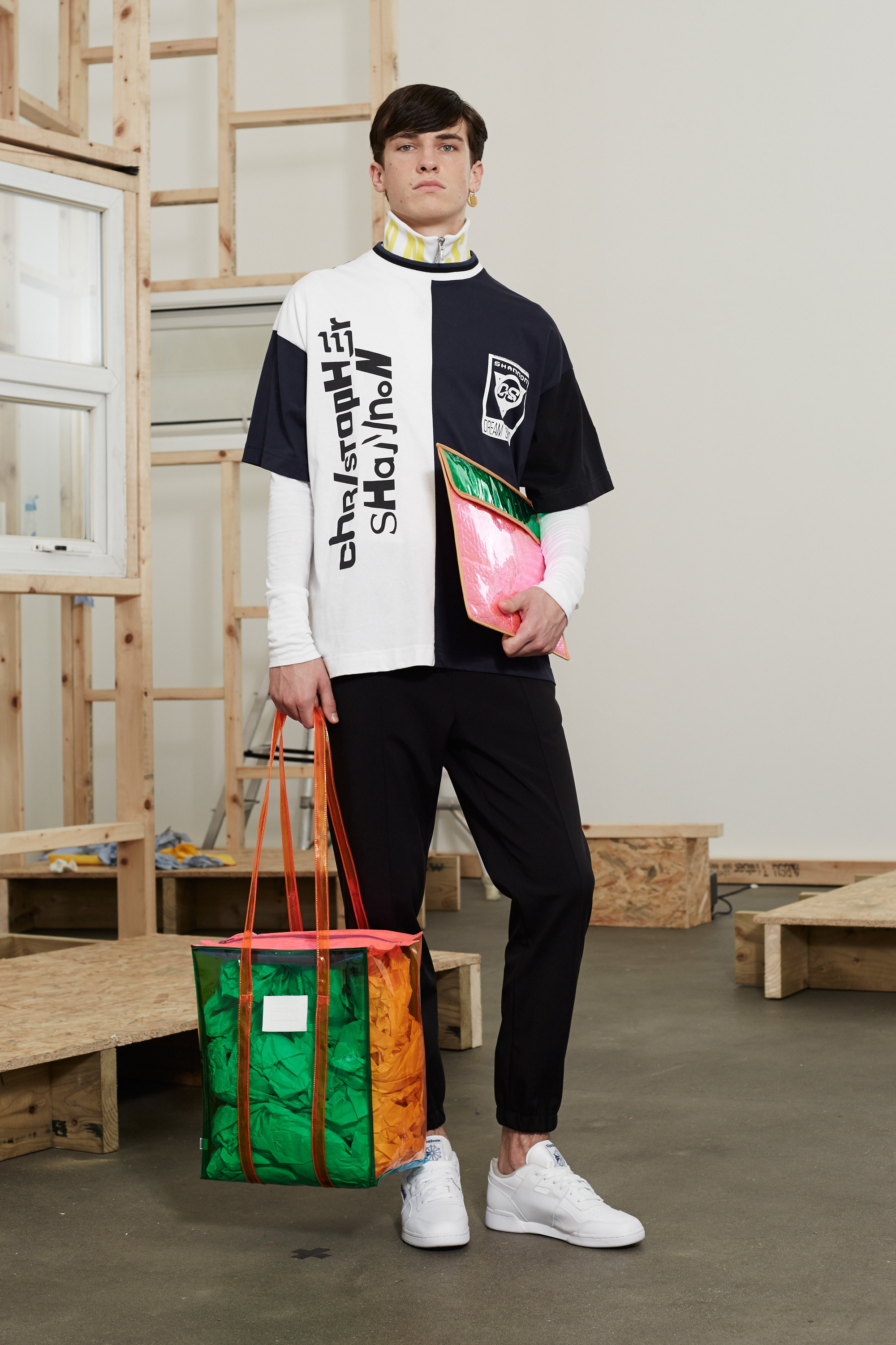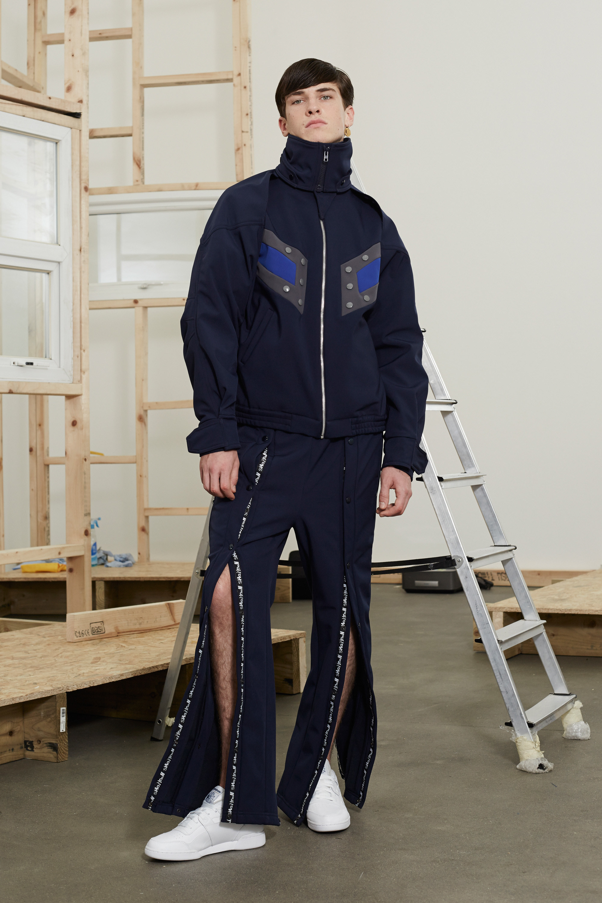 The cleverest bit of Shannon’s clothing is how simple it all is to understand. “I was thinking back to the boys who went out with my babysitters,” he said, Shannon’s being the second collection of the day to talk about blue-collar heroes. You don’t need the deep backstory, nor to have visited Liverpudlian suburbs, to get a twisted sense of small-town life (and, indeed, pent-up teenage sexual frustration) from his clothes. They riffed on the preppy pastel palette, reminiscent of mass sports chains Esprit and Benetton in the patched, zippered wind cheaters and sweatshirts and varsity shapes.