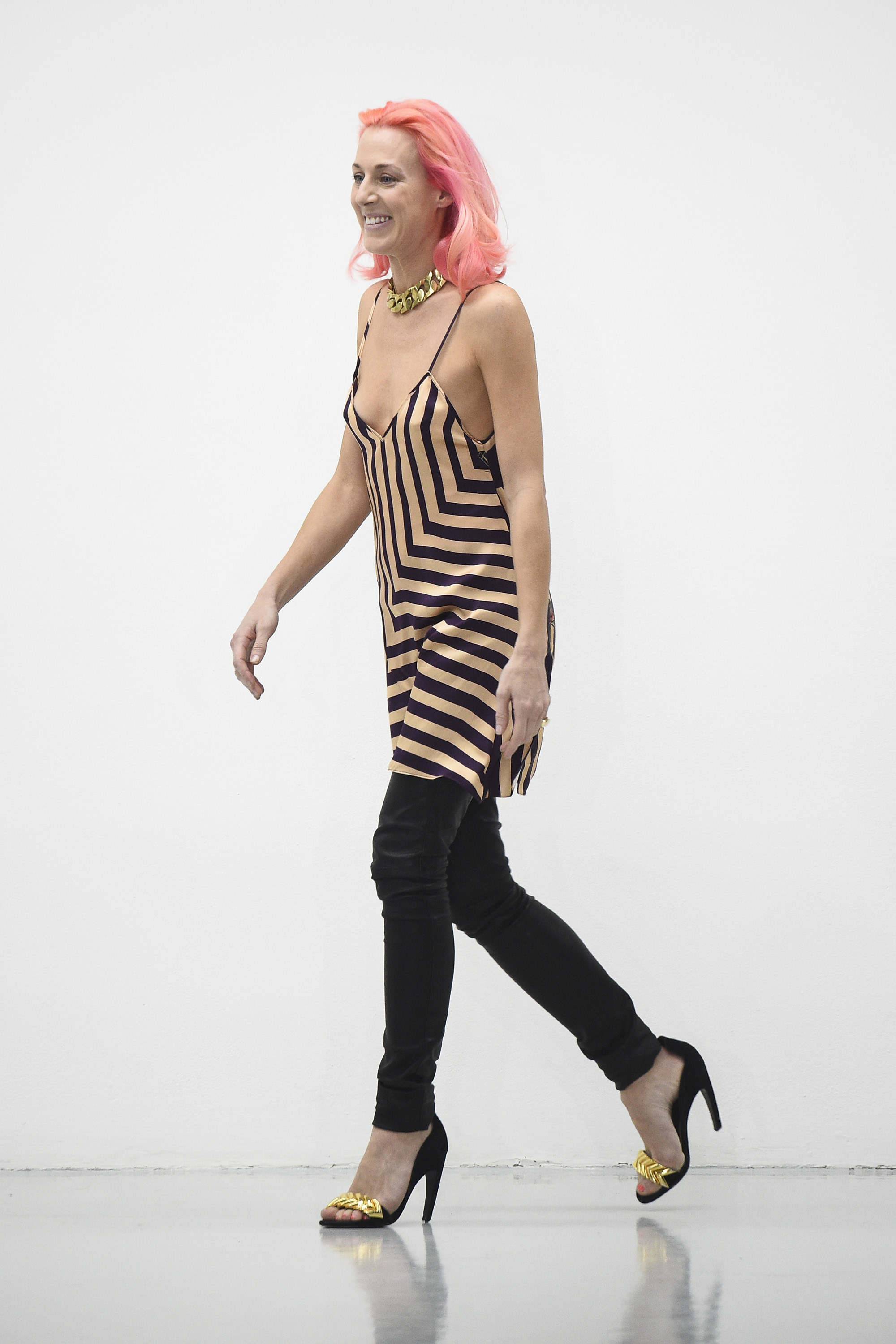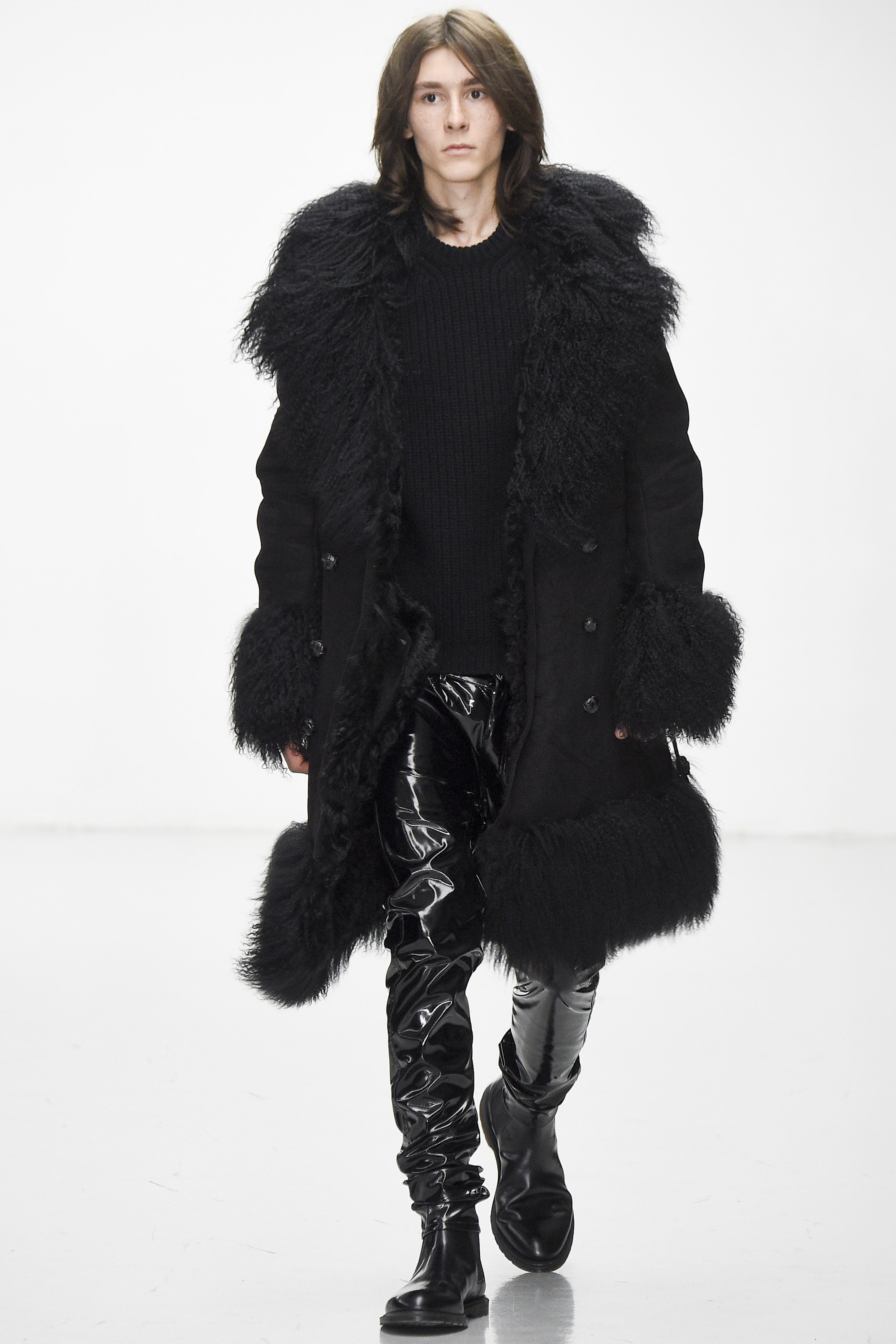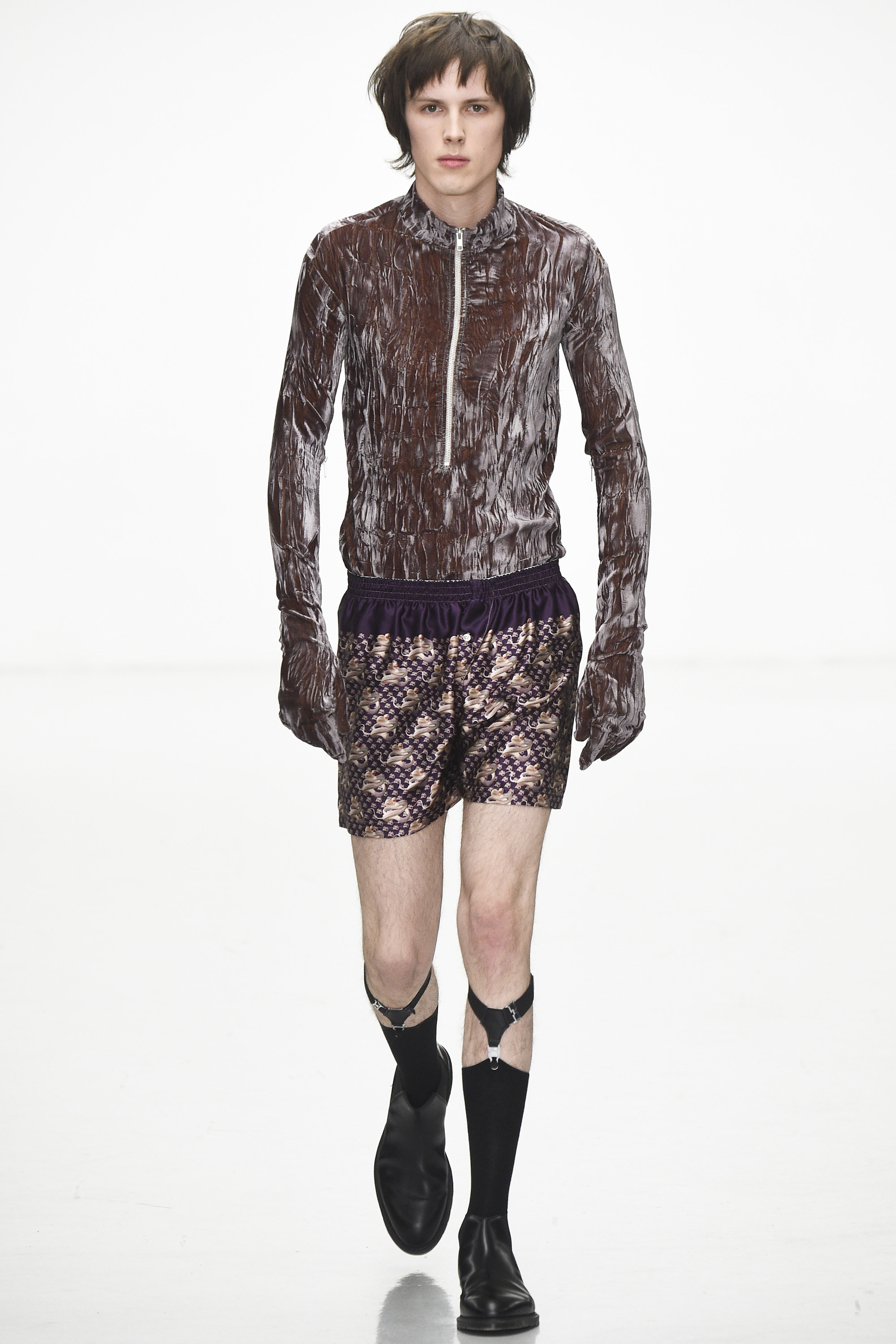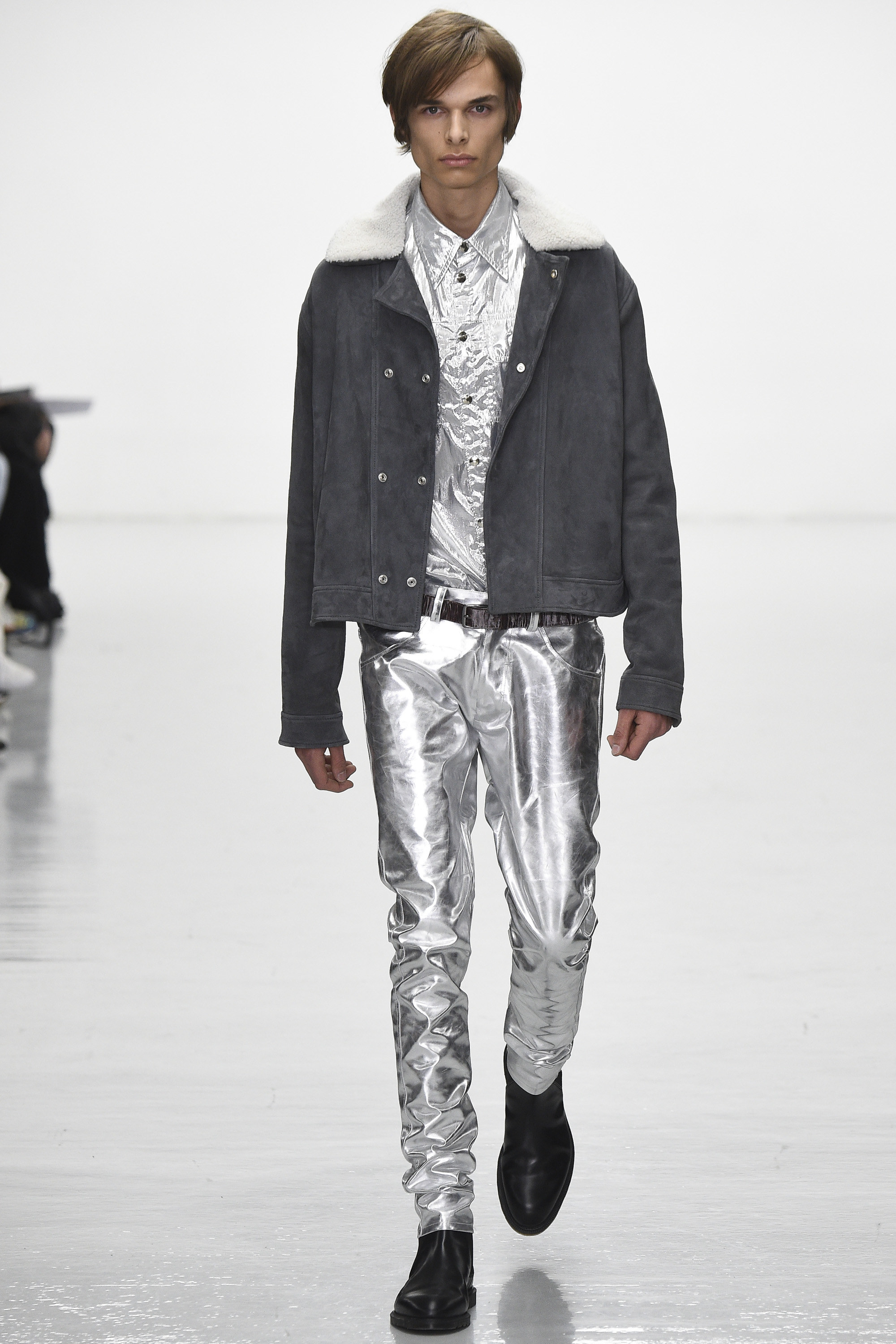 The slipstreaming and swapping of references, genres, and indeed garments was Eary’s big idea for Fall. She threw a few female models into the mix too, although with teased beehives, dolly bird eyeliner, and marabou-puffed mules, their gender wasn’t terribly fluid. Neither was their teetering gait. Regardless of the androgyny of the attire of Ziggy or Iggy, I’m fairly sure neither would dare don those mules, for simple health and safety reasons rather than anything more ideological.