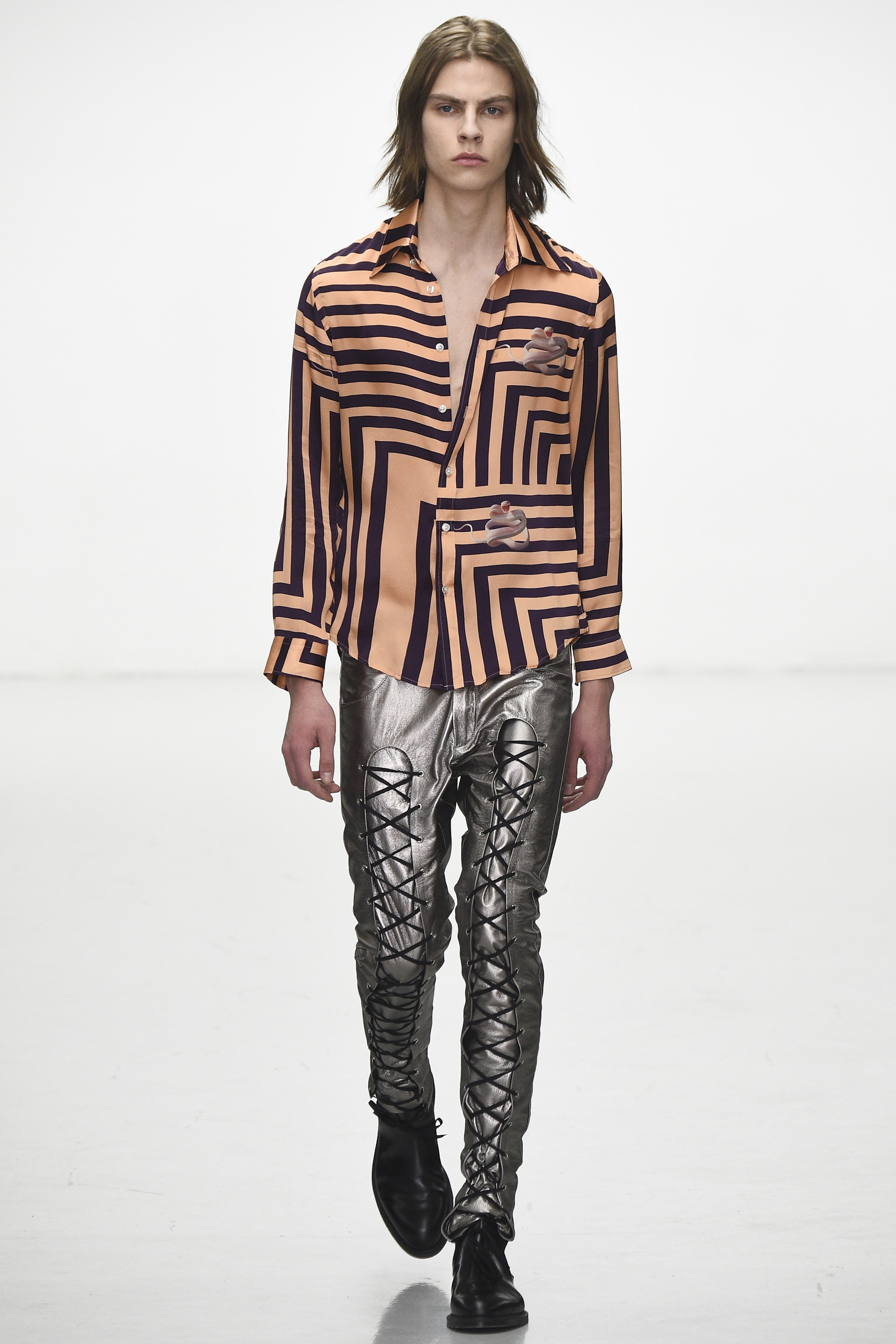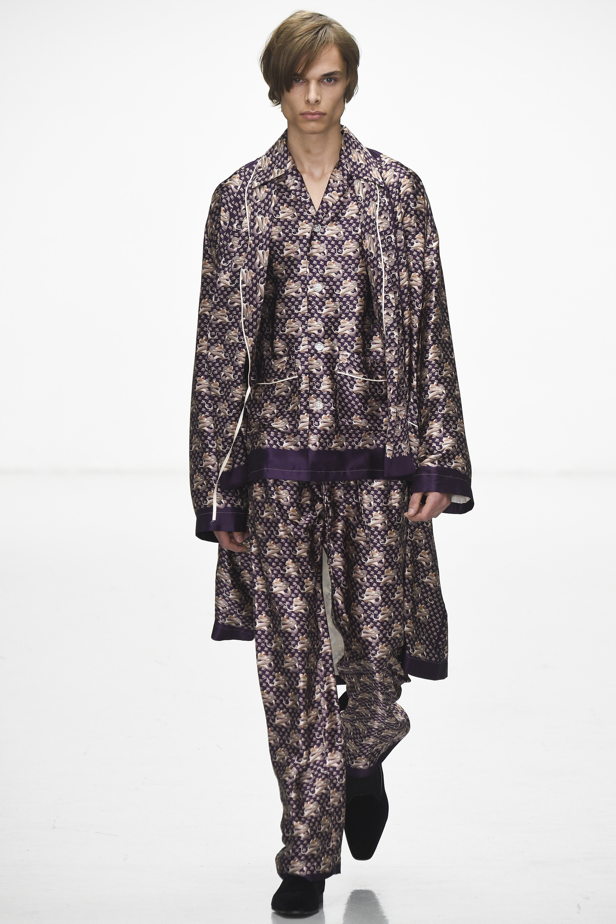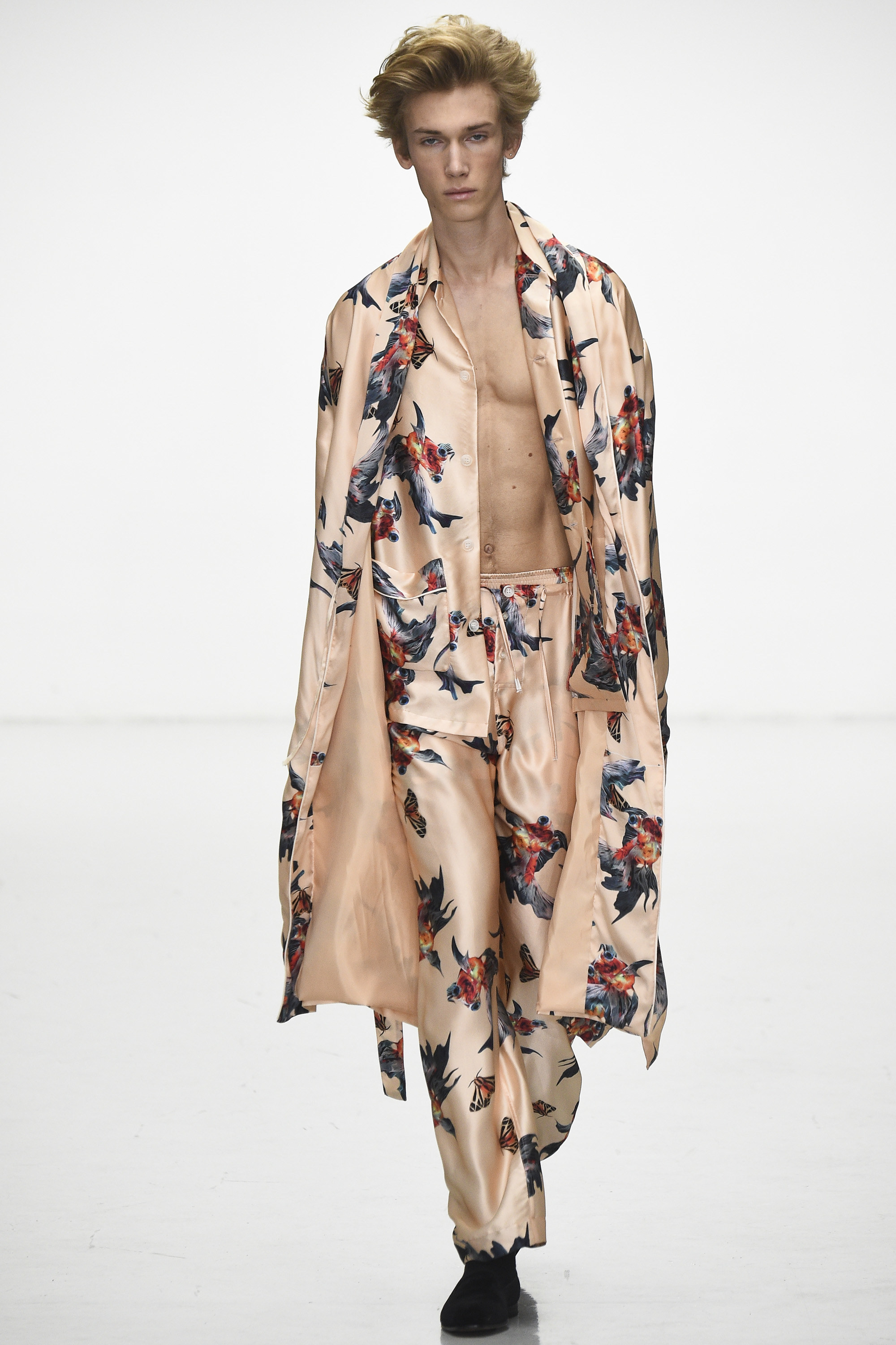 How strange that the passing of David Bowie should come as his aesthetic ghost is already haunting the Fall 2016 men’s runways. Katie Eary’s show, for instance, bore his unmistakable imprimatur—jiggy, Ziggy graphic pattern; flowing silk; and that newly coined fashionable notion of gender fluidity that’s thus far come bound up in the simple notion of a man wearing a woman’s blouse. Which, in itself, is pretty Bowie.