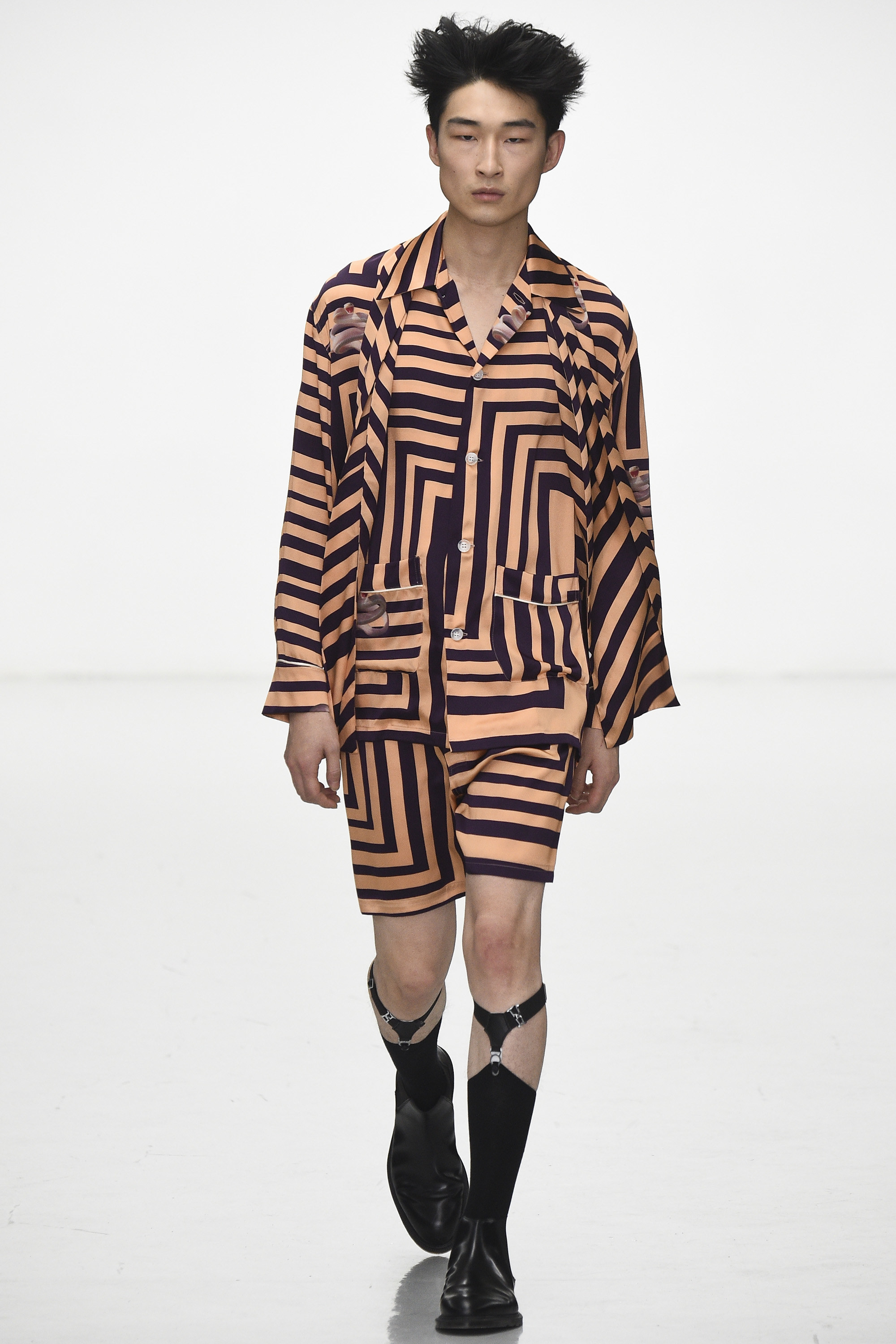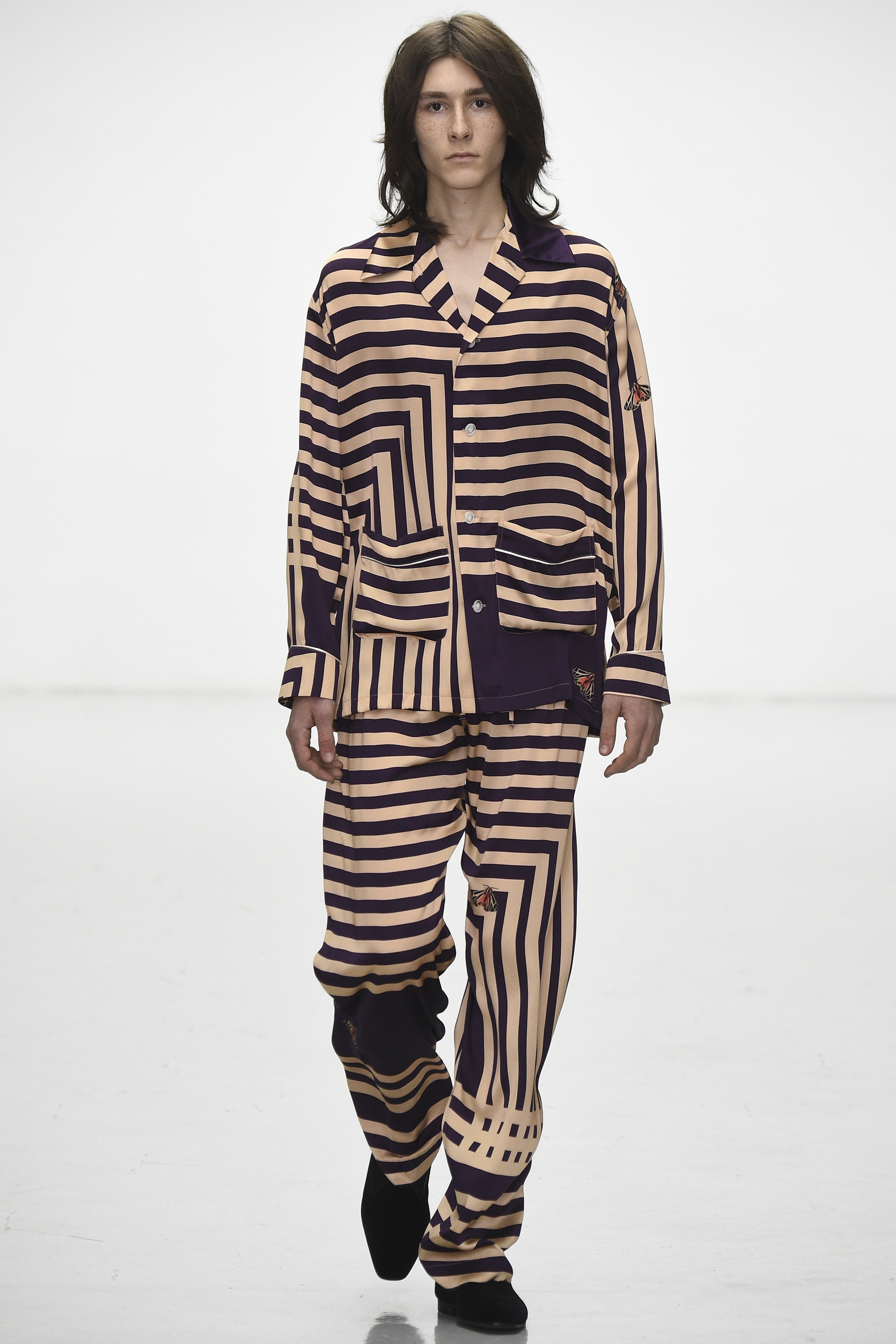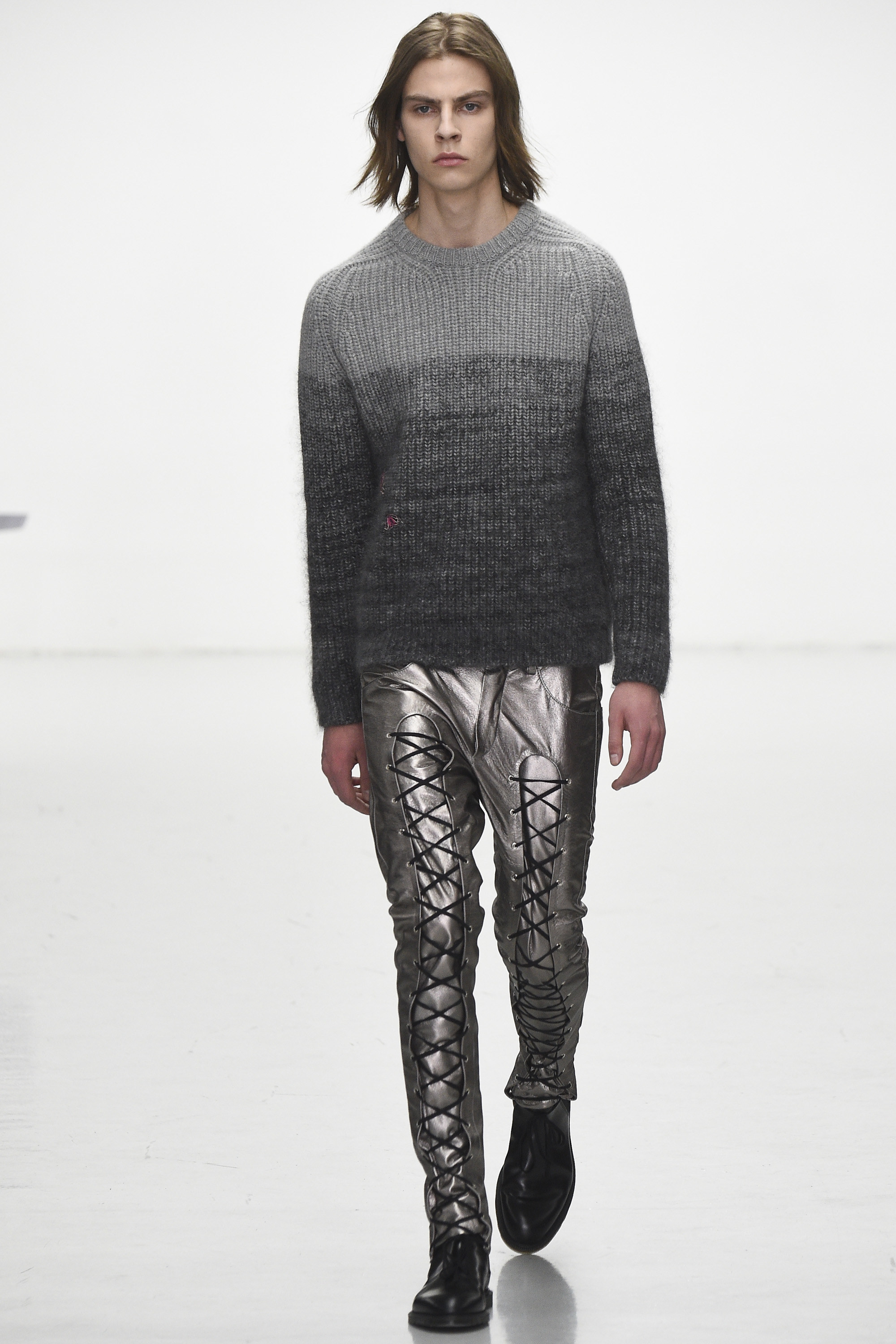 How strange that the passing of David Bowie should come as his aesthetic ghost is already haunting the Fall 2016 men’s runways. Katie Eary’s show, for instance, bore his unmistakable imprimatur—jiggy, Ziggy graphic pattern; flowing silk; and that newly coined fashionable notion of gender fluidity that’s thus far come bound up in the simple notion of a man wearing a woman’s blouse. Which, in itself, is pretty Bowie.
