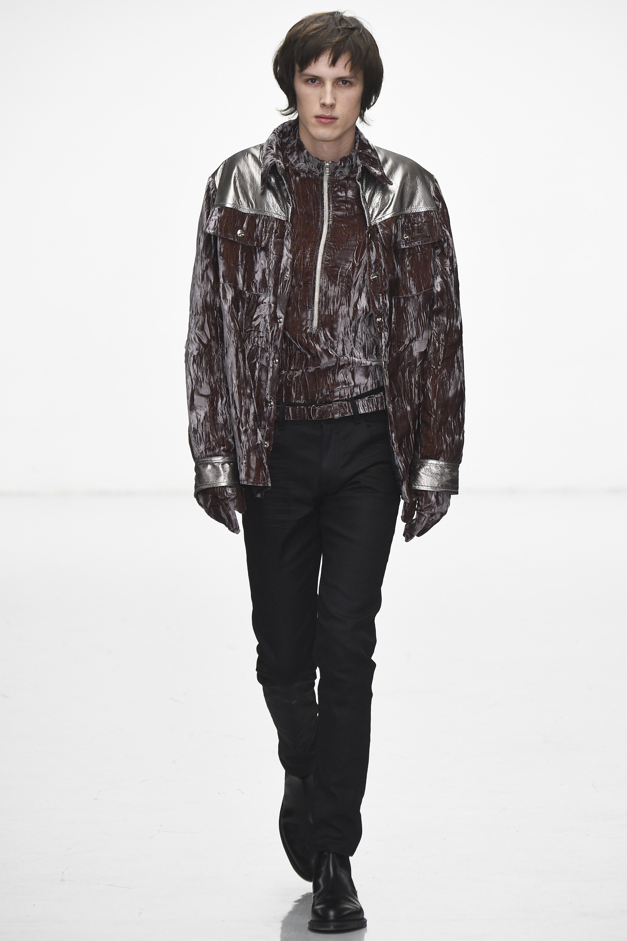 Less successful were high-zipped retro sporty tops in panne velvet—a fabric of questionable practicality for winter and even more doubtful taste that has been popping up all over the place at London’s men’s shows. Here, it ended up looking like Eary had cut a few outfits, Von Trapp–style, from old curtains. Not sure Bowie would ever wear that.