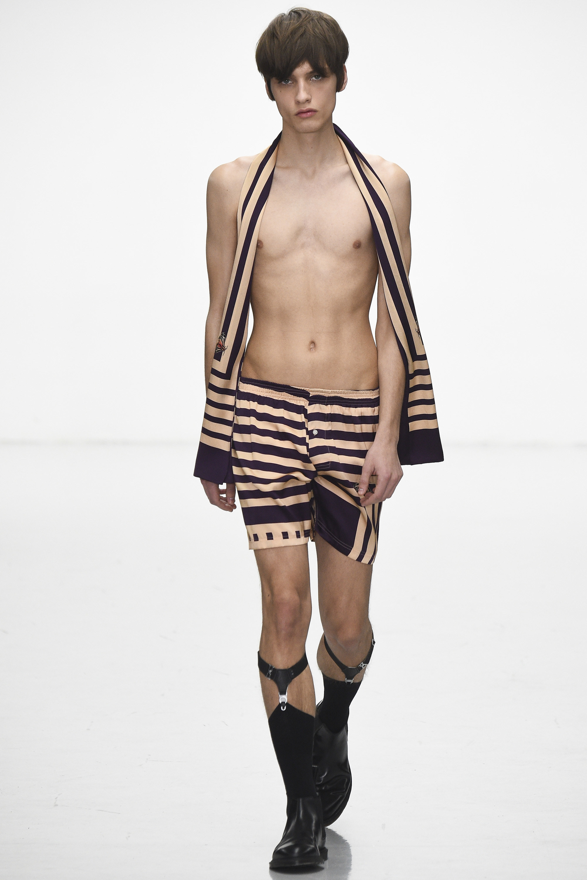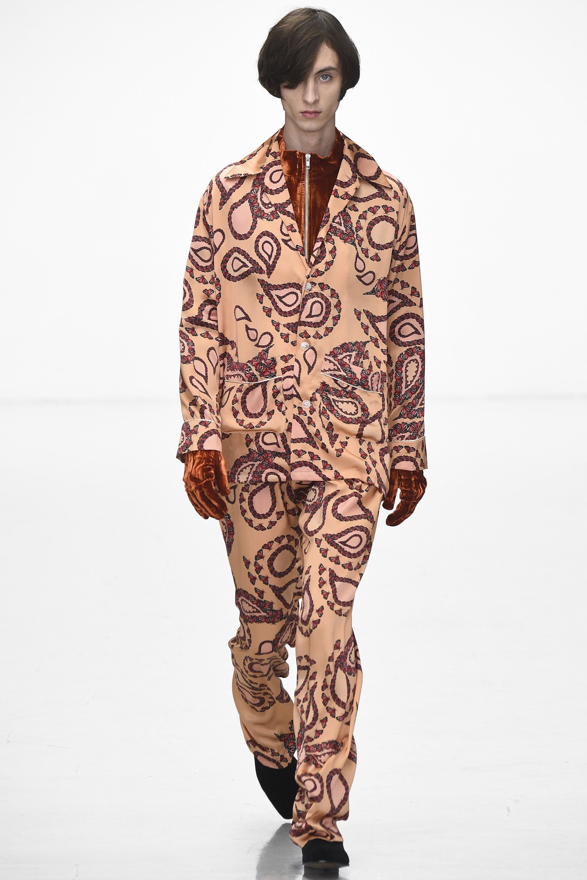 The slipstreaming and swapping of references, genres, and indeed garments was Eary’s big idea for Fall. She threw a few female models into the mix too, although with teased beehives, dolly bird eyeliner, and marabou-puffed mules, their gender wasn’t terribly fluid. Neither was their teetering gait. Regardless of the androgyny of the attire of Ziggy or Iggy, I’m fairly sure neither would dare don those mules, for simple health and safety reasons rather than anything more ideological.