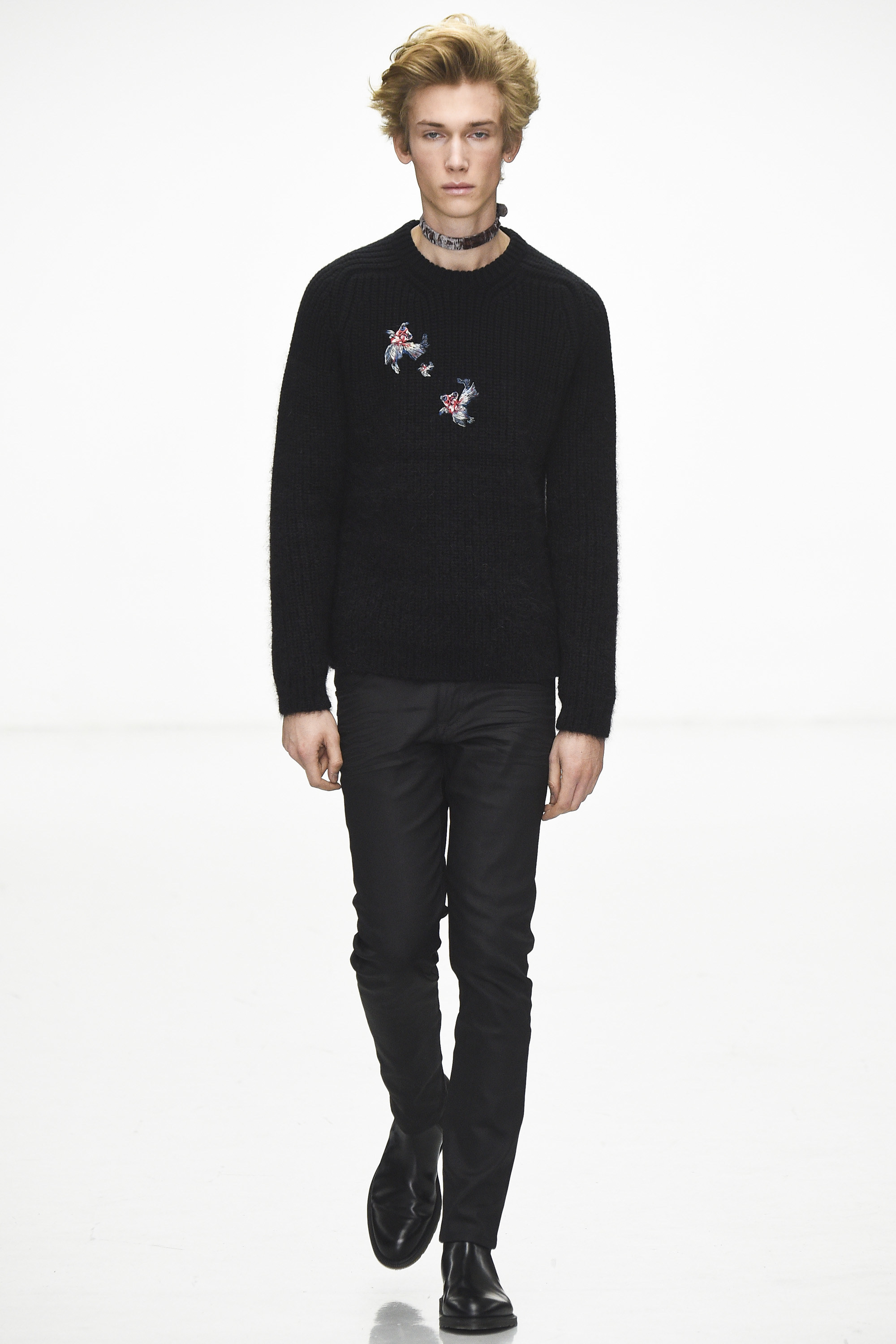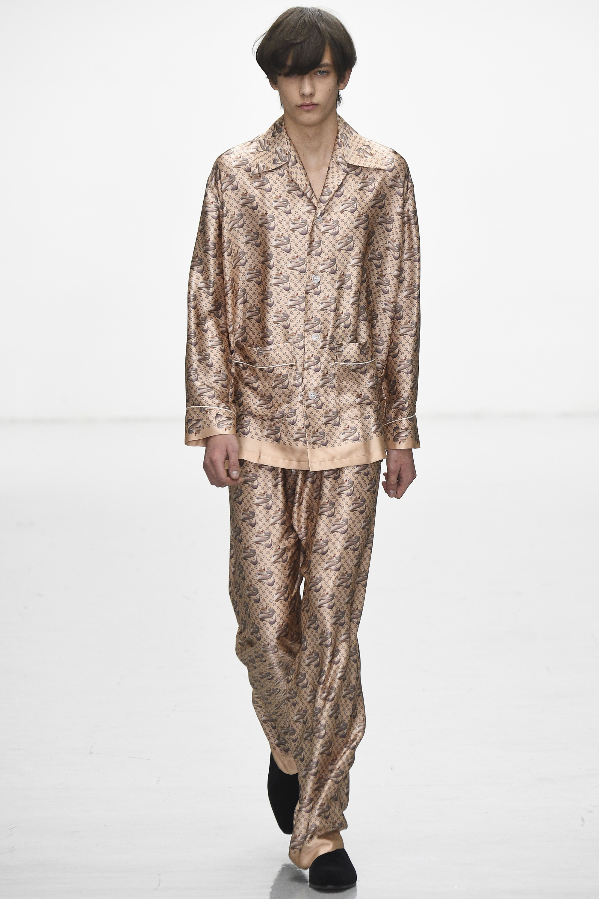 How strange that the passing of David Bowie should come as his aesthetic ghost is already haunting the Fall 2016 men’s runways. Katie Eary’s show, for instance, bore his unmistakable imprimatur—jiggy, Ziggy graphic pattern; flowing silk; and that newly coined fashionable notion of gender fluidity that’s thus far come bound up in the simple notion of a man wearing a woman’s blouse. Which, in itself, is pretty Bowie.