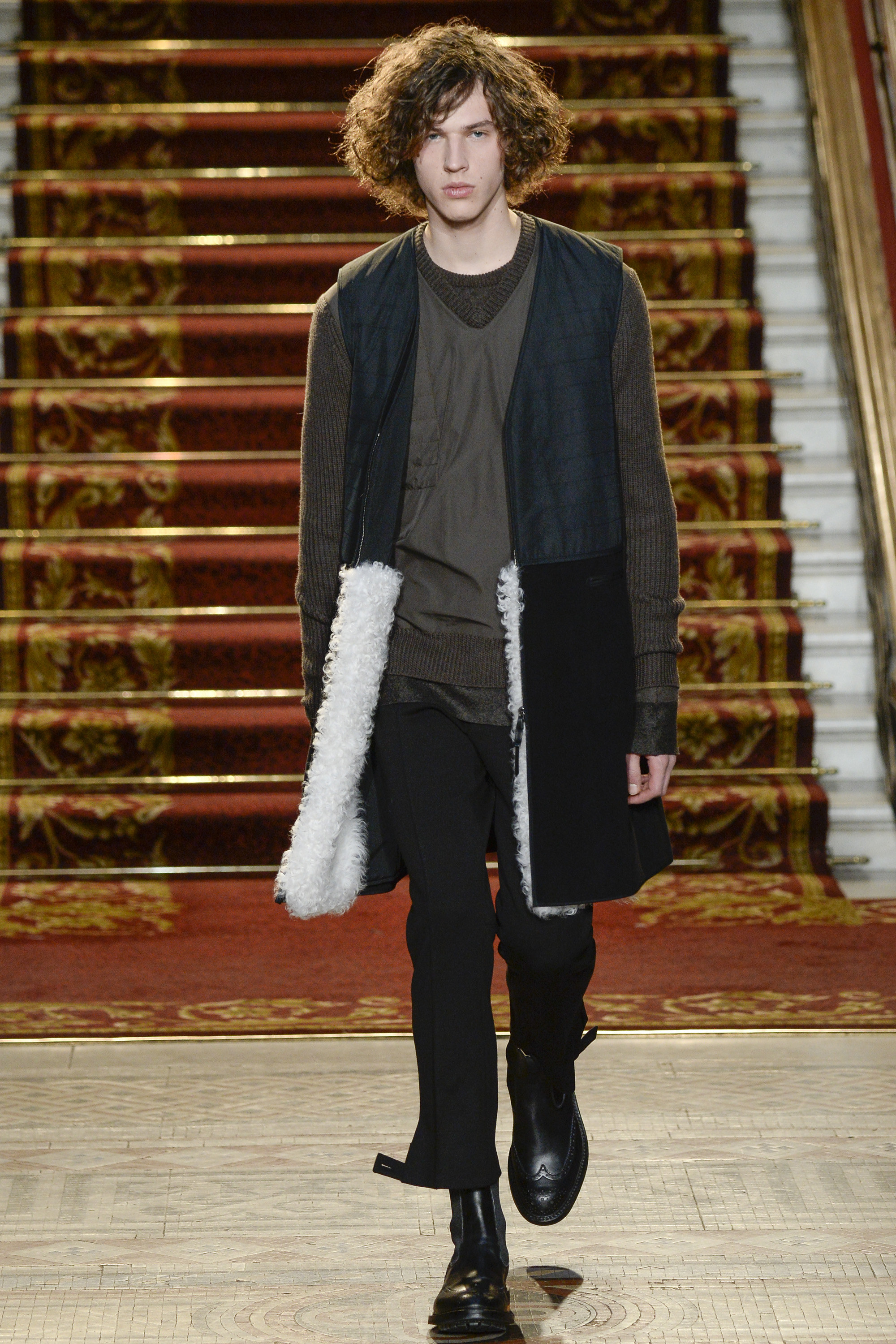 The outerwear—either parkas and duffles or knee-length gilets—was often broken into yet more grids, panels of nylon or tartan or plain wool. One off-the-reservation look was a sleeveless black turtleneck waistcoat completely open at the back and fastened to the body by a shoulder holster strap like an extremely lustrous bib.