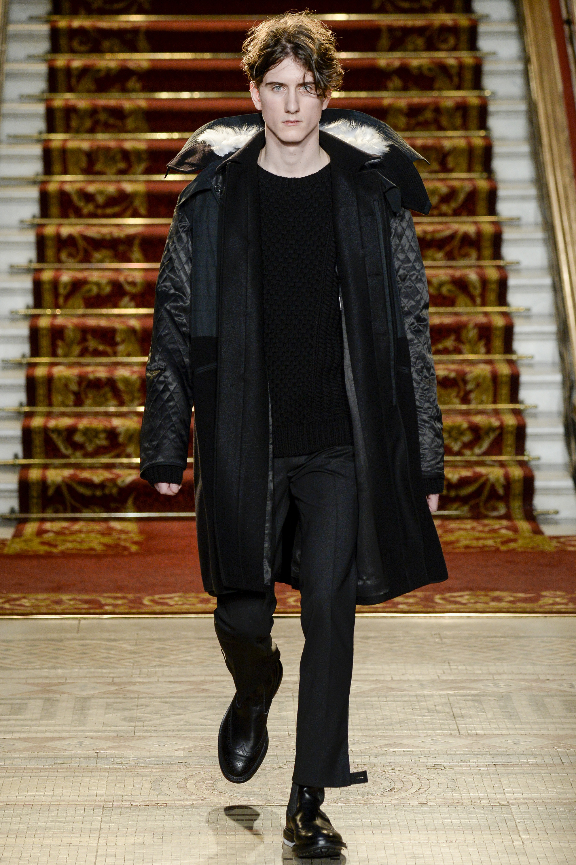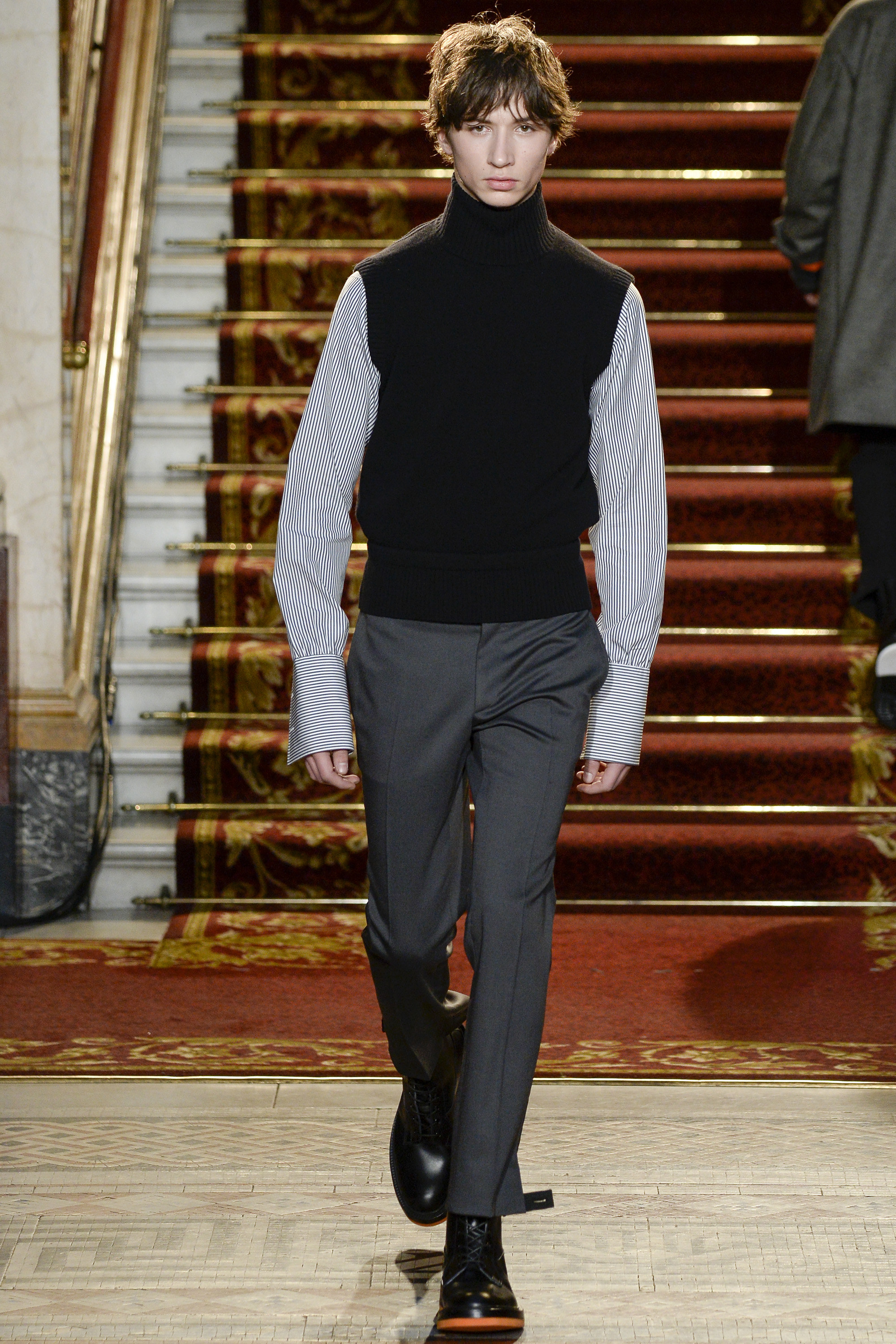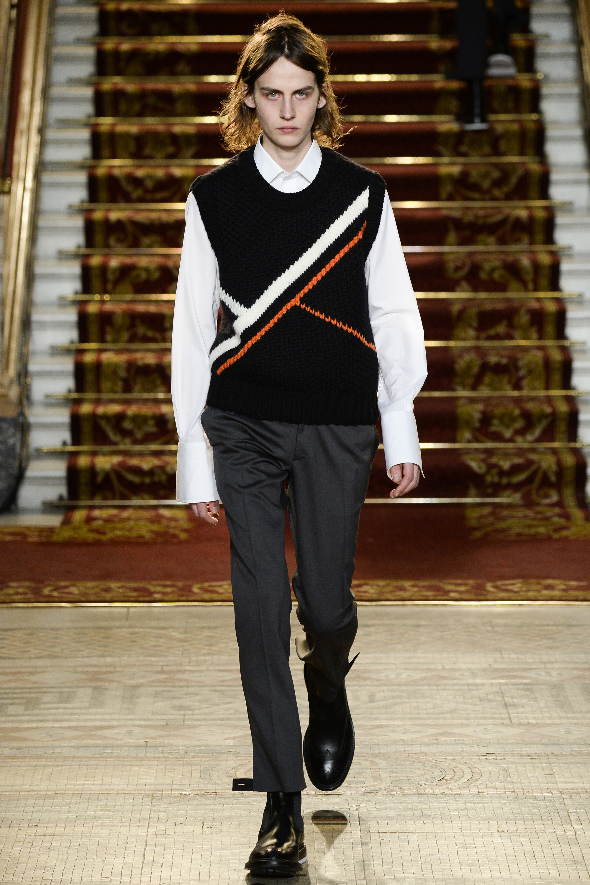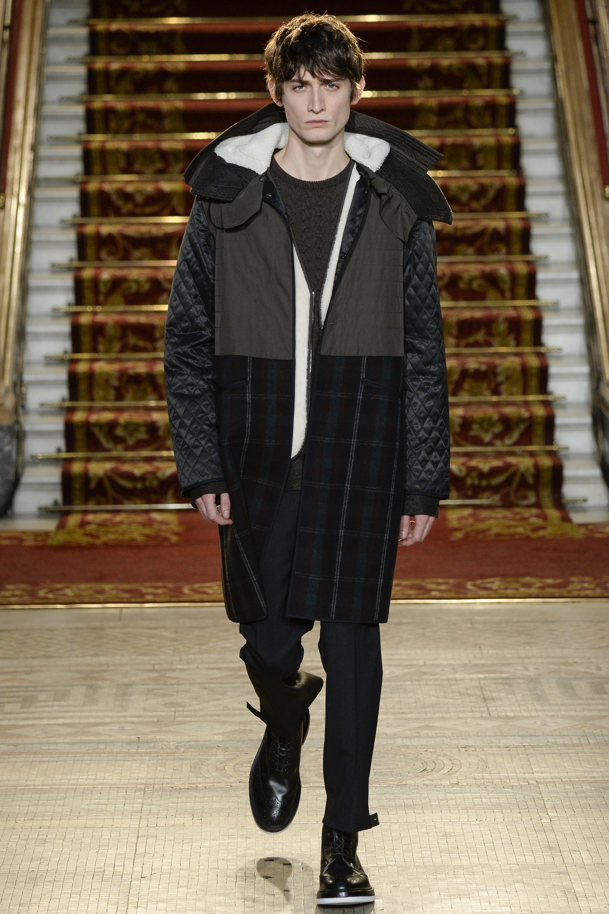 The outerwear—either parkas and duffles or knee-length gilets—was often broken into yet more grids, panels of nylon or tartan or plain wool. One off-the-reservation look was a sleeveless black turtleneck waistcoat completely open at the back and fastened to the body by a shoulder holster strap like an extremely lustrous bib.