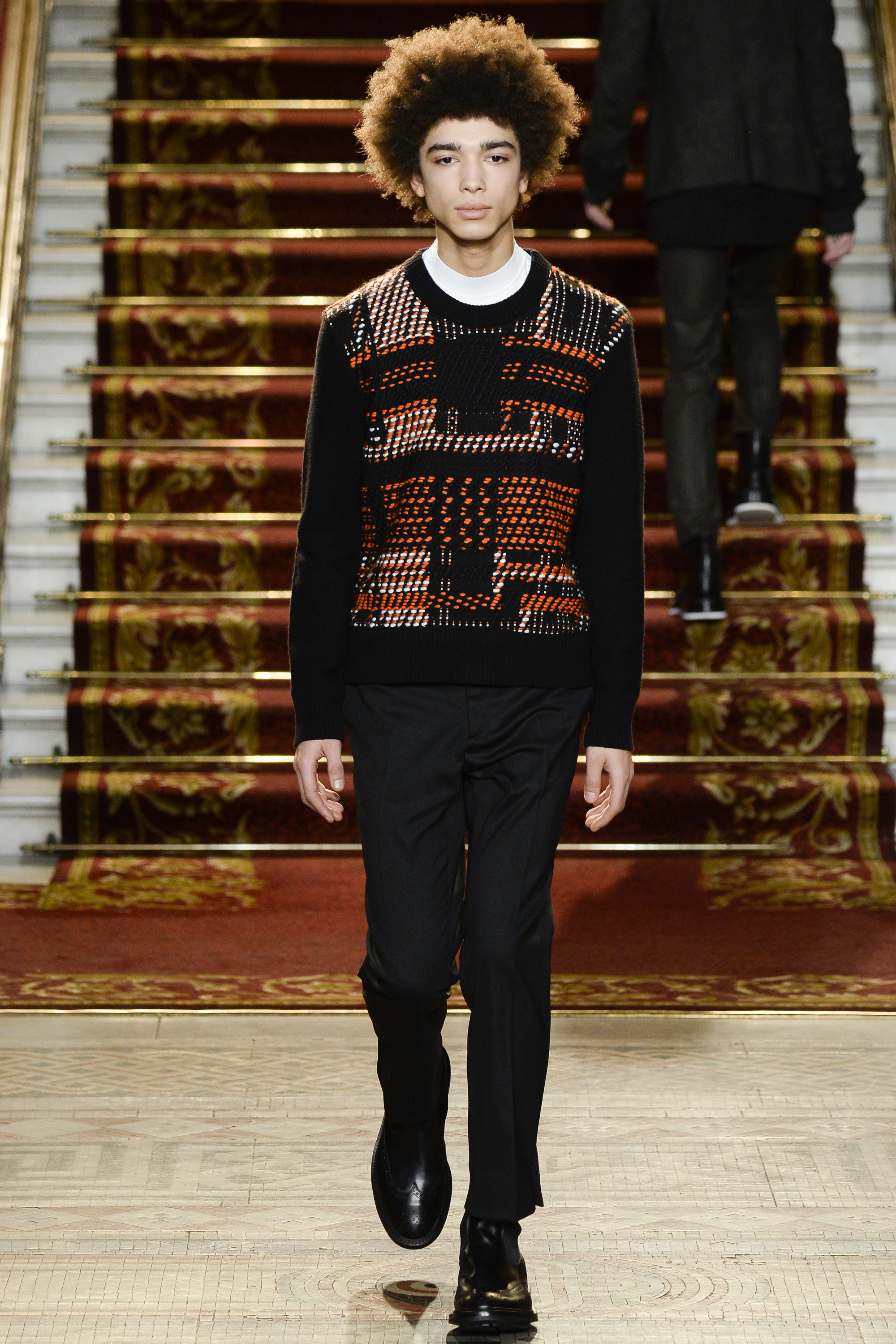 As he perused an Agnes Martin exhibition recently, Massimo Nicosia was struck by a quote describing her work as, “a repetitive use of a repetitive medium.” The man at the helm of Pringle of Scotland, which has been honing the medium of knitwear for 200 years, felt an epiphany of affinity. Like Martin’s, Pringle’s visual language contains a great many grids; argyle (of course); tartan; the grids of stitching and crochet, and checks. Hence Nicosia’s succumbing to the full embrace of the grid for this season. Crochet flashed low-resolution orange pixels against white and black. Argyle panels that looked to be lambskin fronted V-necks under fine-gauge turtlenecks below. Prince of Wales check, a warm loden and berry tartan, or checks of differently scaled houndstooth featured on jackets. His patterns were not bound by the right angle: One monochrome Fair Isle whose lines angled and jarred at each other must have been a fascinating challenge to produce.
