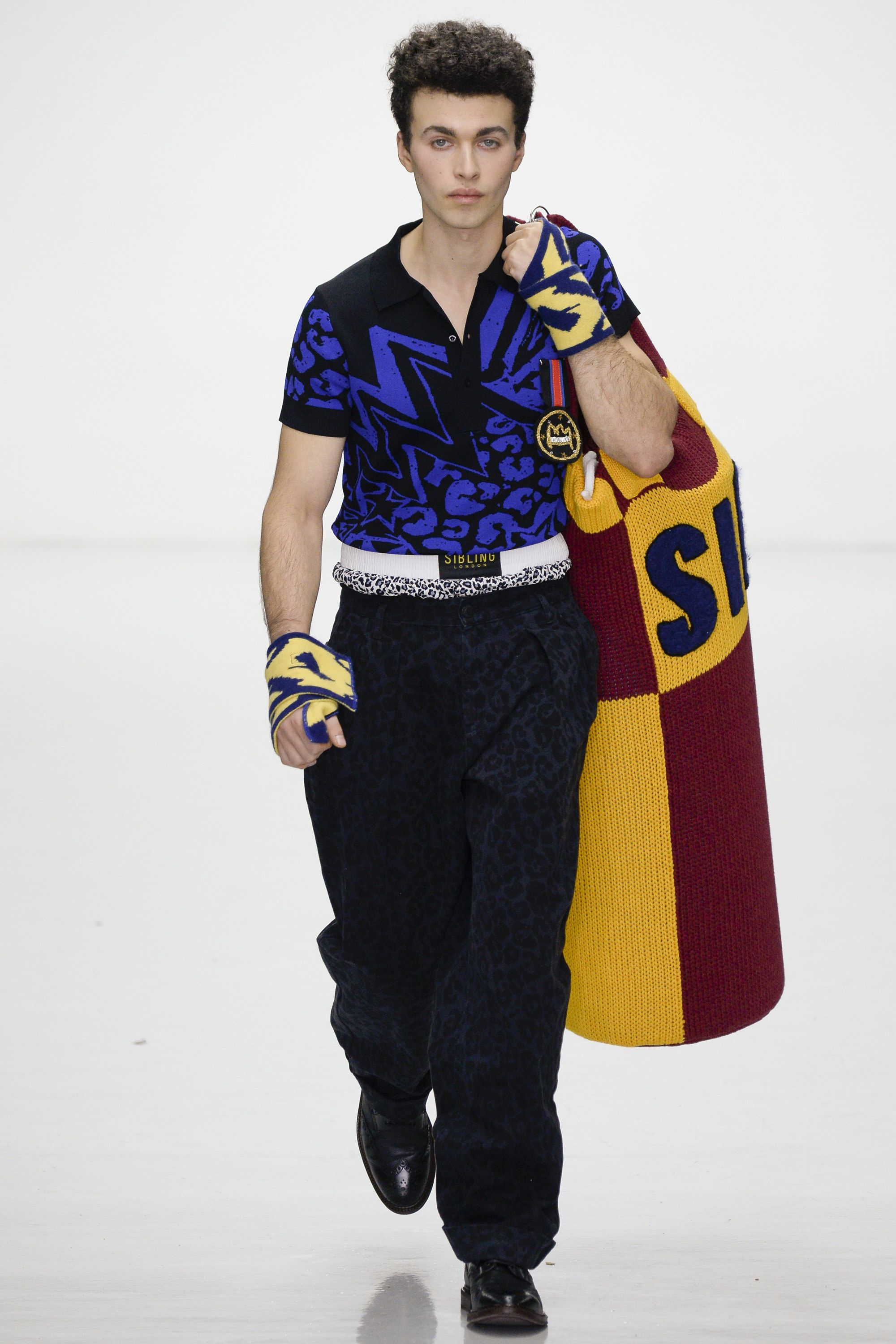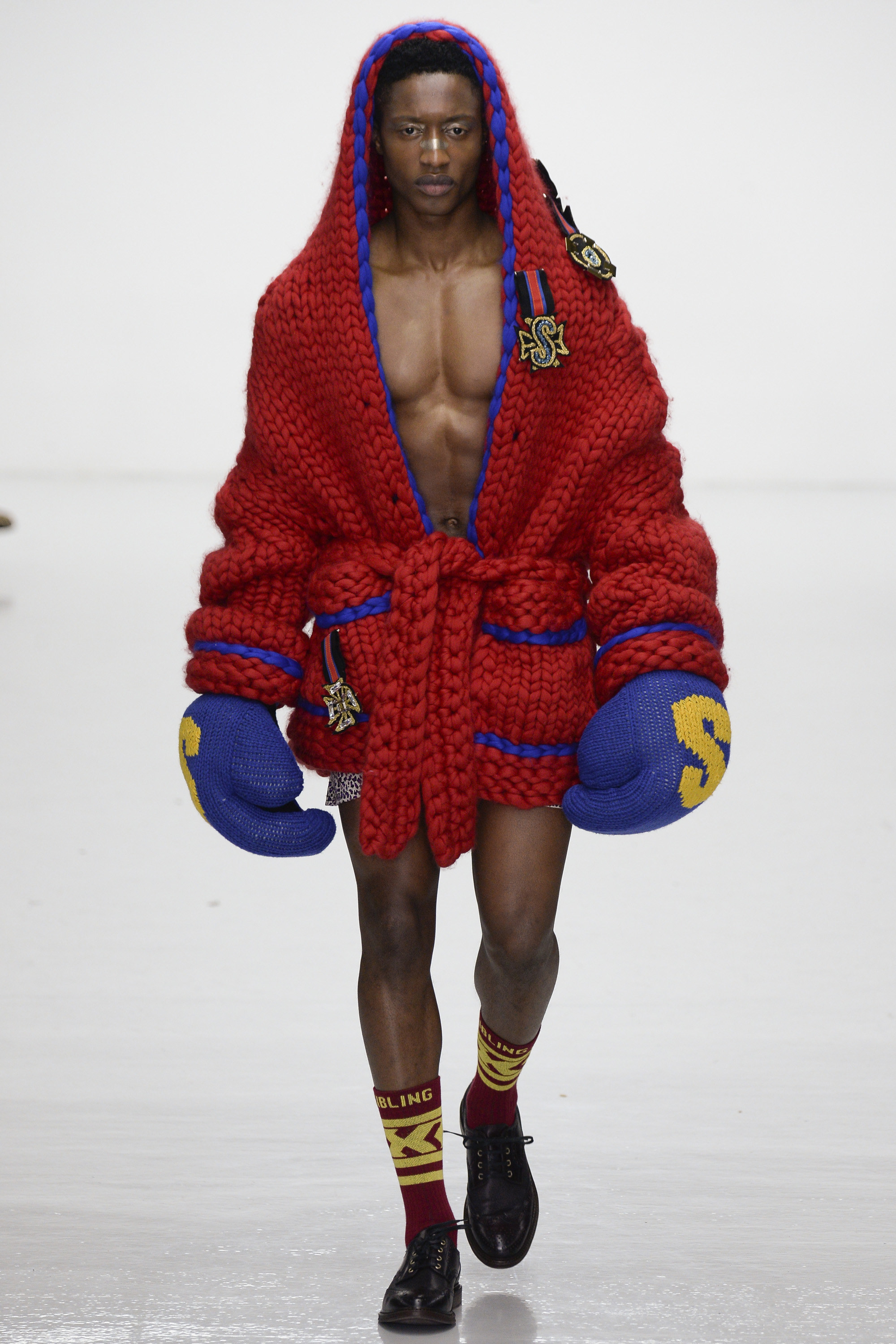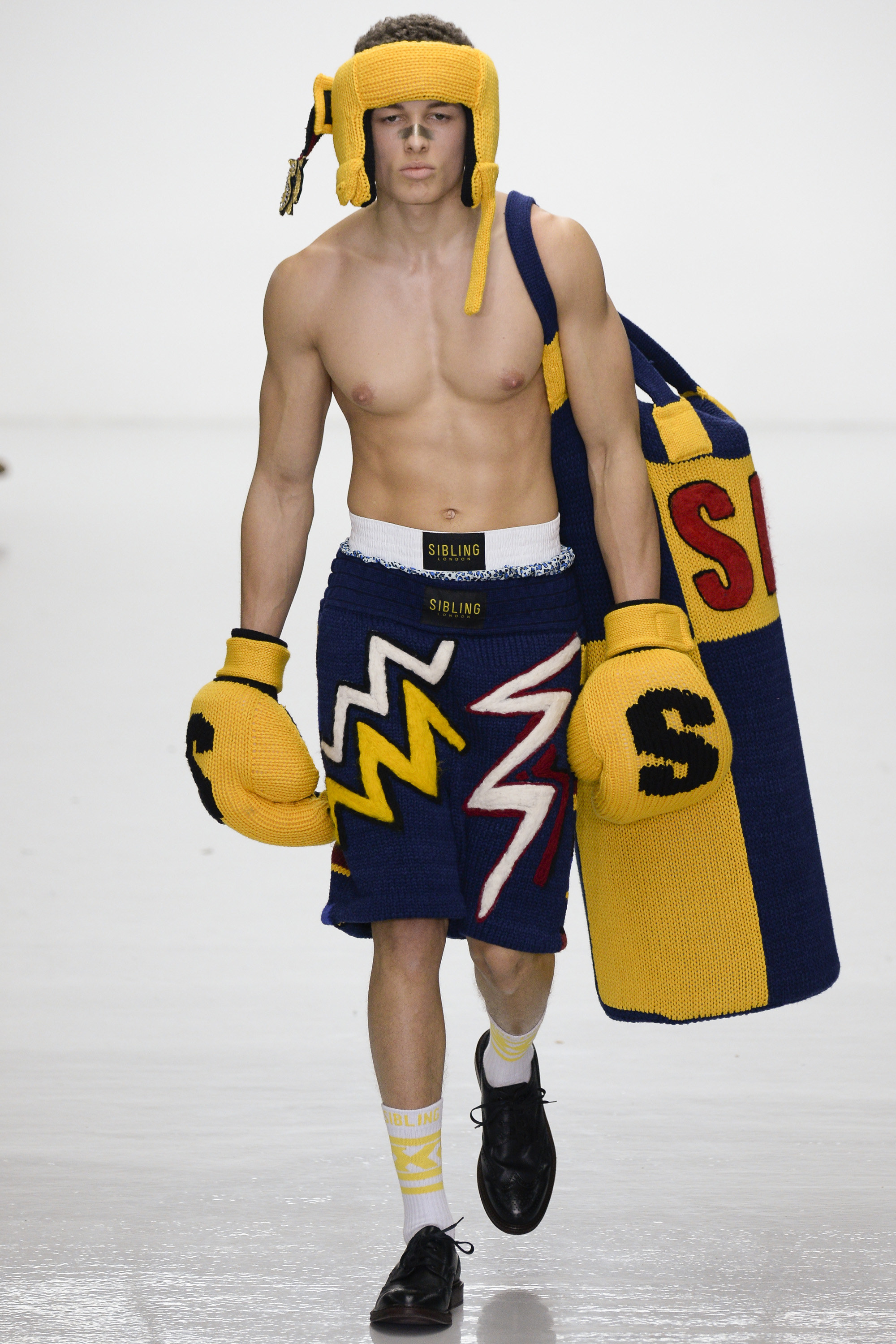 Ding dong, seconds out: Michael Halsband’s 1985 portrait of Andy Warhol and Jean-Michel Basquiat in boxing shorts and gloves sounded the starting bell for this progressively aggressive collection of virtuosity in knitwear. By Sibling’s unique standards, though, tonight’s show began gingerly, almost meekly, with black-backed blue or red jacquard blow-ups of a Sid Bryan doodle inspired by Basquiat and Grace Jones covers, on cardigans and blankets that were wrapped around the models like sarongs. Afterwards Bryan said he had been thrown against the ropes these first few rounds by the urge to keep this collection a muted one. “Last winter was so pink and so bright I wanted to do the antithesis of that . . . It was going to be all black and dark, dark navy. But then I couldn’t do it.”