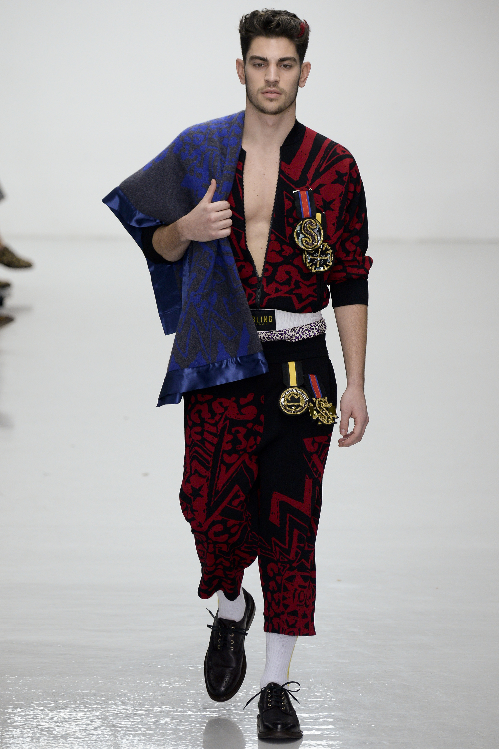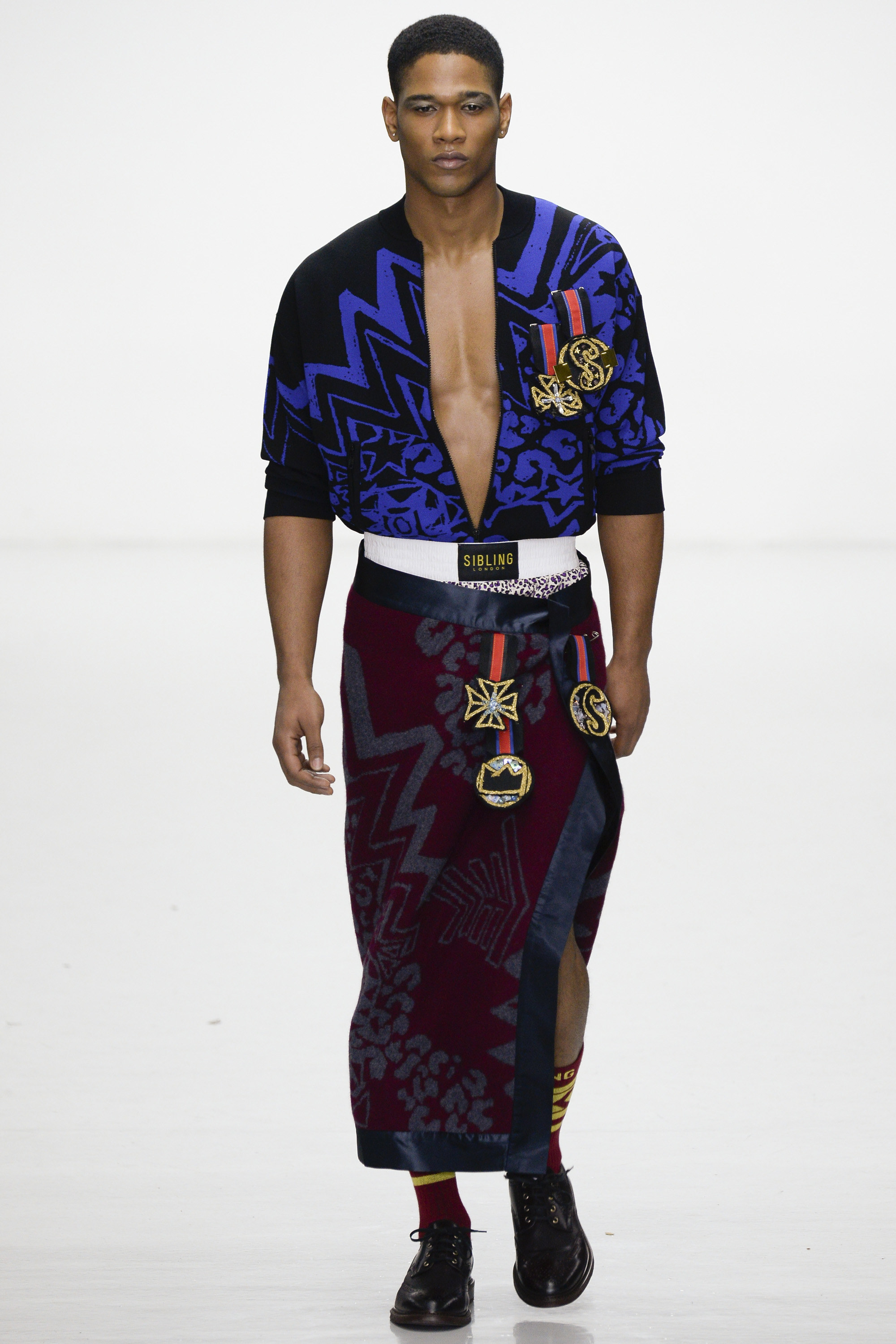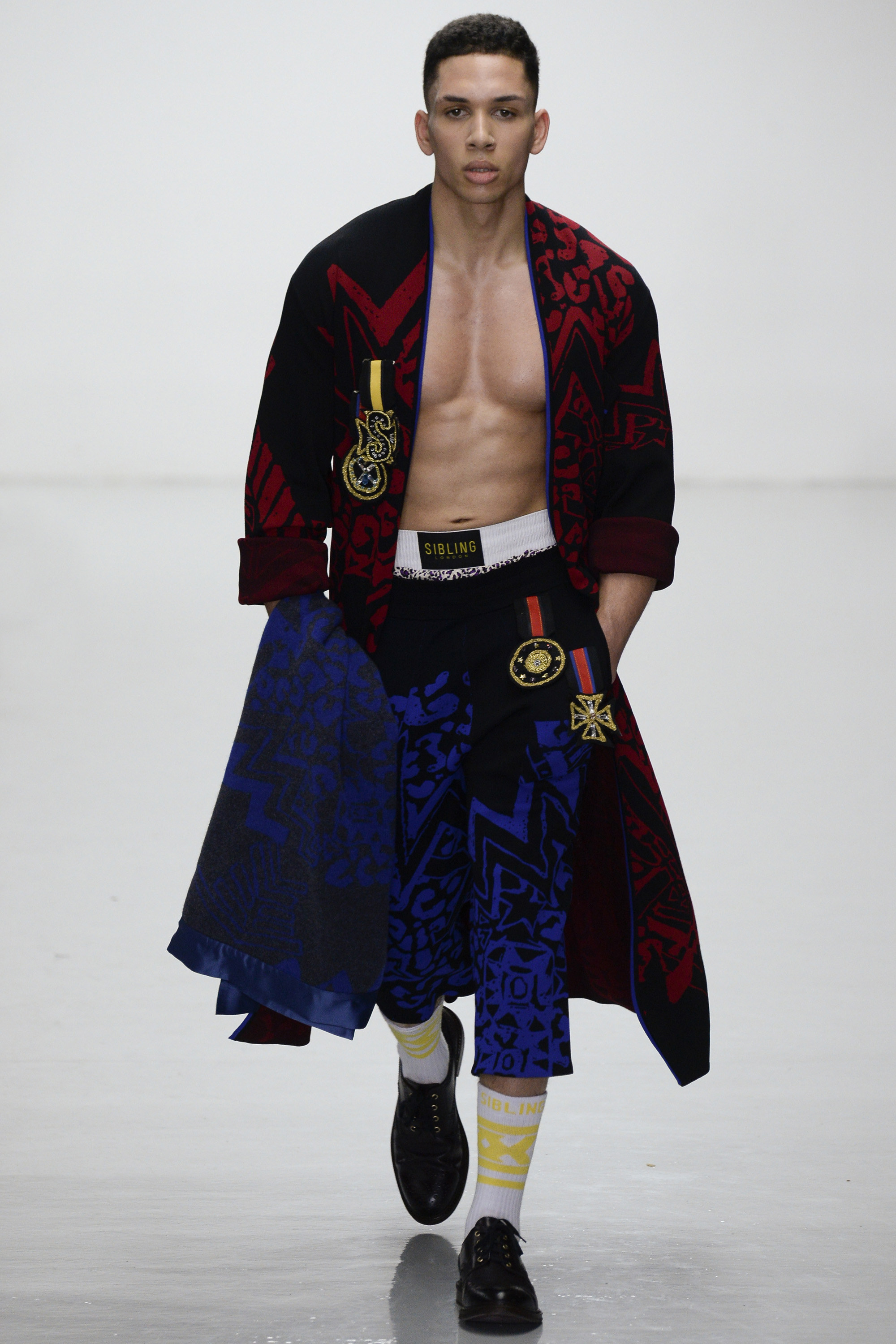 Ding dong, seconds out: Michael Halsband’s 1985 portrait of Andy Warhol and Jean-Michel Basquiat in boxing shorts and gloves sounded the starting bell for this progressively aggressive collection of virtuosity in knitwear. By Sibling’s unique standards, though, tonight’s show began gingerly, almost meekly, with black-backed blue or red jacquard blow-ups of a Sid Bryan doodle inspired by Basquiat and Grace Jones covers, on cardigans and blankets that were wrapped around the models like sarongs. Afterwards Bryan said he had been thrown against the ropes these first few rounds by the urge to keep this collection a muted one. “Last winter was so pink and so bright I wanted to do the antithesis of that . . . It was going to be all black and dark, dark navy. But then I couldn’t do it.”