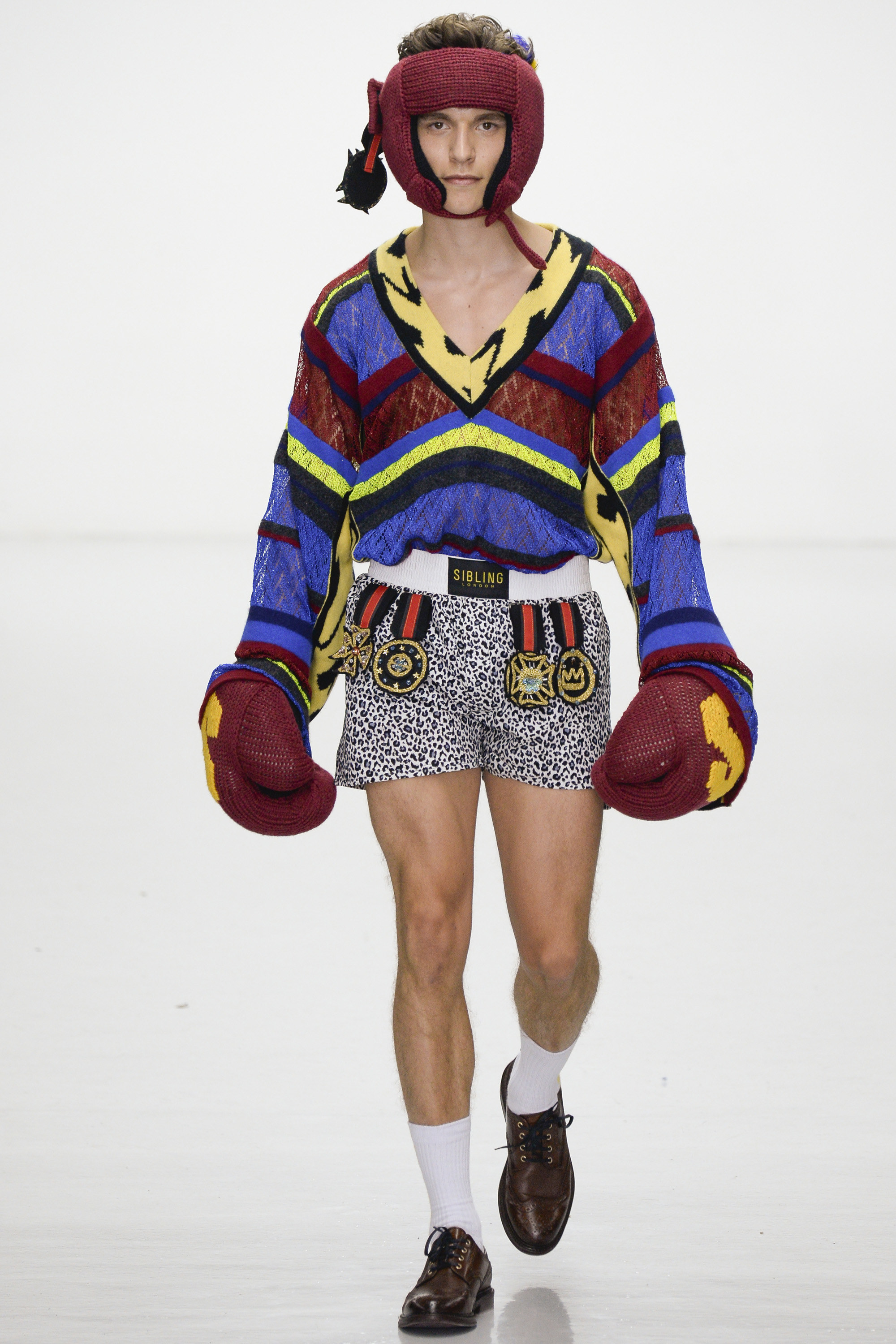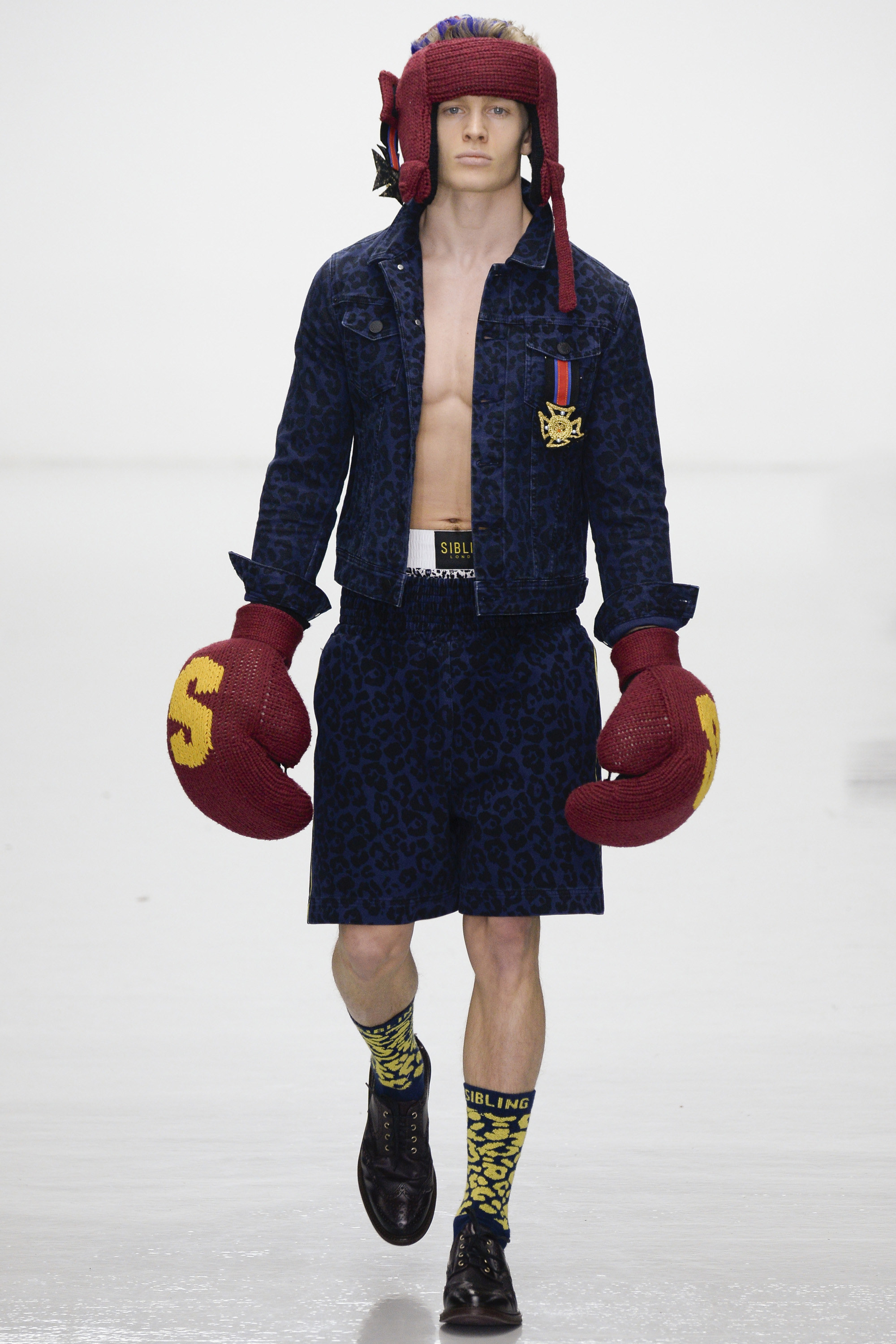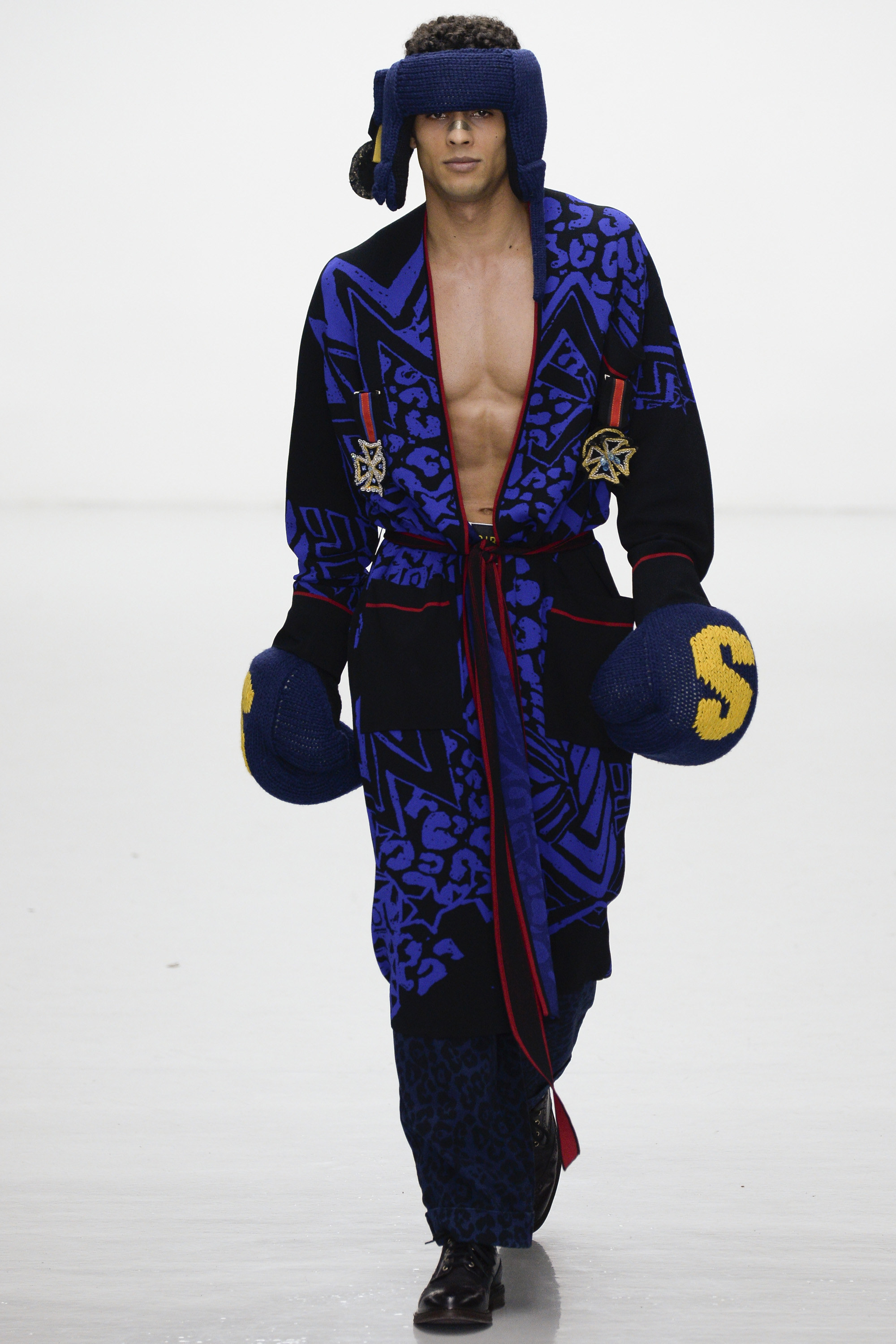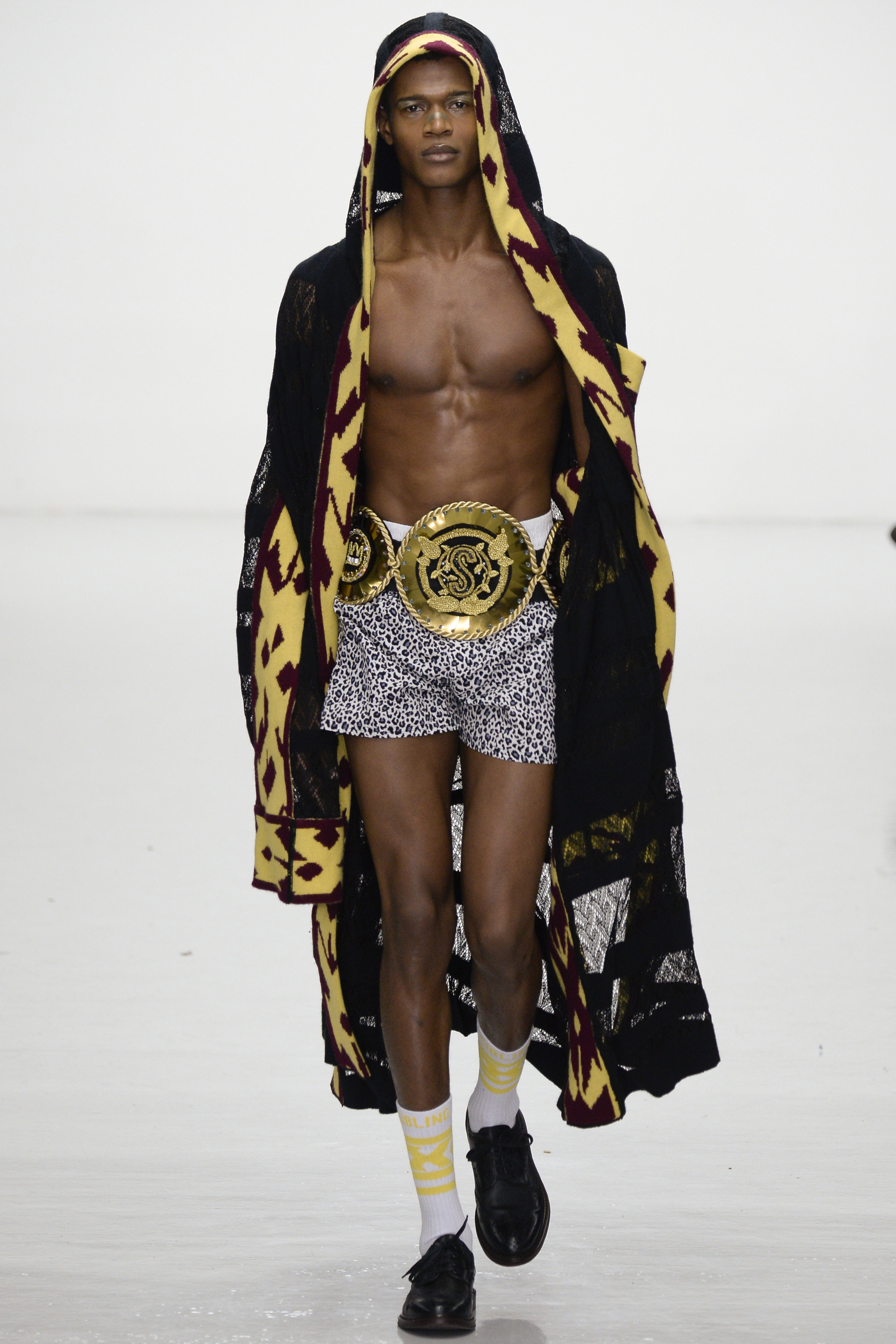 Slowly Sibling succumbed to its siren song of WTF exuberance. The boxing theme took shape via hand-knitted head masks and gloves. The models were ever more densely peppered with Lurex yarn medals. Sibling’s off-color leopard print roared on boxers styled to ruck up the thighs of the tigers wearing them. Sequins and lace, an ever reliable one-two in the designers’ dressing up box of tricks, made their appearance. So too did their second fist at suiting, this time a sprinkling of baggy jackets and pants in Dormeuil wool based on Basquiat’s suits—which were probably Armani. The closing section of robes, all hand knit, were fantastic etched-wool homages to Basquiat’s bob-and-weave lines. Bryan insisted that these were not mere show clothes: “They’ve already got the customers lined up. We only make what we know we are going to sell, because otherwise what’s the point?” Technically brilliant, artisan-made fashion with an artistic sensibility that sells, sells, sells? That counts as a knockout.