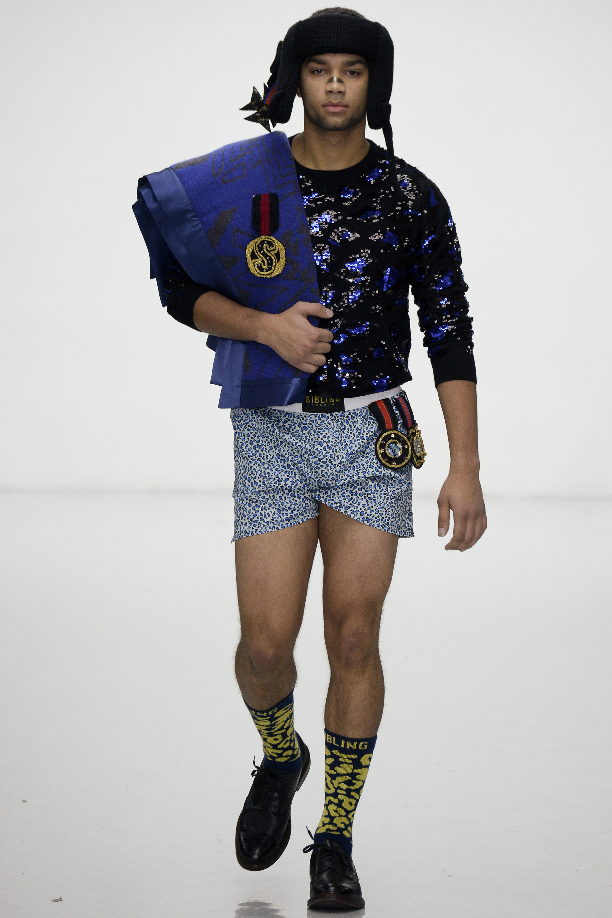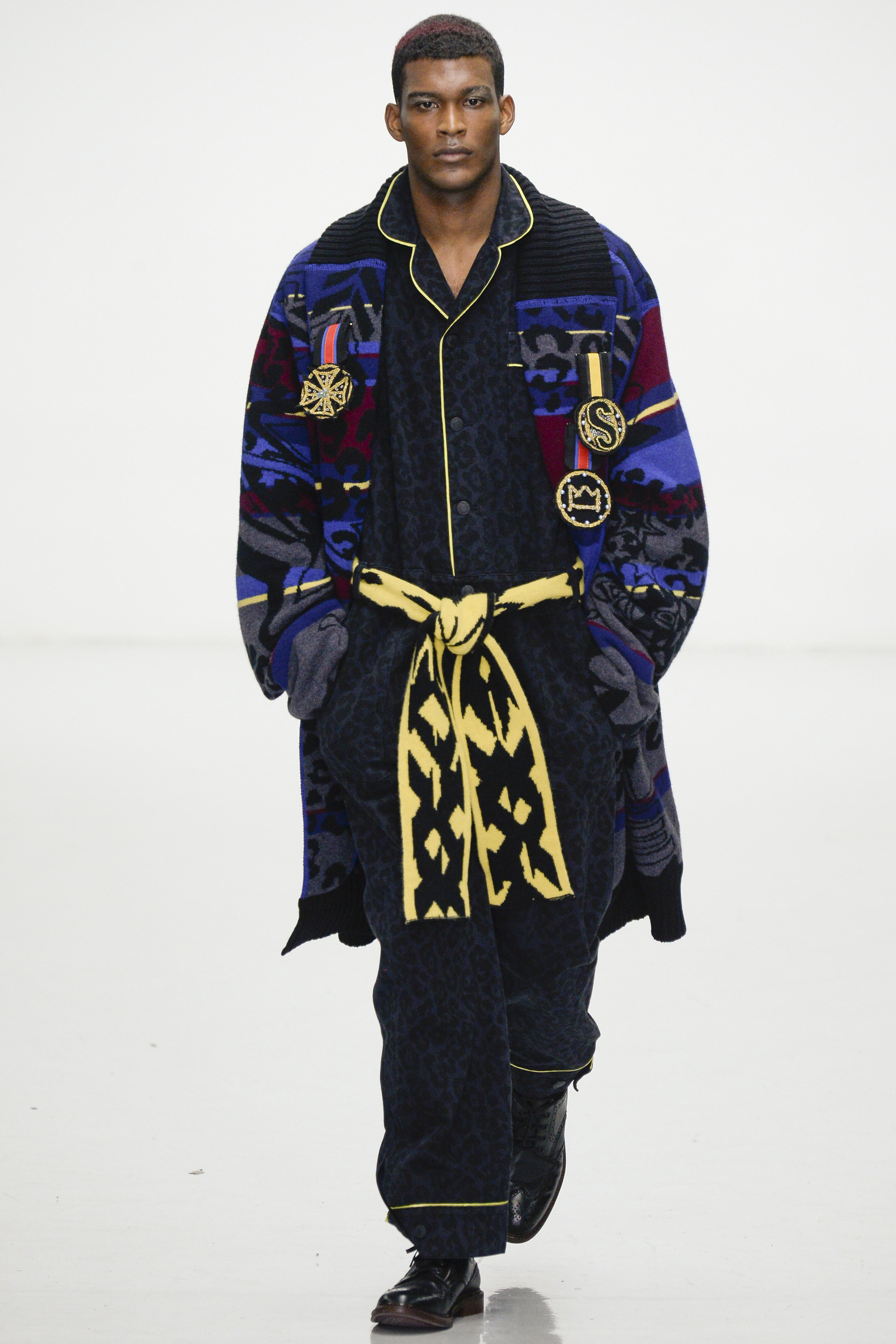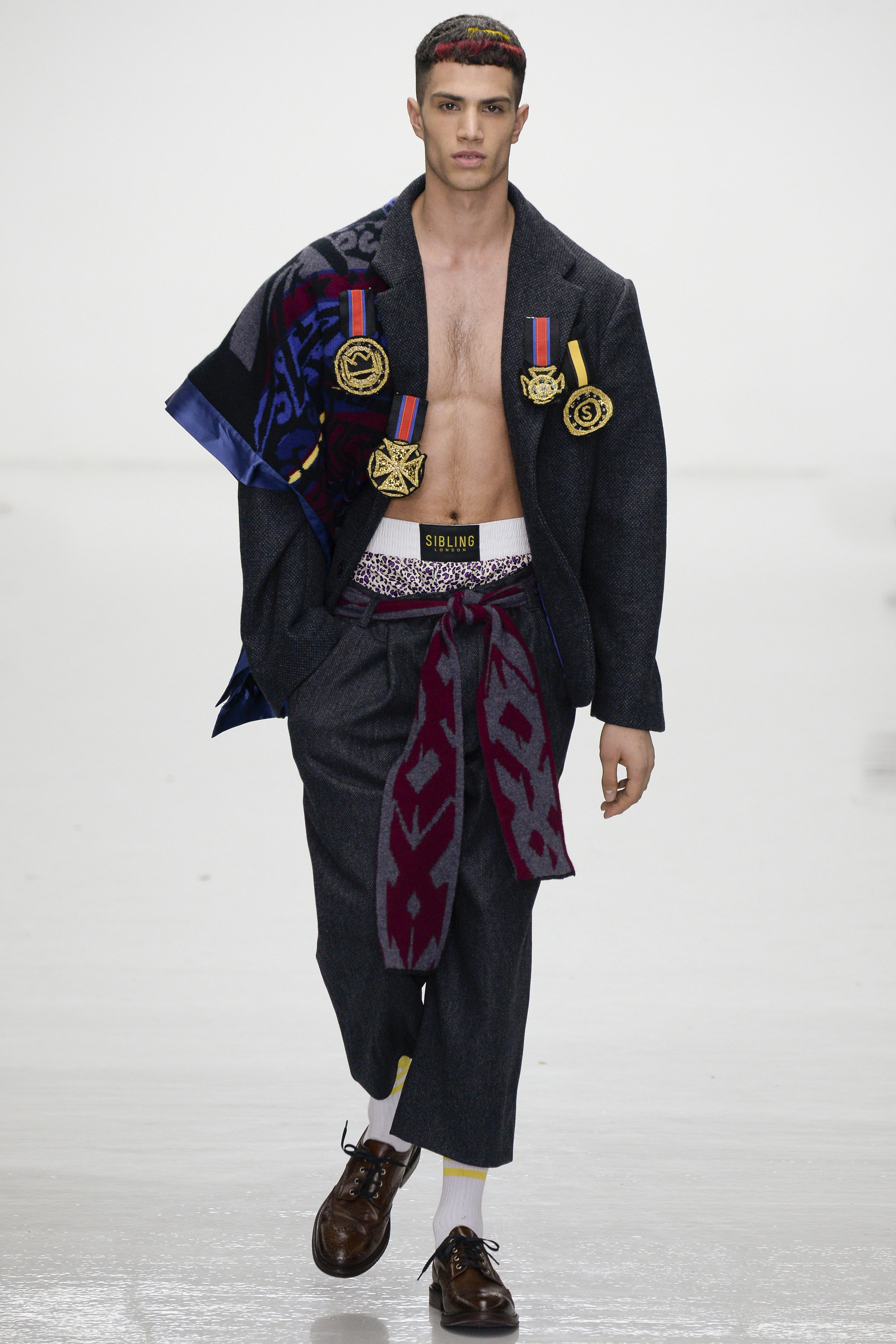 Slowly Sibling succumbed to its siren song of WTF exuberance. The boxing theme took shape via hand-knitted head masks and gloves. The models were ever more densely peppered with Lurex yarn medals. Sibling’s off-color leopard print roared on boxers styled to ruck up the thighs of the tigers wearing them. Sequins and lace, an ever reliable one-two in the designers’ dressing up box of tricks, made their appearance. So too did their second fist at suiting, this time a sprinkling of baggy jackets and pants in Dormeuil wool based on Basquiat’s suits—which were probably Armani. The closing section of robes, all hand knit, were fantastic etched-wool homages to Basquiat’s bob-and-weave lines. Bryan insisted that these were not mere show clothes: “They’ve already got the customers lined up. We only make what we know we are going to sell, because otherwise what’s the point?” Technically brilliant, artisan-made fashion with an artistic sensibility that sells, sells, sells? That counts as a knockout.