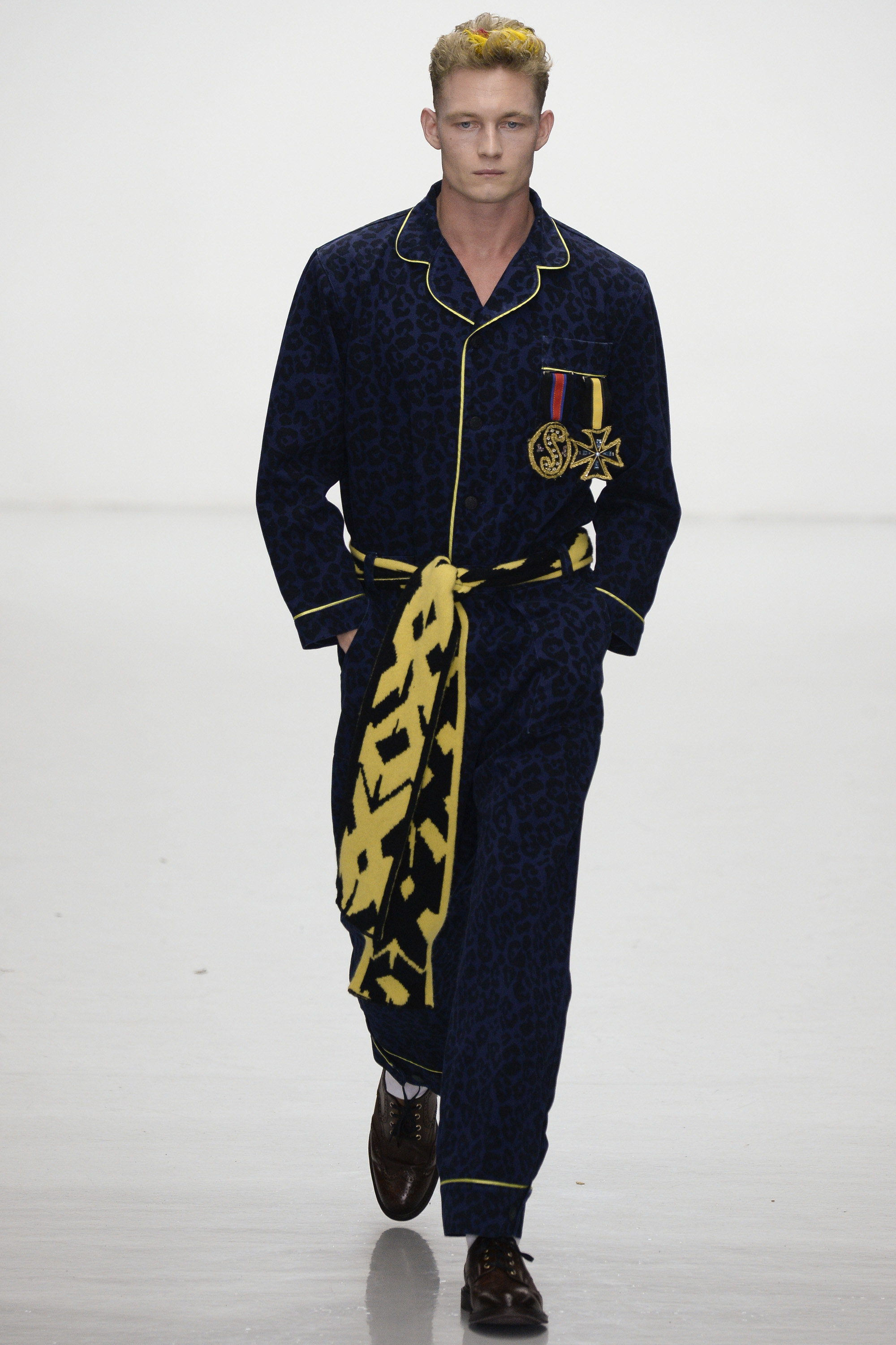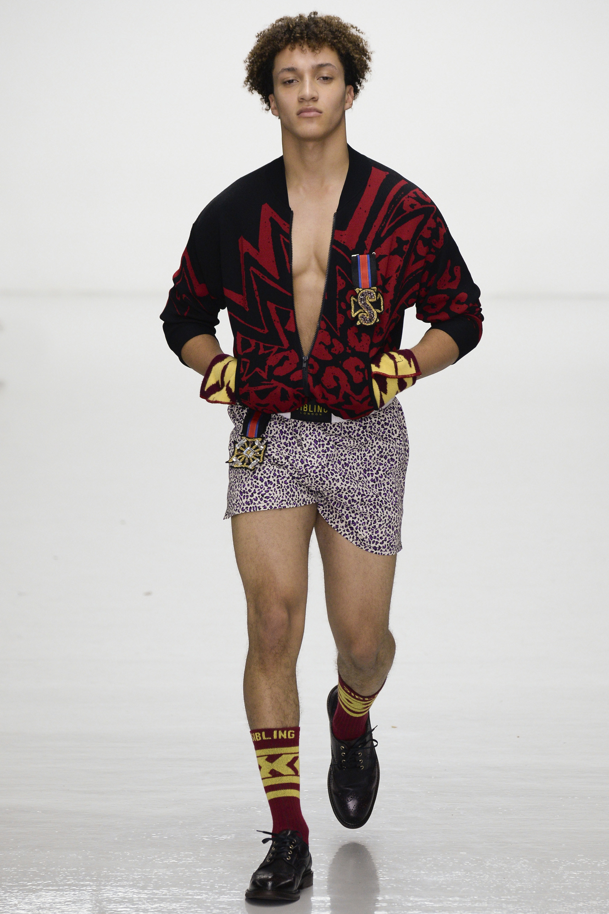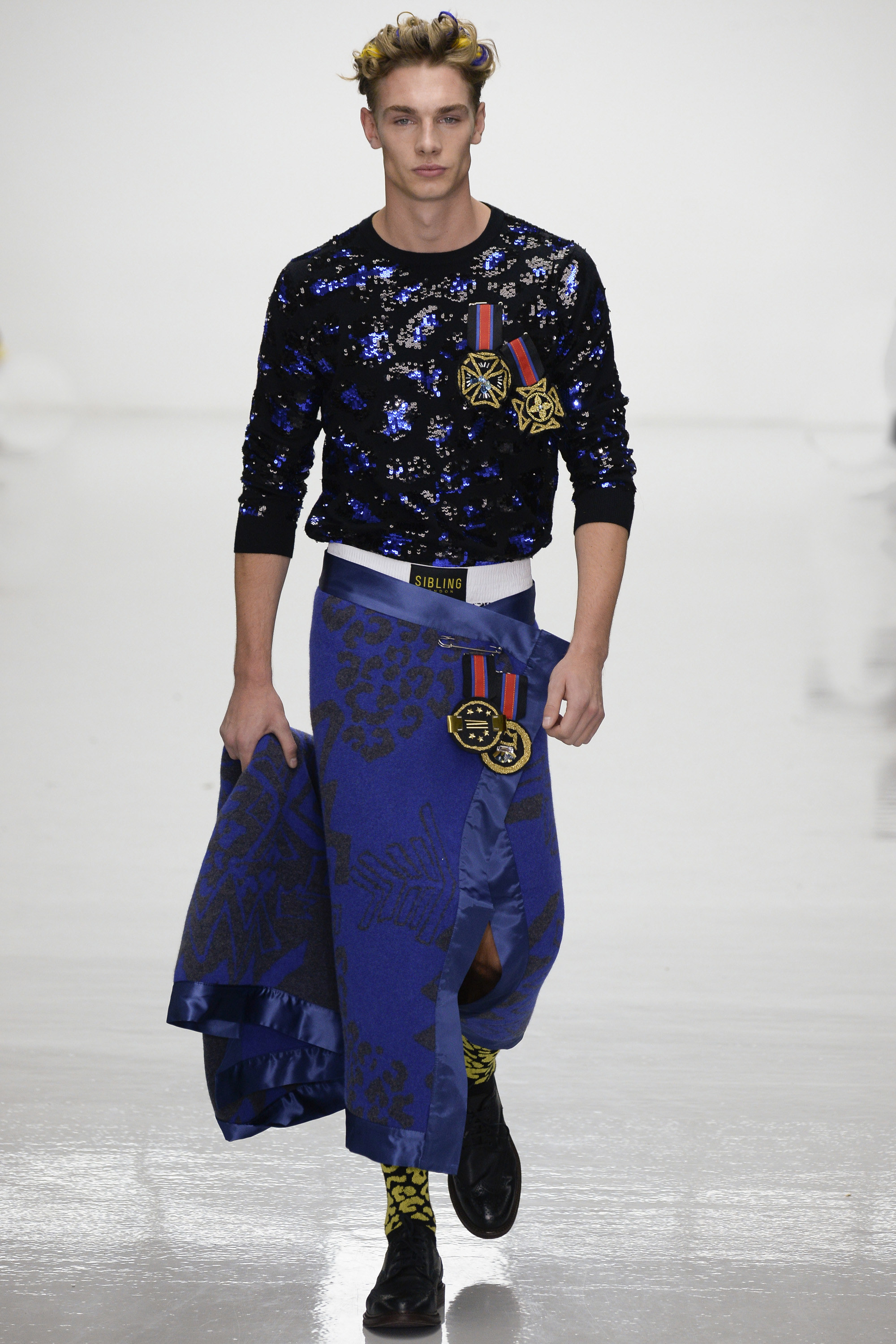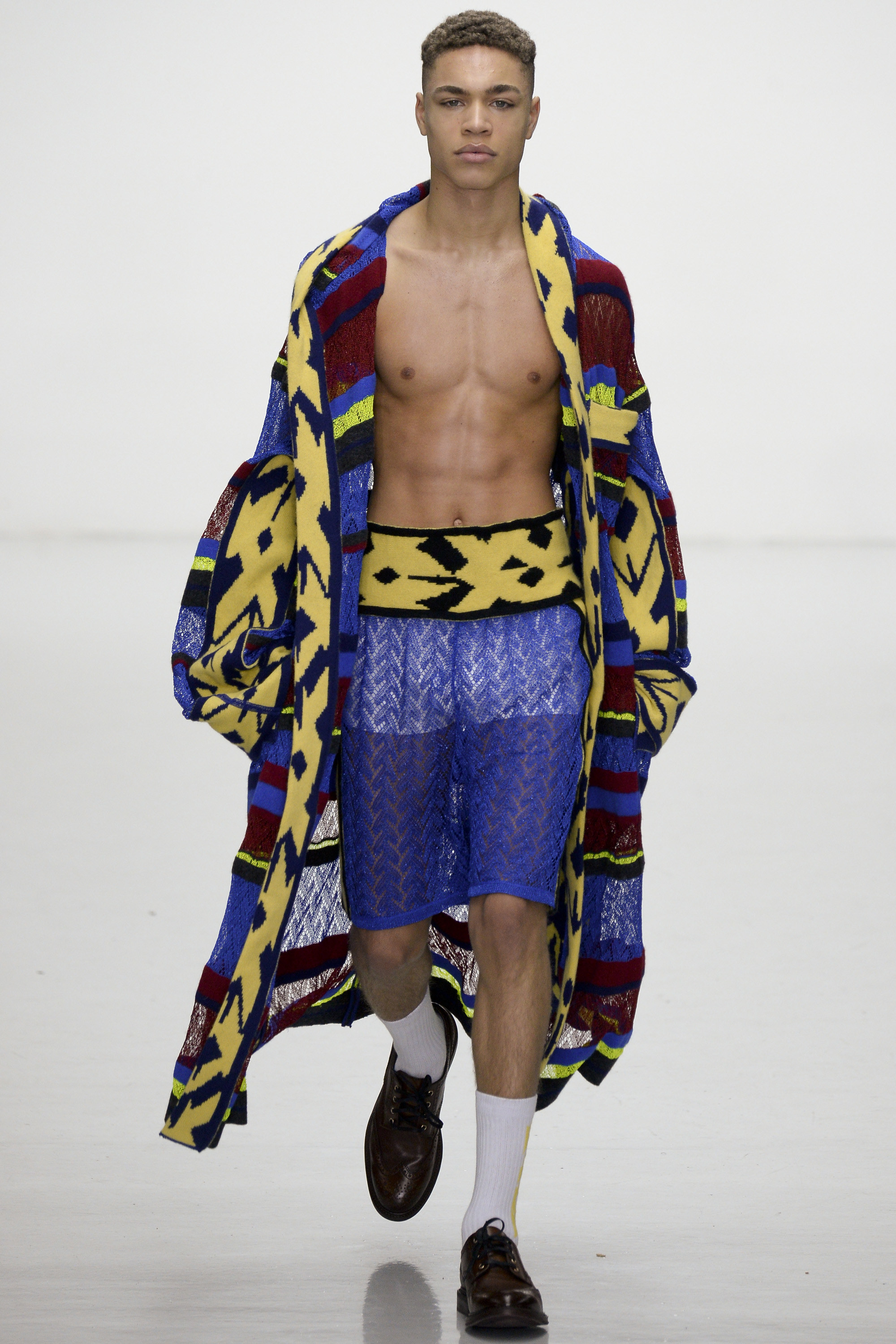 Slowly Sibling succumbed to its siren song of WTF exuberance. The boxing theme took shape via hand-knitted head masks and gloves. The models were ever more densely peppered with Lurex yarn medals. Sibling’s off-color leopard print roared on boxers styled to ruck up the thighs of the tigers wearing them. Sequins and lace, an ever reliable one-two in the designers’ dressing up box of tricks, made their appearance. So too did their second fist at suiting, this time a sprinkling of baggy jackets and pants in Dormeuil wool based on Basquiat’s suits—which were probably Armani. The closing section of robes, all hand knit, were fantastic etched-wool homages to Basquiat’s bob-and-weave lines. Bryan insisted that these were not mere show clothes: “They’ve already got the customers lined up. We only make what we know we are going to sell, because otherwise what’s the point?” Technically brilliant, artisan-made fashion with an artistic sensibility that sells, sells, sells? That counts as a knockout.