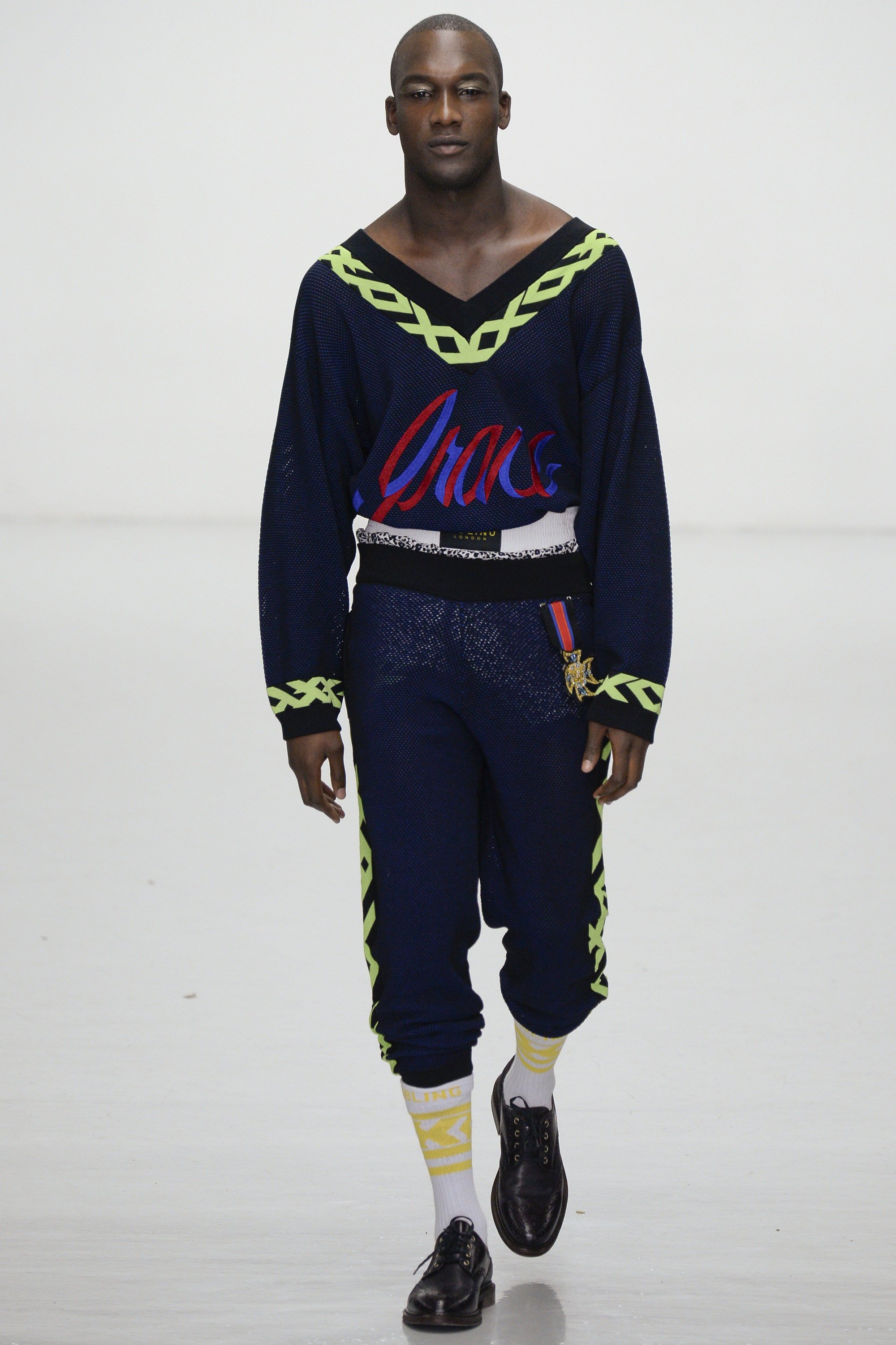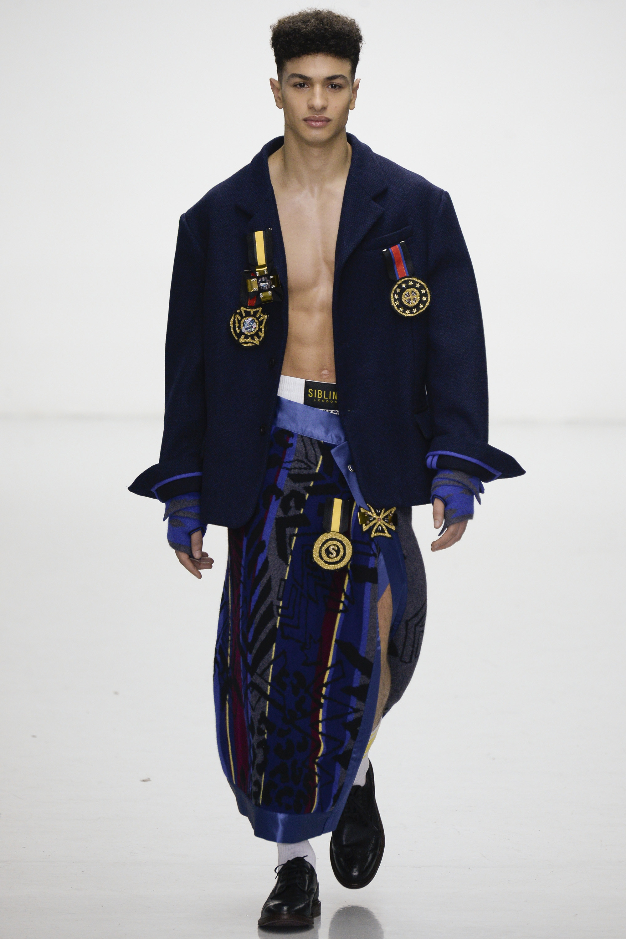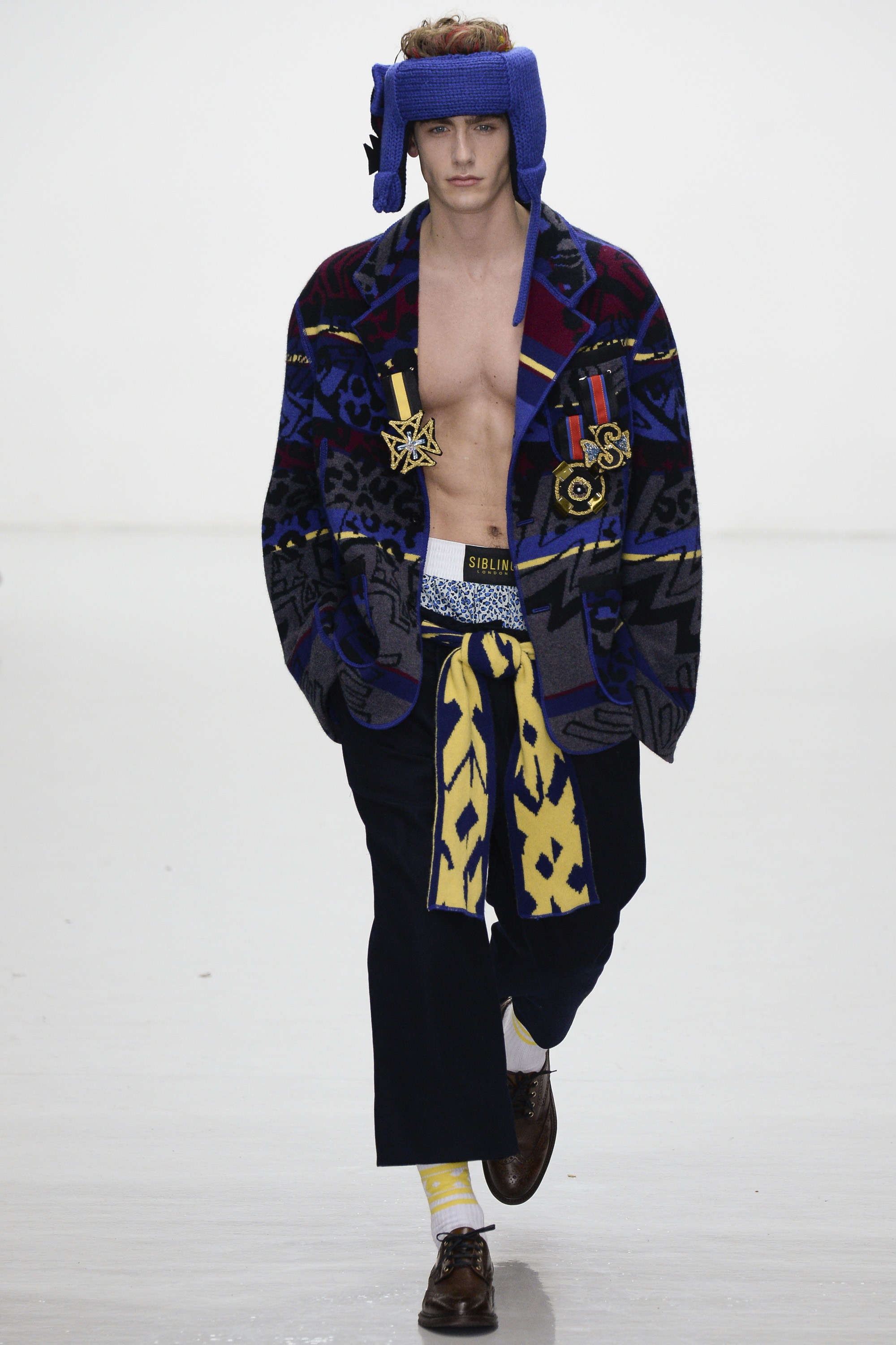 Ding dong, seconds out: Michael Halsband’s 1985 portrait of Andy Warhol and Jean-Michel Basquiat in boxing shorts and gloves sounded the starting bell for this progressively aggressive collection of virtuosity in knitwear. By Sibling’s unique standards, though, tonight’s show began gingerly, almost meekly, with black-backed blue or red jacquard blow-ups of a Sid Bryan doodle inspired by Basquiat and Grace Jones covers, on cardigans and blankets that were wrapped around the models like sarongs. Afterwards Bryan said he had been thrown against the ropes these first few rounds by the urge to keep this collection a muted one. “Last winter was so pink and so bright I wanted to do the antithesis of that . . . It was going to be all black and dark, dark navy. But then I couldn’t do it.”