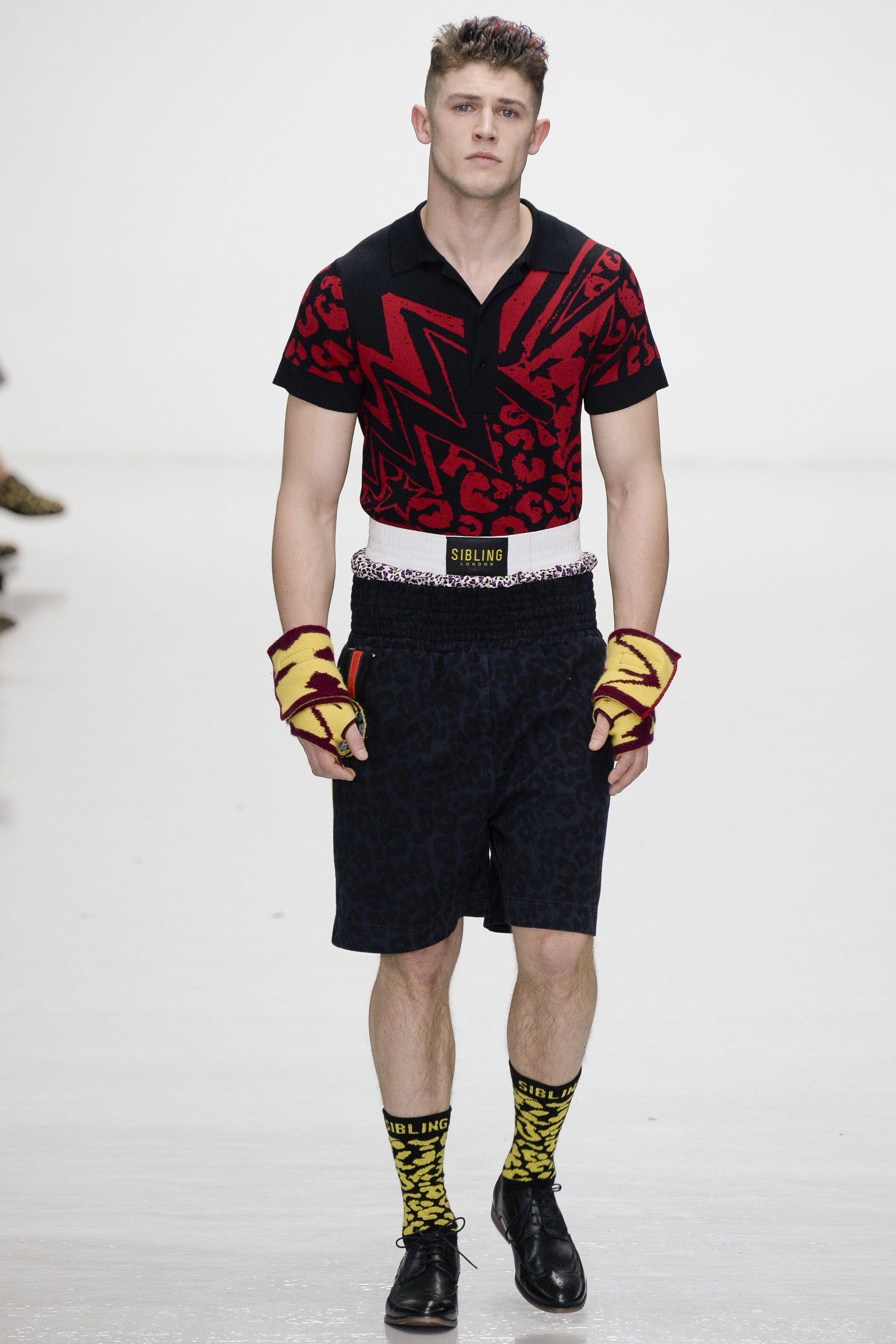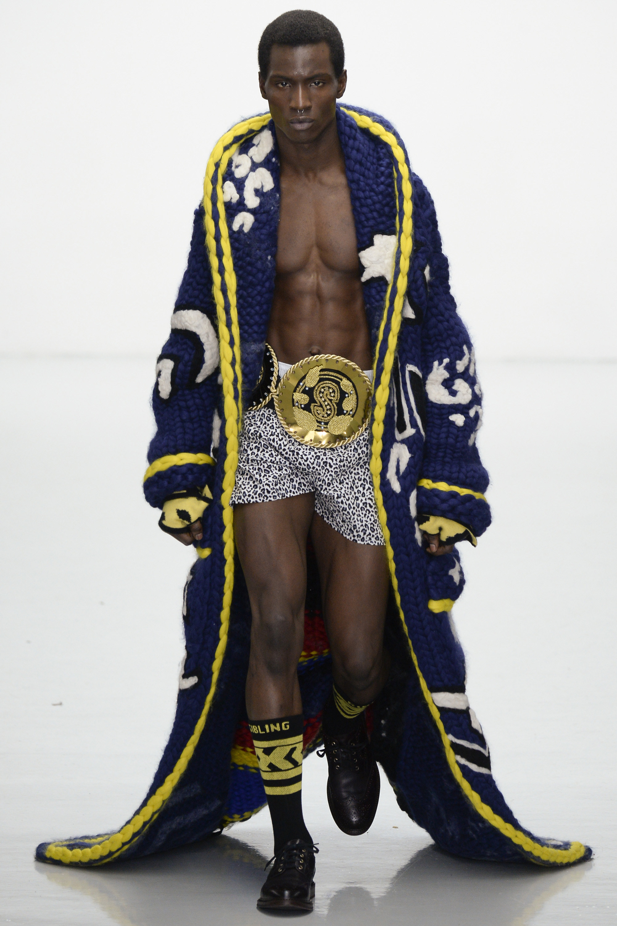 Slowly Sibling succumbed to its siren song of WTF exuberance. The boxing theme took shape via hand-knitted head masks and gloves. The models were ever more densely peppered with Lurex yarn medals. Sibling’s off-color leopard print roared on boxers styled to ruck up the thighs of the tigers wearing them. Sequins and lace, an ever reliable one-two in the designers’ dressing up box of tricks, made their appearance. So too did their second fist at suiting, this time a sprinkling of baggy jackets and pants in Dormeuil wool based on Basquiat’s suits—which were probably Armani. The closing section of robes, all hand knit, were fantastic etched-wool homages to Basquiat’s bob-and-weave lines. Bryan insisted that these were not mere show clothes: “They’ve already got the customers lined up. We only make what we know we are going to sell, because otherwise what’s the point?” Technically brilliant, artisan-made fashion with an artistic sensibility that sells, sells, sells? That counts as a knockout.