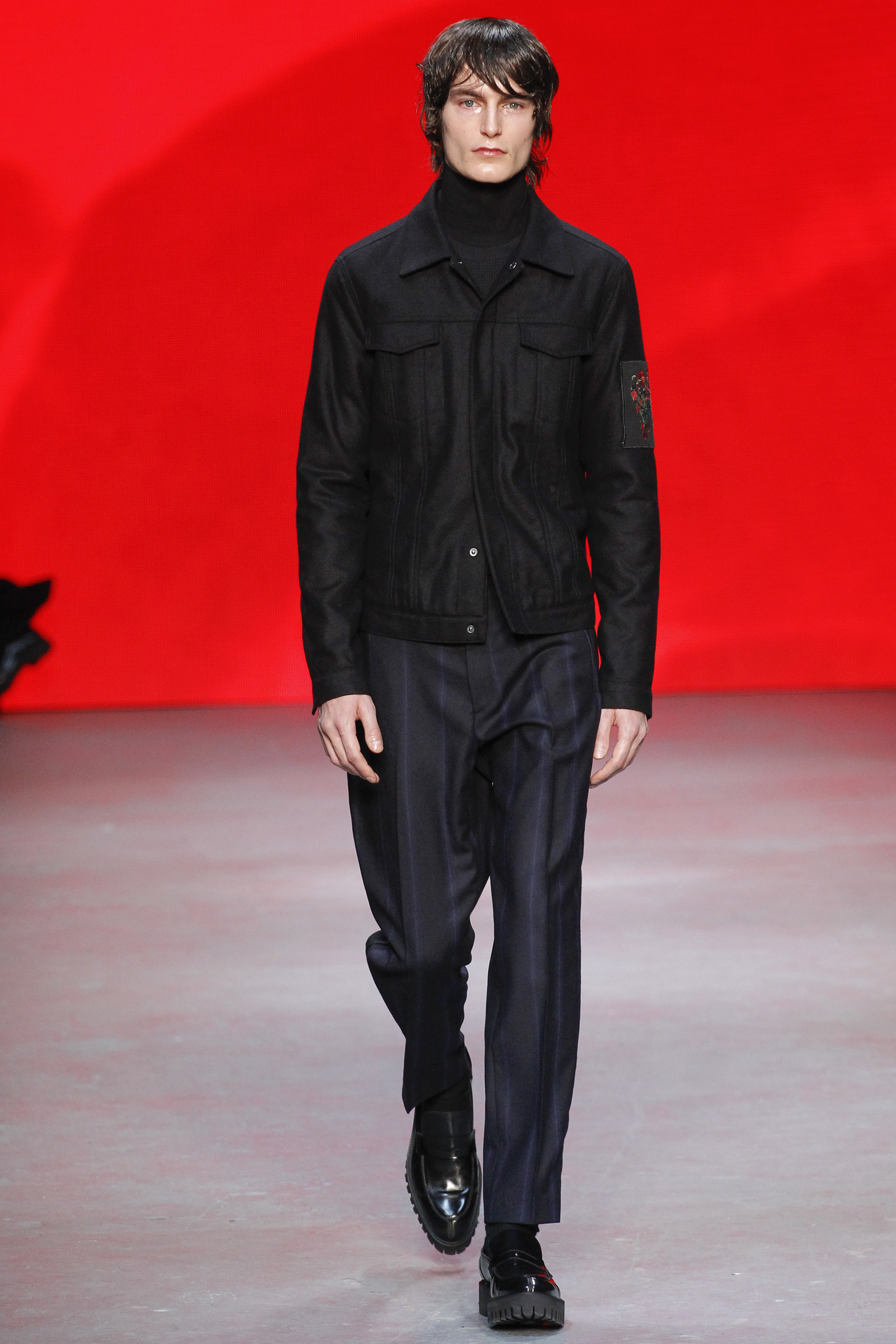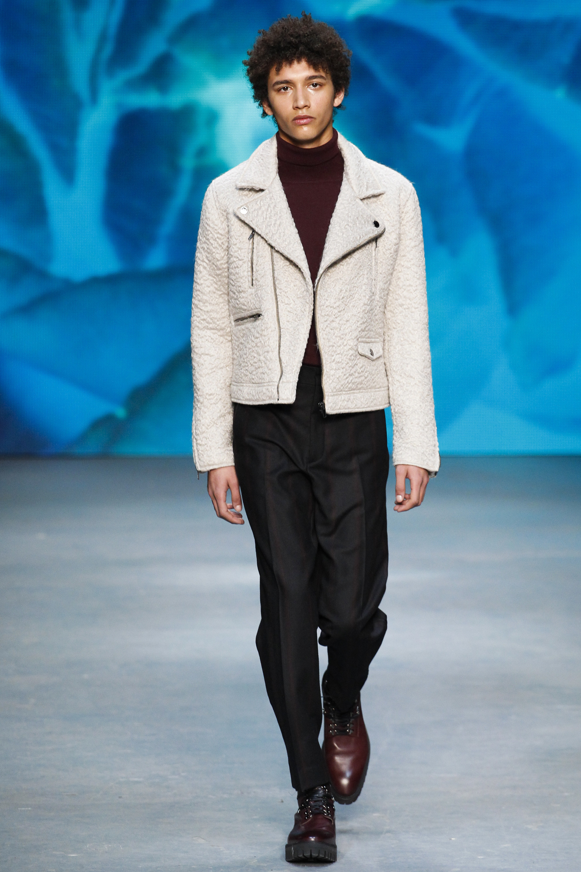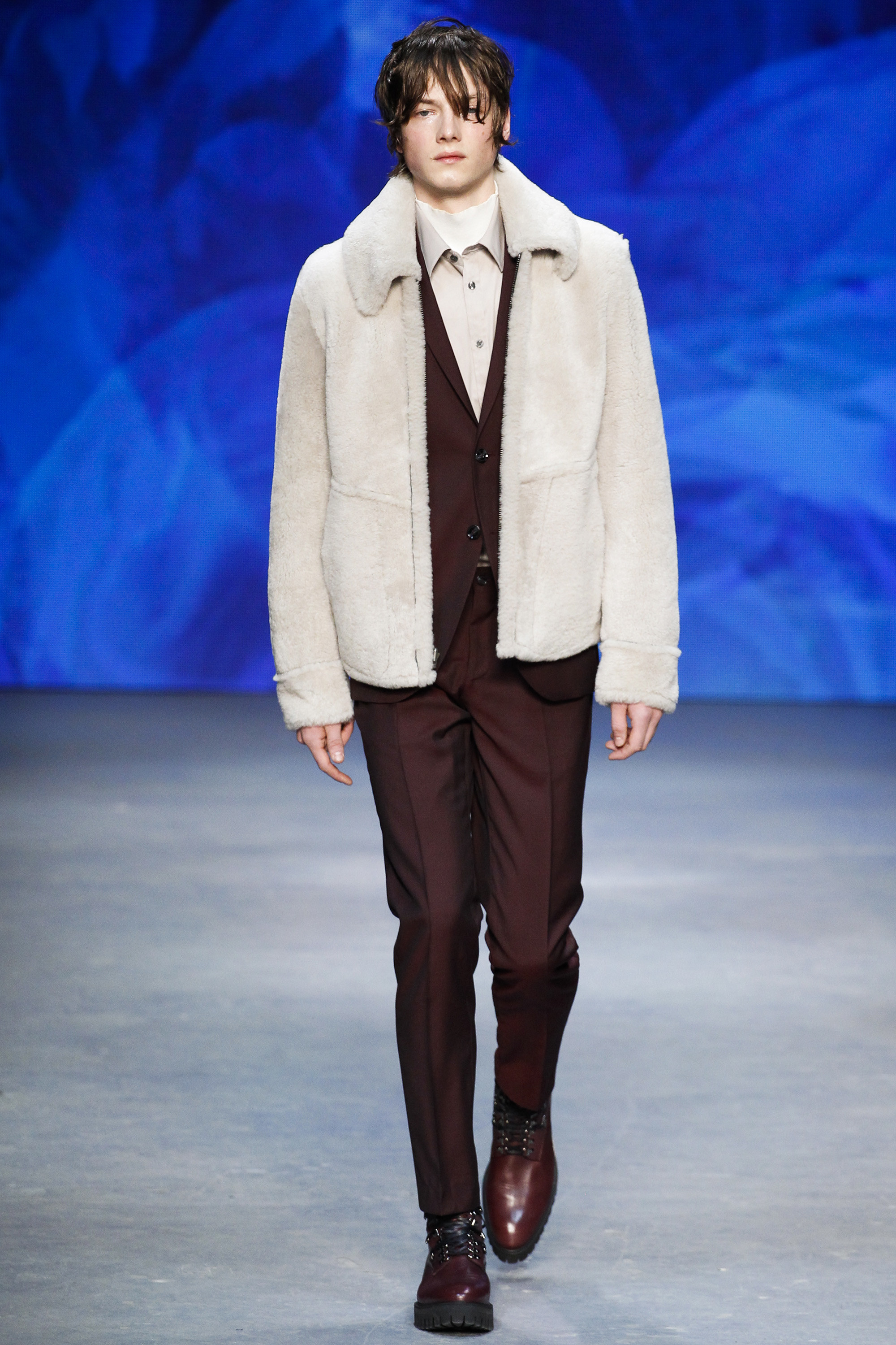 “We always look past Sweden,” said Andreas Gran (who codesigned the collection with Tiger’s head honcho, Ronnie Junior McDonald), referring to inspirations and, presumably, the international markets buying into them, “but this time, we brought it home.” Some pieces were great, like a hooded and long navy parka covered with flowery crest patches, which were derived from an equally eye-catching motorcycle jacket hand-painted by Krajcik. These patches nodded to the embroideries found on local Dalarna garb. That botanical whimsy also sprouted up as allover reliefs on suits, which, for all intents and purposes, are a T of S staple, especially so because of their attractive price points. One could see a savvy graphic designer from Uppsala wearing the aforementioned with a pair of Common Projects and a briefcase. As it were, though, when the clothes got too slick or cosmopolitan, they stumbled. A sweater that read Colourblind repeatedly could have been edited out; cropped trousers might’ve been nixed, feeling post-trend. All was righted, however, with a series of bombers near the finale, some in “teddy bear” shearling and one in a shimmering gold wolf motif, glinting like sunlight through the steam on a frosty morning. In a very pleasing way, it made this writer want to nick one from backstage, skip the rest of the shows, and go see The Revenant. Nature, nurtured.