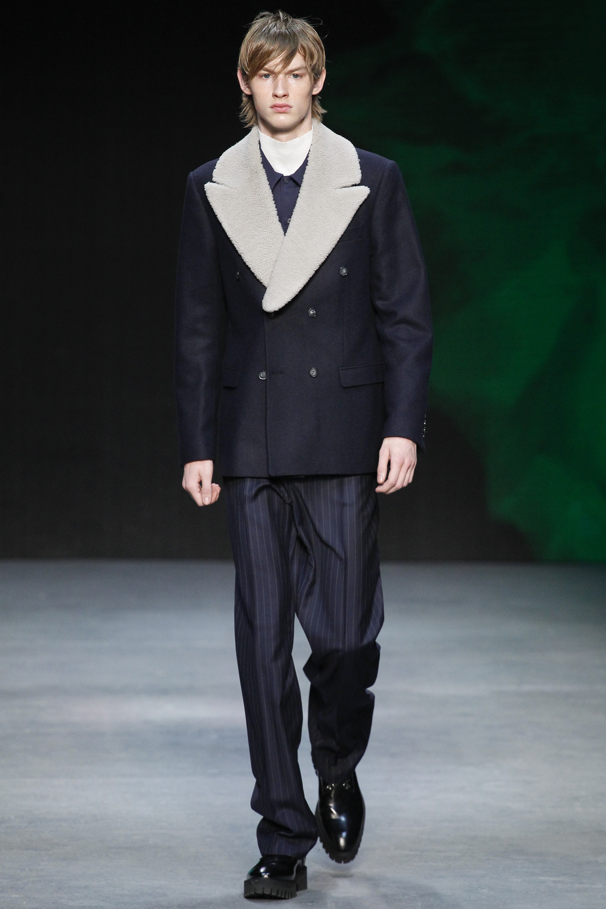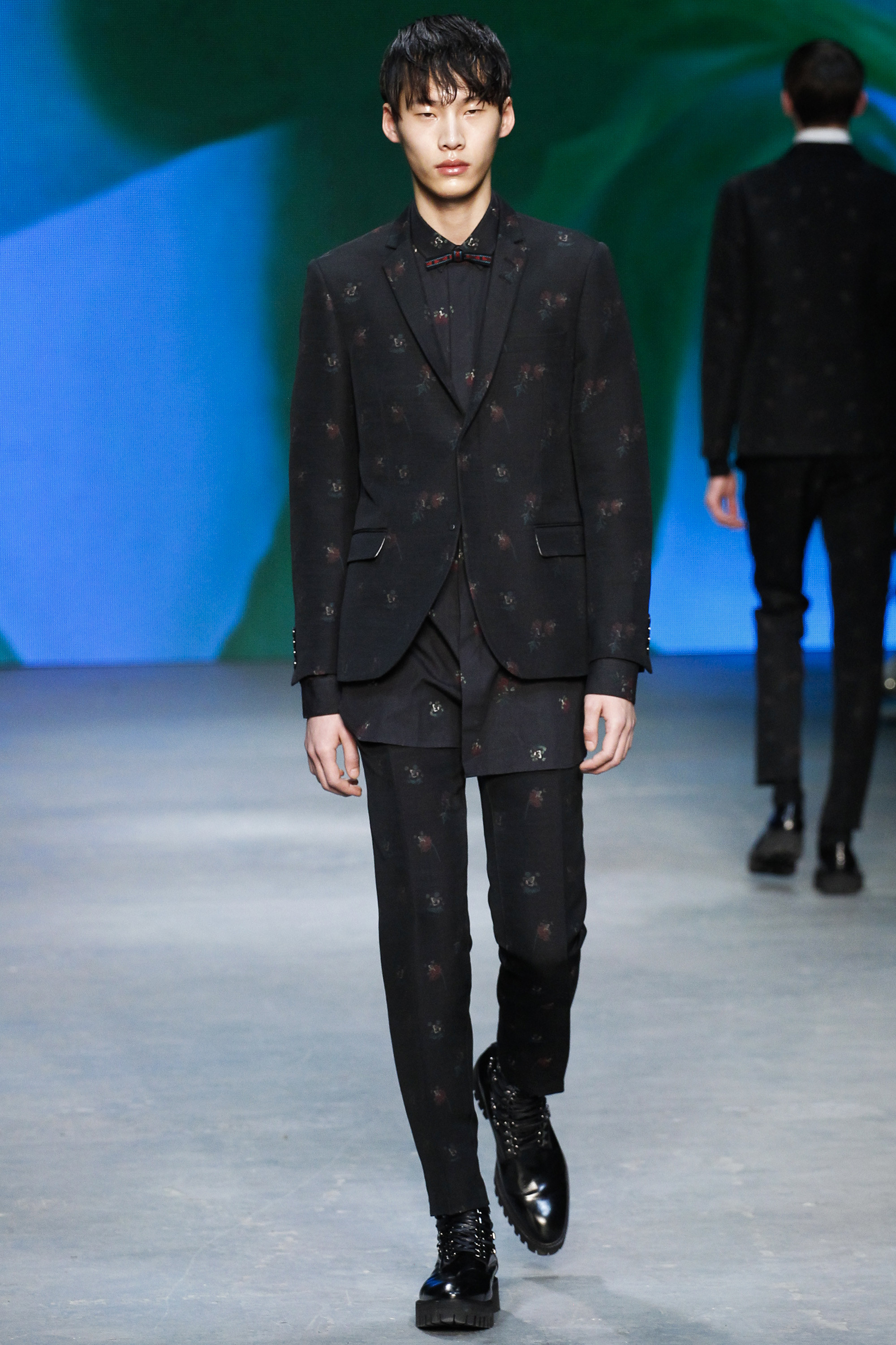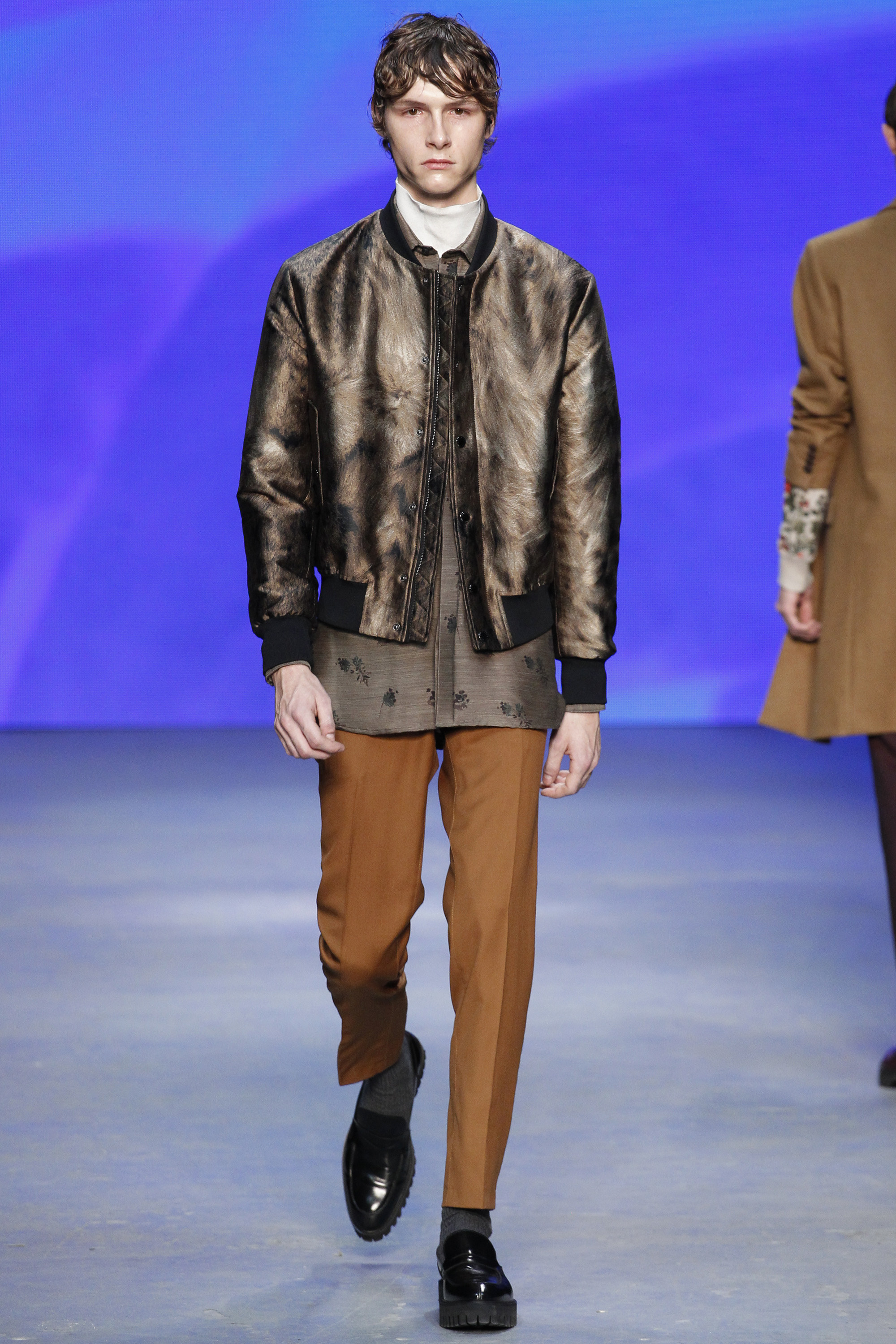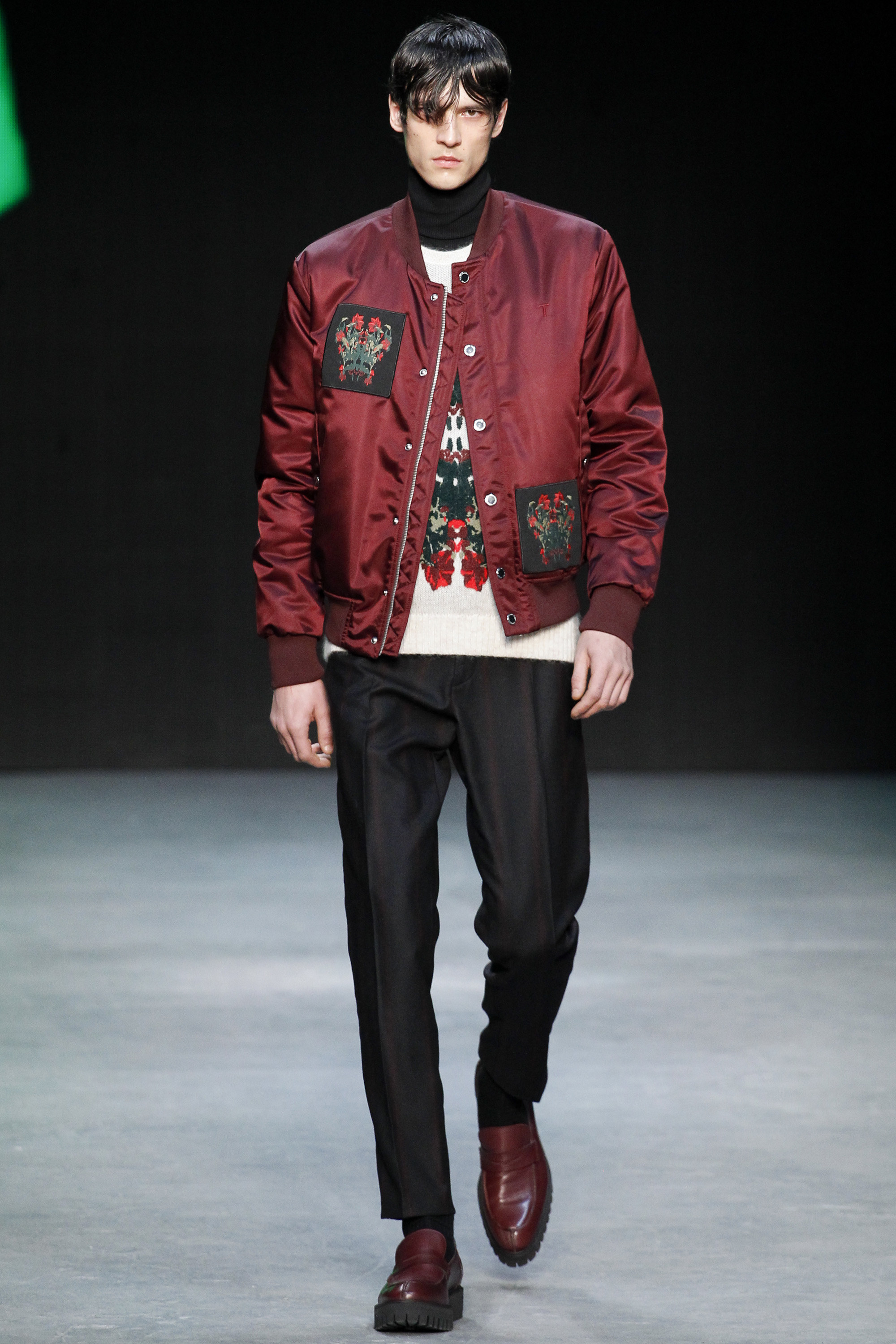 “We always look past Sweden,” said Andreas Gran (who codesigned the collection with Tiger’s head honcho, Ronnie Junior McDonald), referring to inspirations and, presumably, the international markets buying into them, “but this time, we brought it home.” Some pieces were great, like a hooded and long navy parka covered with flowery crest patches, which were derived from an equally eye-catching motorcycle jacket hand-painted by Krajcik. These patches nodded to the embroideries found on local Dalarna garb. That botanical whimsy also sprouted up as allover reliefs on suits, which, for all intents and purposes, are a T of S staple, especially so because of their attractive price points. One could see a savvy graphic designer from Uppsala wearing the aforementioned with a pair of Common Projects and a briefcase. As it were, though, when the clothes got too slick or cosmopolitan, they stumbled. A sweater that read Colourblind repeatedly could have been edited out; cropped trousers might’ve been nixed, feeling post-trend. All was righted, however, with a series of bombers near the finale, some in “teddy bear” shearling and one in a shimmering gold wolf motif, glinting like sunlight through the steam on a frosty morning. In a very pleasing way, it made this writer want to nick one from backstage, skip the rest of the shows, and go see The Revenant. Nature, nurtured.