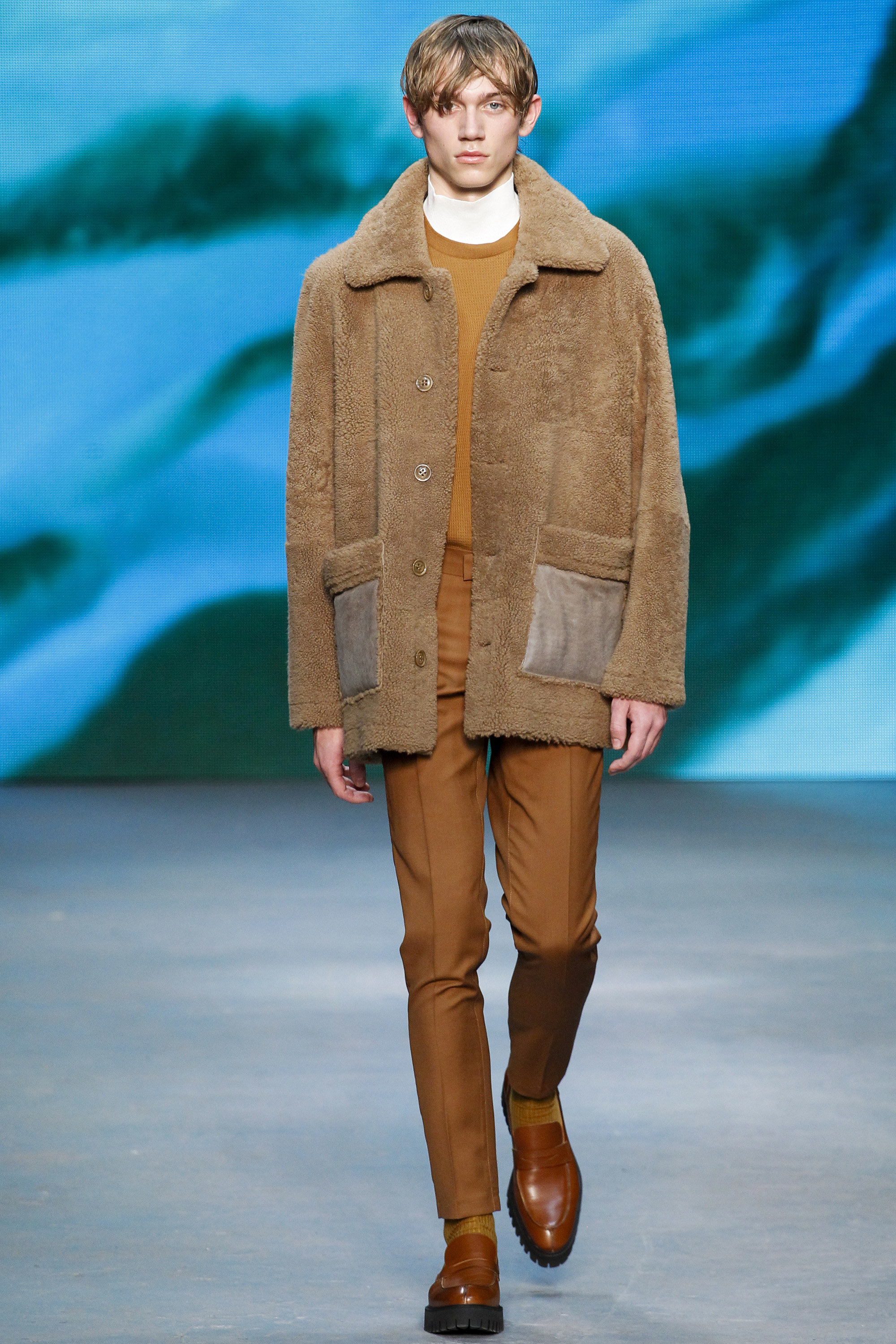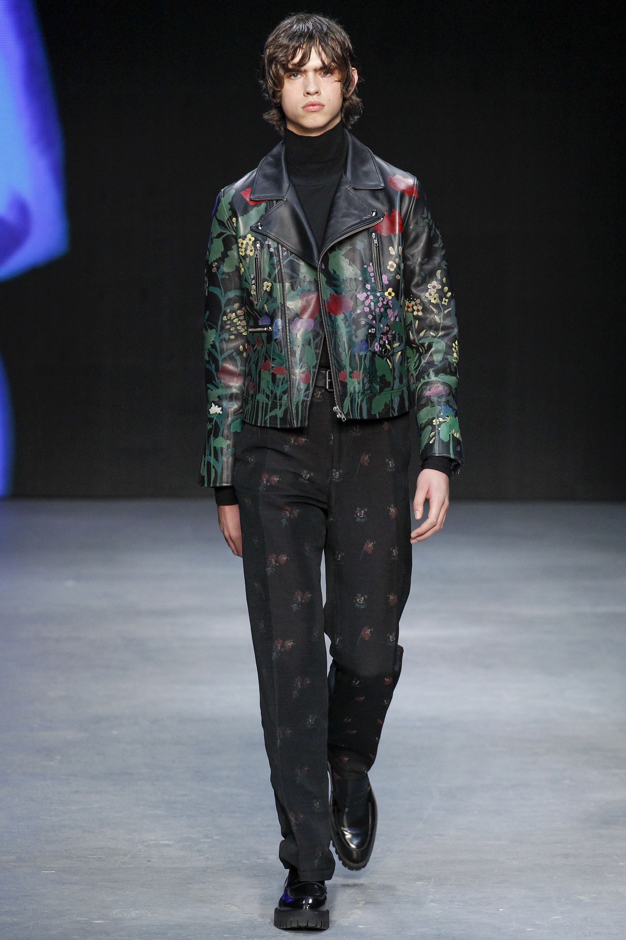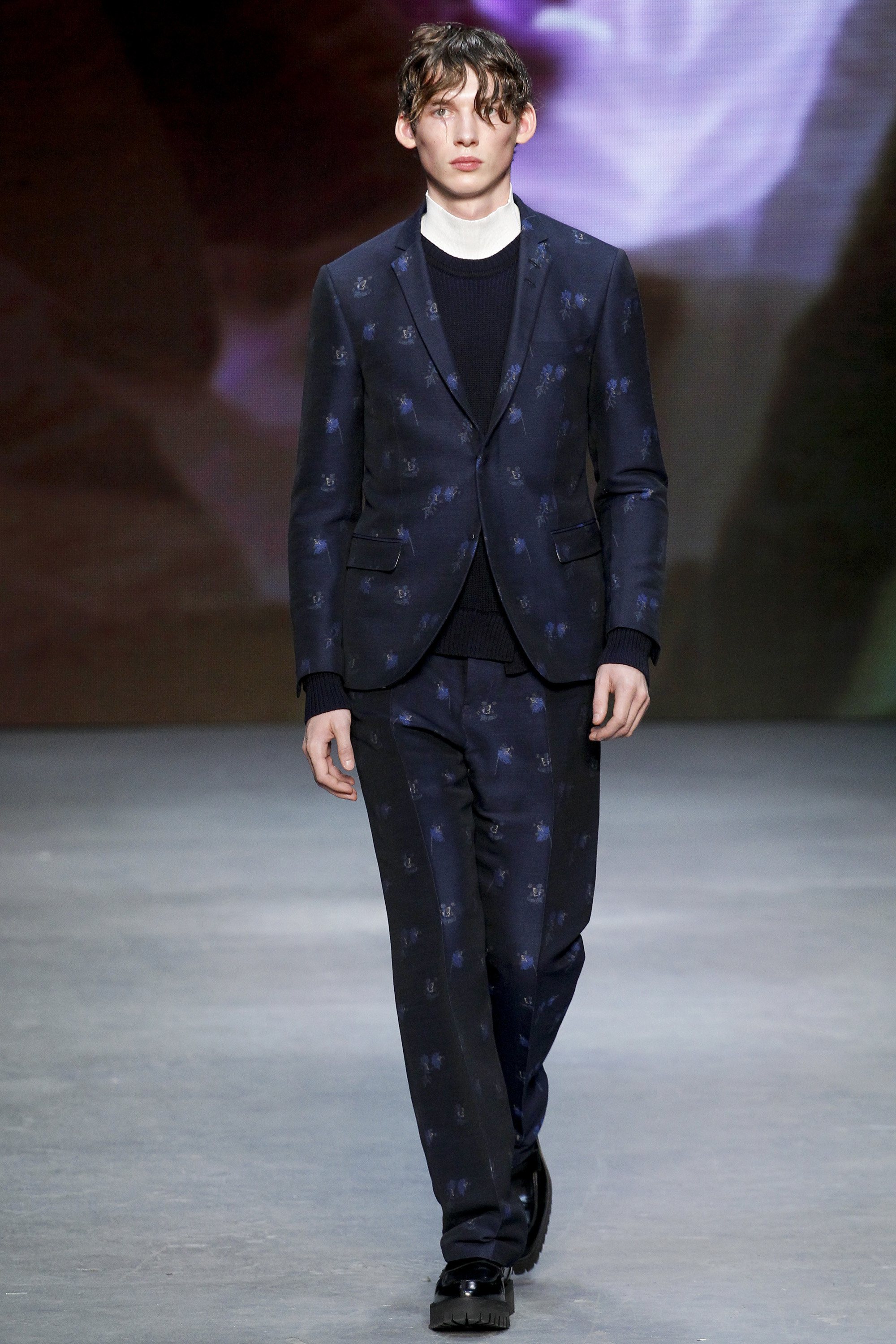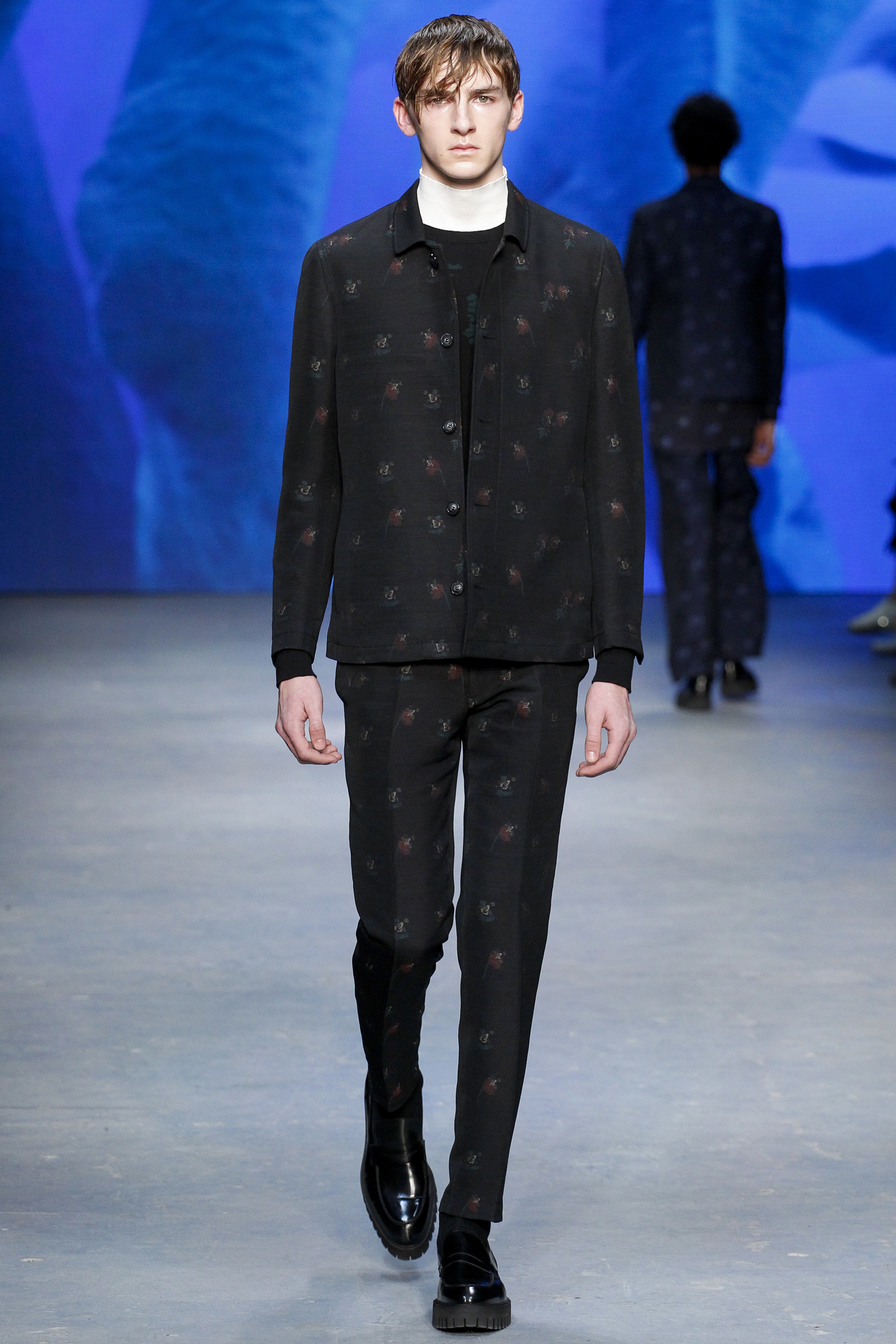 Tiger of Sweden’s Fall show notes told of Dalarna, the Swedish landskap steeped in artistic legacy and frequented by Stockholm or Gothenburg city dwellers seeking a little R&R (a bit like New York’s Hudson Valley, perhaps). What followed was a lineup retaining its urban-young-professional, trend-friendly roster—there were more than a few pairs of big-ankled and swishing trousers, an unavoidable thing in menswear right now—but infused with a notably bucolic Scandinavian reverb, from lupine prints to floral motifs created in collaboration with the Swedish artist Jakob Krajcik. The Tiger, roaming north.