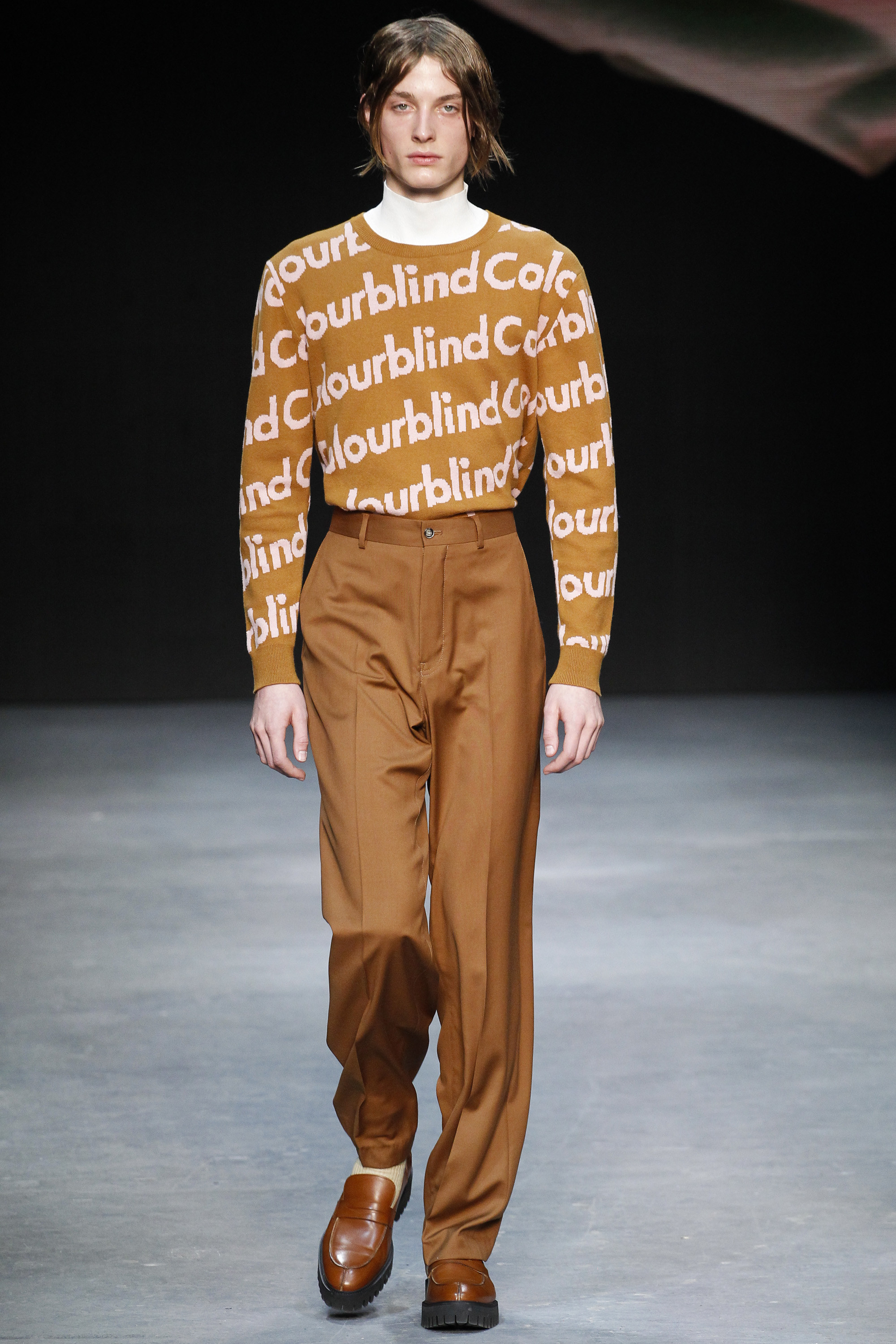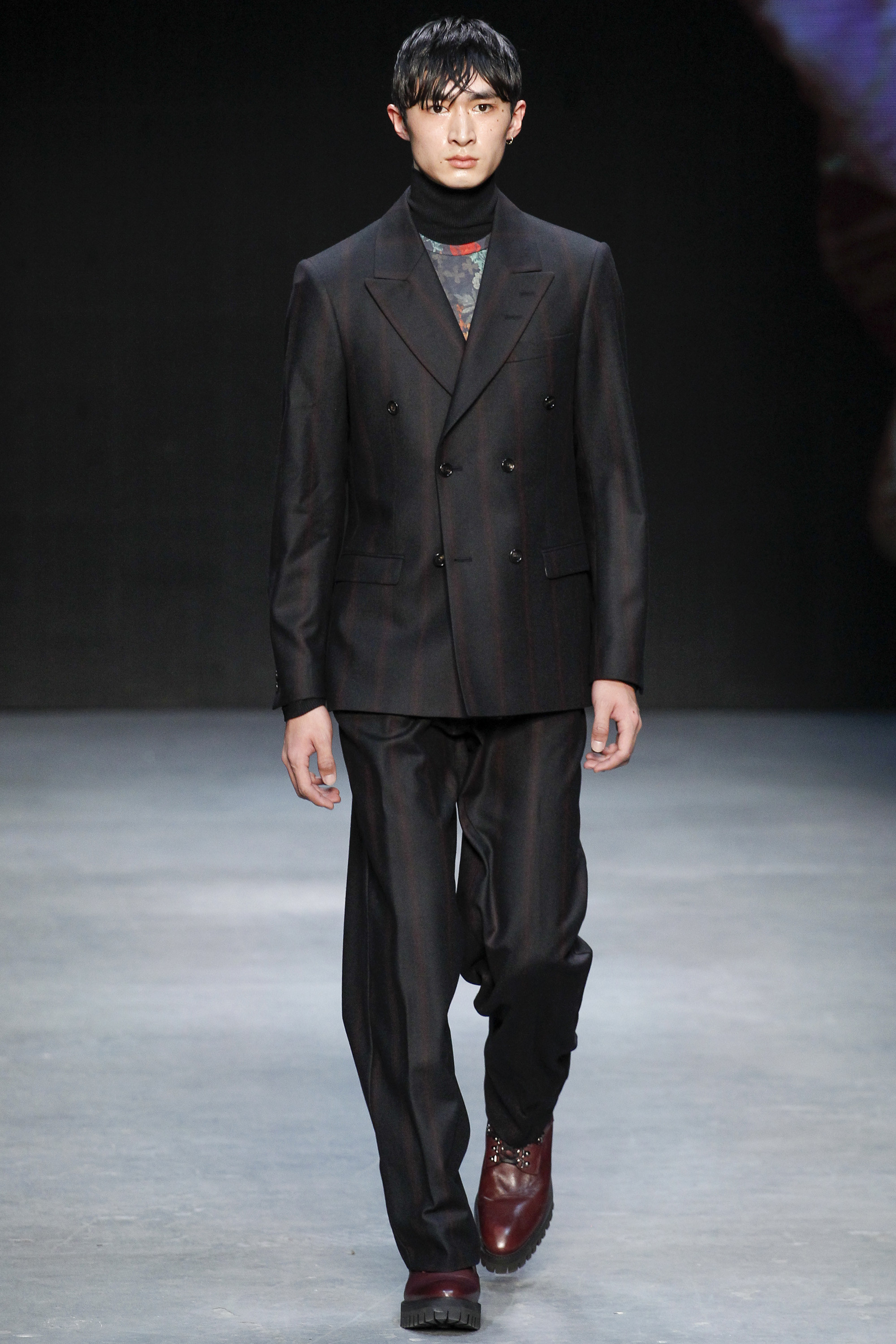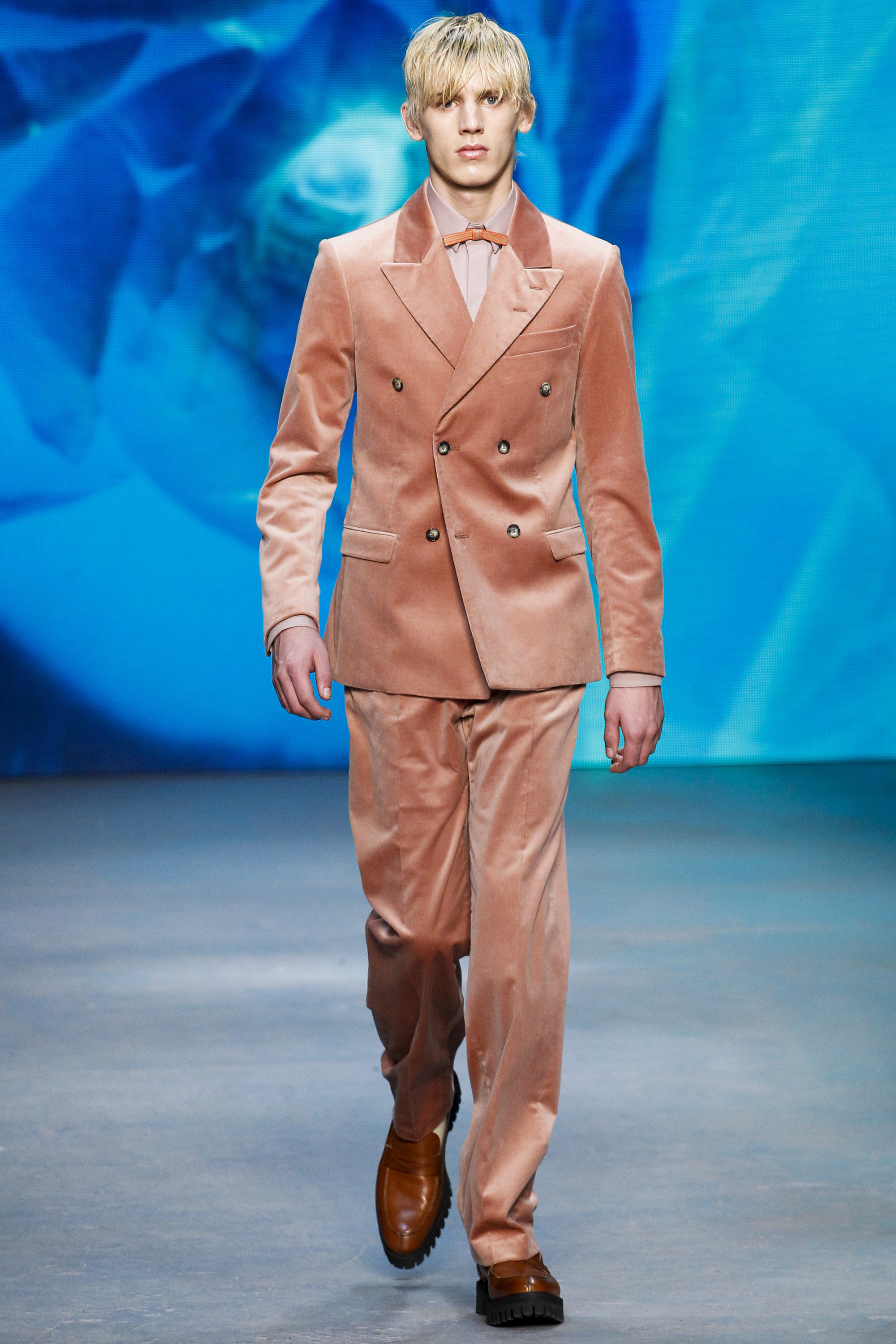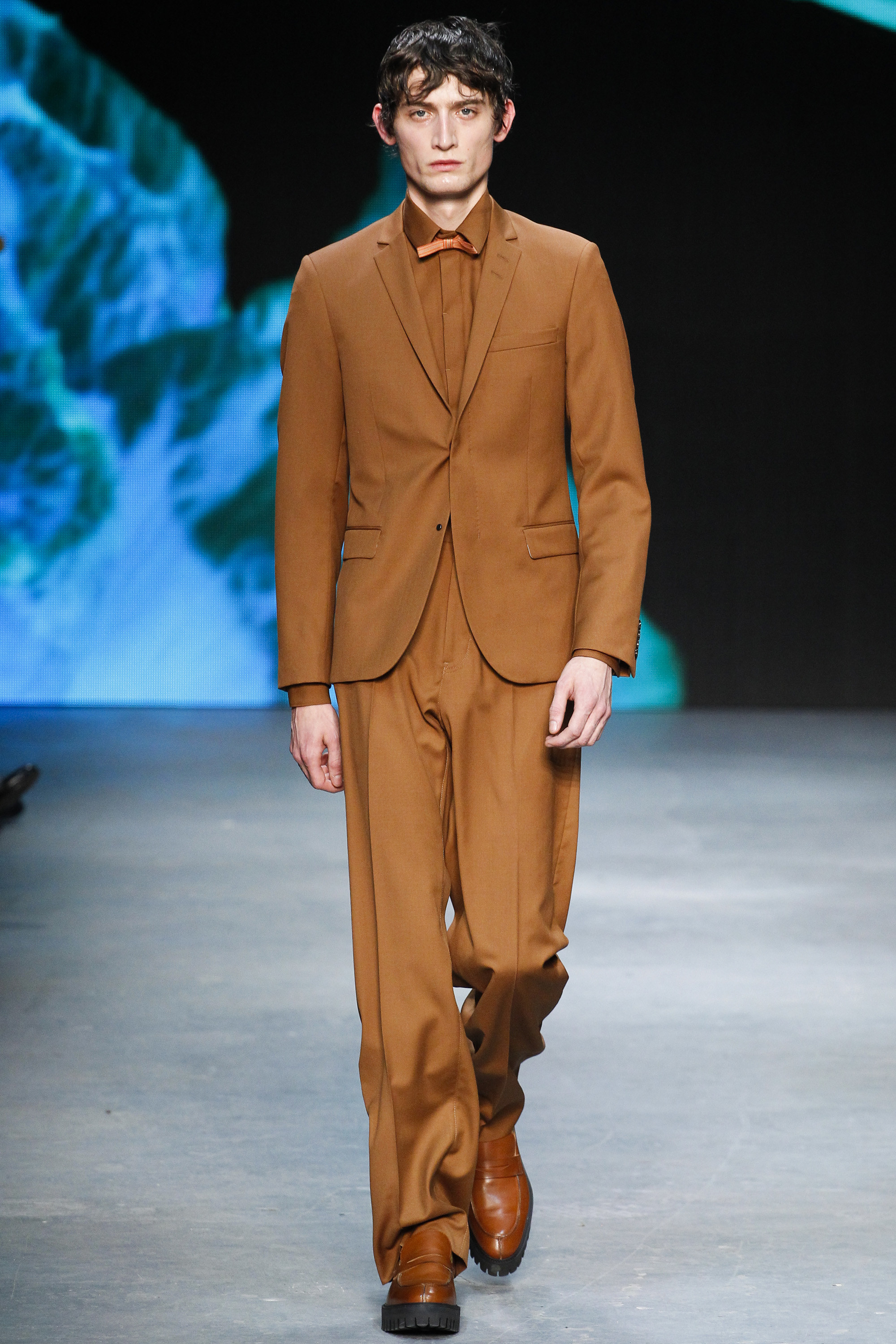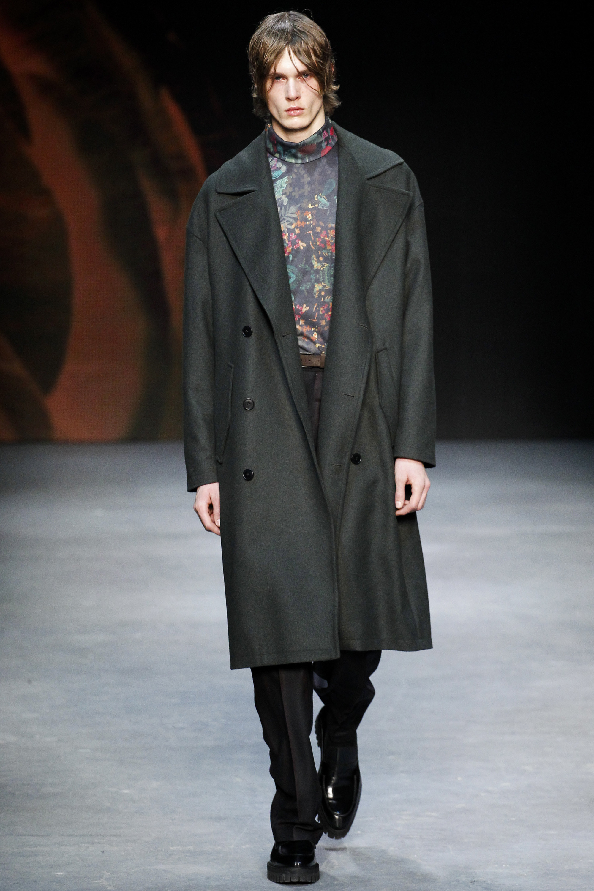 Tiger of Sweden’s Fall show notes told of Dalarna, the Swedish landskap steeped in artistic legacy and frequented by Stockholm or Gothenburg city dwellers seeking a little R&R (a bit like New York’s Hudson Valley, perhaps). What followed was a lineup retaining its urban-young-professional, trend-friendly roster—there were more than a few pairs of big-ankled and swishing trousers, an unavoidable thing in menswear right now—but infused with a notably bucolic Scandinavian reverb, from lupine prints to floral motifs created in collaboration with the Swedish artist Jakob Krajcik. The Tiger, roaming north.