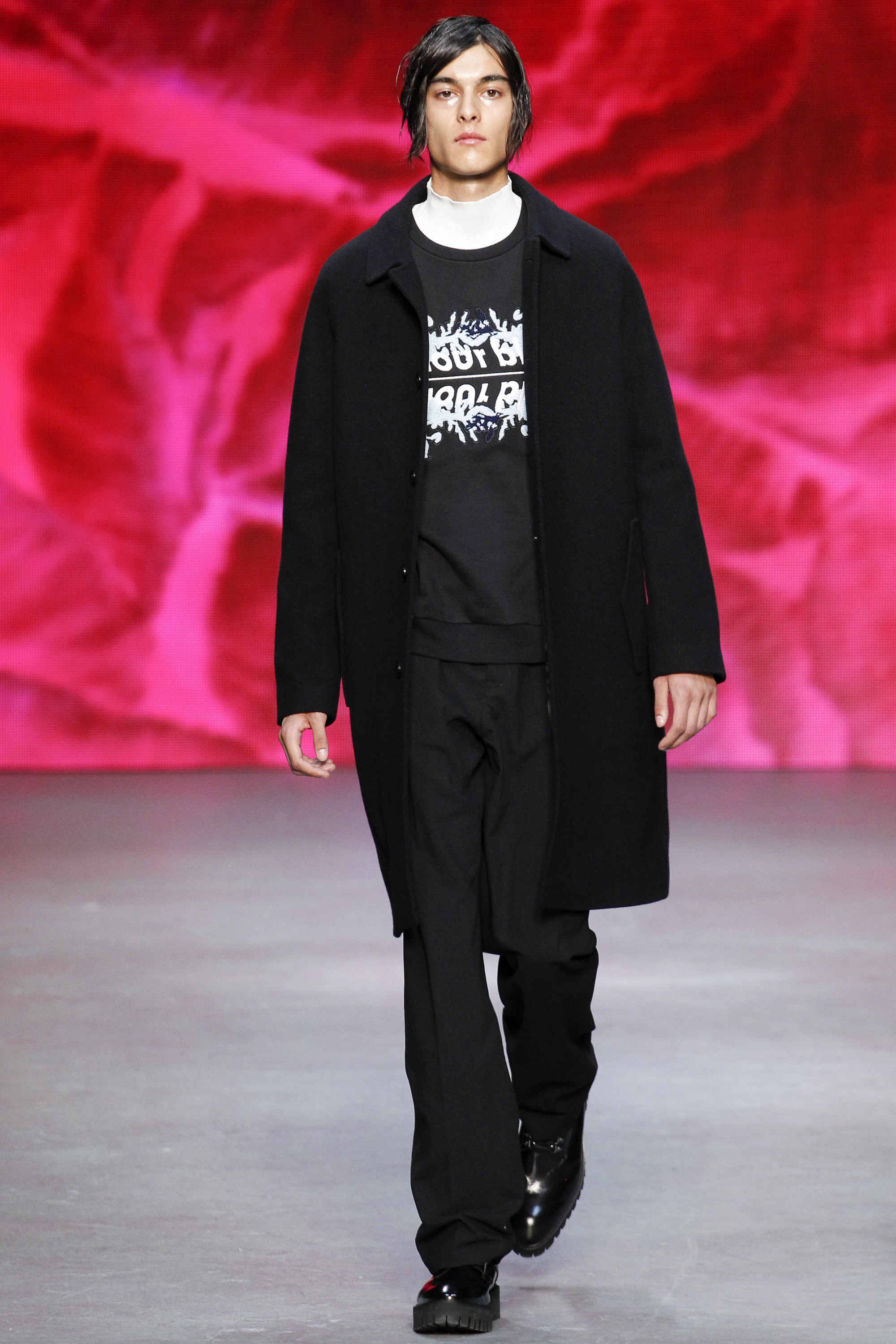 “We always look past Sweden,” said Andreas Gran (who codesigned the collection with Tiger’s head honcho, Ronnie Junior McDonald), referring to inspirations and, presumably, the international markets buying into them, “but this time, we brought it home.” Some pieces were great, like a hooded and long navy parka covered with flowery crest patches, which were derived from an equally eye-catching motorcycle jacket hand-painted by Krajcik. These patches nodded to the embroideries found on local Dalarna garb. That botanical whimsy also sprouted up as allover reliefs on suits, which, for all intents and purposes, are a T of S staple, especially so because of their attractive price points. One could see a savvy graphic designer from Uppsala wearing the aforementioned with a pair of Common Projects and a briefcase. As it were, though, when the clothes got too slick or cosmopolitan, they stumbled. A sweater that read Colourblind repeatedly could have been edited out; cropped trousers might’ve been nixed, feeling post-trend. All was righted, however, with a series of bombers near the finale, some in “teddy bear” shearling and one in a shimmering gold wolf motif, glinting like sunlight through the steam on a frosty morning. In a very pleasing way, it made this writer want to nick one from backstage, skip the rest of the shows, and go see The Revenant. Nature, nurtured.