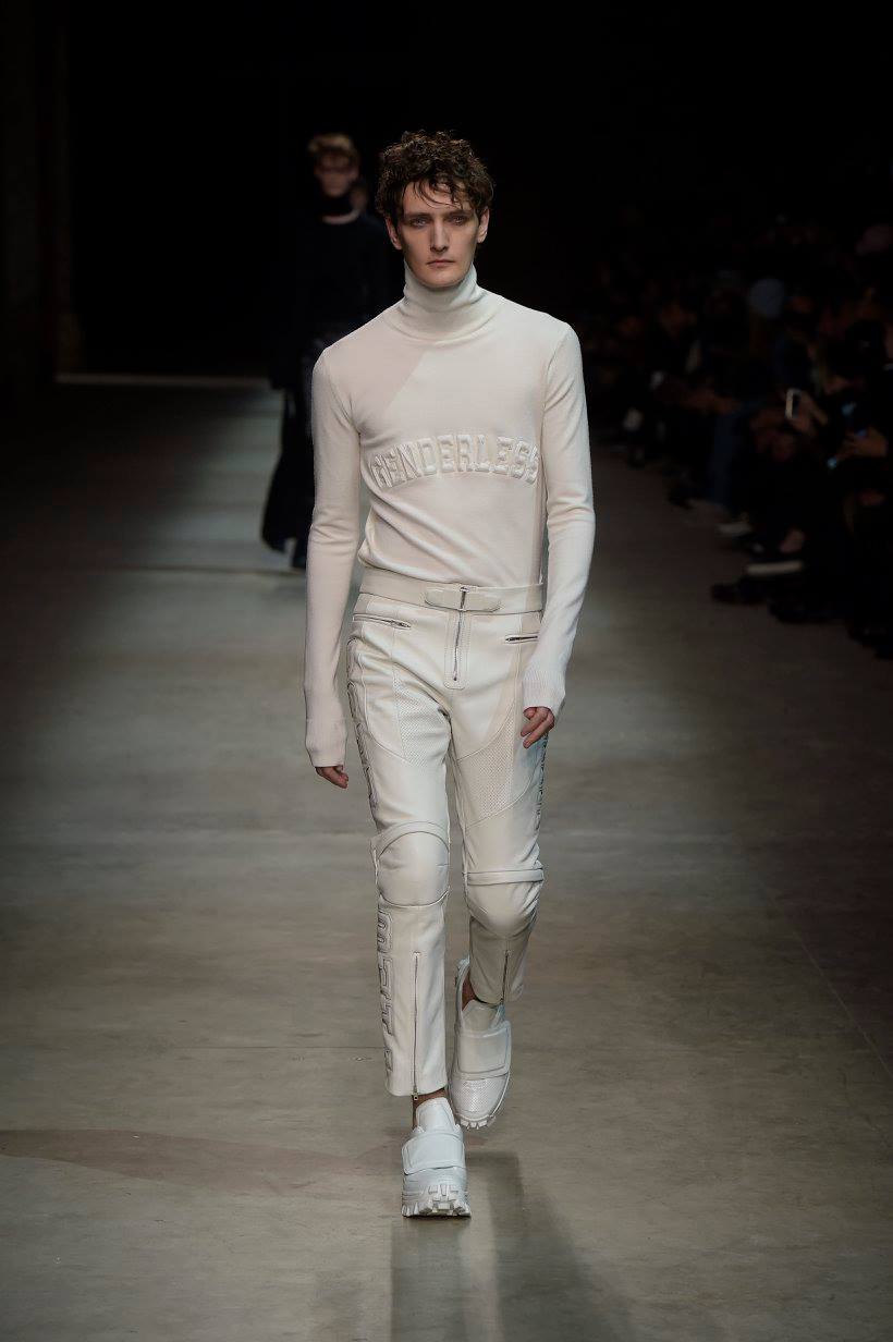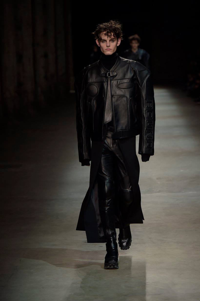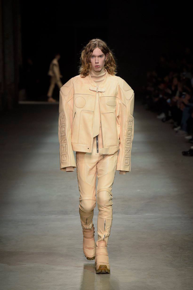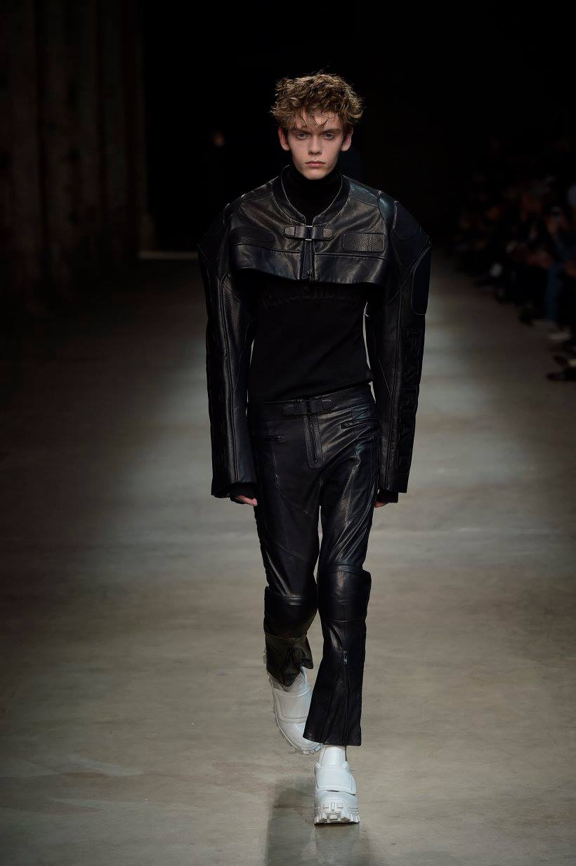 Cropped leather tops harkening back at football’s protective gear and padded numbers, including sleeveless biker jackets and matching pants, infused the dynamic lineup with an imminent sense of battle, while almost every item came with a concise, one-word message printed or embossed on the fabric. “Genderless,” “boundary-less” and “paradigm-less,” they proclaimed in Twitter-friendly fashion.