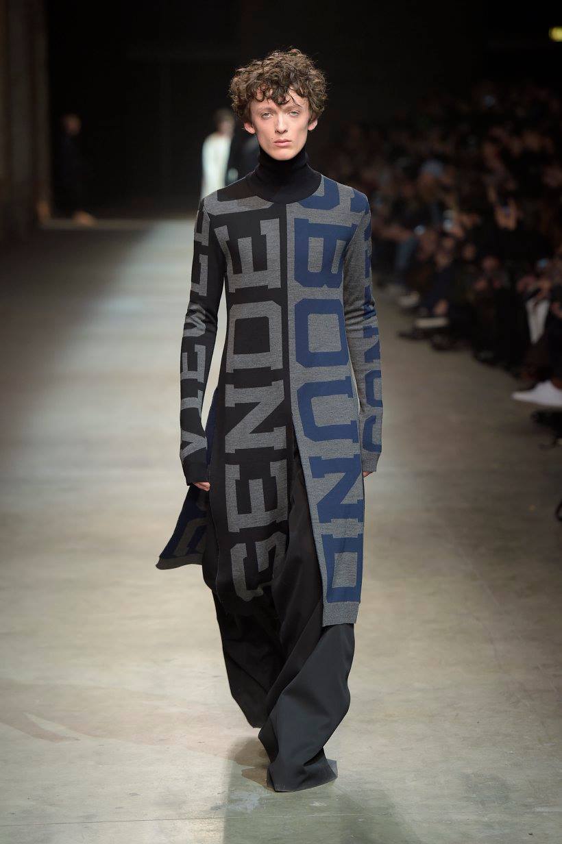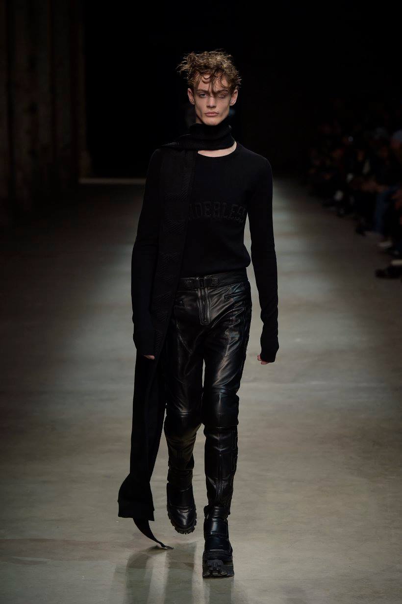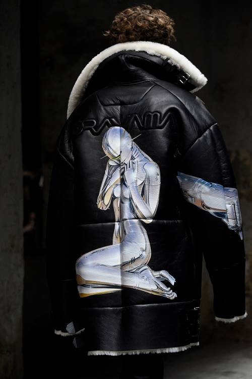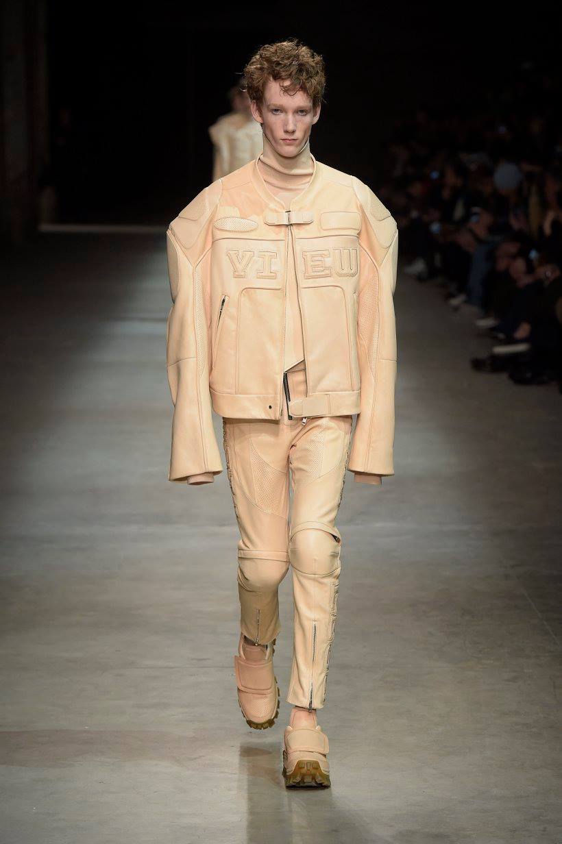 Cropped leather tops harkening back at football’s protective gear and padded numbers, including sleeveless biker jackets and matching pants, infused the dynamic lineup with an imminent sense of battle, while almost every item came with a concise, one-word message printed or embossed on the fabric. “Genderless,” “boundary-less” and “paradigm-less,” they proclaimed in Twitter-friendly fashion.