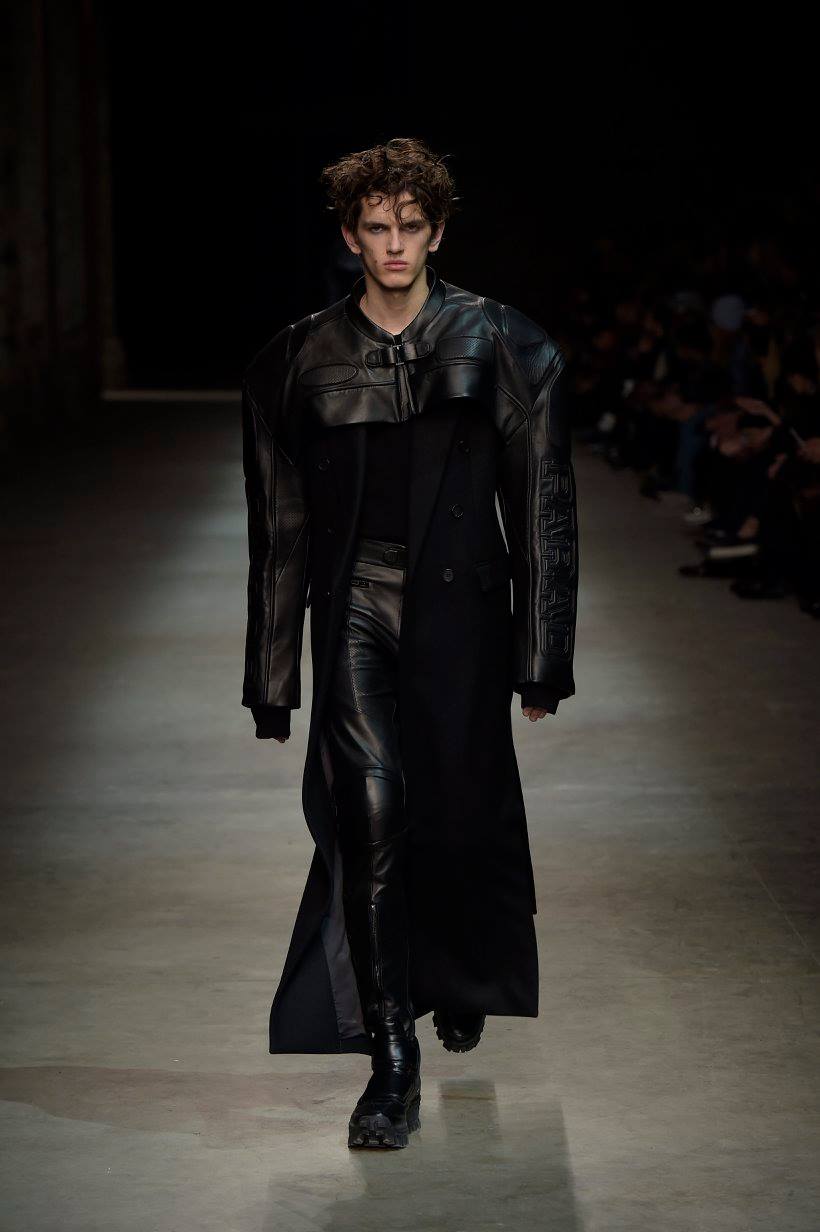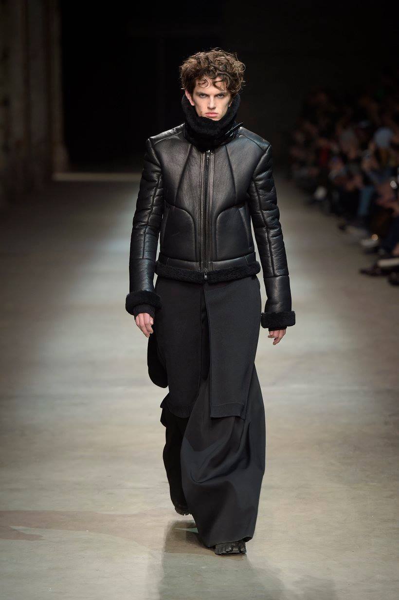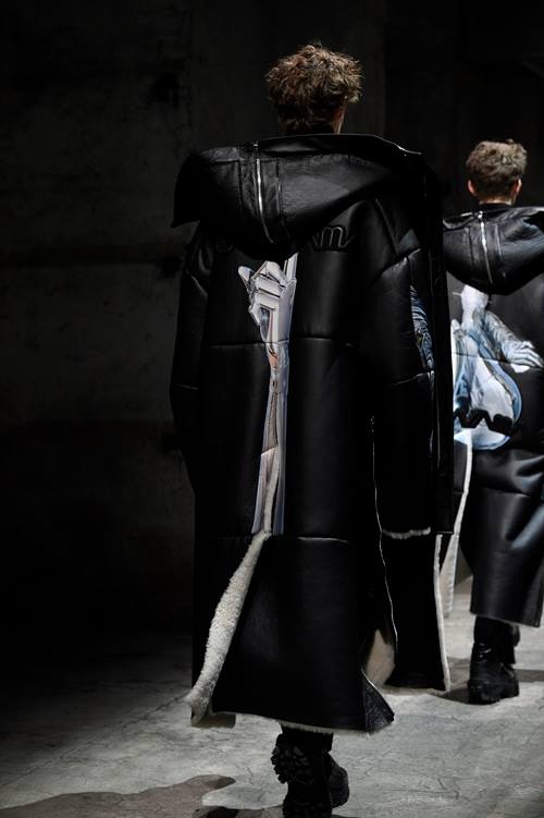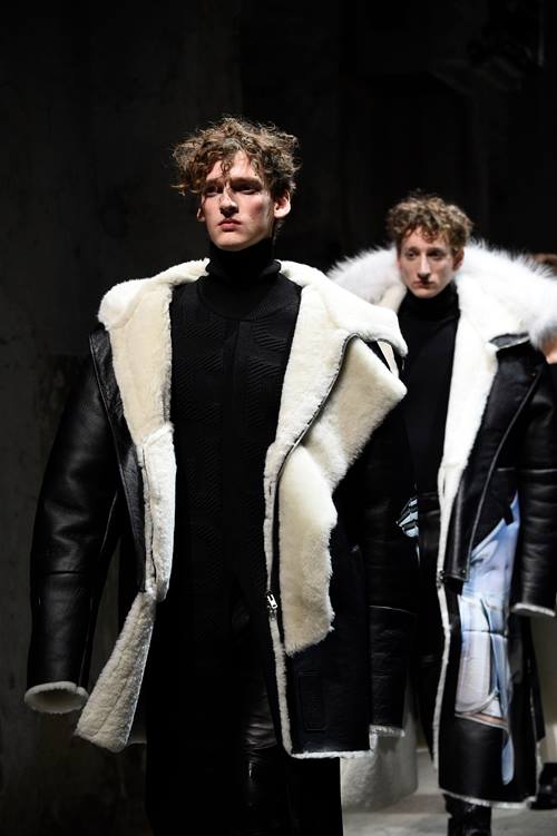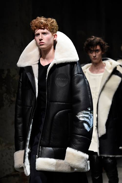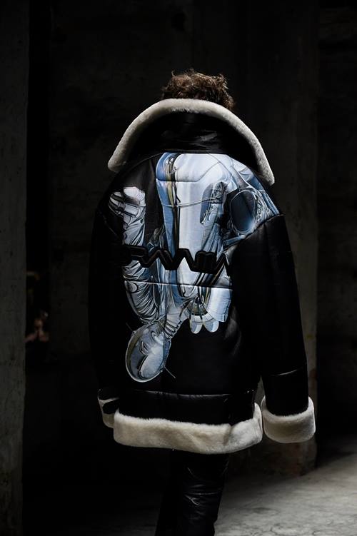 Pitti Uomo guest designer Juun.J gave his spirited fall collection a futuristic spin, sending out a gang of daredevils clad in embossed, heavy leather, felted wool and lots of shearling rendered in his signature pumped-up volumes.