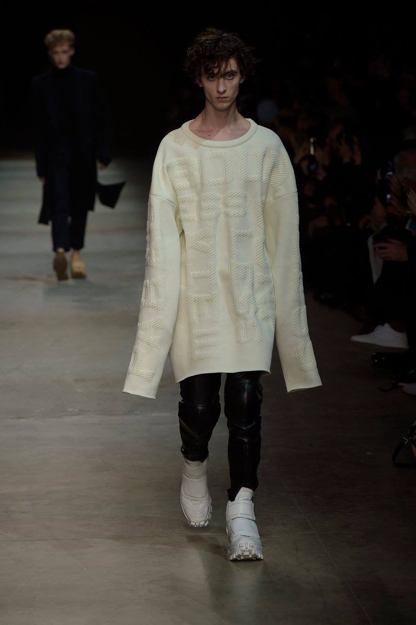 Cropped leather tops harkening back at football’s protective gear and padded numbers, including sleeveless biker jackets and matching pants, infused the dynamic lineup with an imminent sense of battle, while almost every item came with a concise, one-word message printed or embossed on the fabric. “Genderless,” “boundary-less” and “paradigm-less,” they proclaimed in Twitter-friendly fashion.