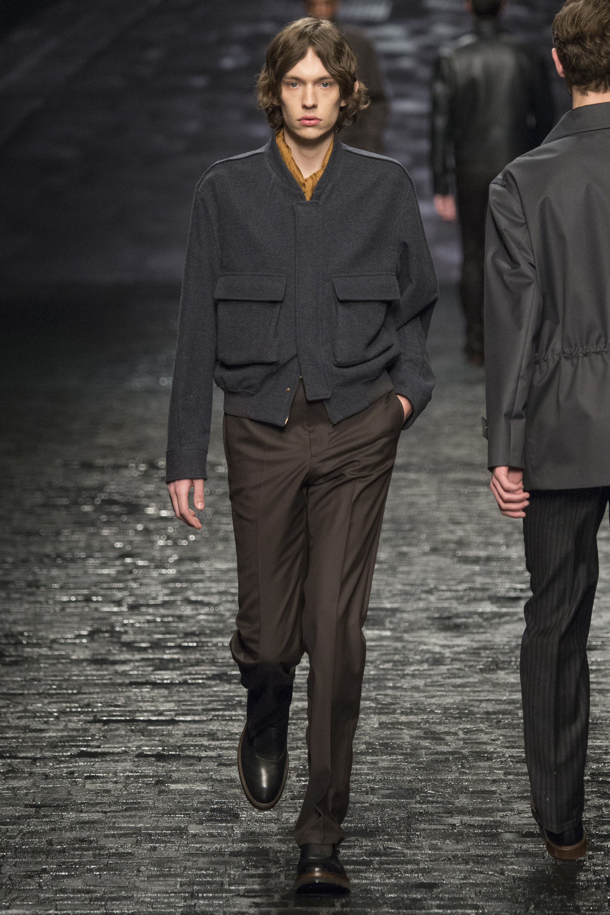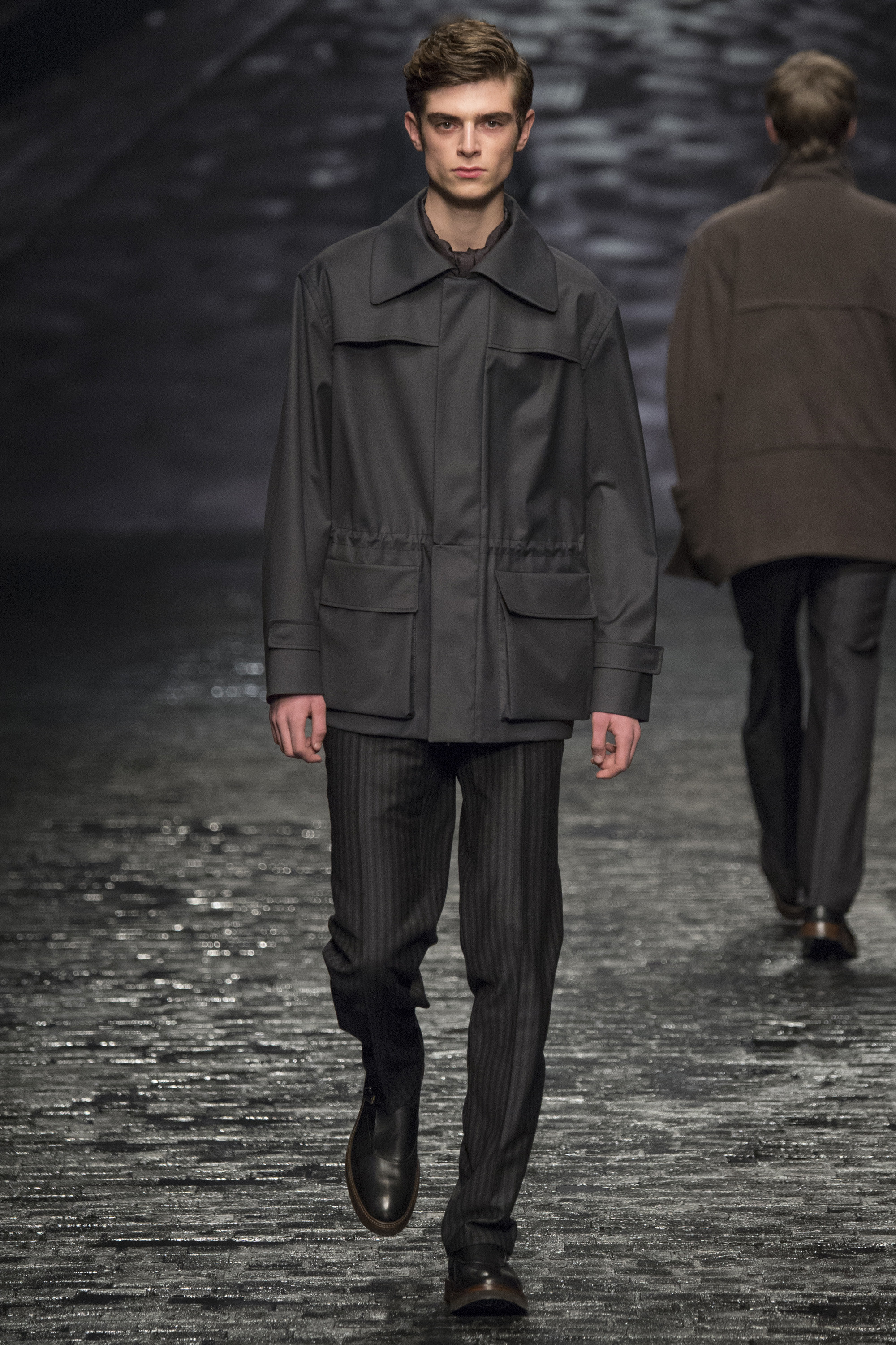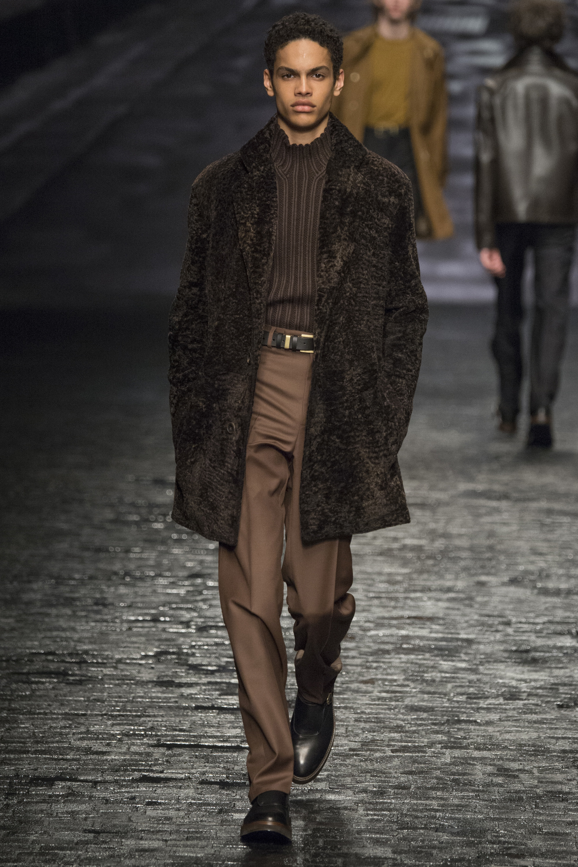 The tailoring referenced ’40s proportions: Shoulders were slightly oversize; trousers were high-waisted and fluid in post-WW2 fashion. Yet the inspiration was handled lightly and was not literal, which was testament to the effort of keeping Corneliani firmly in the modern arena—even if its classic Italian tailoring pedigree was on full display. Impeccable execution and painstaking attention to detail were obviously paramount, as was the use of luxe textured fabrics, which gave substance to linear mid-length car coats, one of the collection’s highlights. Suiting was of the slim-cut variety, yet with a touch of soft, rounded ease; sporty elements conveyed the comfort factor for nylon parkas and trenches. The dark, retro palette added to the romantic atmosphere; it was interpreted in a contemporary, classy way.
