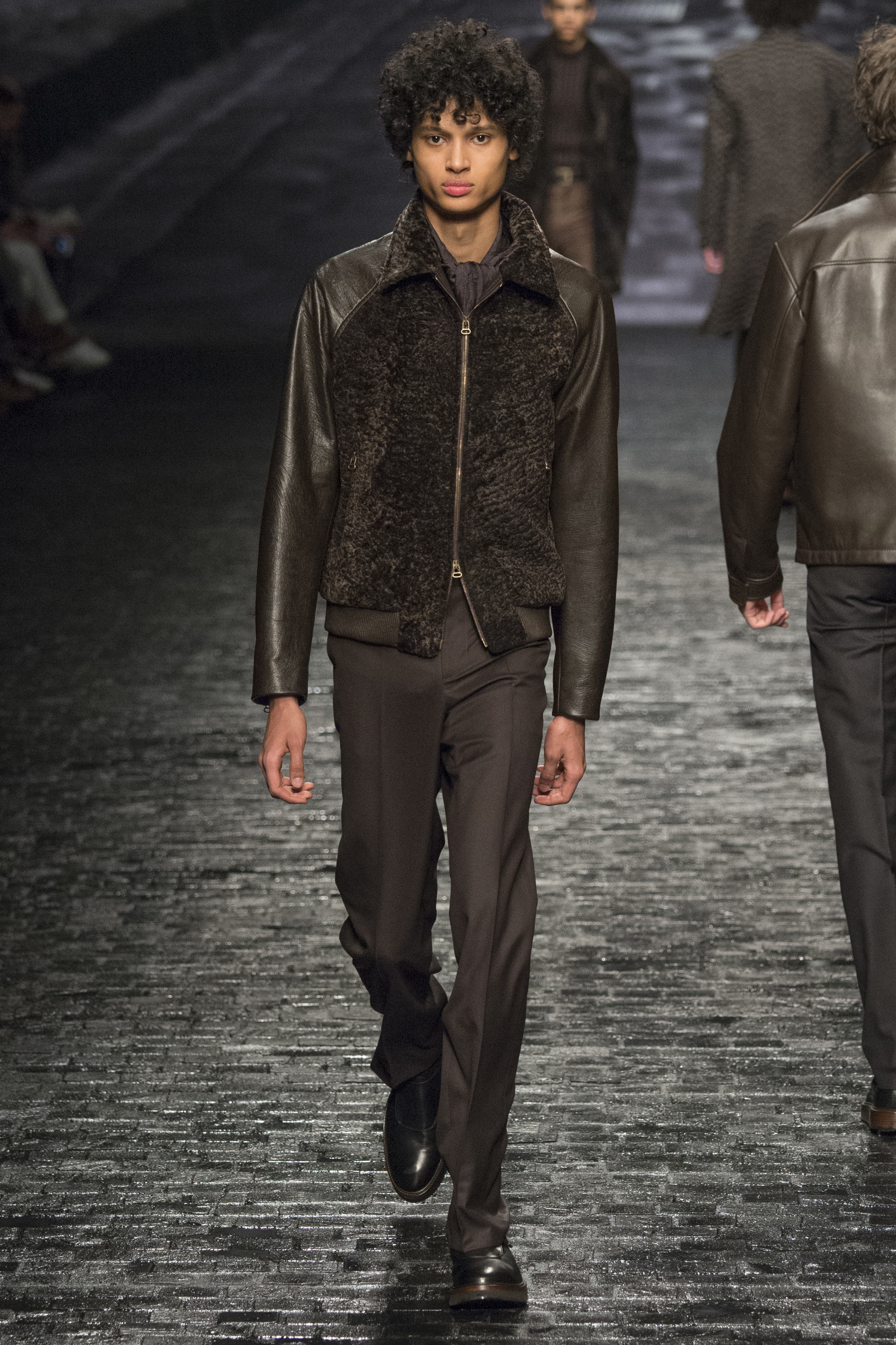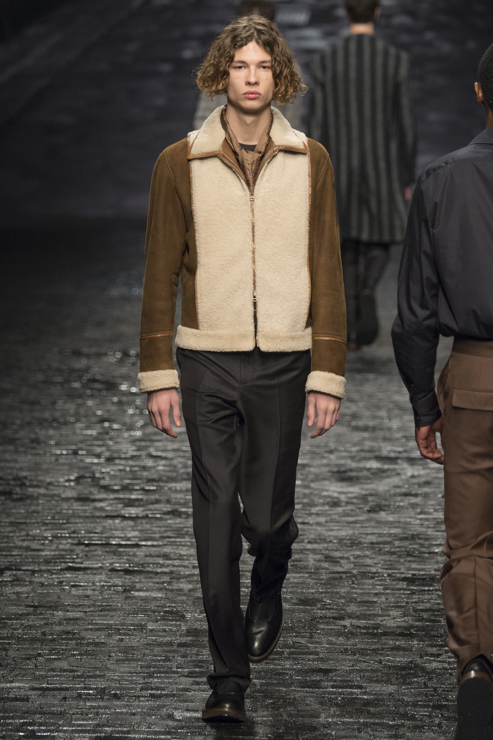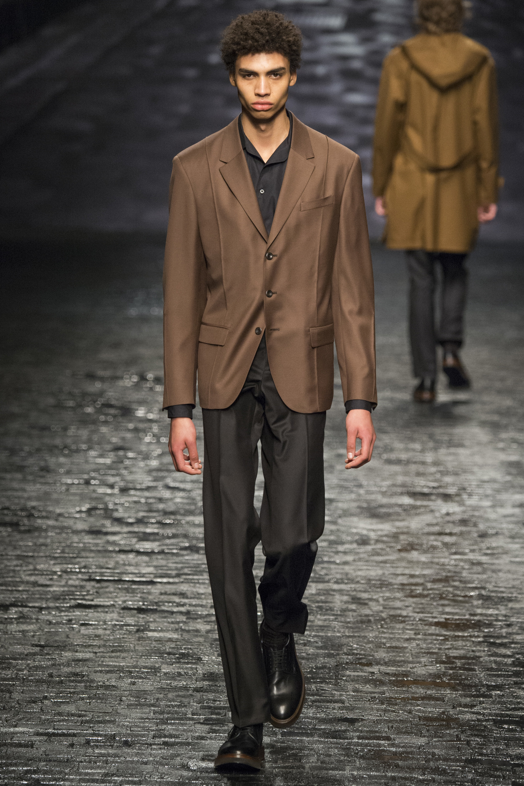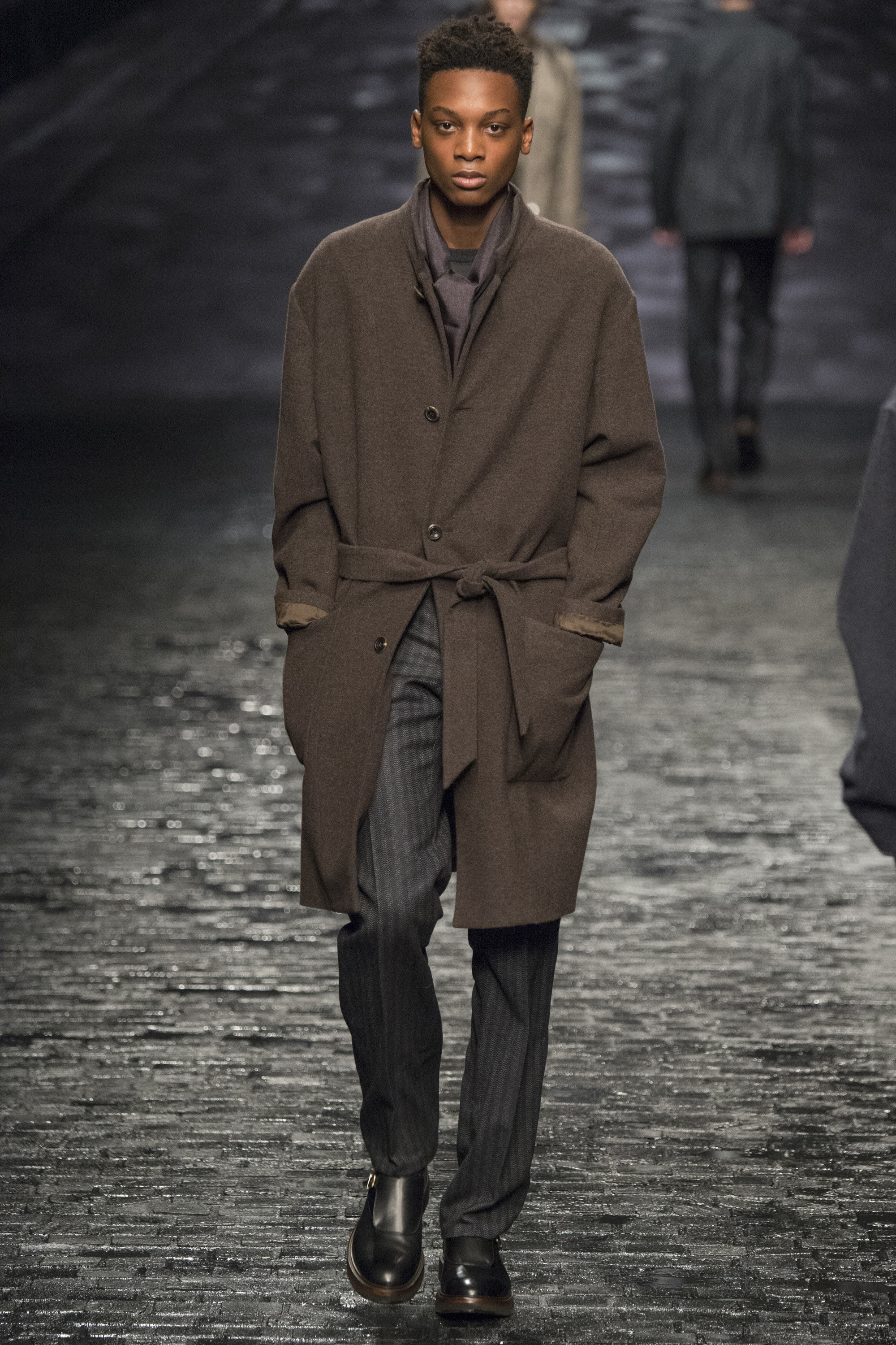 The tailoring referenced ’40s proportions: Shoulders were slightly oversize; trousers were high-waisted and fluid in post-WW2 fashion. Yet the inspiration was handled lightly and was not literal, which was testament to the effort of keeping Corneliani firmly in the modern arena—even if its classic Italian tailoring pedigree was on full display. Impeccable execution and painstaking attention to detail were obviously paramount, as was the use of luxe textured fabrics, which gave substance to linear mid-length car coats, one of the collection’s highlights. Suiting was of the slim-cut variety, yet with a touch of soft, rounded ease; sporty elements conveyed the comfort factor for nylon parkas and trenches. The dark, retro palette added to the romantic atmosphere; it was interpreted in a contemporary, classy way.