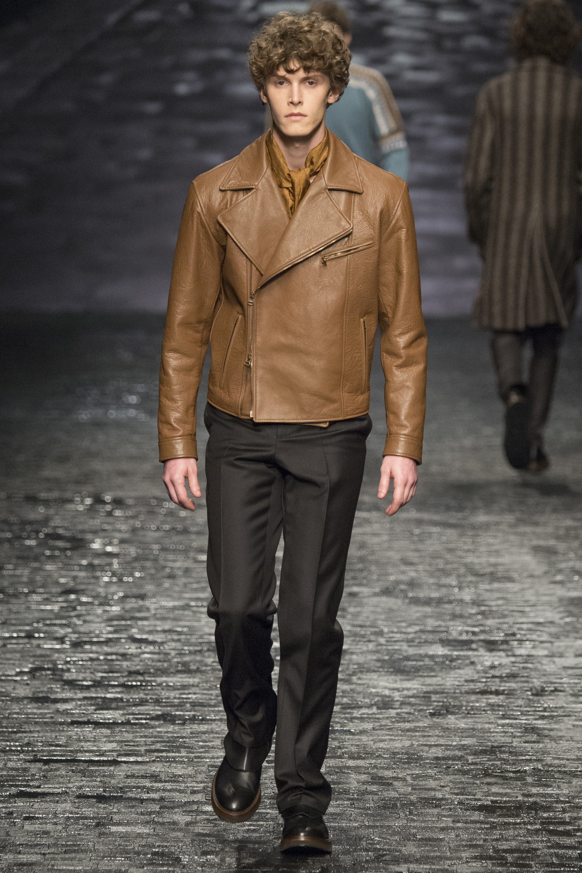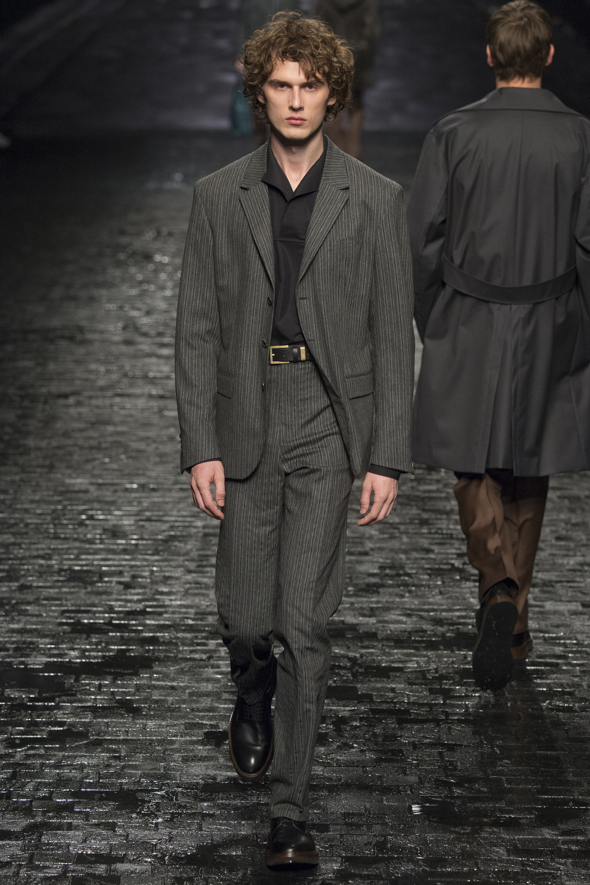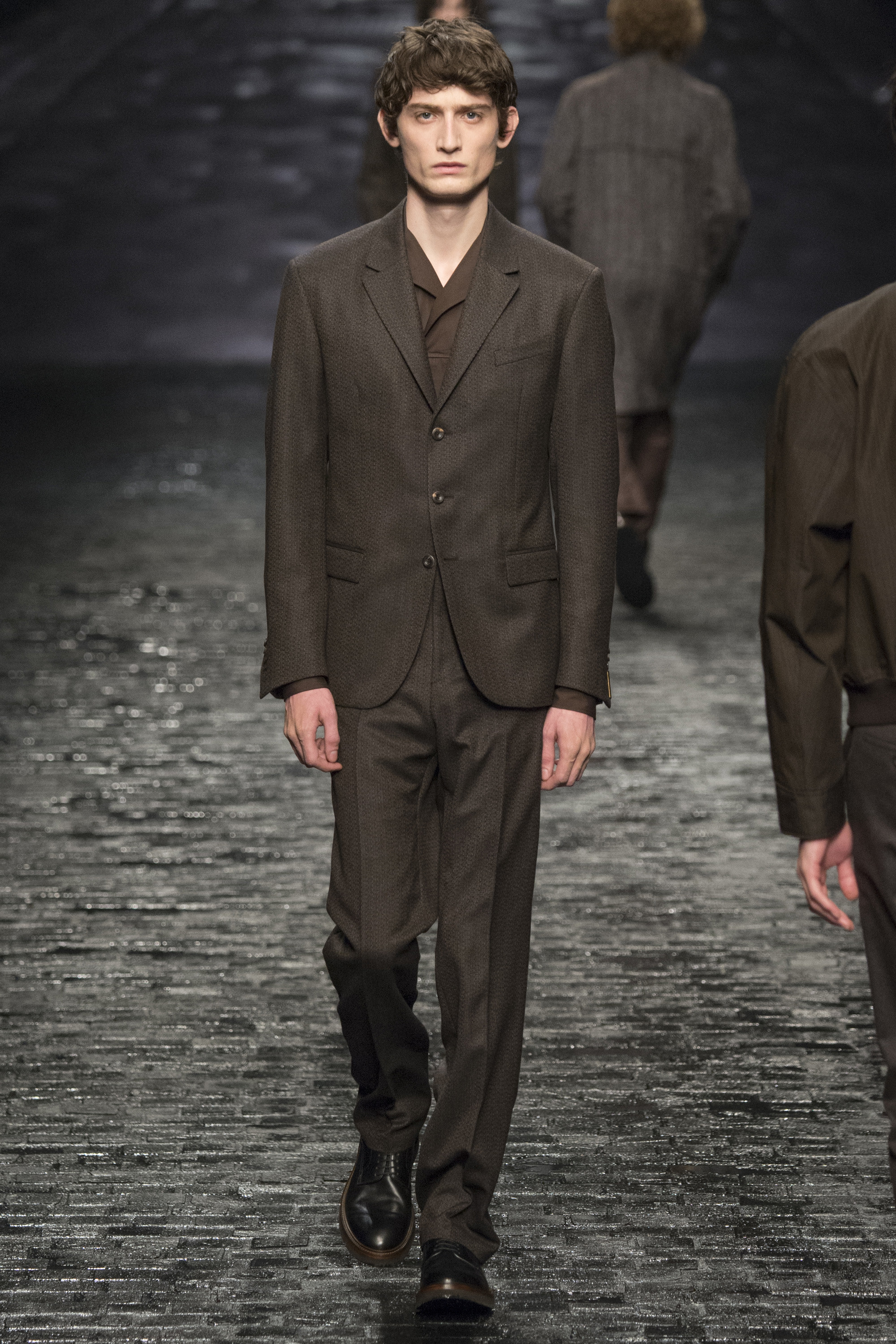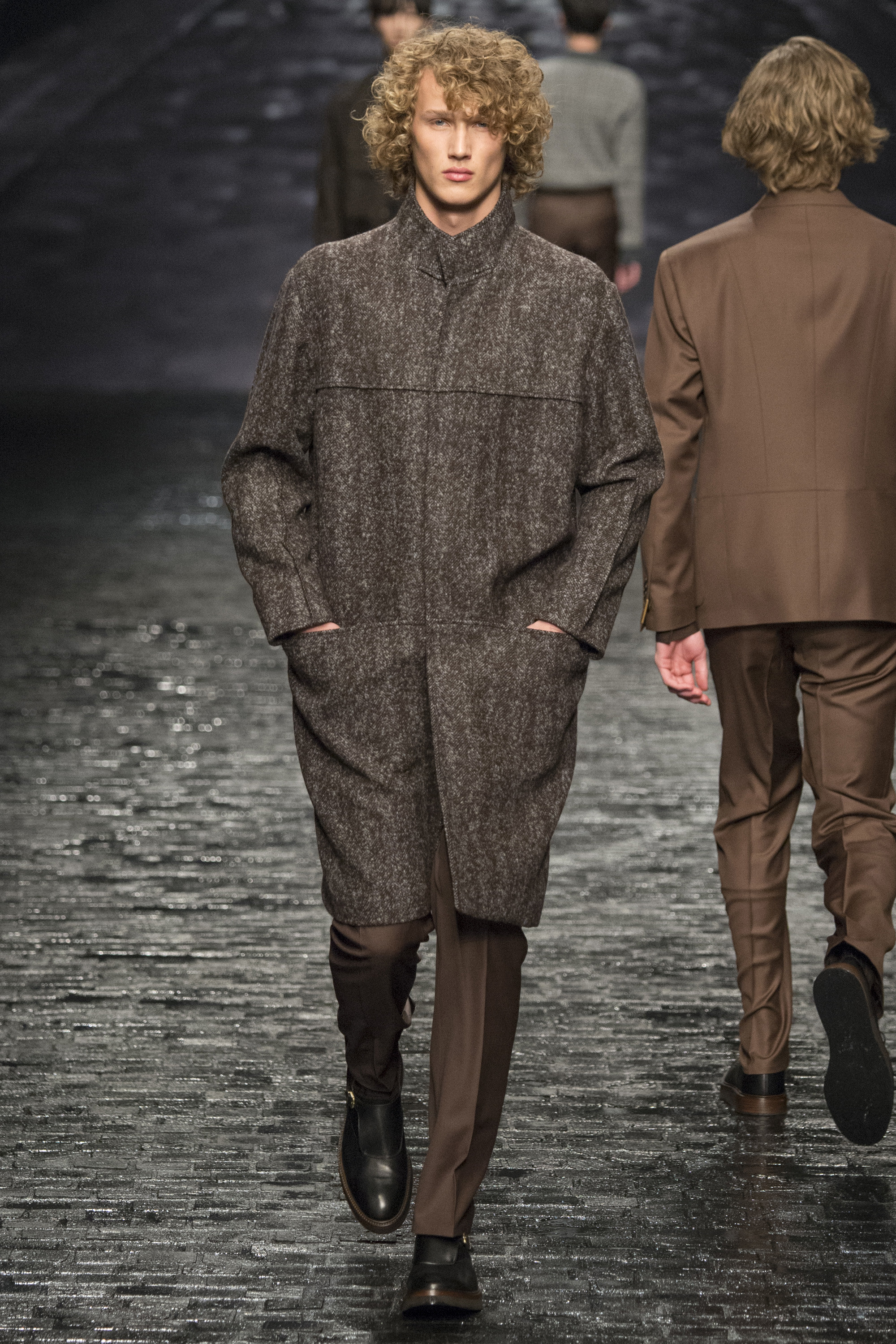 The tailoring referenced ’40s proportions: Shoulders were slightly oversize; trousers were high-waisted and fluid in post-WW2 fashion. Yet the inspiration was handled lightly and was not literal, which was testament to the effort of keeping Corneliani firmly in the modern arena—even if its classic Italian tailoring pedigree was on full display. Impeccable execution and painstaking attention to detail were obviously paramount, as was the use of luxe textured fabrics, which gave substance to linear mid-length car coats, one of the collection’s highlights. Suiting was of the slim-cut variety, yet with a touch of soft, rounded ease; sporty elements conveyed the comfort factor for nylon parkas and trenches. The dark, retro palette added to the romantic atmosphere; it was interpreted in a contemporary, classy way.