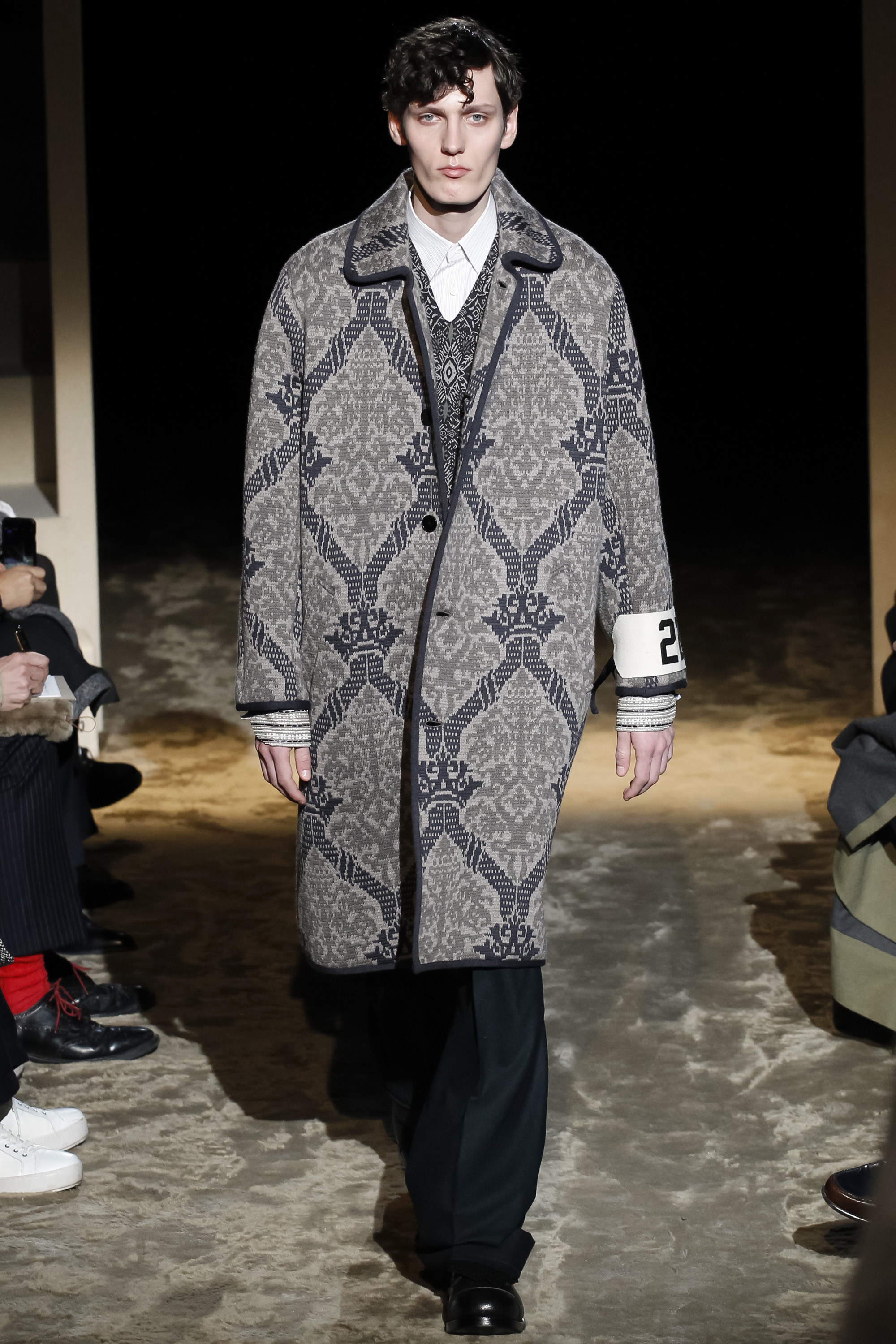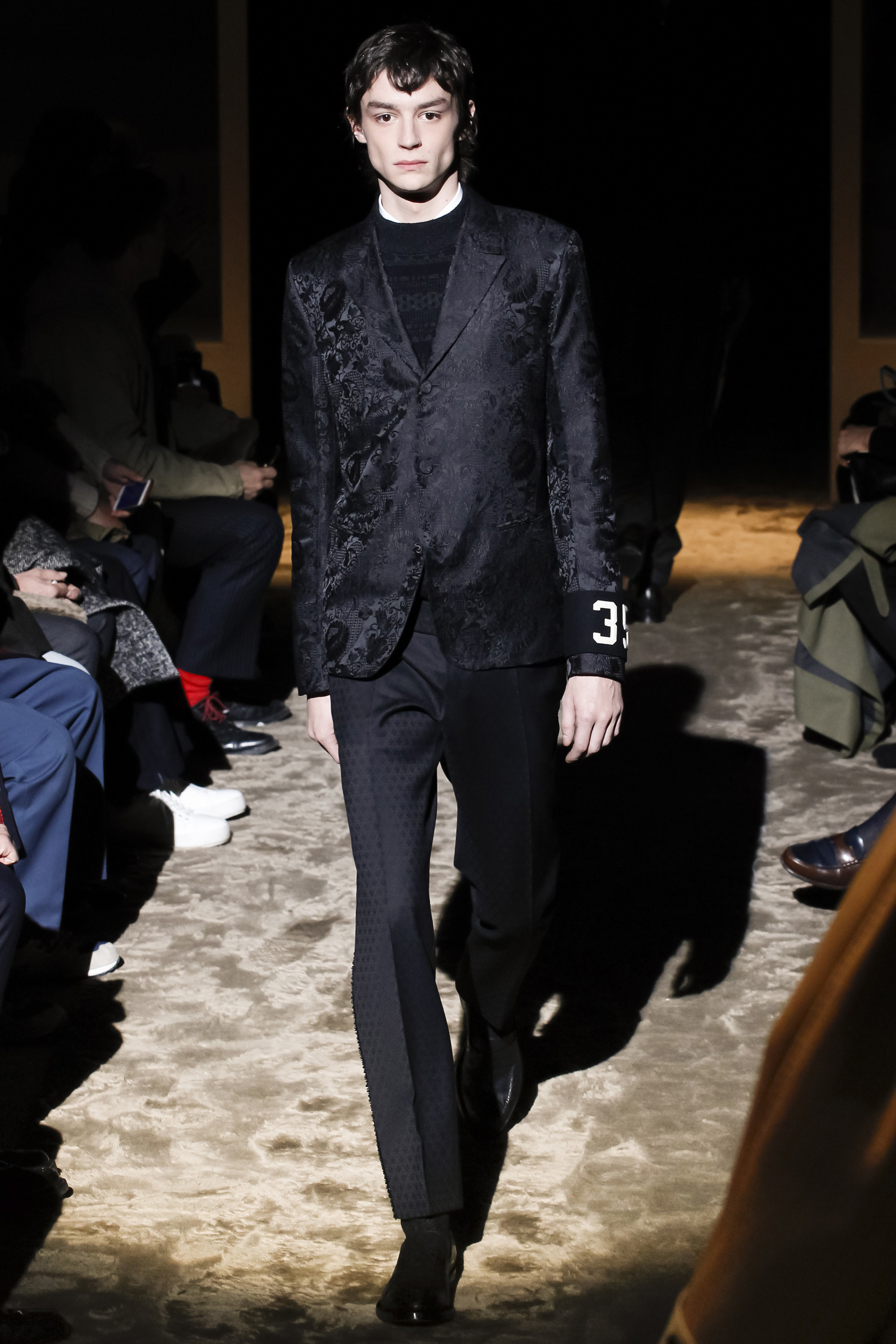 Haute couture for Zegna Fall 2016 was treated not as an excuse to embellish, but as a concept to explore, its symbols and signs dissected, reappropriated, and reinterpreted. The set was a salon complete with spindly-legged gilt seating, but it was smothered in pelts, like Meret Oppenheim’s Breakfast in Fur. And the garments wildly collided couture tropes: painstakingly tailored volumes in semi-fitted coats and sweeping capes; lustrous brocades and jacquards; lavishly beaded eveningwear. But this haute was pour homme. Each modelé bore a number, like a traditional salon presentation: Pilati’s, however, were attached to fedora hats, embroidered onto knitted ties, or strapped to calfskin bags. Clever.
