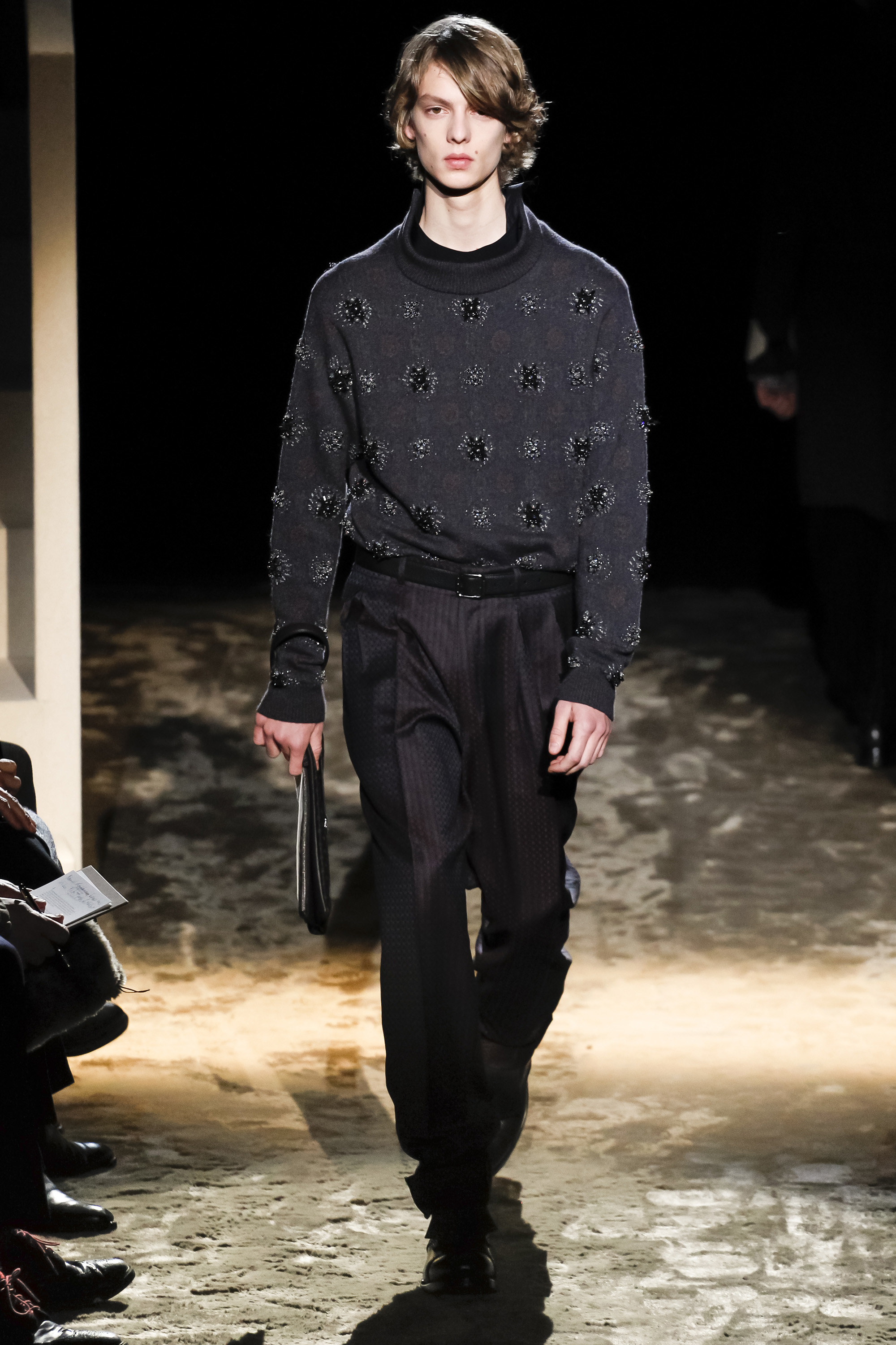 “Embellishment is in l’air du temps,” said Stefano Pilati after an Ermenegildo Zegna show that was packed with it: beading, embroidery, jacquard, fil coupe. That sounds stuffy, and the French stuff would sound pretentious, bar the fact Pilati headed Yves Saint Laurent for nearly a decade, so he’s allowed to borrow the language to describe a mood undoubtedly evident and rapidly unfolding across the Milan shows. The mood is of the precious, and of the decorated male.
